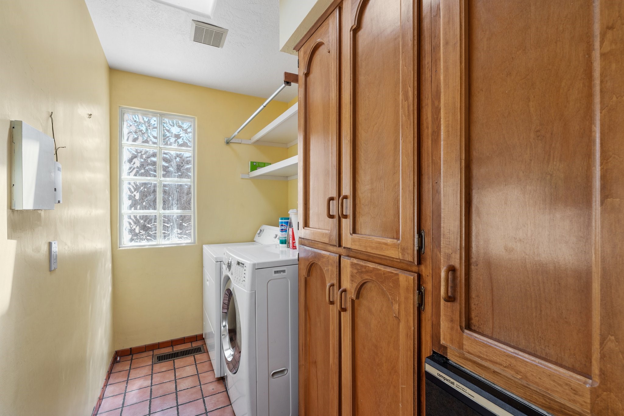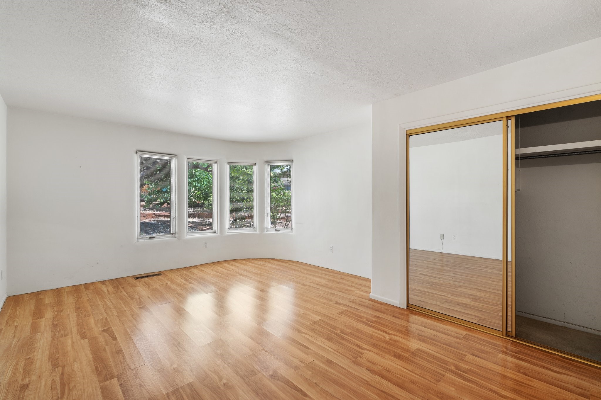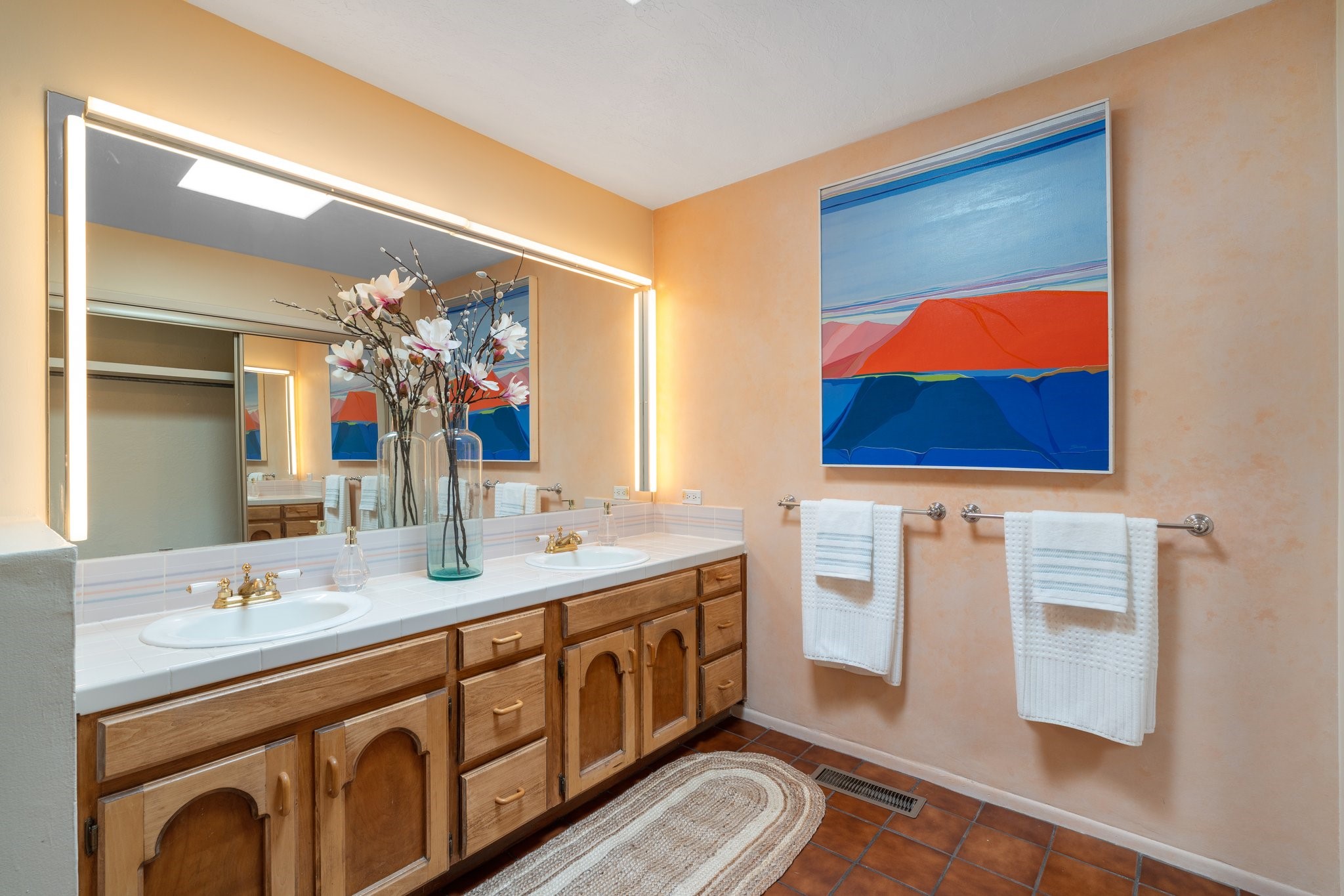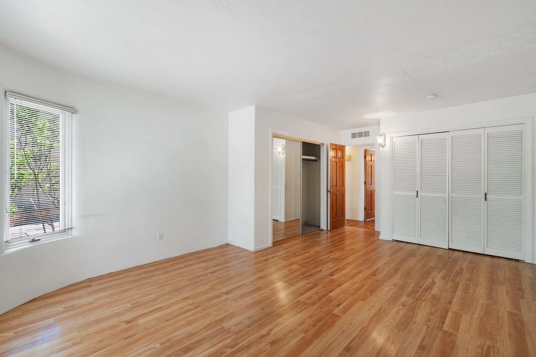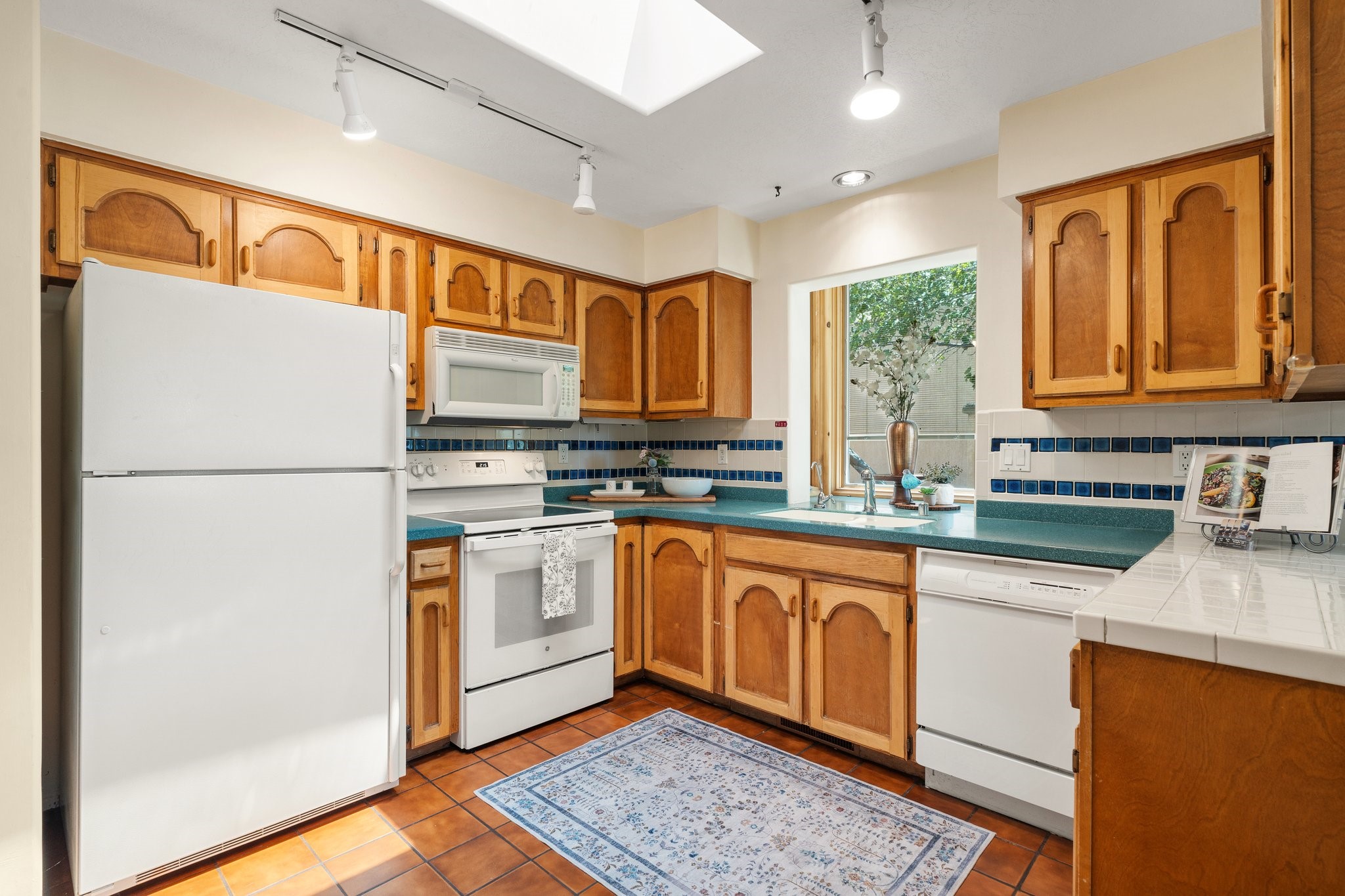 One-of-a-kind custom residence blends timeless Southwestern charm, thoughtful design, and modern comfort. Curved walls and abundant windows bathe every room in natural light, spotlighting fine craftsmanship.The expansive living room showcases a high tongue-and-groove beamed ceiling, dramatic corner kiva fireplace with a built-in banco, rich wood floors, built-in shelving, graceful china cabinet, and sliding doors to a private brick patio and beautifully terraced garden for seamless indoor-outdoor living. A built-in banco at one end of the living room creates an inviting nook for intimate conversation or peaceful reading.The chef-friendly kitchen offers sleek Corian countertops, newer appliances, classic tile floors, and an adjacent dining area that makes entertaining stylish and easy.Three versatile bedrooms provide comfort and flexibility: one is fitted as a home office with built-in shelving and counters; the spacious second bedroom boasts a gracefully rounded front wall framed by four large windows, two closets, and luxury vinyl flooring--ideal for guests or family.The private primary suite is a true sanctuary with its own corner kiva fireplace beneath a skylight, generous closets, and a spa-style bath with dual sinks and a sunken tub. French doors lead to a light-filled sunroom with cedar-lined closet; the sunroom opens onto the serene patio and terraced garden.Additional highlights include a large laundry room with extensive cabinetry, decorative glass block and skylight, plus an oversized two-car garage with abundant shelving for storage. Three rose bushes grace the front yard, adding a burst of color and charm.Not just a place to live--this residence is a work of art crafted for comfort, beauty, and inspired living. Come experience its magic for yourself.Park Plazas is a centrally located neighborhood with miles of walking trails, an off-leash dog park, tennis and pickle ball courts a community garden and much more.