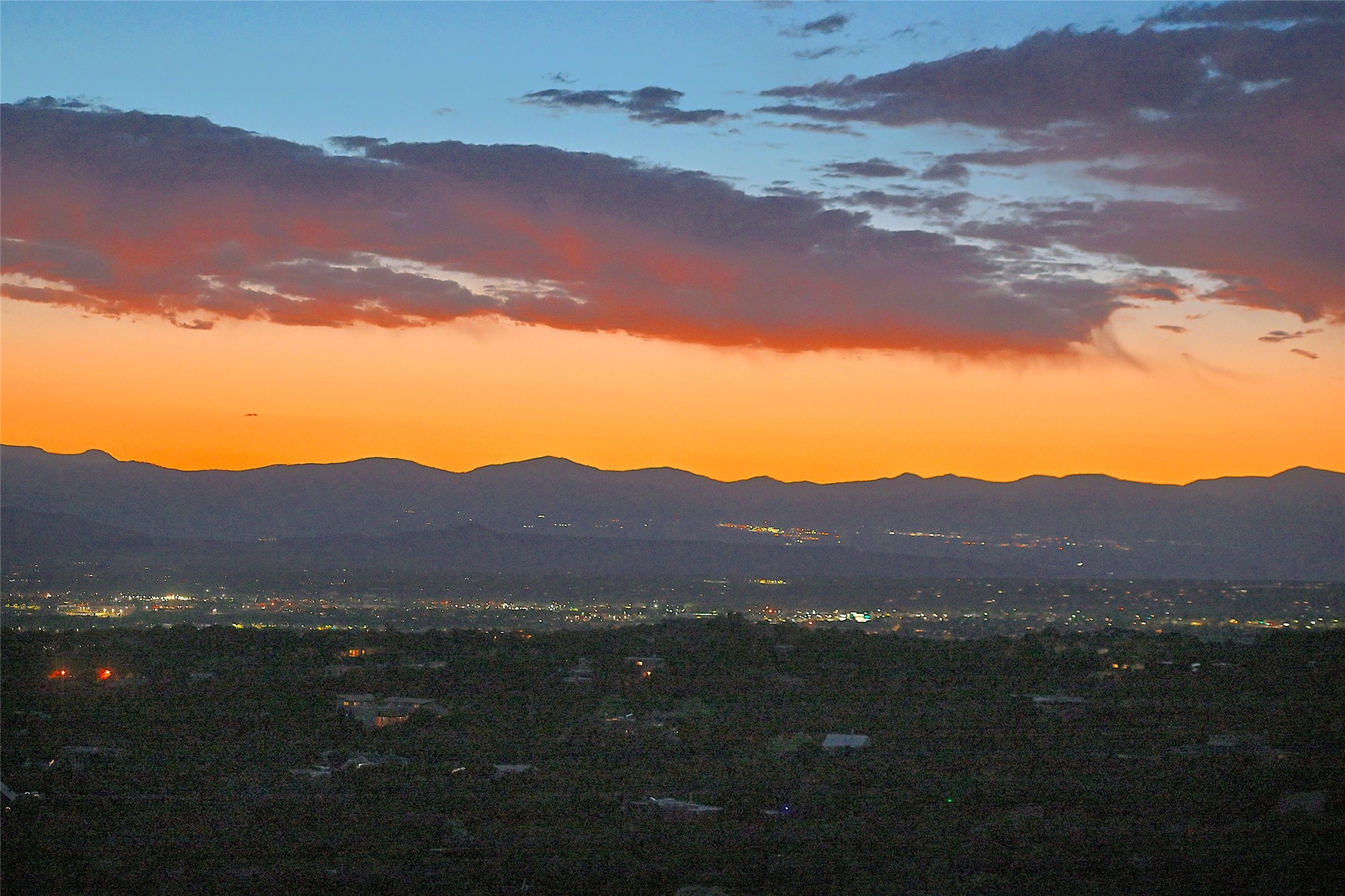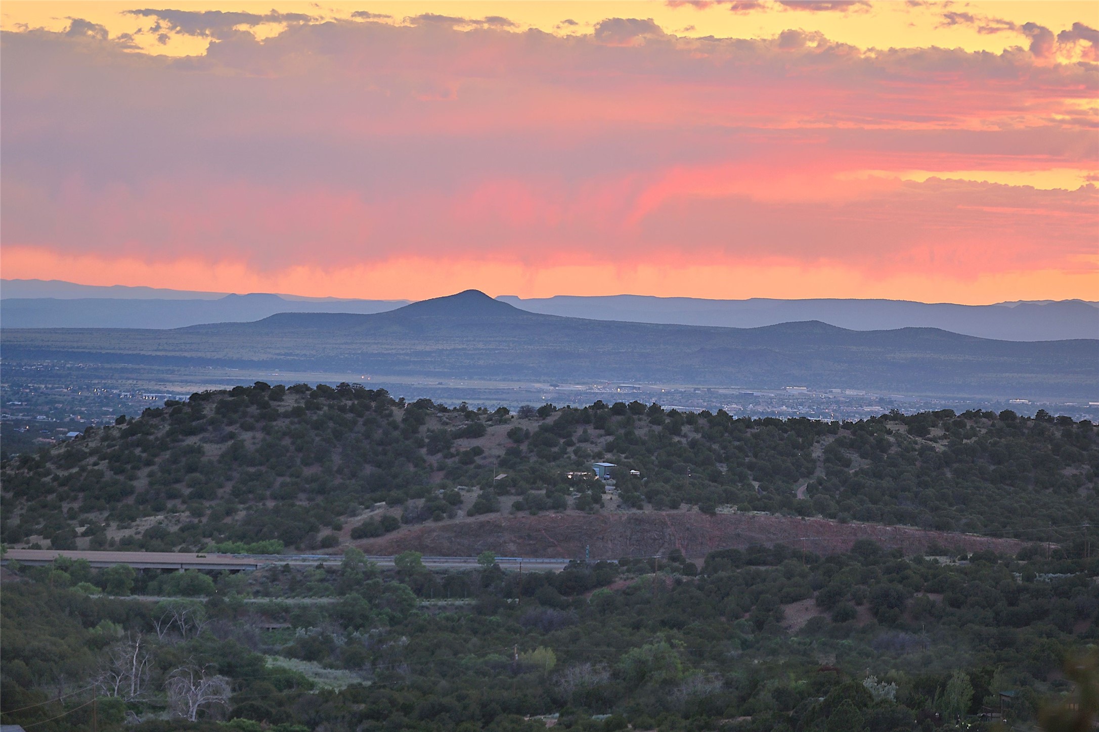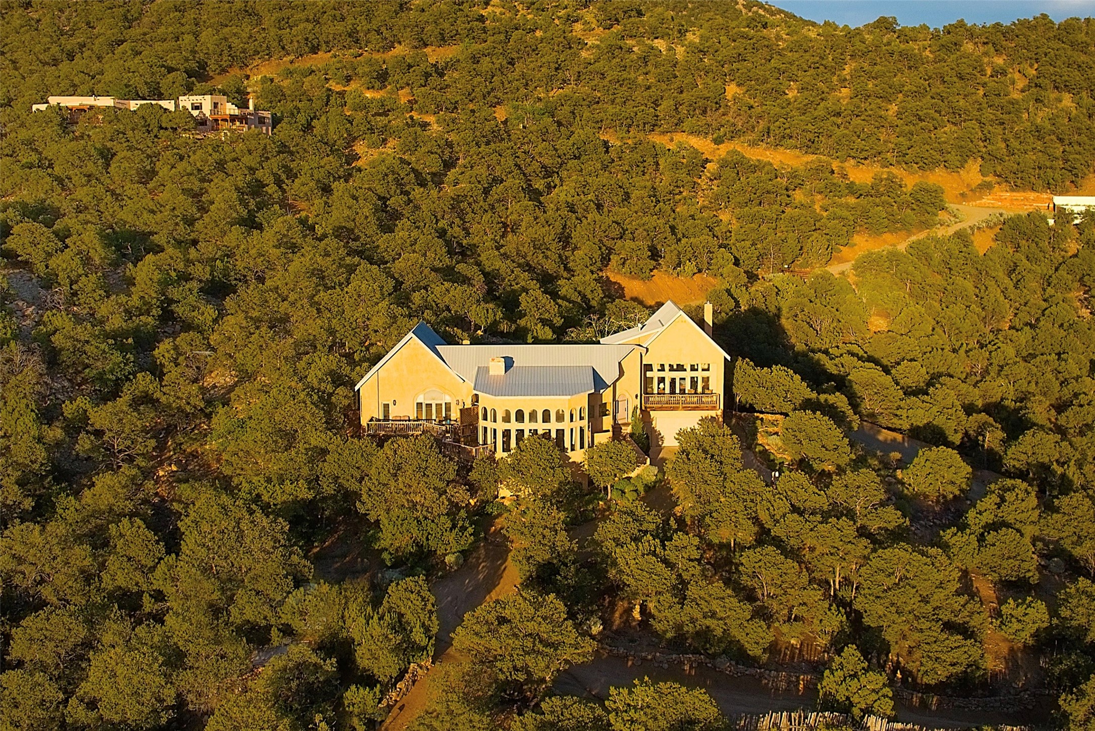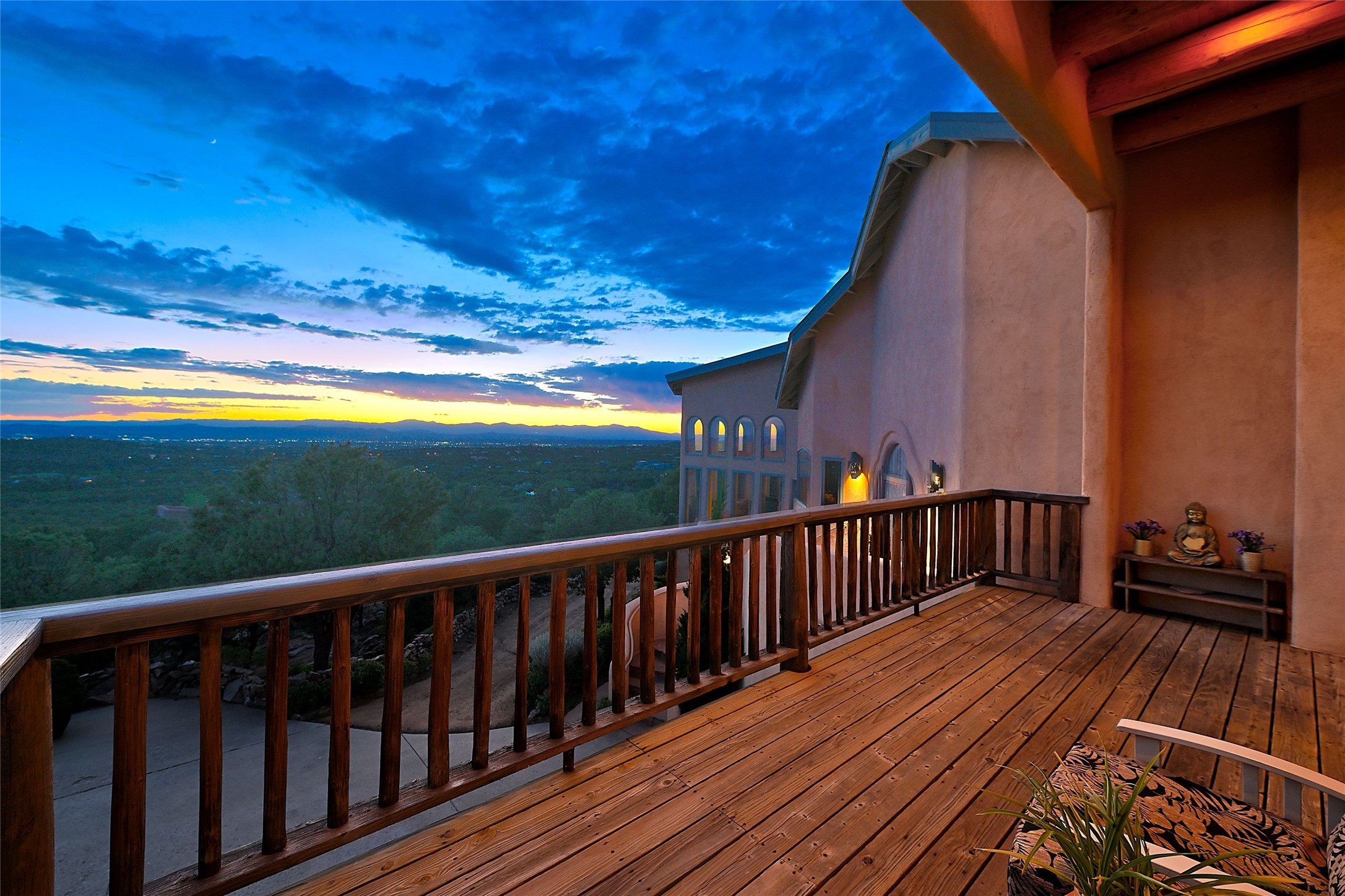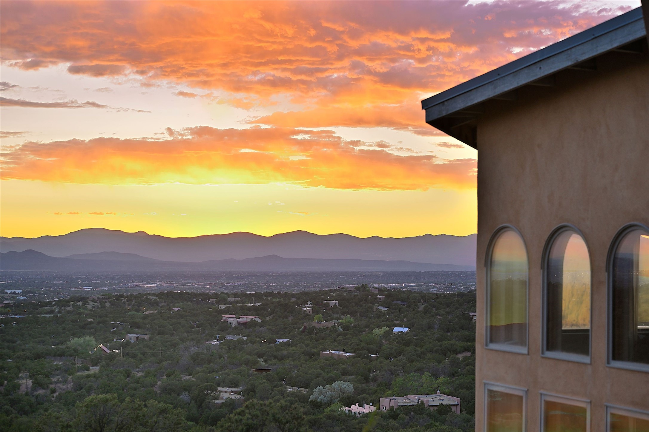 Elevated Living in Santa Fe's Foothills: A Majestic Retreat with Unrivaled ViewsPerched at approximately 7,500 feet, this unique Santa Fe residence offers a top-of-the-world experience, blending seclusion with breathtaking vistas across five mountain ranges. From fiery sunsets and dramatic desert storms to shimmering city lights, this home captures the ever-changing beauty of Northern New Mexico.Designed for those seeking comfort, privacy, and inspiration, the residence sits on five pinon-studded acres -- with an astonishing skyline and easy access to Santa Fe. It's just nine minutes from the historic Plaza, world-class dining, and renowned museums. A thoughtfully sited trail leads to a scenic overlook at top of the property, perfect for early evening toasts in the glow of twilight.Inside, the great room invites abundant natural light through soaring two-story windows and opens to three spacious decks--ideal for embracing the splendor of the high desert sky. The interiors are gracefully appointed with antique, artisan touches: hand-troweled plaster walls, ash and sandstone floors, and hand-crafted cabinetry. Traditional elements like oversized vigas, rough-hewn pine, and smooth-crafted latillas provide warmth and a sense of place.Five wood-burning fireplaces -- three of them harmonized in a Suisse-inspired layout -- bring cozy charm to the living, dining, and outdoor spaces during cooler months. The open kitchen, outdoor spaces and generous and inviting living areas make entertaining exhilarating and effortless.The home's three-bedroom floorplan includes a luxurious main-level primary suite with spa bath, walk-in closet, and direct deck access. Upstairs, a second glorious suite -- currently used as an art studio --presents show-stopping views and its own magnificent terrace. The third bedroom, downstairs, overlooks the courtyard, with its own en-suite bath. Additional architectural details include special northeast facing moon-view windows, beautifully framing the boulder, stone and earth-wrapped cove below with native plantings and lawn -- a perfect nook for shaded afternoon retreats.A thoughtfully planned fenced dog run makes this property as pet-friendly as it is people-perfect.
