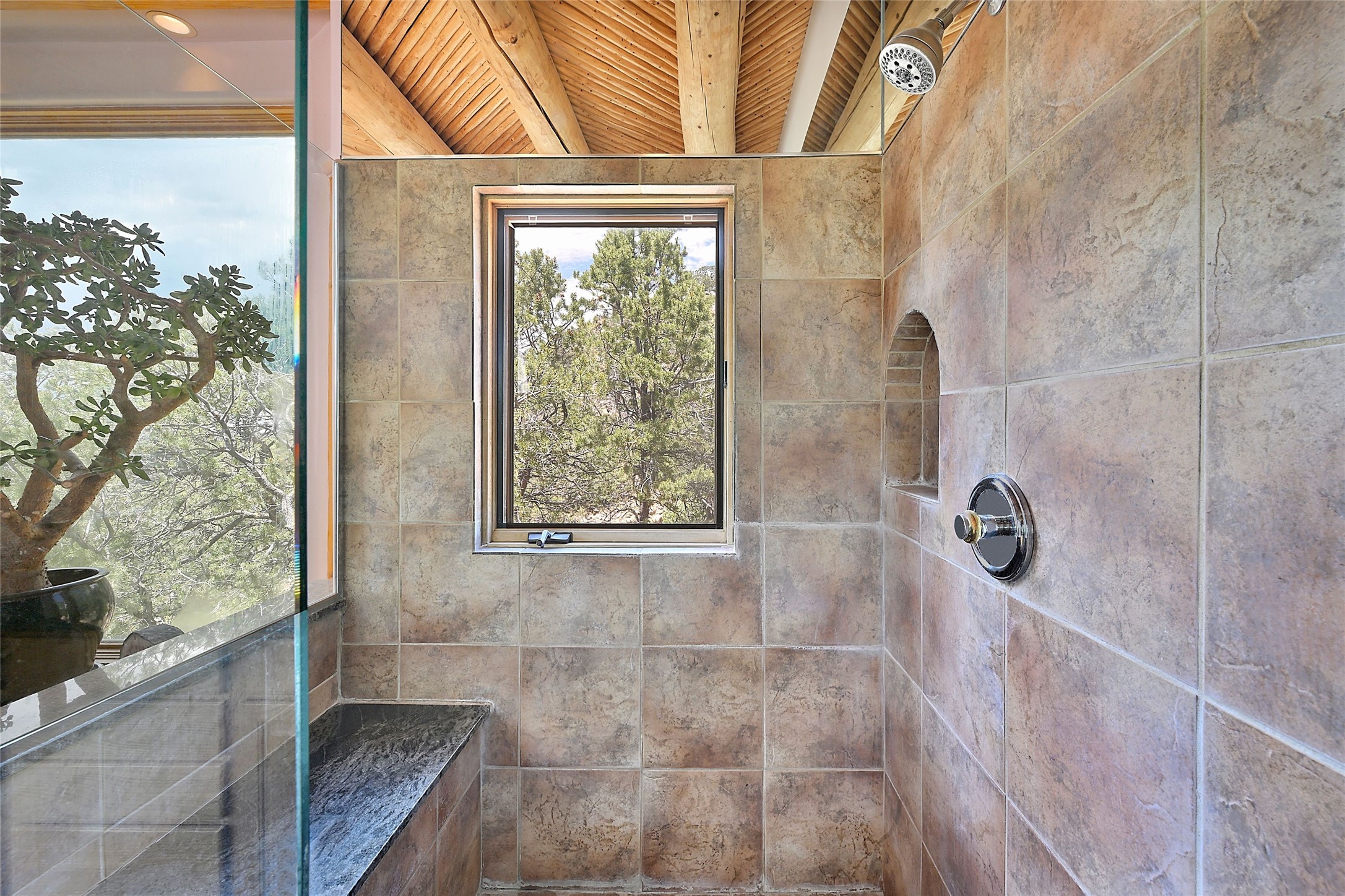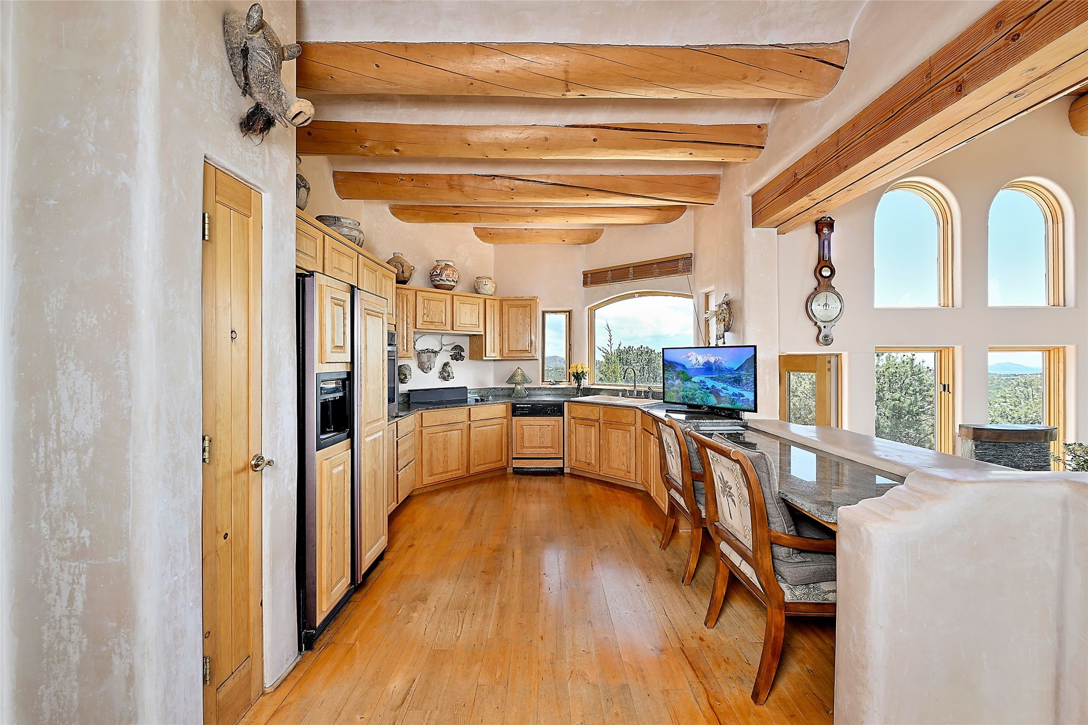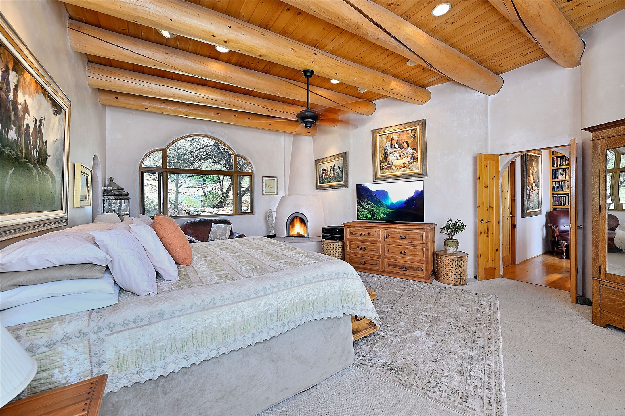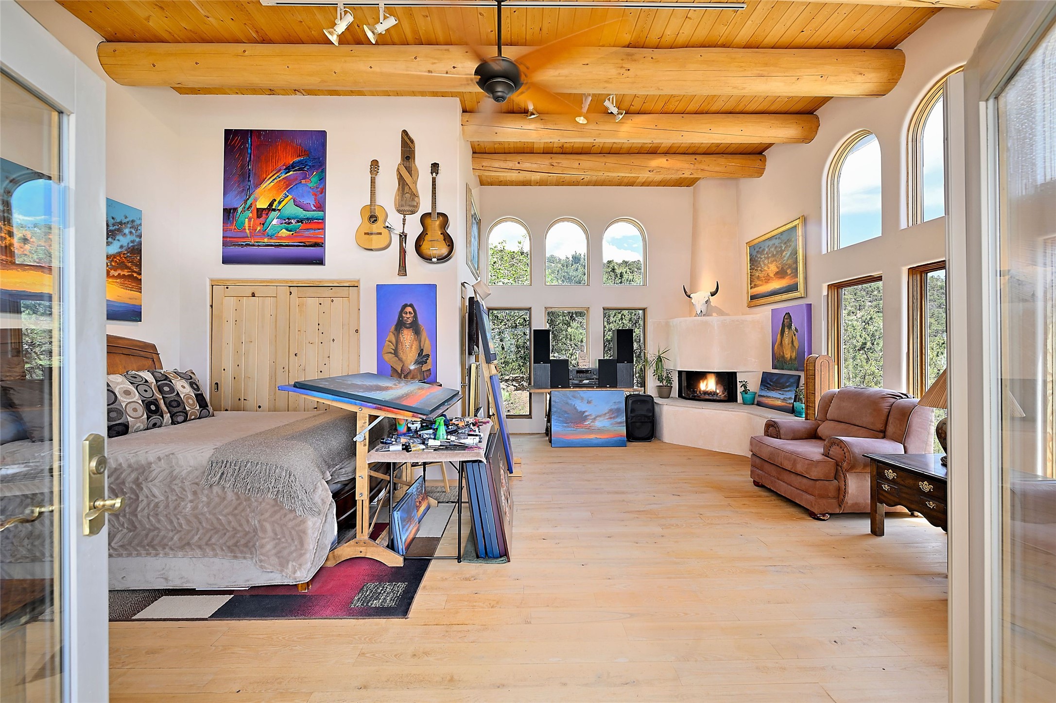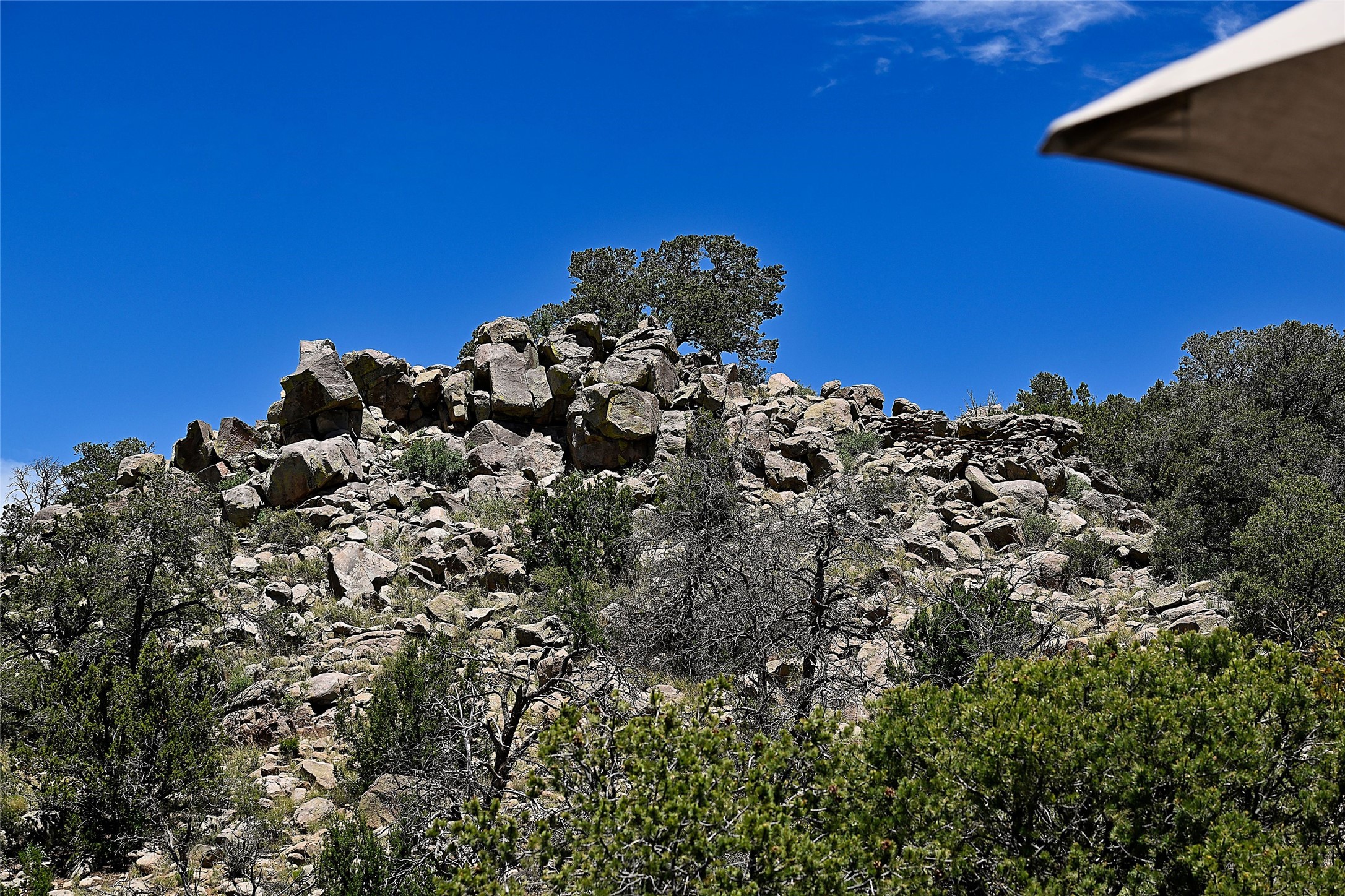 Elevated Living in Santa Fe's Foothills: A Majestic Retreat with Unrivaled ViewsPerched at approximately 7,500 feet, this unique Santa Fe residence offers a top-of-the-world experience, blending seclusion with breathtaking vistas across five mountain ranges. From fiery sunsets and dramatic desert storms to shimmering city lights, this home captures the ever-changing beauty of Northern New Mexico.Designed for those seeking comfort, privacy, and inspiration, the residence sits on five pinon-studded acres -- with an astonishing skyline and easy access to Santa Fe. It's just nine minutes from the historic Plaza, world-class dining, and renowned museums. A thoughtfully sited trail leads to a scenic overlook at top of the property, perfect for early evening toasts in the glow of twilight.Inside, the great room invites abundant natural light through soaring two-story windows and opens to three spacious decks--ideal for embracing the splendor of the high desert sky. The interiors are gracefully appointed with antique, artisan touches: hand-troweled plaster walls, ash and sandstone floors, and hand-crafted cabinetry. Traditional elements like oversized vigas, rough-hewn pine, and smooth-crafted latillas provide warmth and a sense of place.Five wood-burning fireplaces -- three of them harmonized in a Suisse-inspired layout -- bring cozy charm to the living, dining, and outdoor spaces during cooler months. The open kitchen, outdoor spaces and generous and inviting living areas make entertaining exhilarating and effortless.The home's three-bedroom floorplan includes a luxurious main-level primary suite with spa bath, walk-in closet, and direct deck access. Upstairs, a second glorious suite -- currently used as an art studio --presents show-stopping views and its own magnificent terrace. The third bedroom, downstairs, overlooks the courtyard, with its own en-suite bath. Additional architectural details include special northeast facing moon-view windows, beautifully framing the boulder, stone and earth-wrapped cove below with native plantings and lawn -- a perfect nook for shaded afternoon retreats.A thoughtfully planned fenced dog run makes this property as pet-friendly as it is people-perfect.