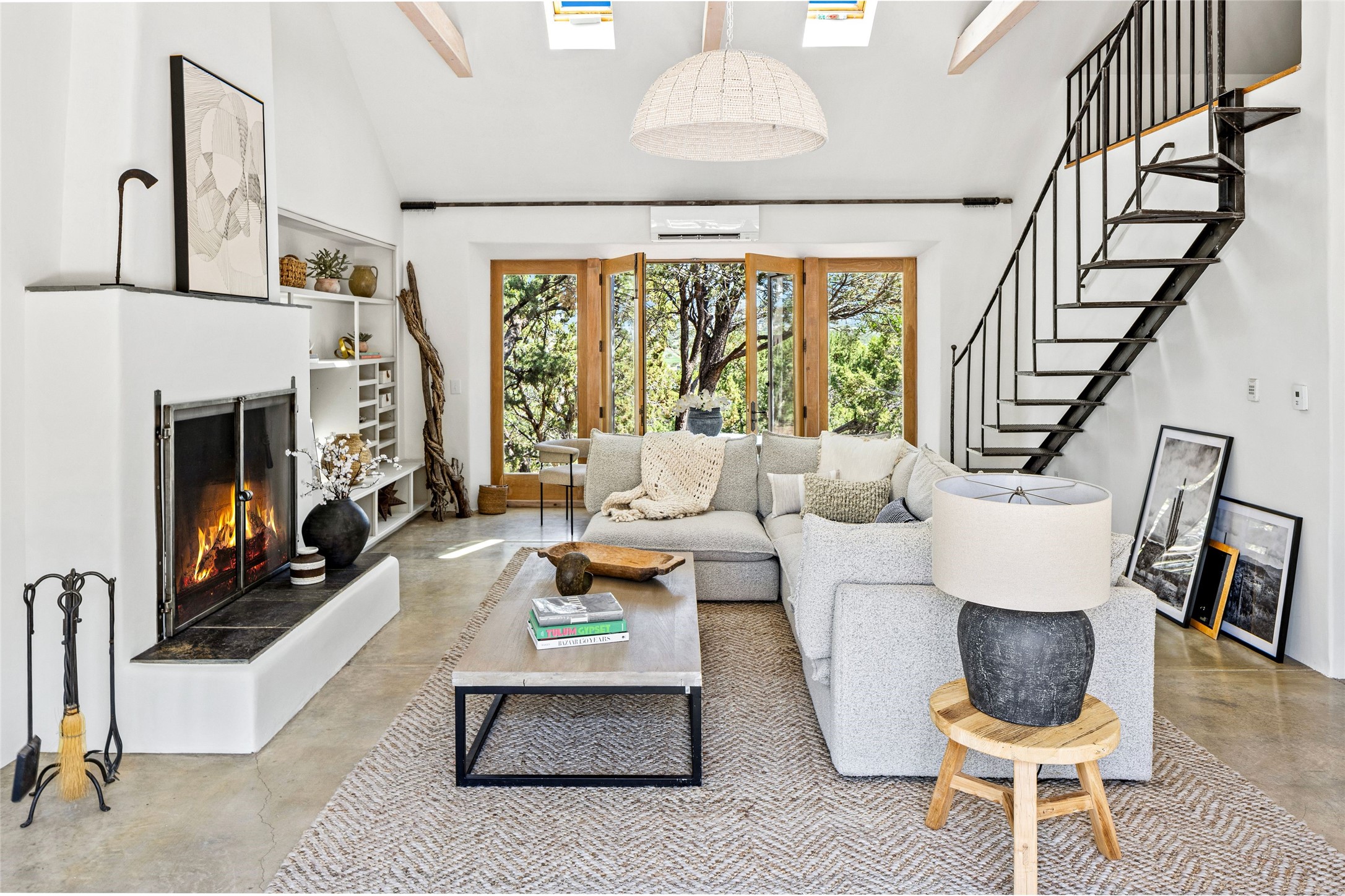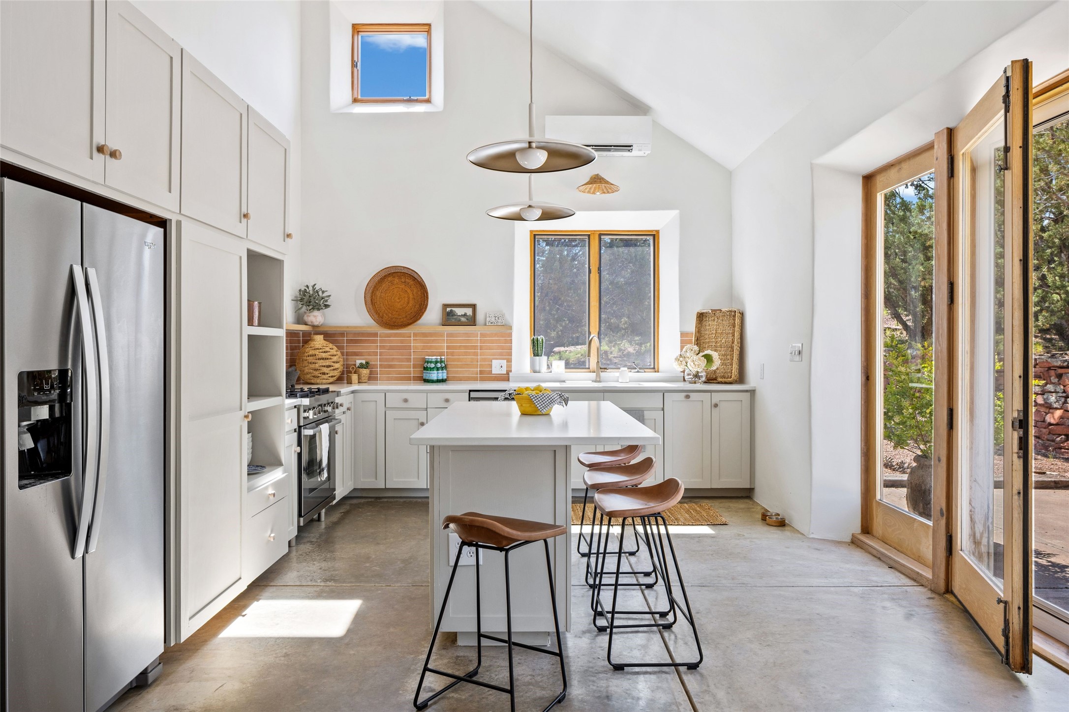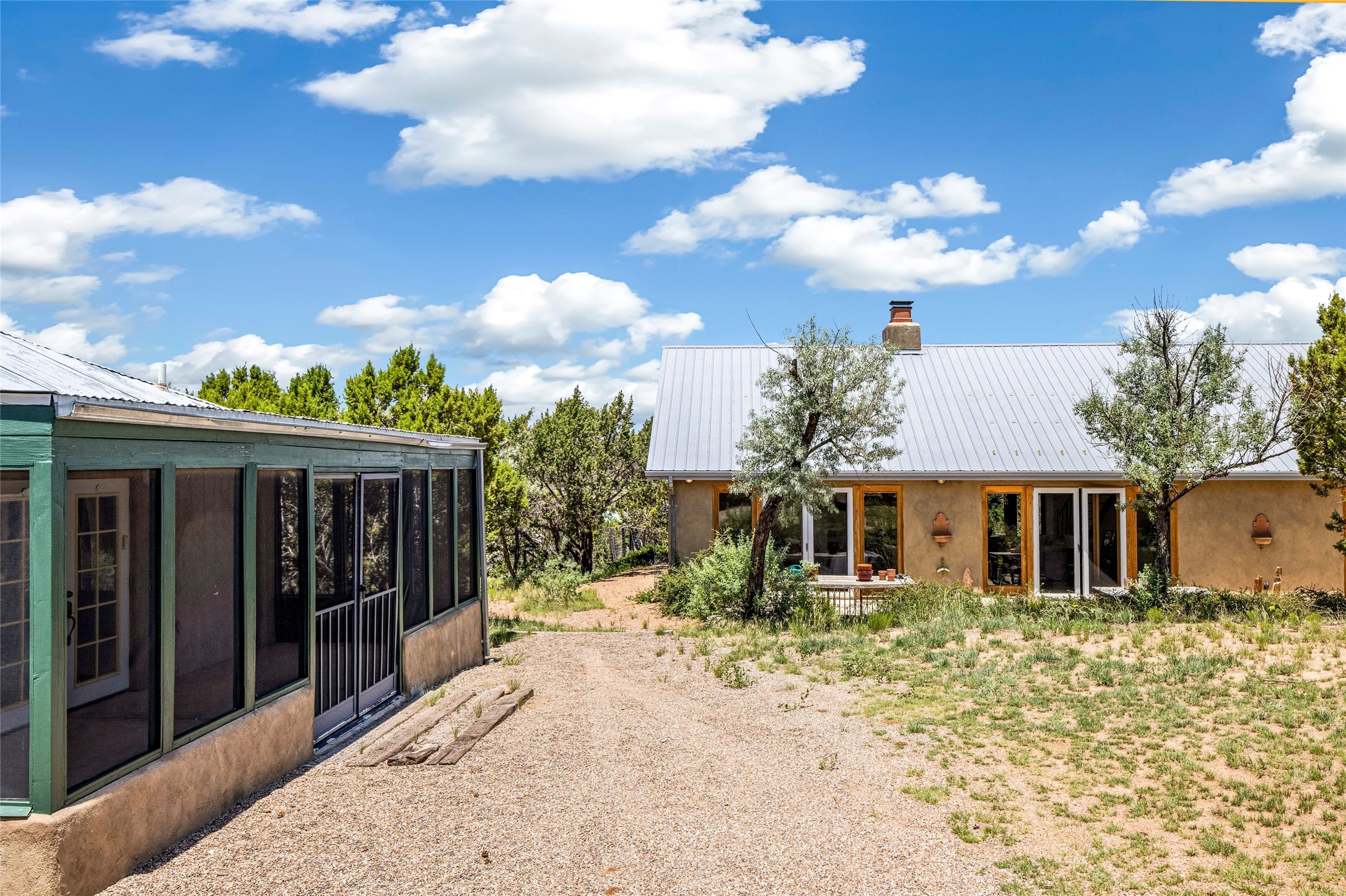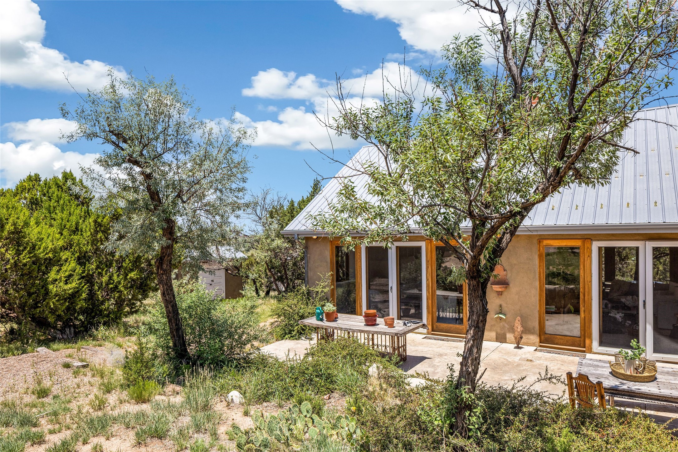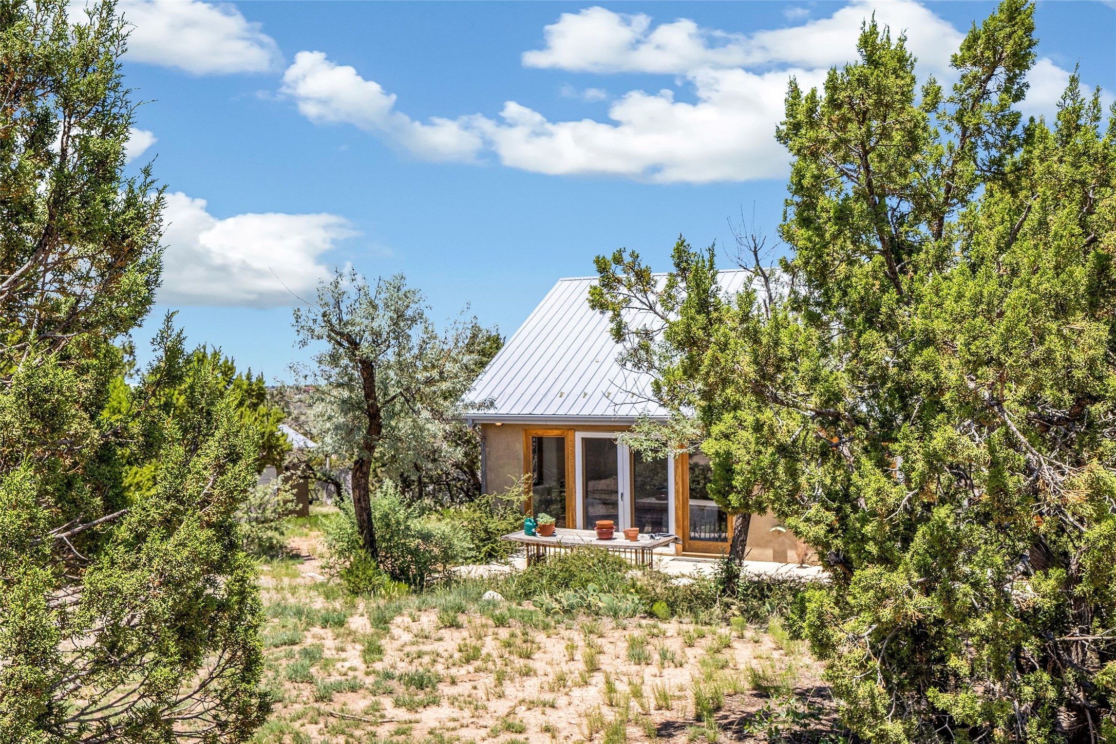 This custom built Northern New Mexico style home on 2.77 acres with mountain views was built by the previous owners as their primary residence and is now owned by a designer who added special design touches and mini splits for HVAC. This two bedroom home plus loft offers a contemporary feel with polished concrete floors and vaulted ceilings. Other features include a pitched Pro-panel roof, Pumice Crete walls and in-floor radiant heating. The recently updated island kitchen includes freshly painted cabinets, terra cotta tile backsplash, solid surface countertops and stainless steel appliances. The kitchen & dining room open to a spacious living room featuring a grand wood burning fireplace with high ceilings and a sculptural steel staircase leading to a cozy loft. Serene, light, and bright, this home has multiple large atrium doors that connect you to a tranquil outdoor entertaining area. The nearby fenced garden will delight, and you will relish the incredible nature that surrounds this exceptional home. The separate studio casita was added in 2007 and features concrete floors, a kitchenette, a three-quarter bath and a screened portal. Perched high on a on a hilltop, this home offers spectacular mountain views in a location near the restaurants and shopping of Lamy and Eldorado.