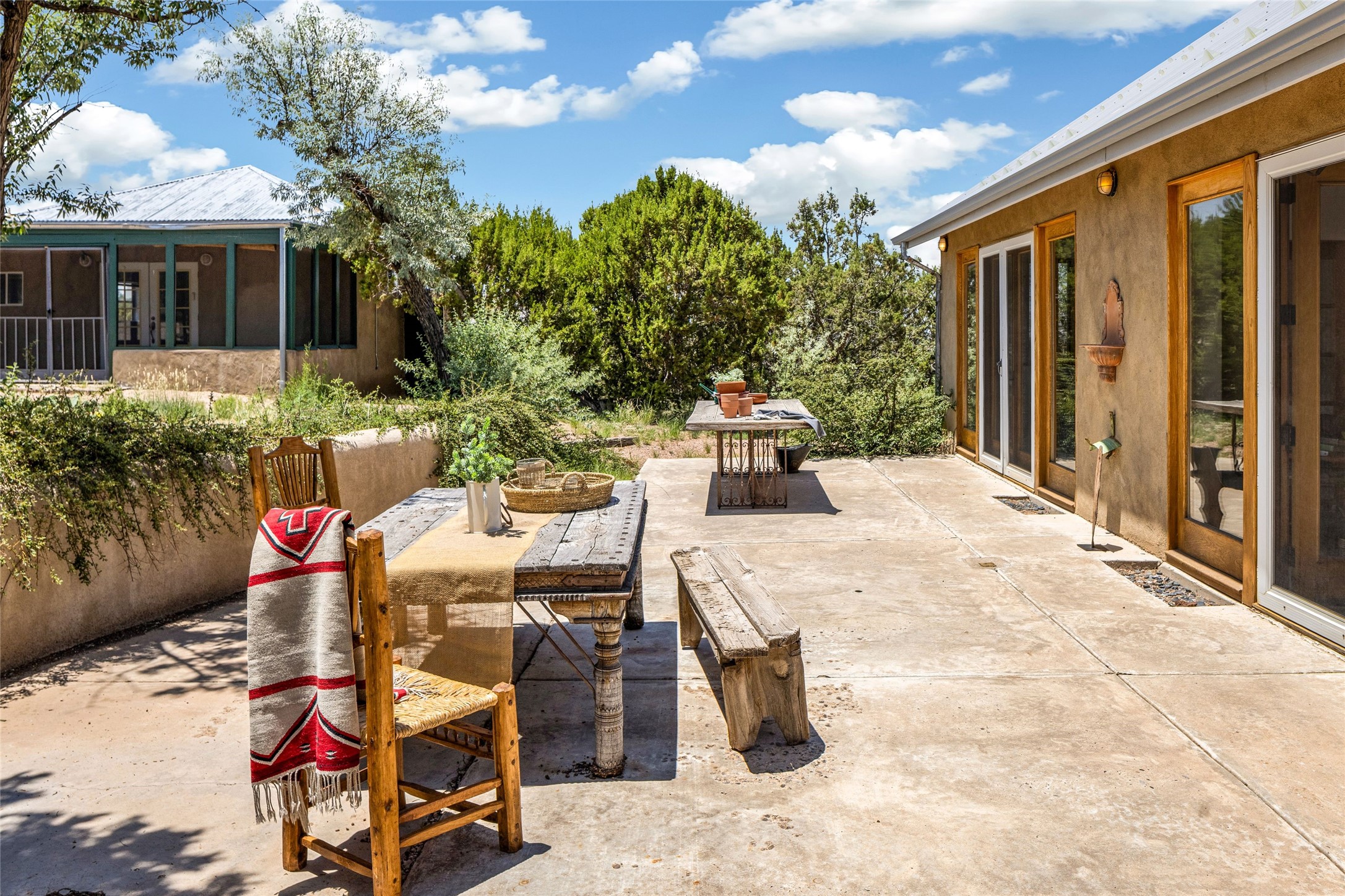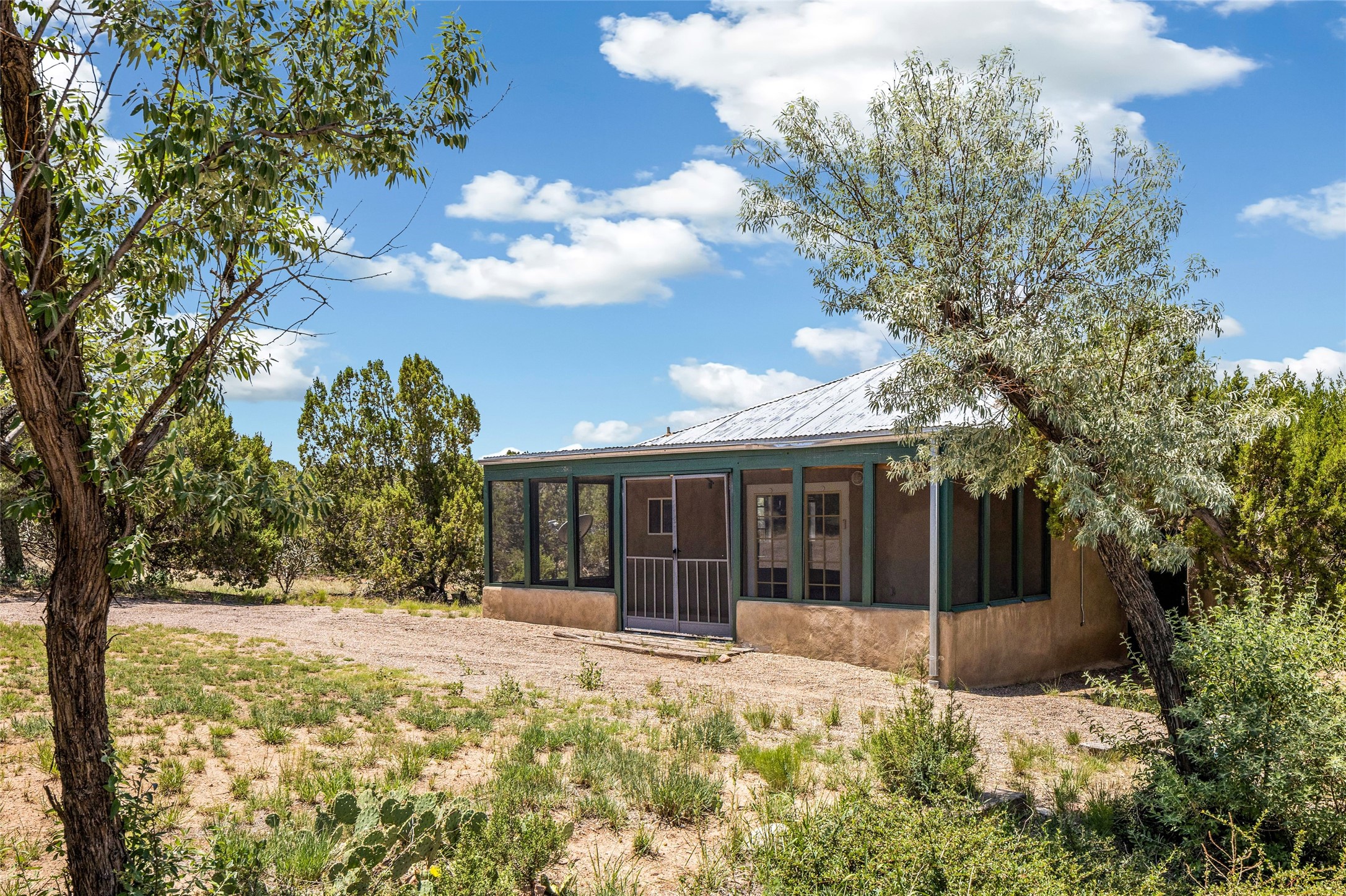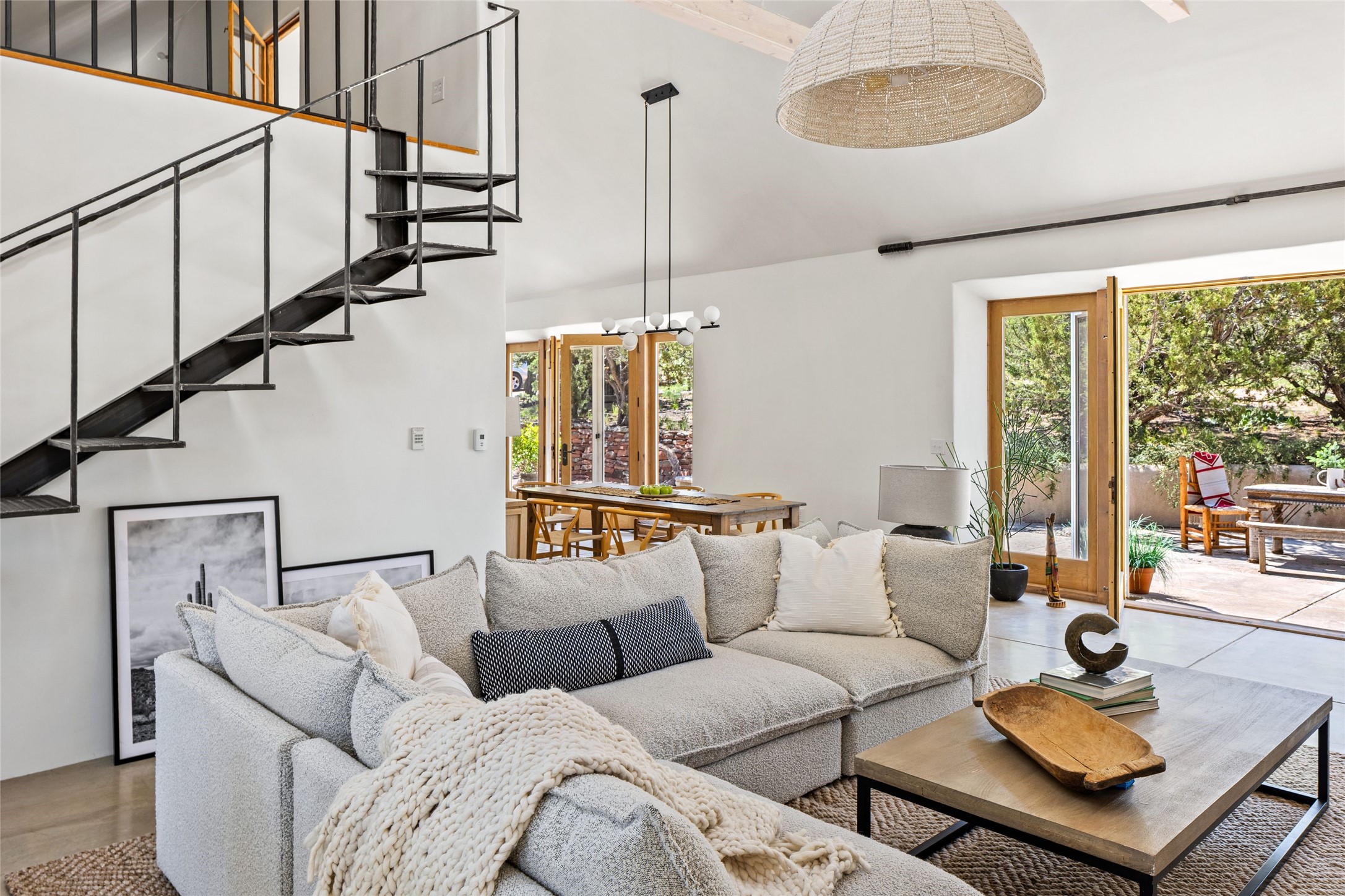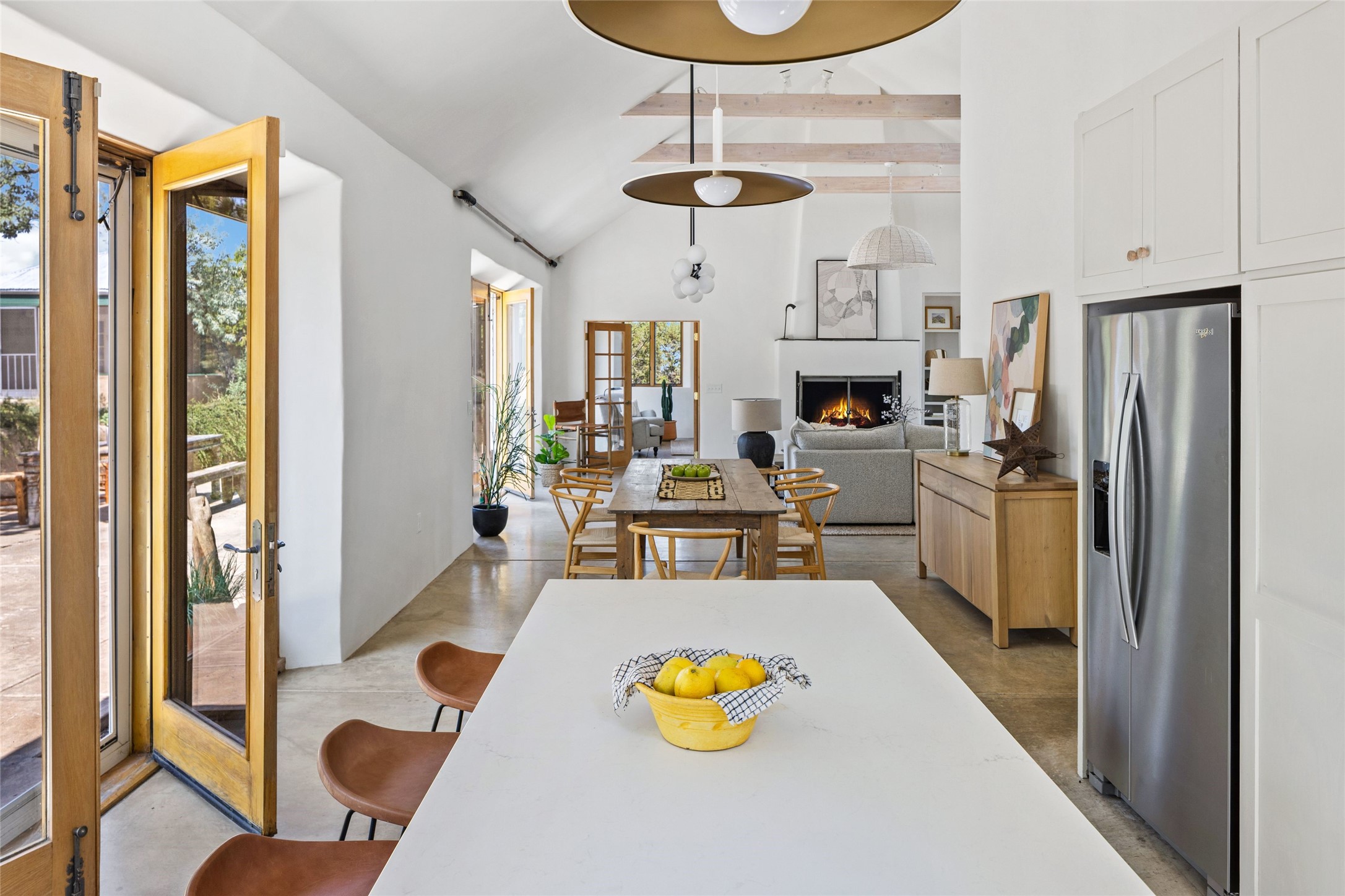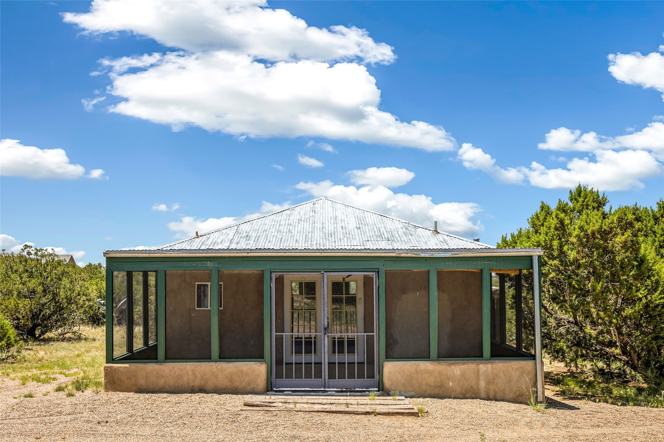 This custom built Northern New Mexico style home on 2.77 acres with mountain views was built by the previous owners as their primary residence and is now owned by a designer who added special design touches and mini splits for HVAC. This two bedroom home plus loft offers a contemporary feel with polished concrete floors and vaulted ceilings. Other features include a pitched Pro-panel roof, Pumice Crete walls and in-floor radiant heating. The recently updated island kitchen includes freshly painted cabinets, terra cotta tile backsplash, solid surface countertops and stainless steel appliances. The kitchen & dining room open to a spacious living room featuring a grand wood burning fireplace with high ceilings and a sculptural steel staircase leading to a cozy loft. Serene, light, and bright, this home has multiple large atrium doors that connect you to a tranquil outdoor entertaining area. The nearby fenced garden will delight, and you will relish the incredible nature that surrounds this exceptional home. The separate studio casita was added in 2007 and features concrete floors, a kitchenette, a three-quarter bath and a screened portal. Perched high on a on a hilltop, this home offers spectacular mountain views in a location near the restaurants and shopping of Lamy and Eldorado.