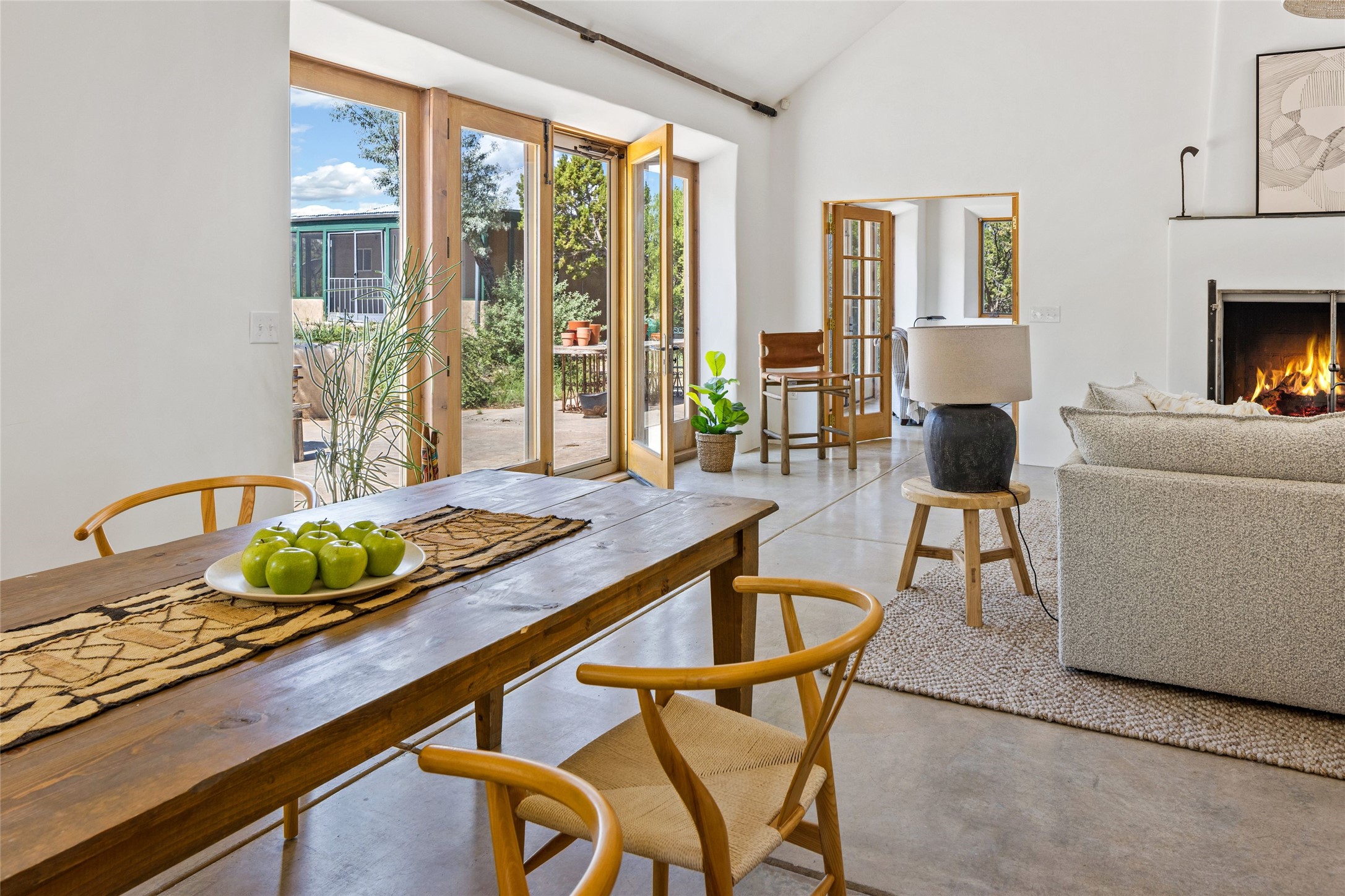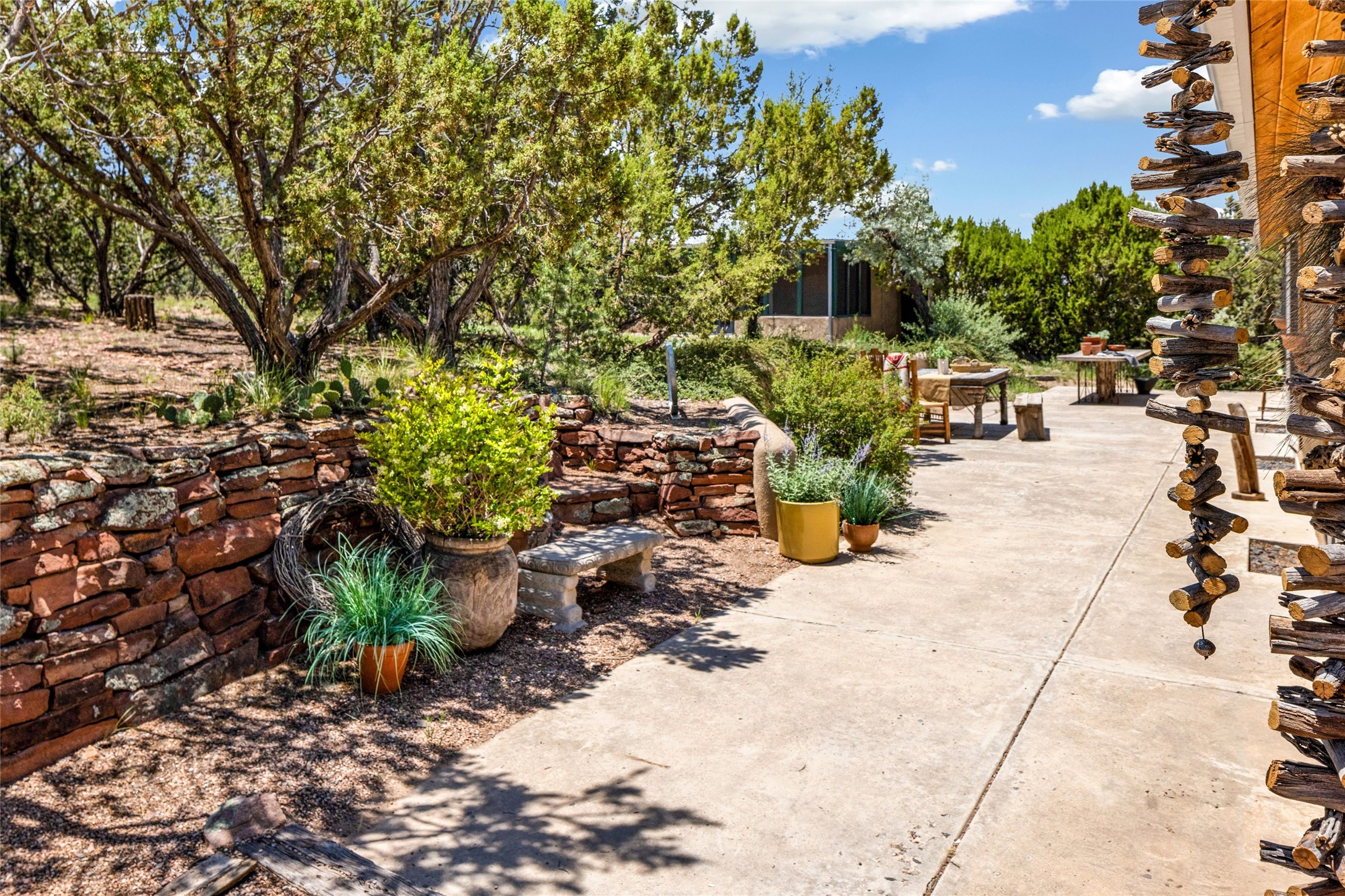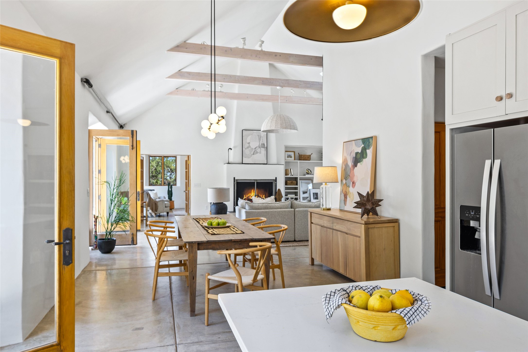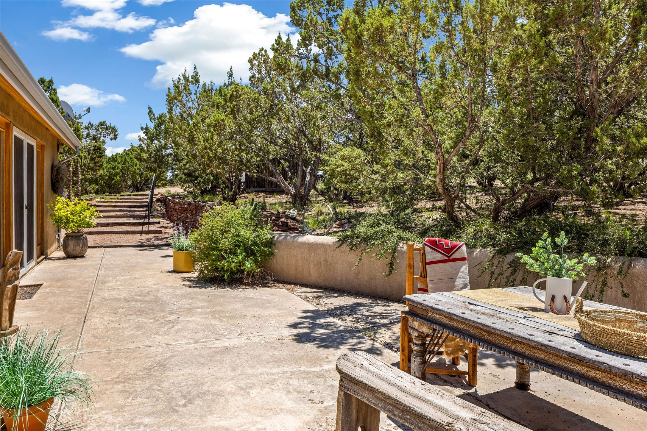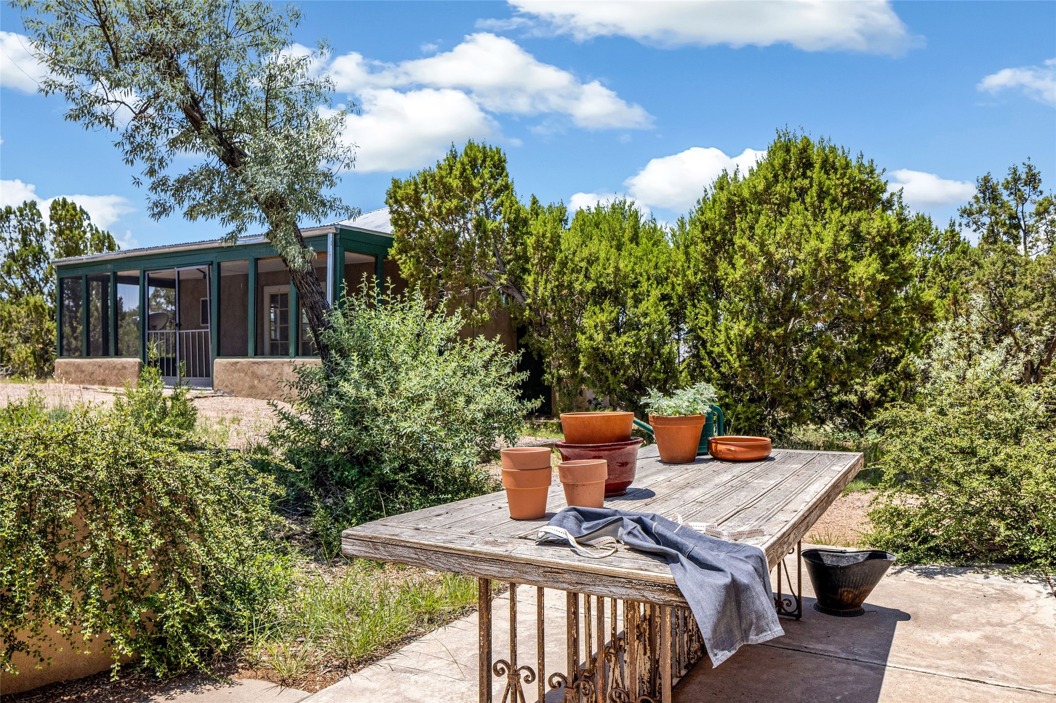 This custom built Northern New Mexico style home on 2.77 acres with mountain views was built by the previous owners as their primary residence and is now owned by a designer who added special design touches and mini splits for HVAC. This two bedroom home plus loft offers a contemporary feel with polished concrete floors and vaulted ceilings. Other features include a pitched Pro-panel roof, Pumice Crete walls and in-floor radiant heating. The recently updated island kitchen includes freshly painted cabinets, terra cotta tile backsplash, solid surface countertops and stainless steel appliances. The kitchen & dining room open to a spacious living room featuring a grand wood burning fireplace with high ceilings and a sculptural steel staircase leading to a cozy loft. Serene, light, and bright, this home has multiple large atrium doors that connect you to a tranquil outdoor entertaining area. The nearby fenced garden will delight, and you will relish the incredible nature that surrounds this exceptional home. The separate studio casita was added in 2007 and features concrete floors, a kitchenette, a three-quarter bath and a screened portal. Perched high on a on a hilltop, this home offers spectacular mountain views in a location near the restaurants and shopping of Lamy and Eldorado.