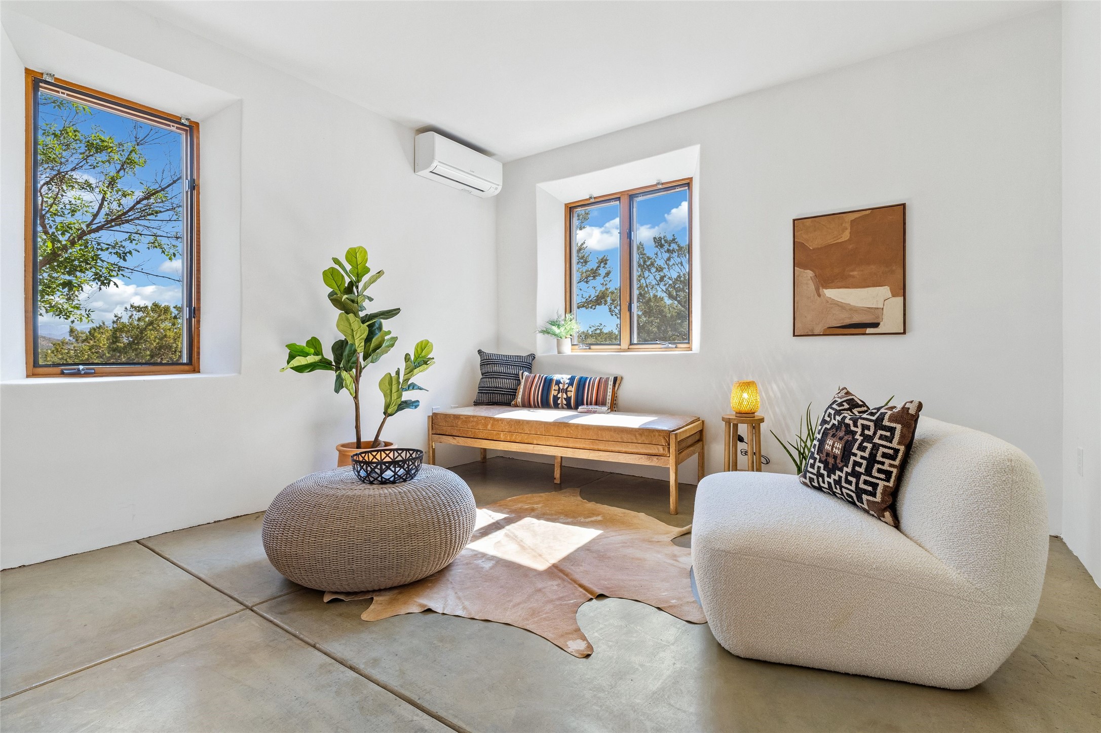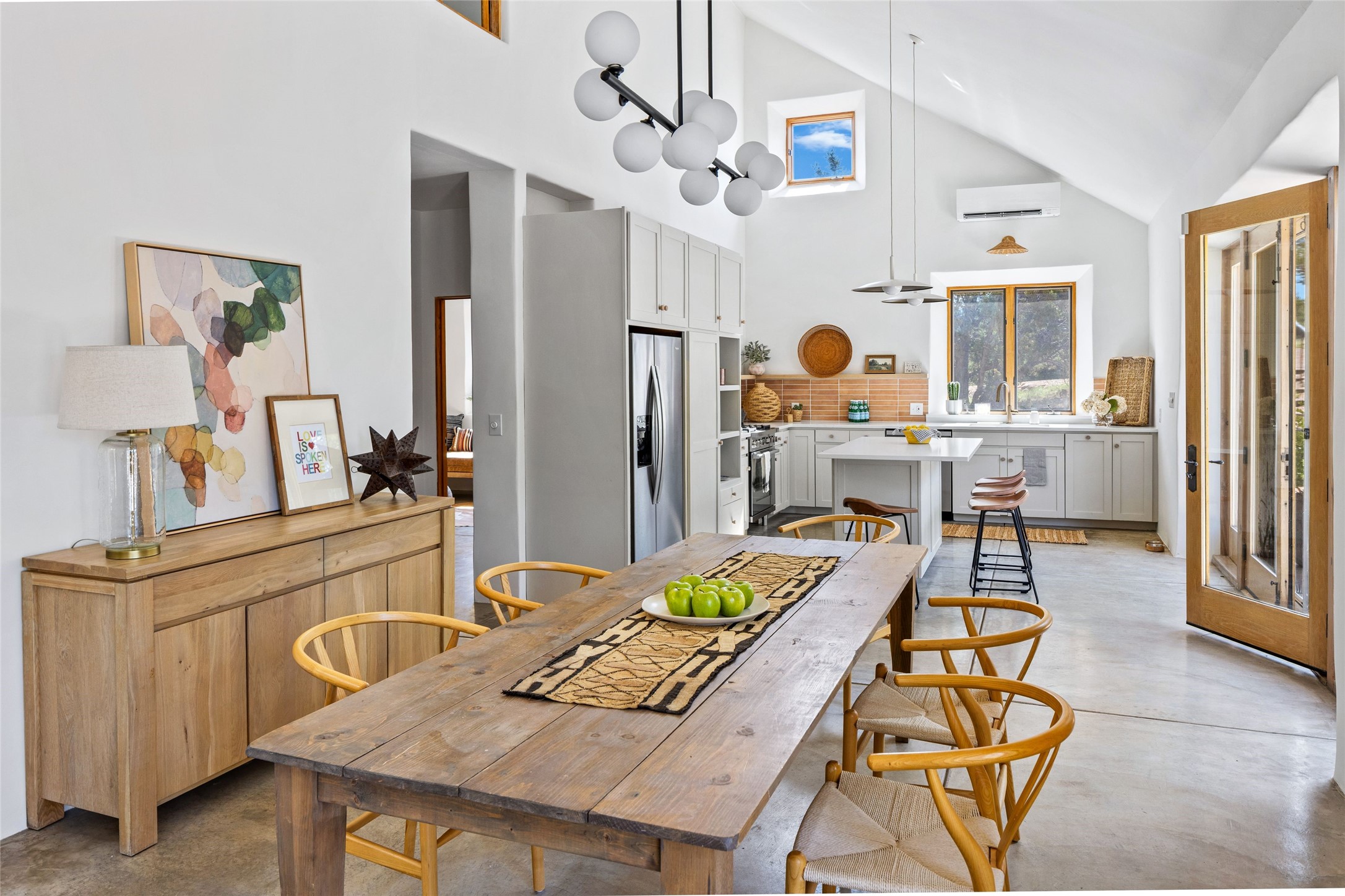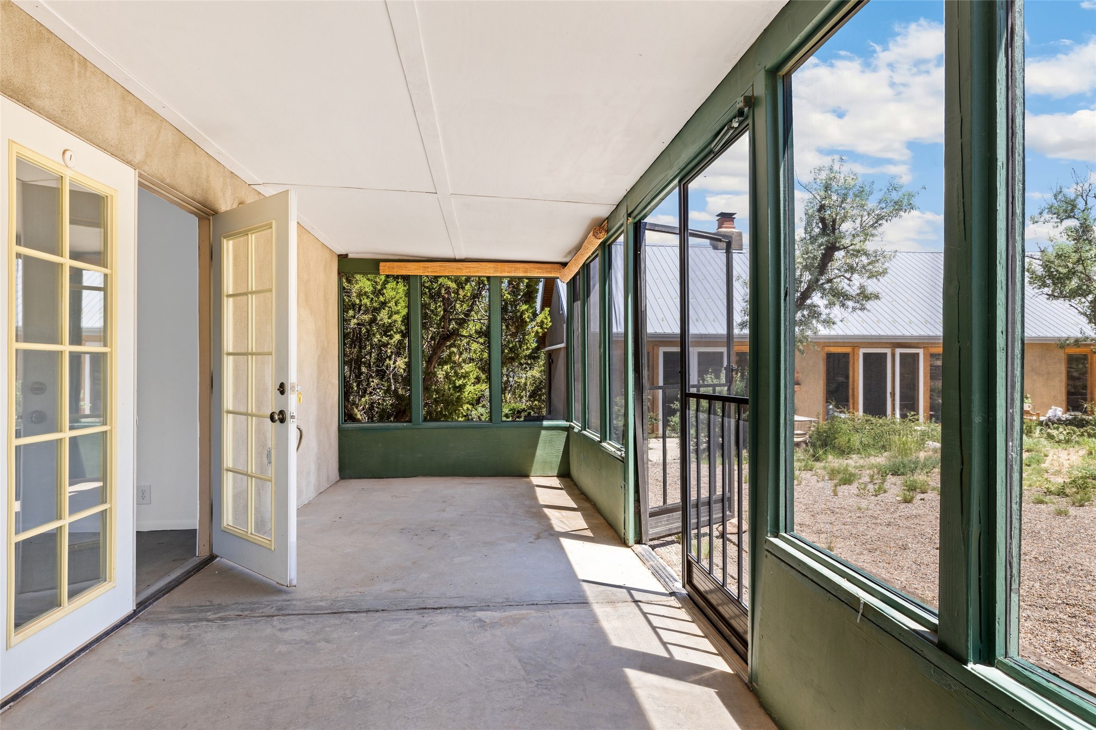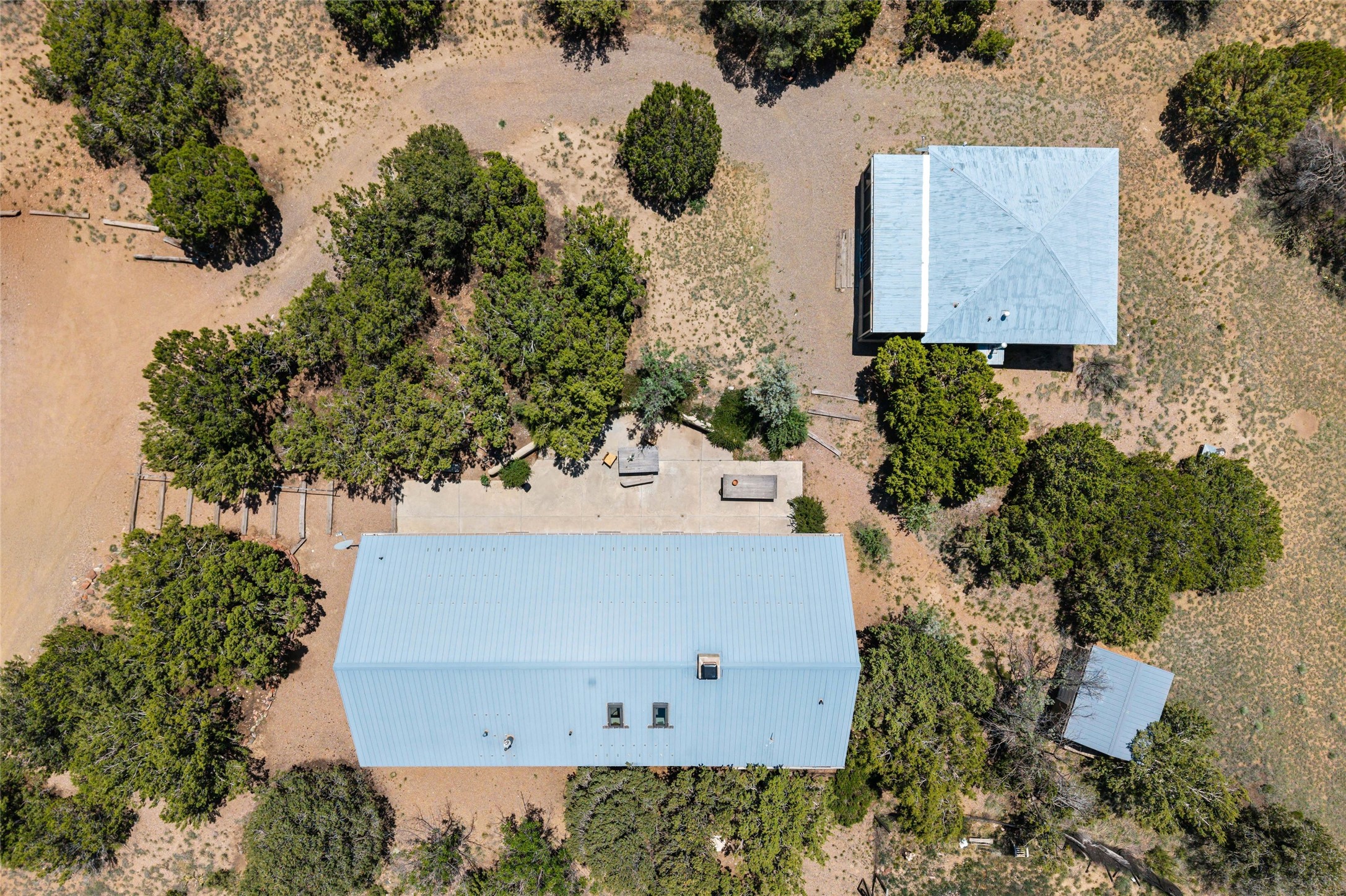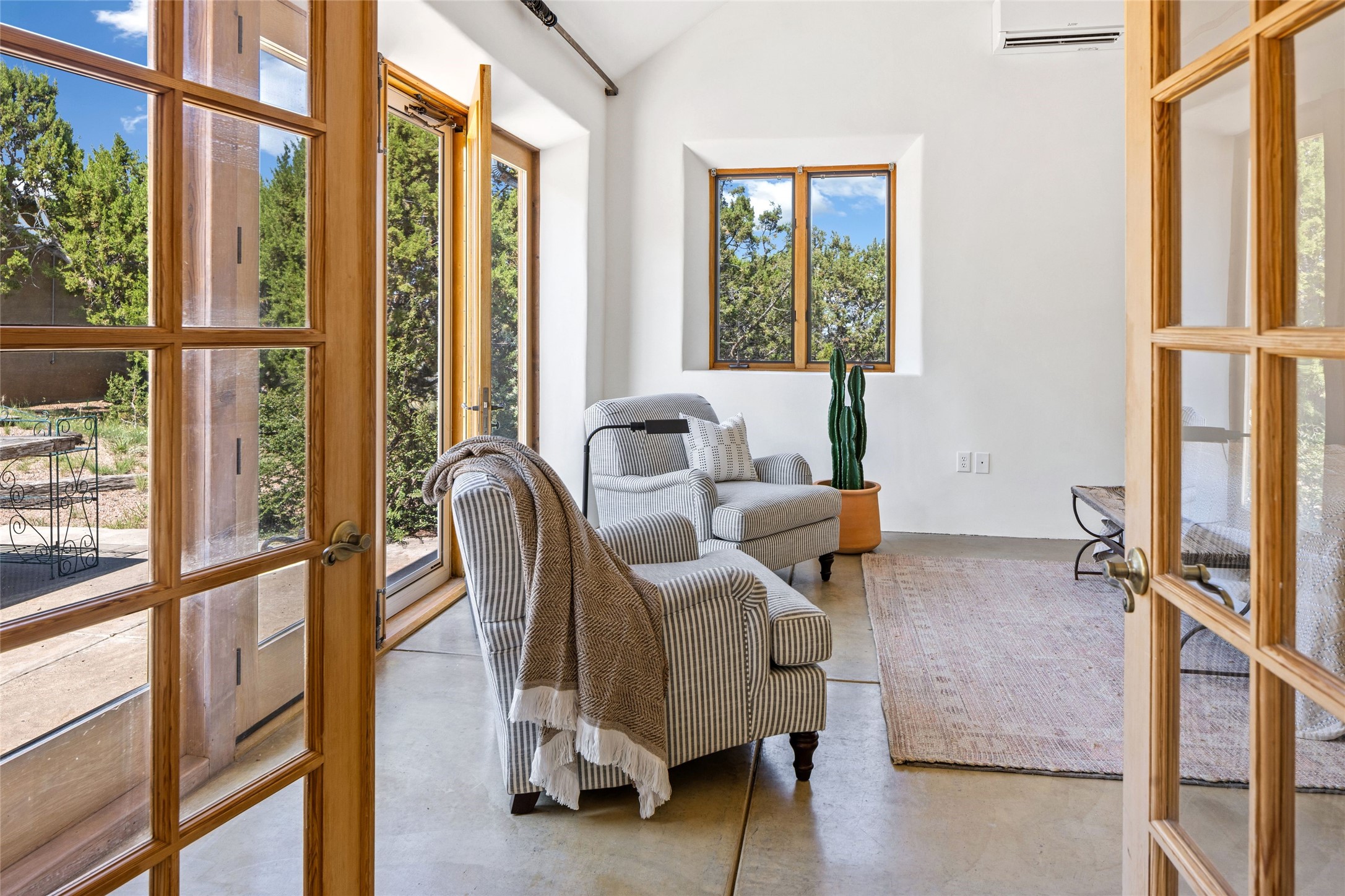 This custom built Northern New Mexico style home on 2.77 acres with mountain views was built by the previous owners as their primary residence and is now owned by a designer who added special design touches and mini splits for HVAC. This two bedroom home plus loft offers a contemporary feel with polished concrete floors and vaulted ceilings. Other features include a pitched Pro-panel roof, Pumice Crete walls and in-floor radiant heating. The recently updated island kitchen includes freshly painted cabinets, terra cotta tile backsplash, solid surface countertops and stainless steel appliances. The kitchen & dining room open to a spacious living room featuring a grand wood burning fireplace with high ceilings and a sculptural steel staircase leading to a cozy loft. Serene, light, and bright, this home has multiple large atrium doors that connect you to a tranquil outdoor entertaining area. The nearby fenced garden will delight, and you will relish the incredible nature that surrounds this exceptional home. The separate studio casita was added in 2007 and features concrete floors, a kitchenette, a three-quarter bath and a screened portal. Perched high on a on a hilltop, this home offers spectacular mountain views in a location near the restaurants and shopping of Lamy and Eldorado.