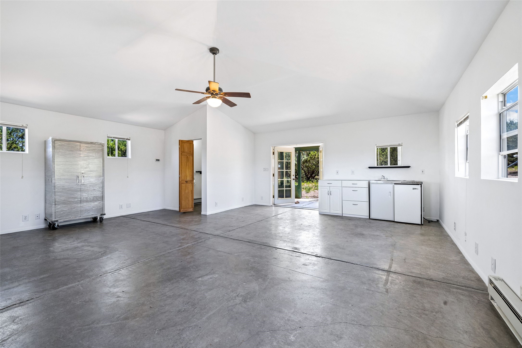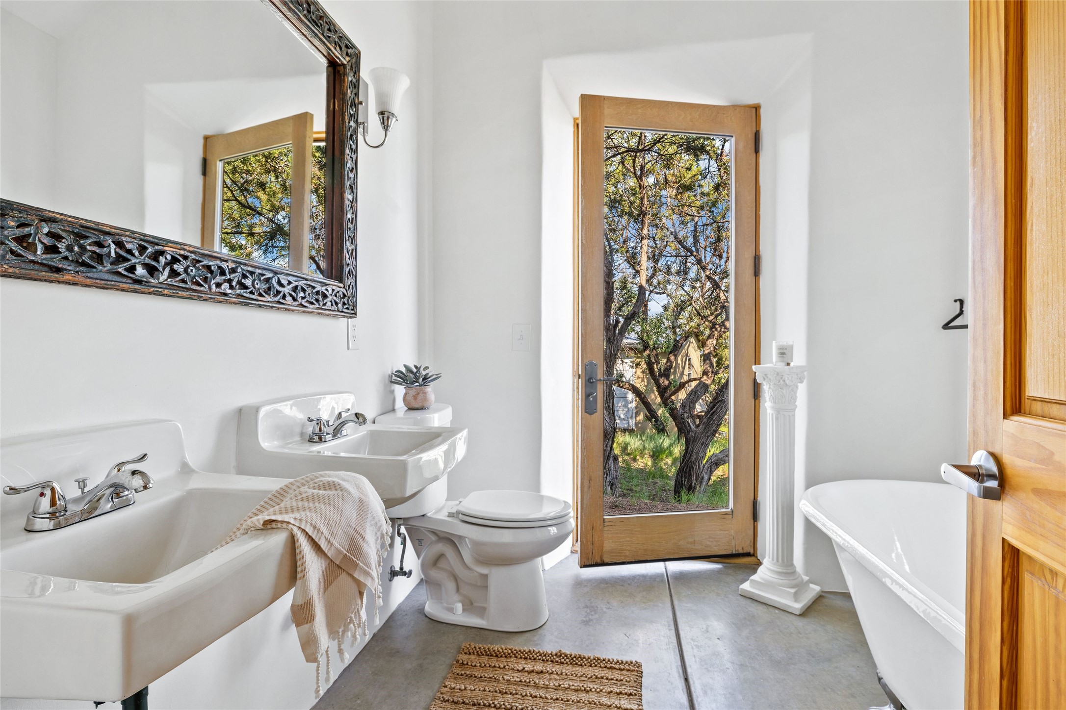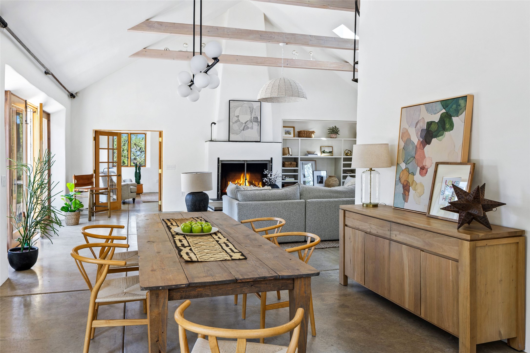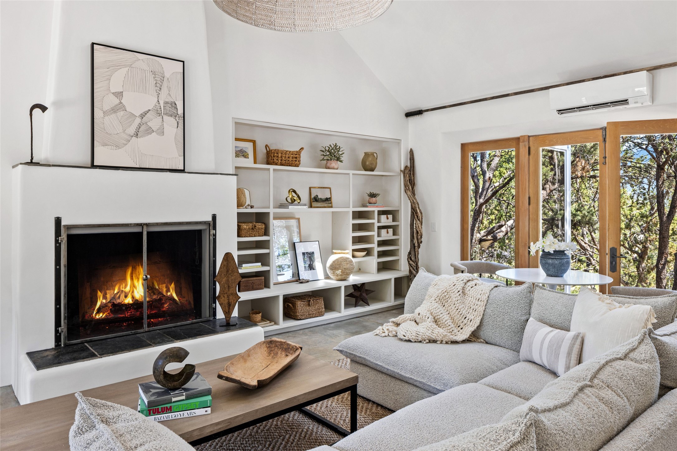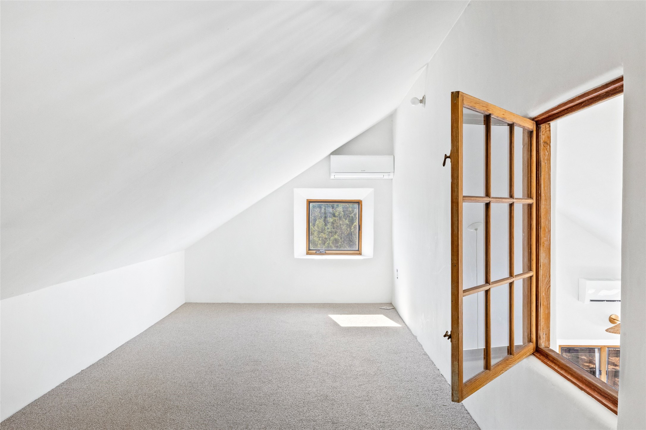 This custom built Northern New Mexico style home on 2.77 acres with mountain views was built by the previous owners as their primary residence and is now owned by a designer who added special design touches and mini splits for HVAC. This two bedroom home plus loft offers a contemporary feel with polished concrete floors and vaulted ceilings. Other features include a pitched Pro-panel roof, Pumice Crete walls and in-floor radiant heating. The recently updated island kitchen includes freshly painted cabinets, terra cotta tile backsplash, solid surface countertops and stainless steel appliances. The kitchen & dining room open to a spacious living room featuring a grand wood burning fireplace with high ceilings and a sculptural steel staircase leading to a cozy loft. Serene, light, and bright, this home has multiple large atrium doors that connect you to a tranquil outdoor entertaining area. The nearby fenced garden will delight, and you will relish the incredible nature that surrounds this exceptional home. The separate studio casita was added in 2007 and features concrete floors, a kitchenette, a three-quarter bath and a screened portal. Perched high on a on a hilltop, this home offers spectacular mountain views in a location near the restaurants and shopping of Lamy and Eldorado.