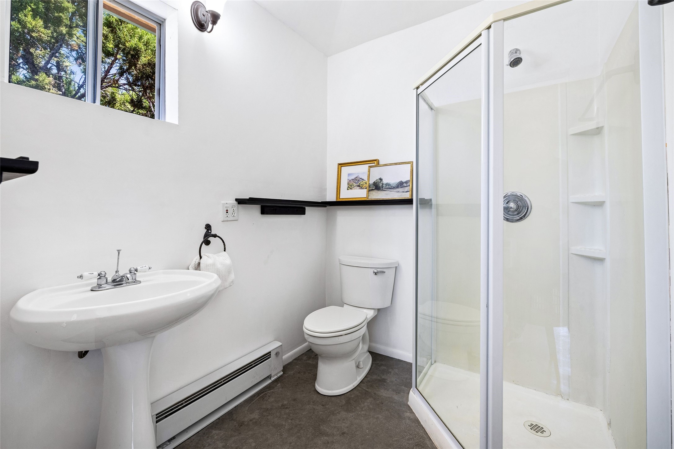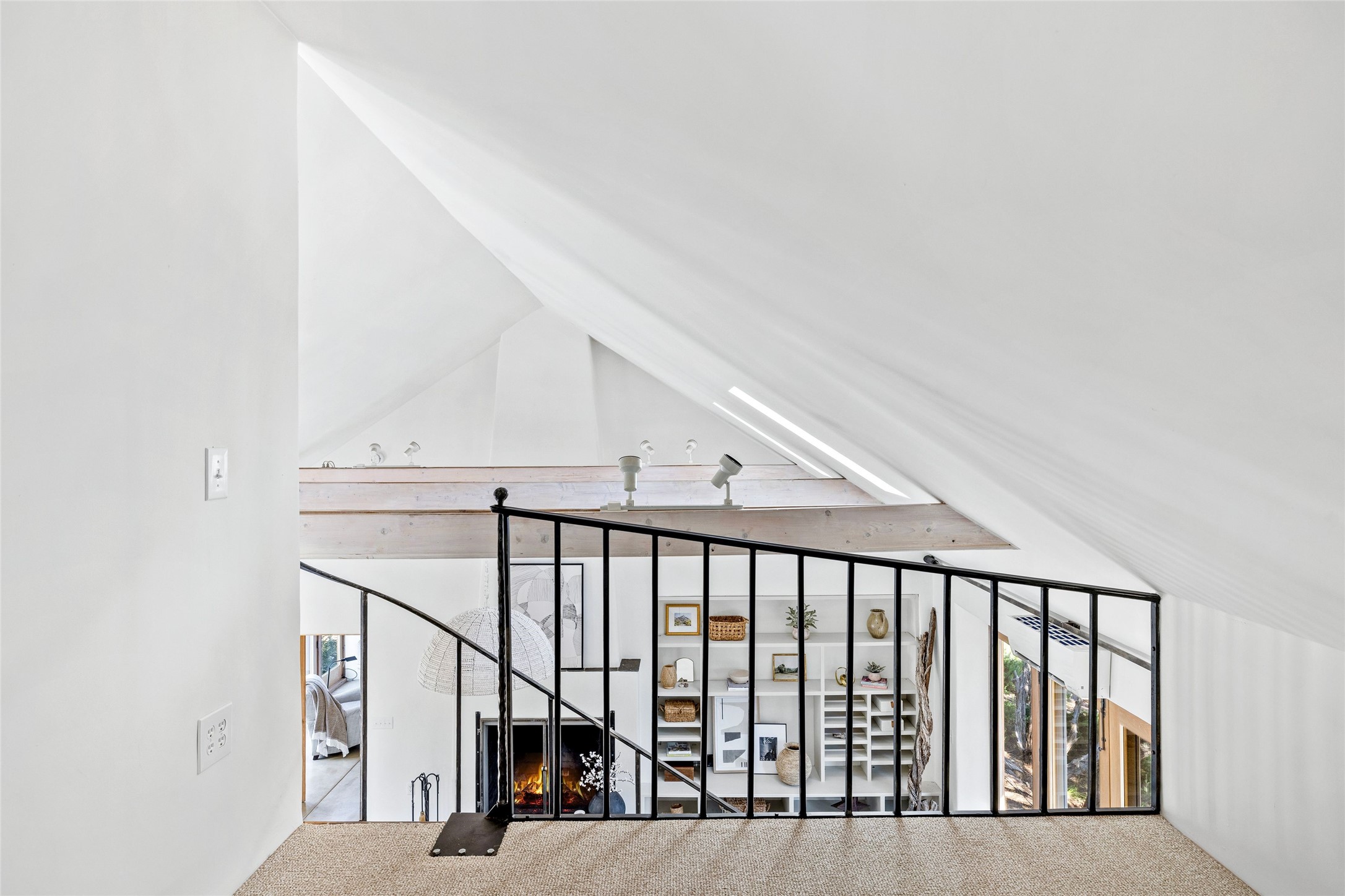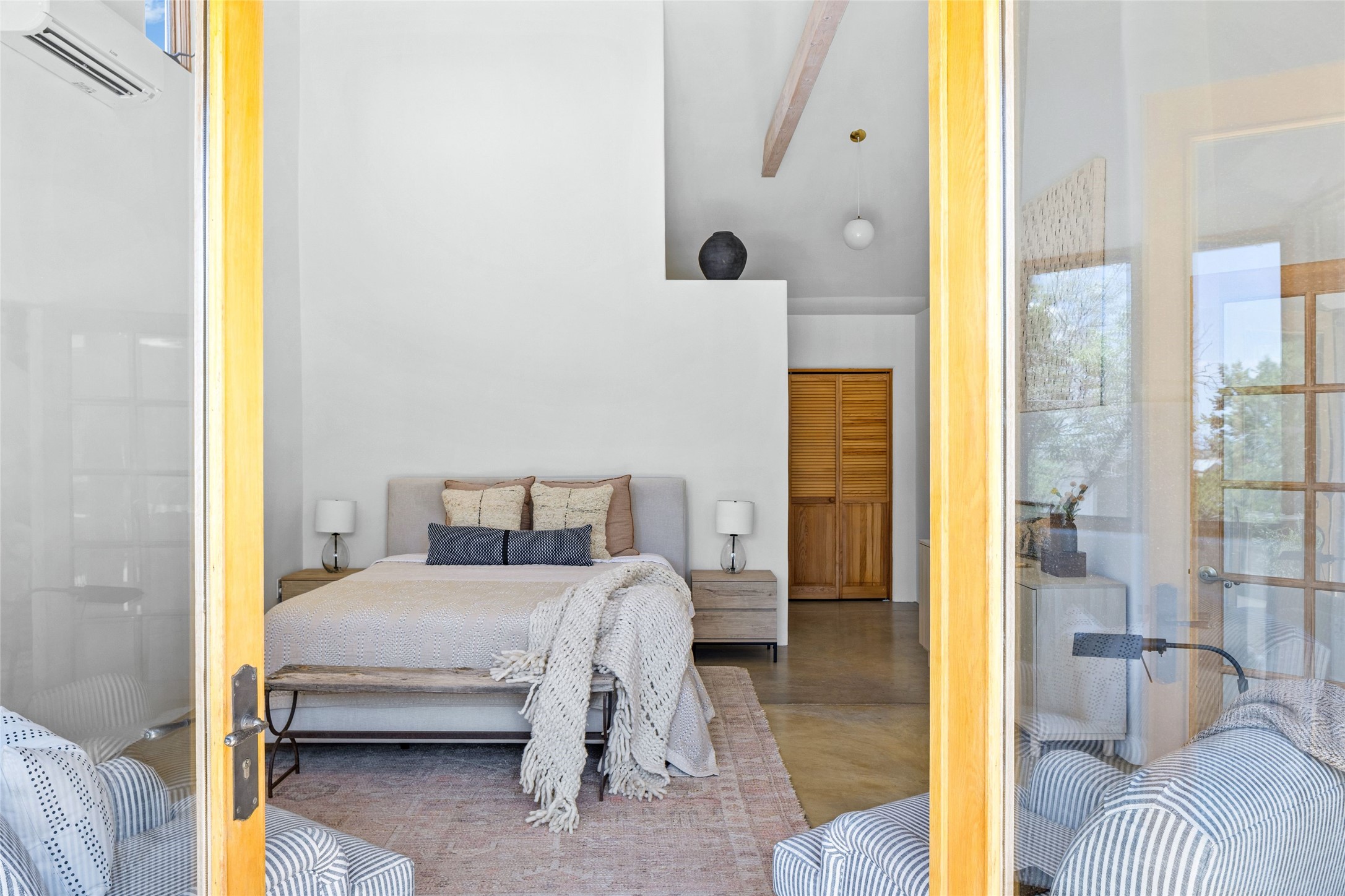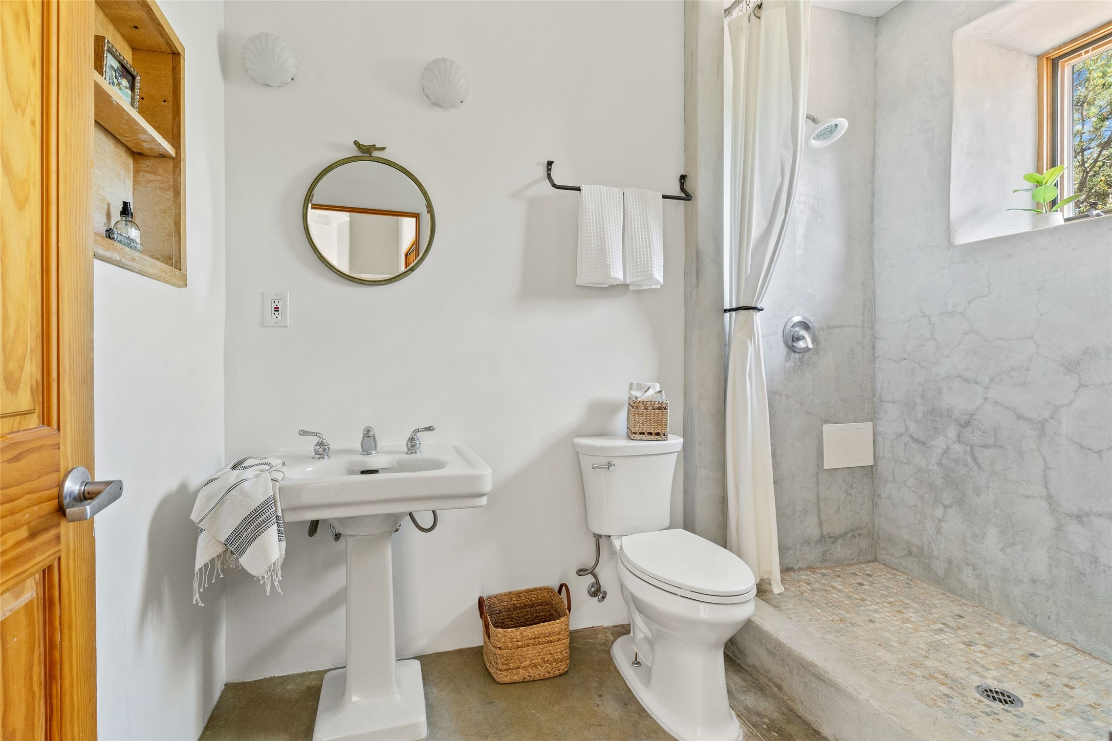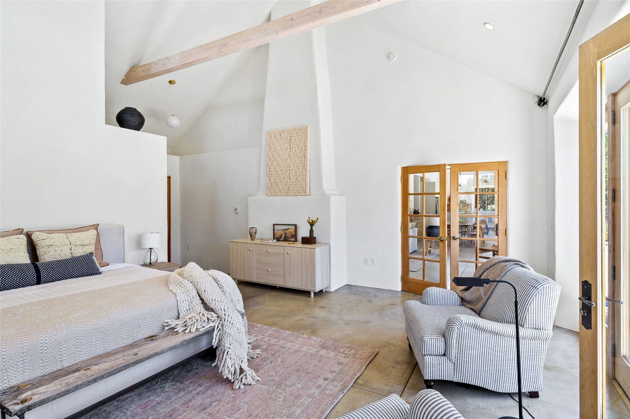 This custom built Northern New Mexico style home on 2.77 acres with mountain views was built by the previous owners as their primary residence and is now owned by a designer who added special design touches and mini splits for HVAC. This two bedroom home plus loft offers a contemporary feel with polished concrete floors and vaulted ceilings. Other features include a pitched Pro-panel roof, Pumice Crete walls and in-floor radiant heating. The recently updated island kitchen includes freshly painted cabinets, terra cotta tile backsplash, solid surface countertops and stainless steel appliances. The kitchen & dining room open to a spacious living room featuring a grand wood burning fireplace with high ceilings and a sculptural steel staircase leading to a cozy loft. Serene, light, and bright, this home has multiple large atrium doors that connect you to a tranquil outdoor entertaining area. The nearby fenced garden will delight, and you will relish the incredible nature that surrounds this exceptional home. The separate studio casita was added in 2007 and features concrete floors, a kitchenette, a three-quarter bath and a screened portal. Perched high on a on a hilltop, this home offers spectacular mountain views in a location near the restaurants and shopping of Lamy and Eldorado.