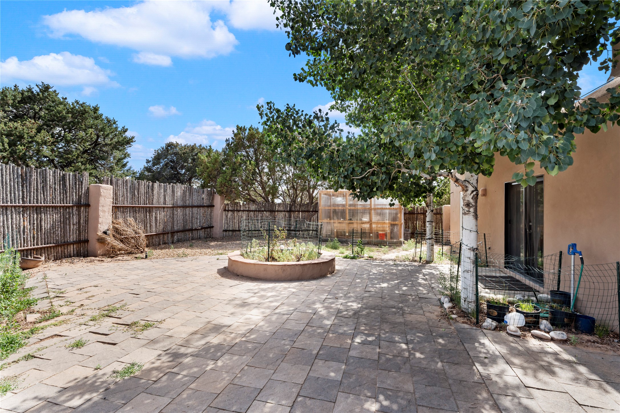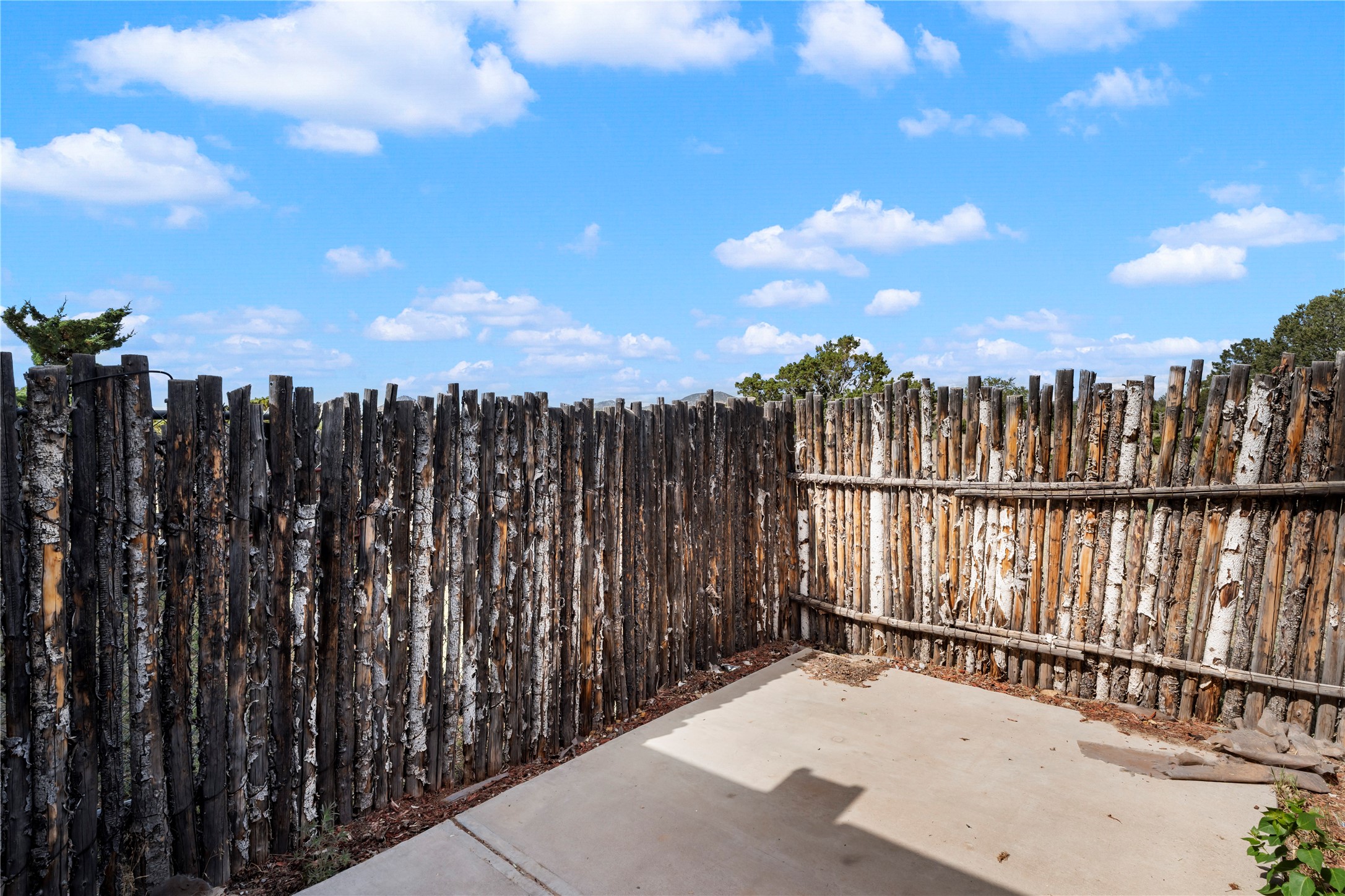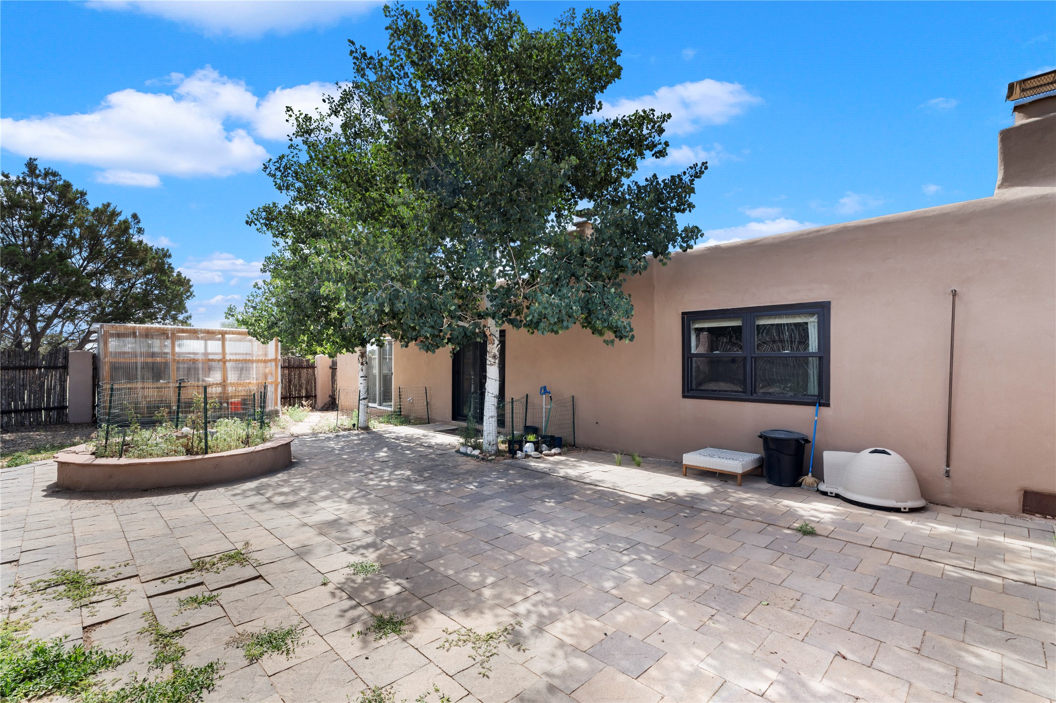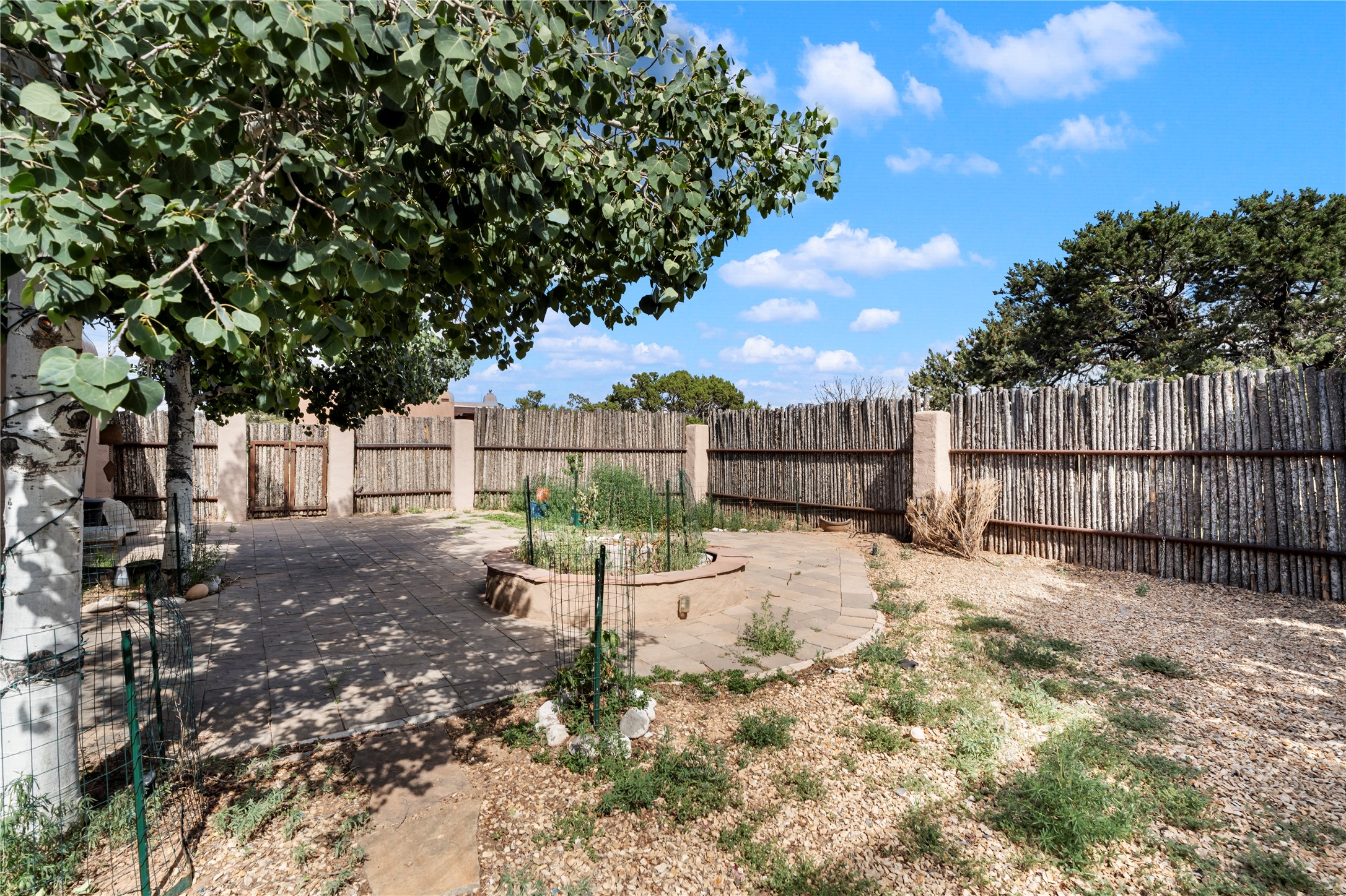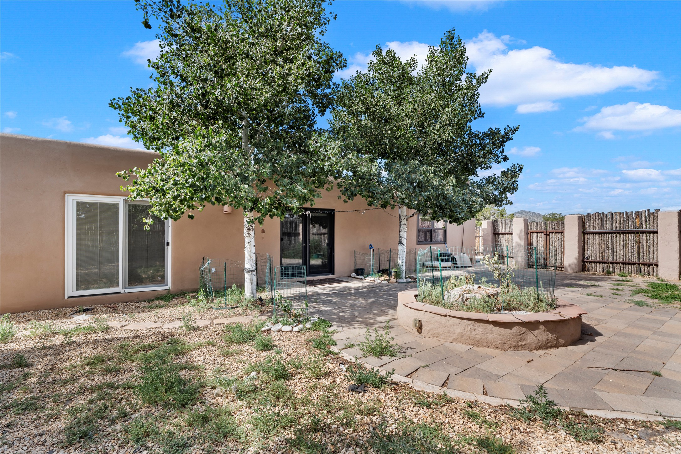 Walking distance to Eldorado School! Cheery and light Single Level home offers an open and inviting floor plan with great bedroom separation. The bedrooms feature two master suites and the third bedroom has direct access to the third bathroom. Home has wood beams in the great room and two wood burning kiva fireplaces. A portion of the garage was used to add a bathroom and closet to make a second master suite. Approx. 254 feet remains available to use as a workshop or studio, or could possibly park a small car. There are 3 exterior patio spaces to enjoy mountain views from the enclosed front patio, or sun bath off the private patio off one of the master bedrooms! Eldorado is home to miles of hiking and biking paths, thousands of acres of wilderness preserve, K-9 school, summertime pool, library, community center, shopping and dining, and a setting where you really can star gaze!