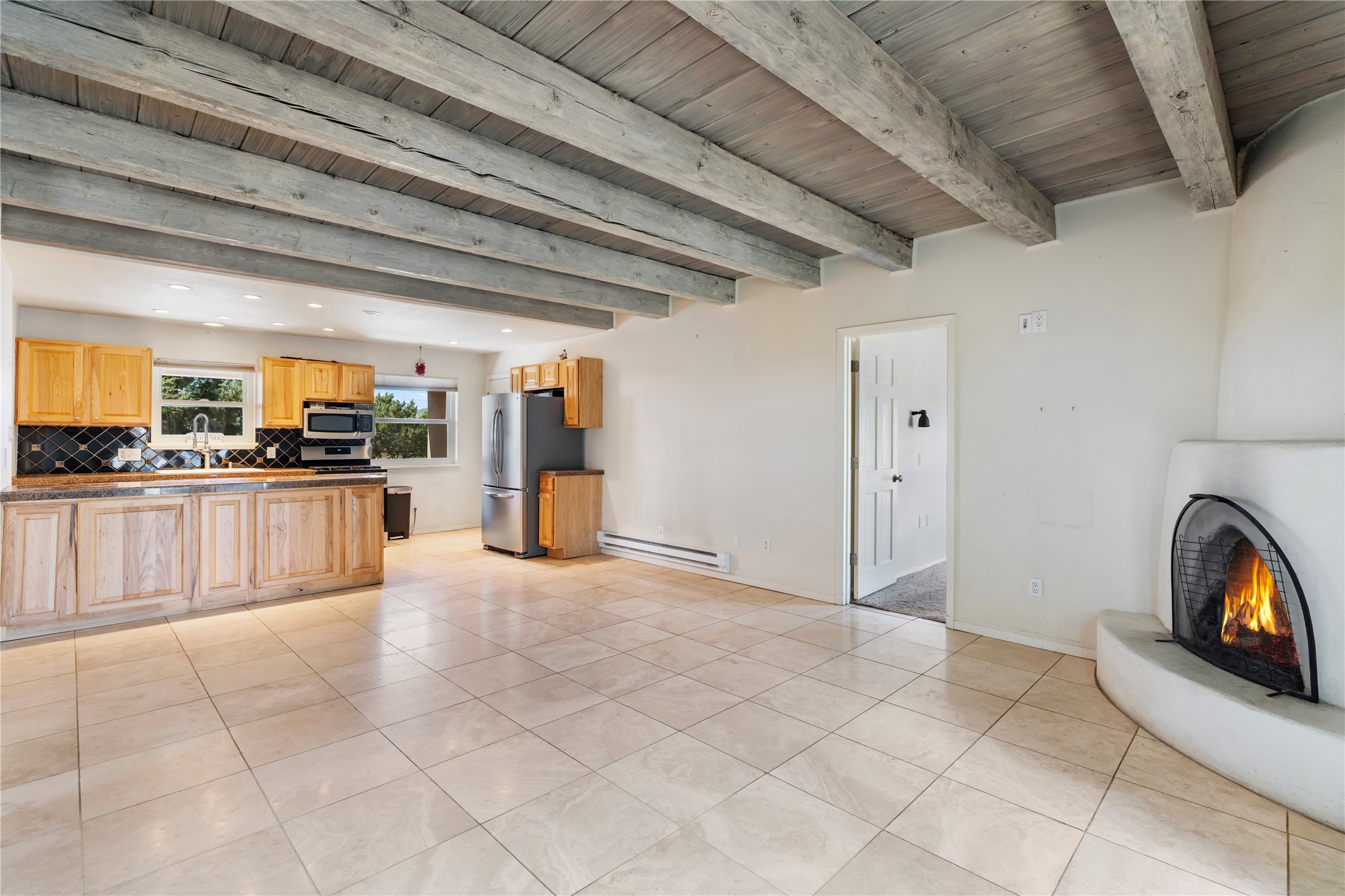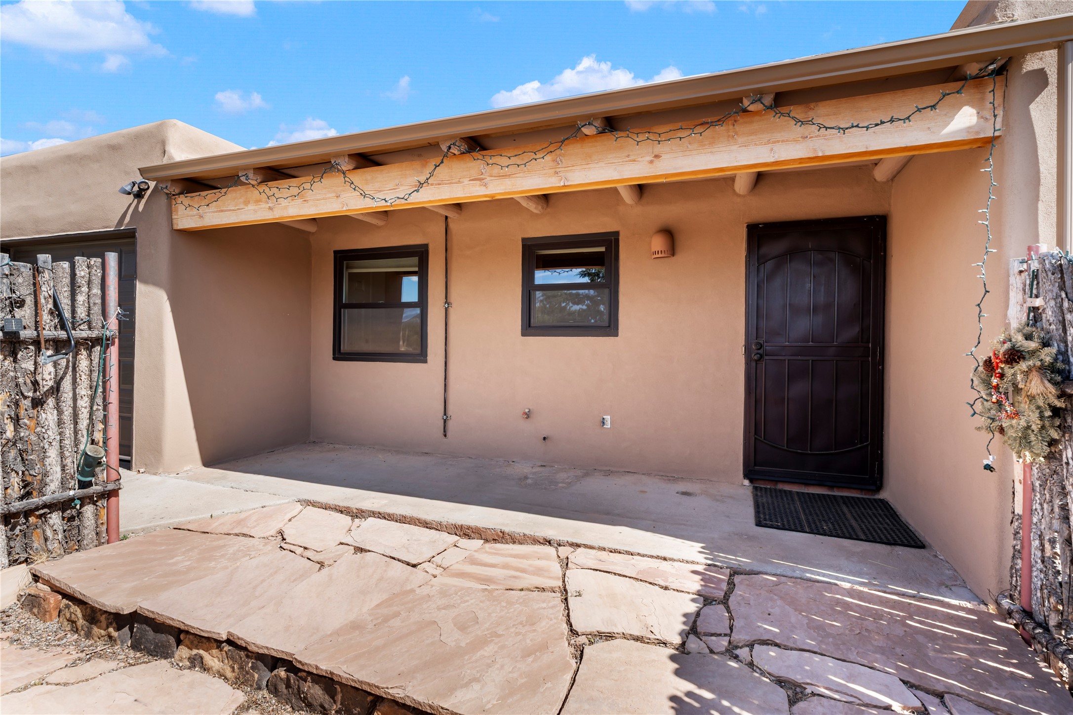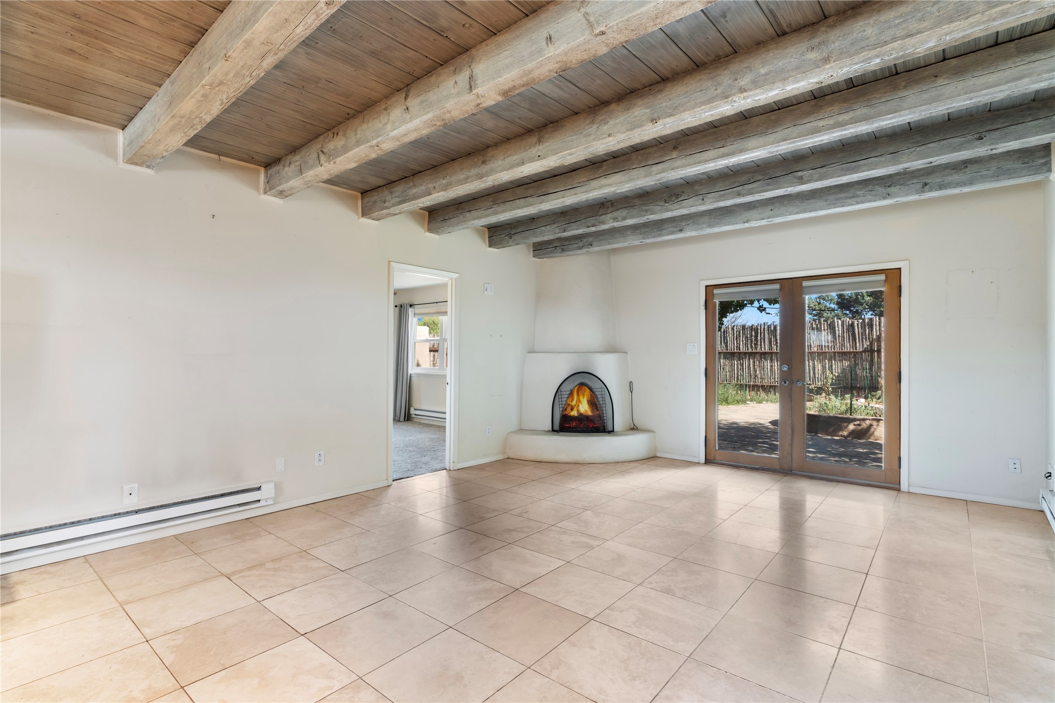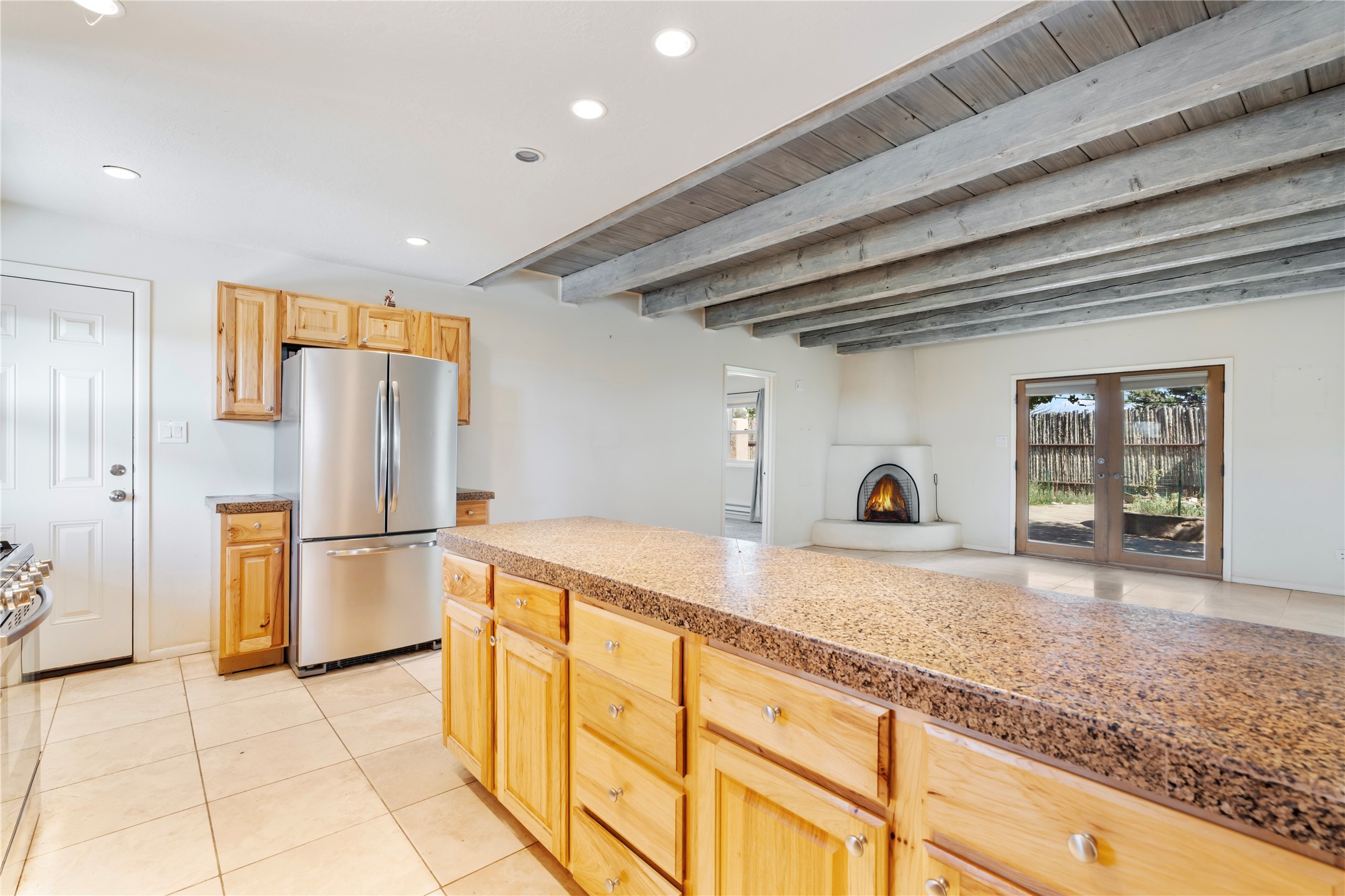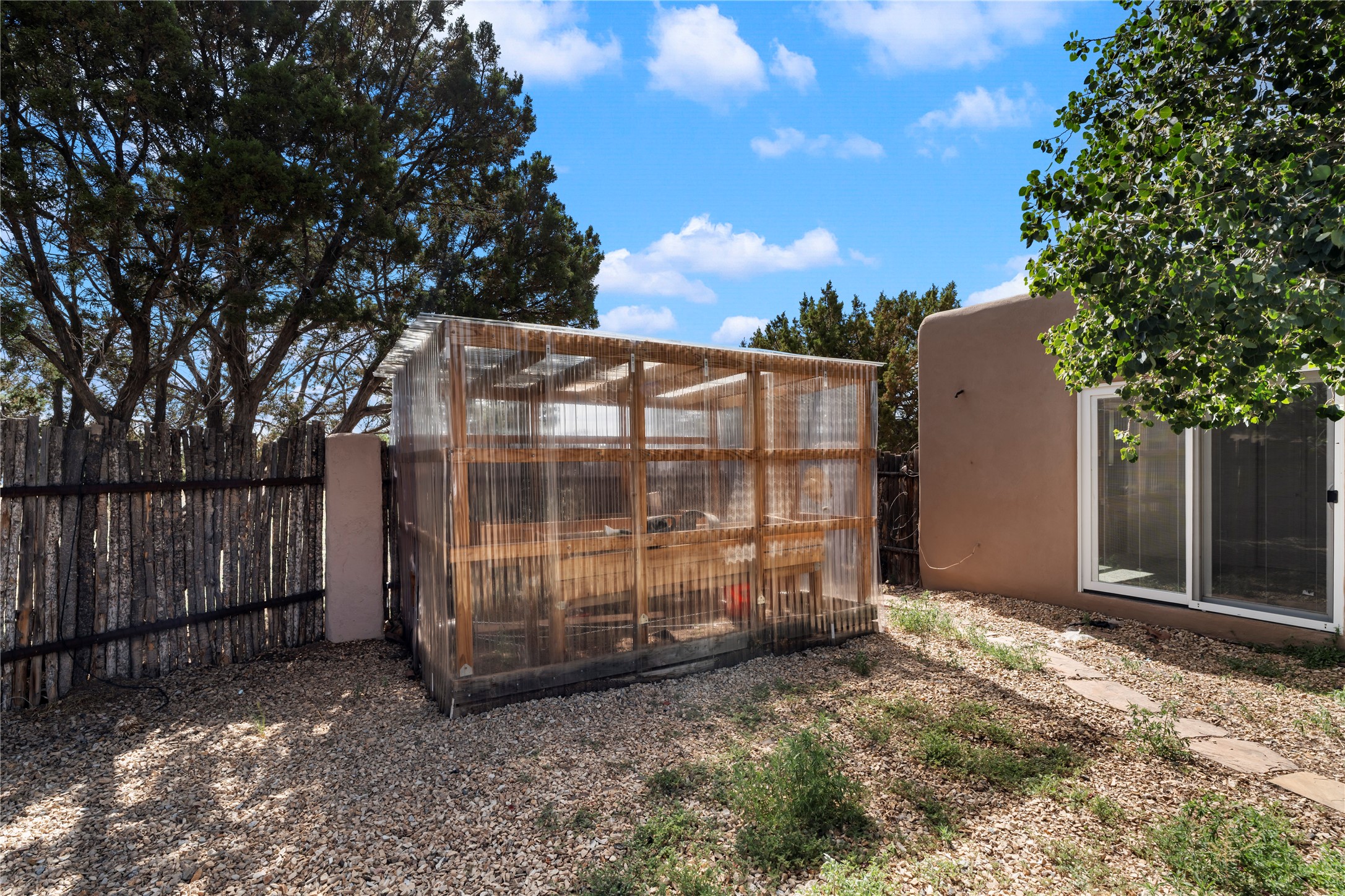 Walking distance to Eldorado School! Cheery and light Single Level home offers an open and inviting floor plan with great bedroom separation. The bedrooms feature two master suites and the third bedroom has direct access to the third bathroom. Home has wood beams in the great room and two wood burning kiva fireplaces. A portion of the garage was used to add a bathroom and closet to make a second master suite. Approx. 254 feet remains available to use as a workshop or studio, or could possibly park a small car. There are 3 exterior patio spaces to enjoy mountain views from the enclosed front patio, or sun bath off the private patio off one of the master bedrooms! Eldorado is home to miles of hiking and biking paths, thousands of acres of wilderness preserve, K-9 school, summertime pool, library, community center, shopping and dining, and a setting where you really can star gaze!