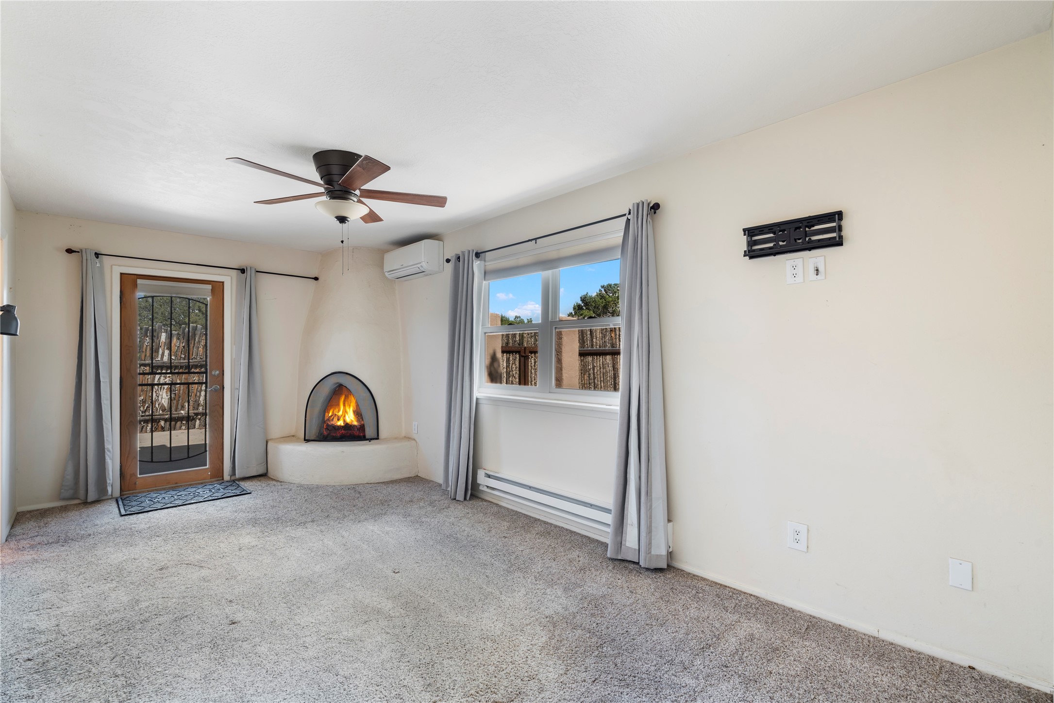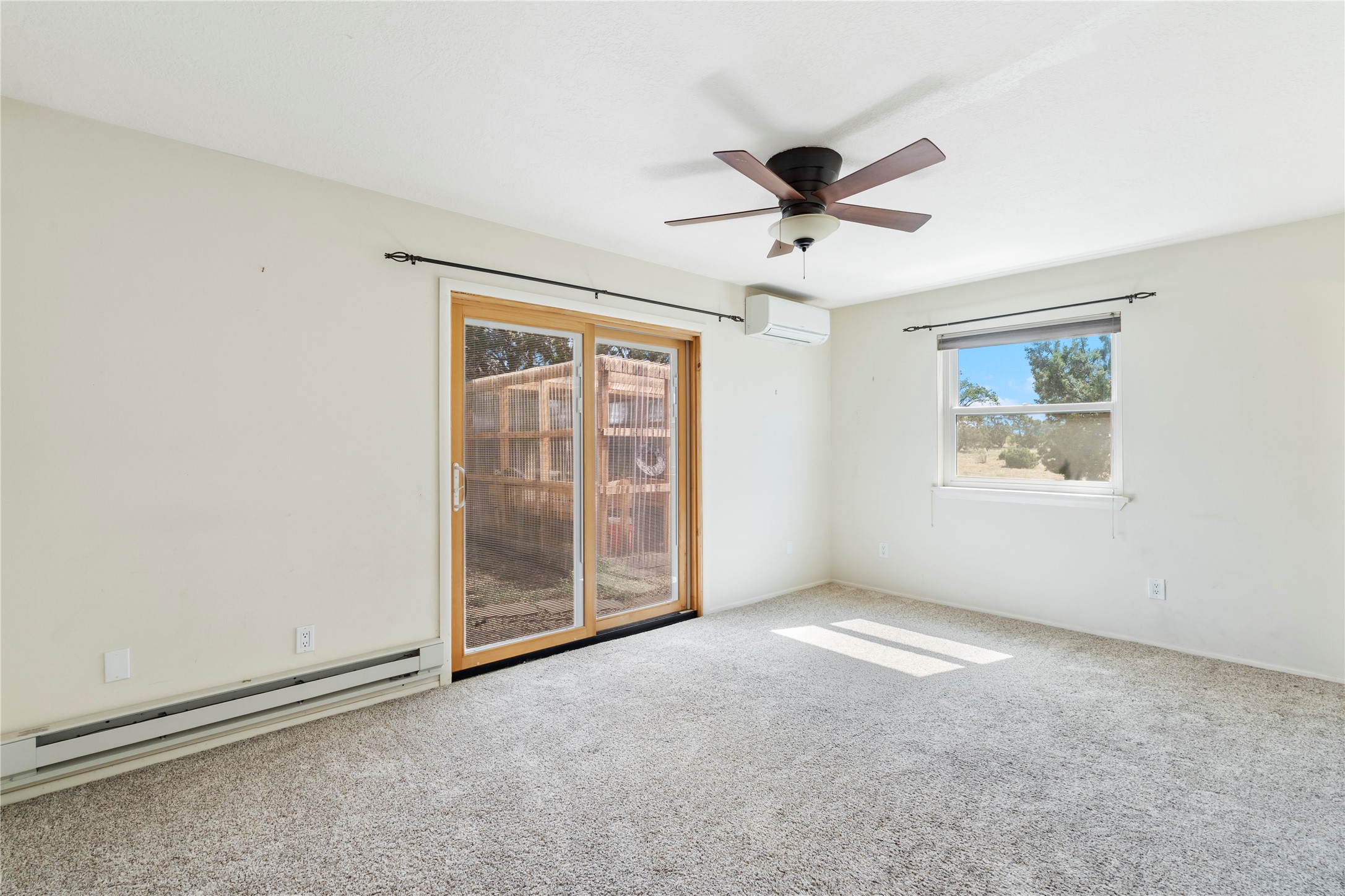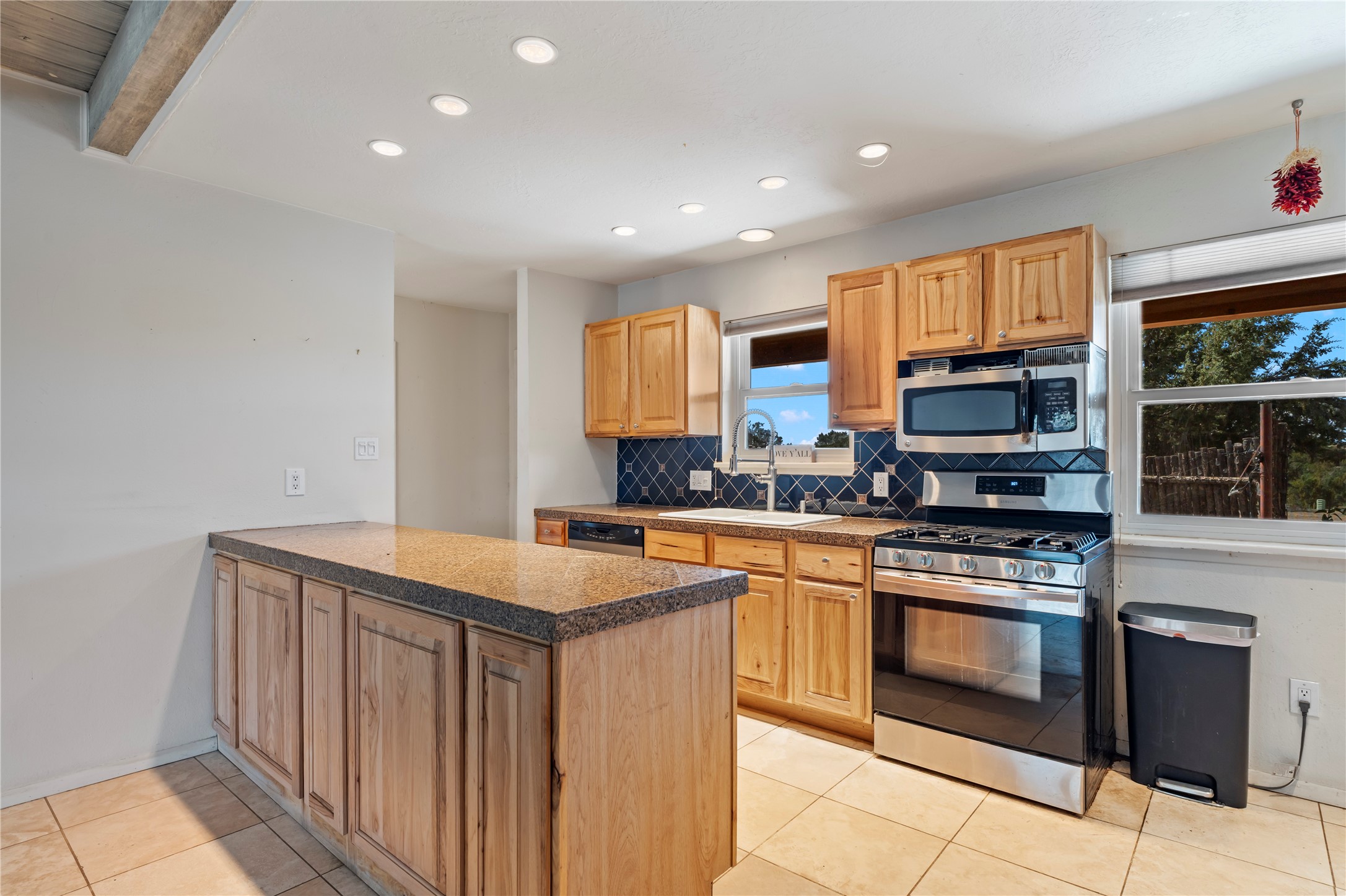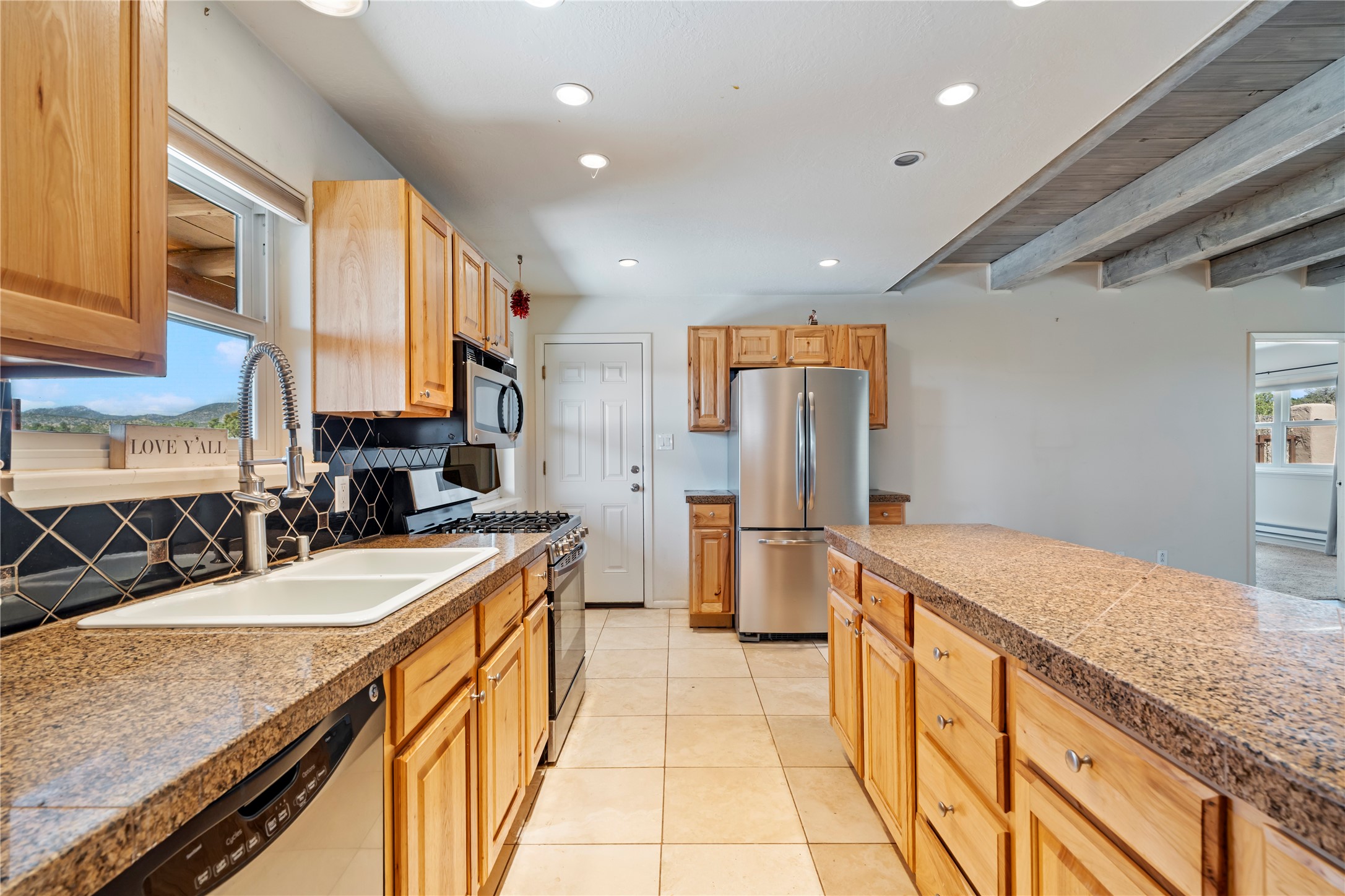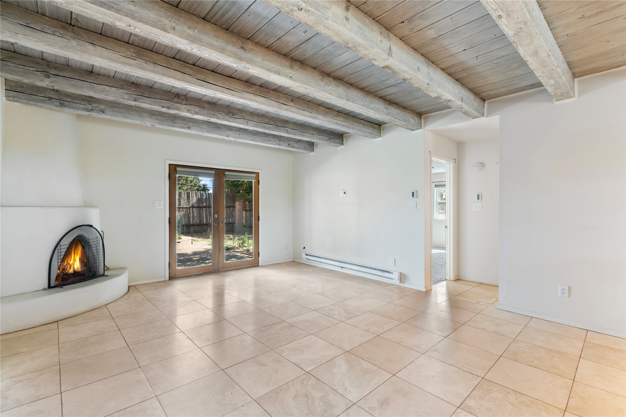 Walking distance to Eldorado School! Cheery and light Single Level home offers an open and inviting floor plan with great bedroom separation. The bedrooms feature two master suites and the third bedroom has direct access to the third bathroom. Home has wood beams in the great room and two wood burning kiva fireplaces. A portion of the garage was used to add a bathroom and closet to make a second master suite. Approx. 254 feet remains available to use as a workshop or studio, or could possibly park a small car. There are 3 exterior patio spaces to enjoy mountain views from the enclosed front patio, or sun bath off the private patio off one of the master bedrooms! Eldorado is home to miles of hiking and biking paths, thousands of acres of wilderness preserve, K-9 school, summertime pool, library, community center, shopping and dining, and a setting where you really can star gaze!