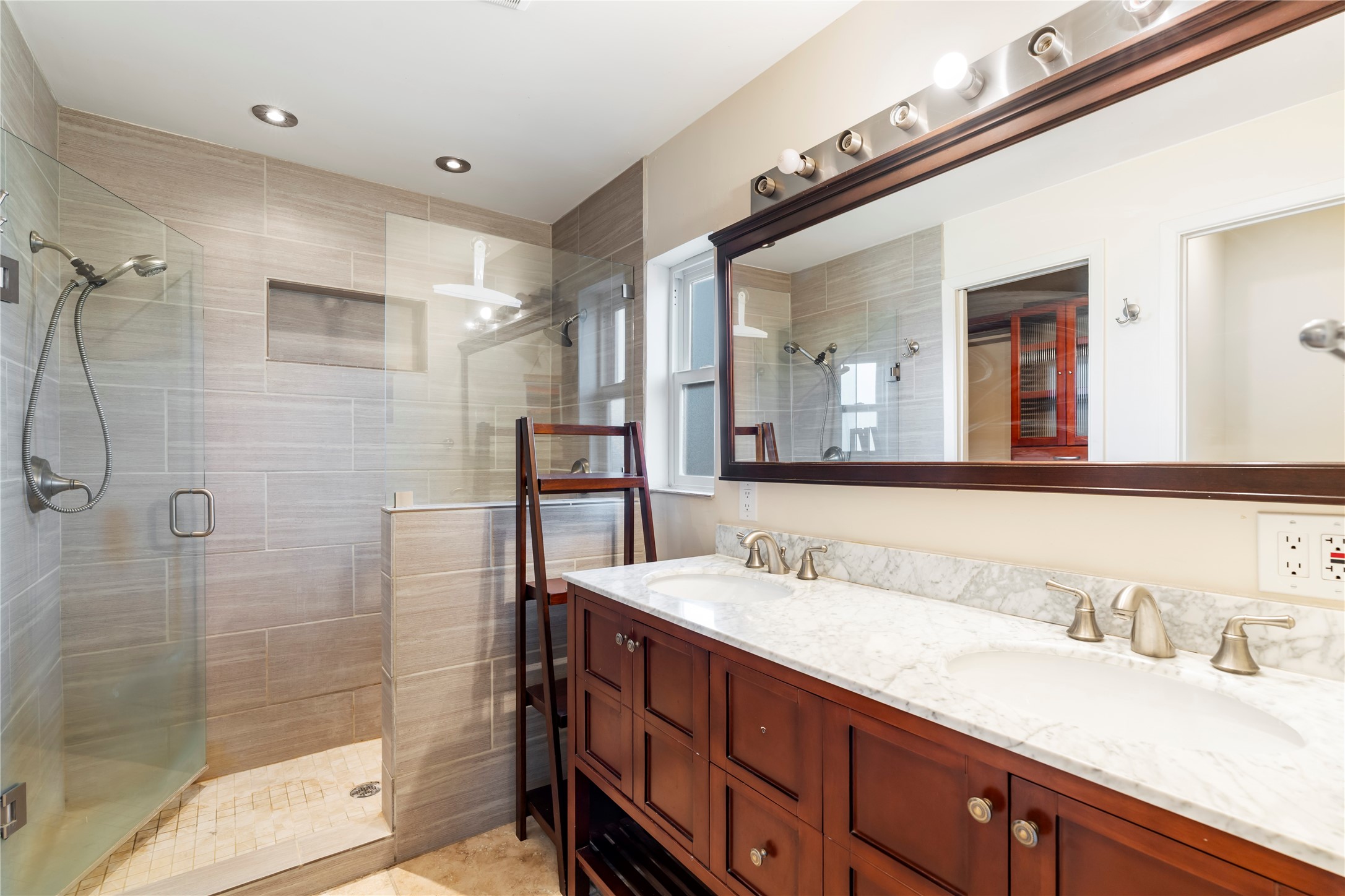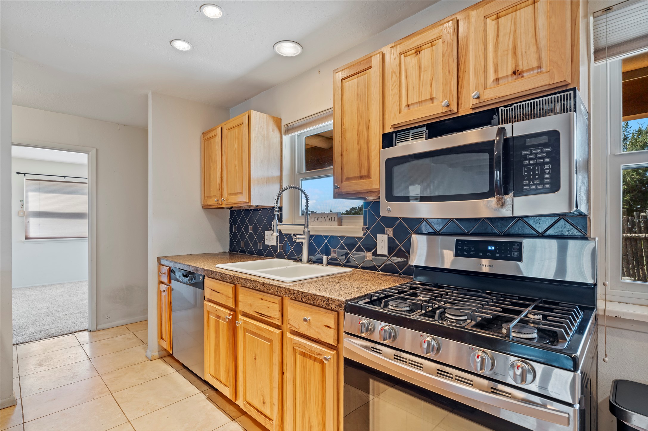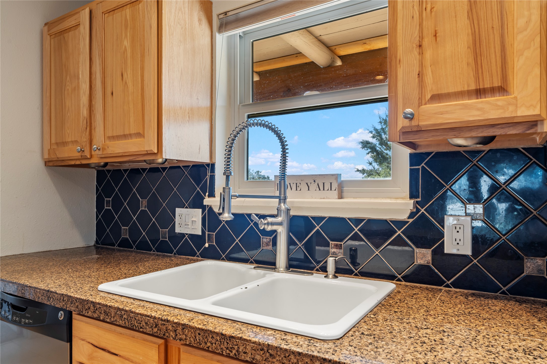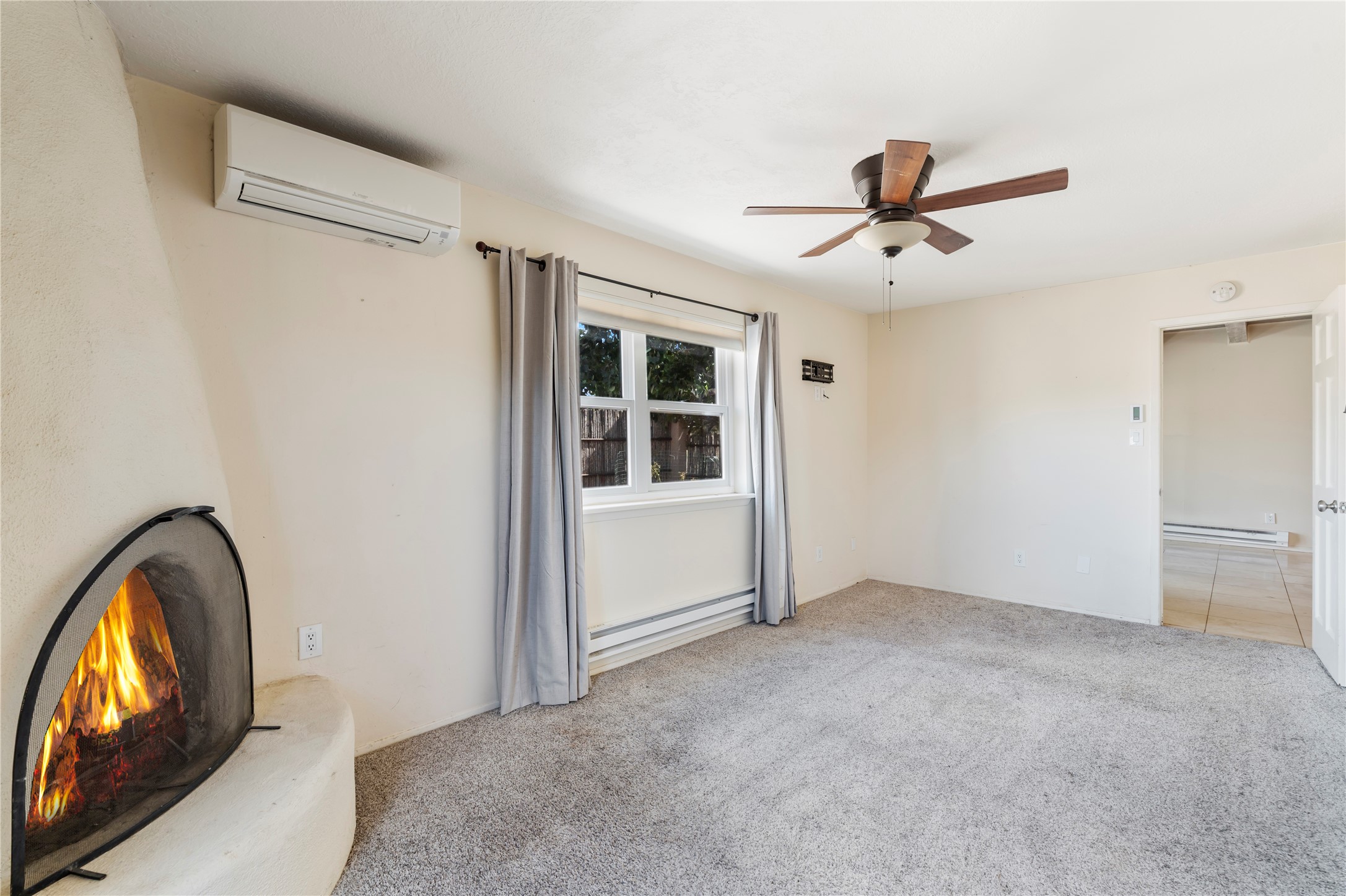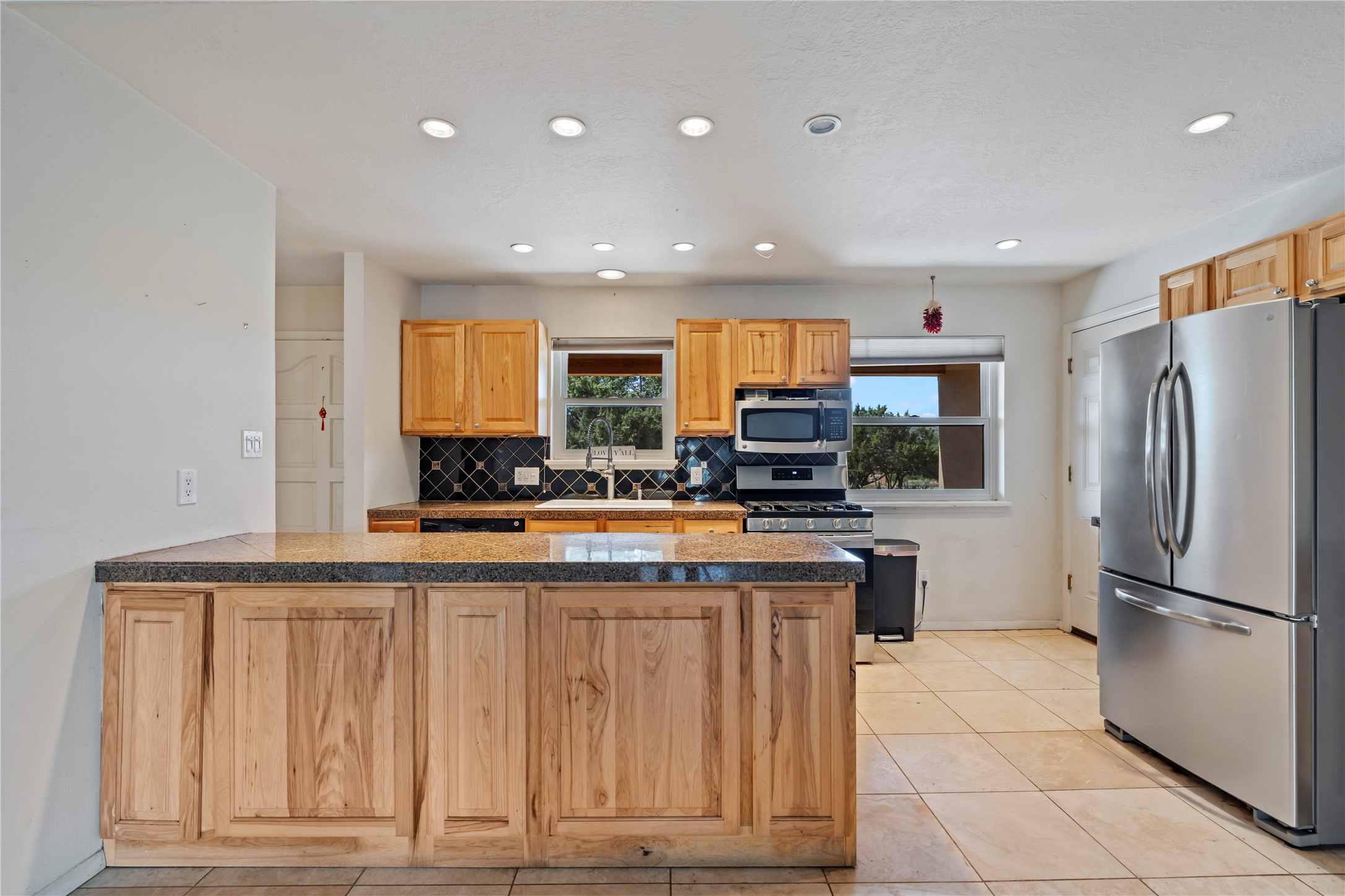 Walking distance to Eldorado School! Cheery and light Single Level home offers an open and inviting floor plan with great bedroom separation. The bedrooms feature two master suites and the third bedroom has direct access to the third bathroom. Home has wood beams in the great room and two wood burning kiva fireplaces. A portion of the garage was used to add a bathroom and closet to make a second master suite. Approx. 254 feet remains available to use as a workshop or studio, or could possibly park a small car. There are 3 exterior patio spaces to enjoy mountain views from the enclosed front patio, or sun bath off the private patio off one of the master bedrooms! Eldorado is home to miles of hiking and biking paths, thousands of acres of wilderness preserve, K-9 school, summertime pool, library, community center, shopping and dining, and a setting where you really can star gaze!
