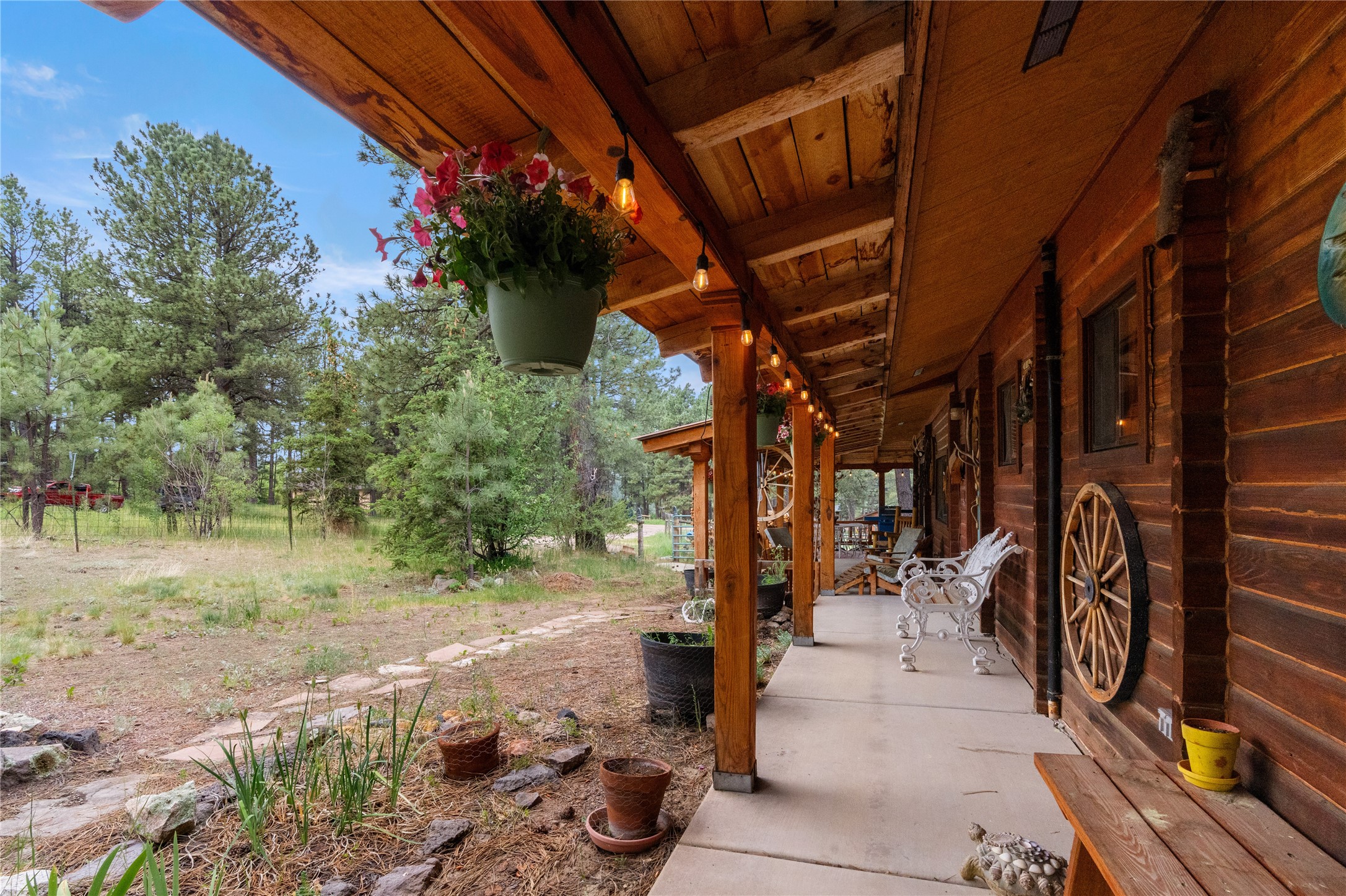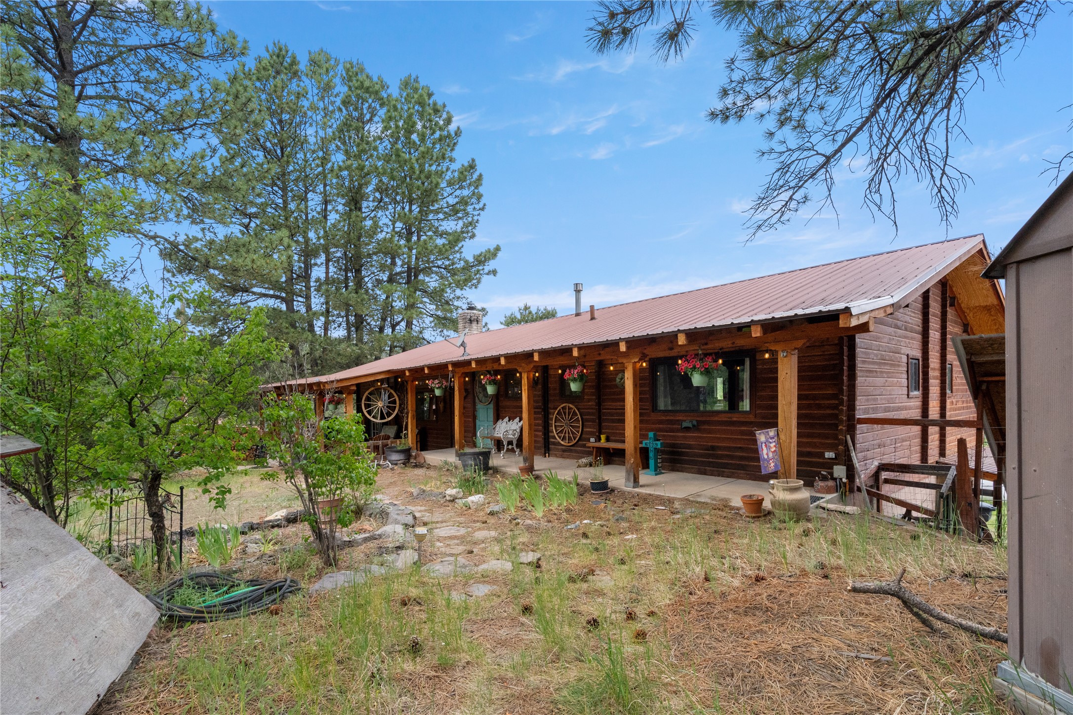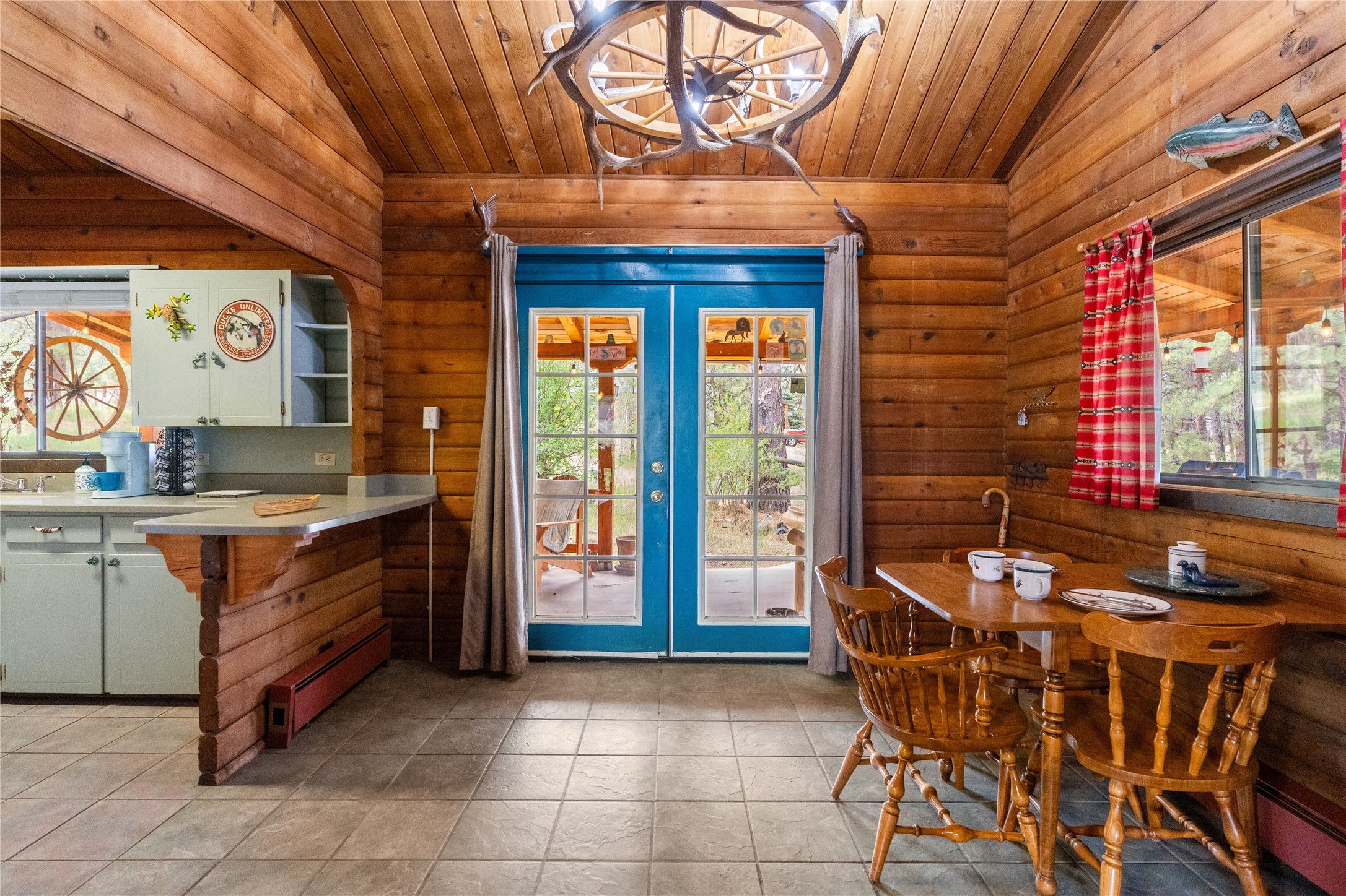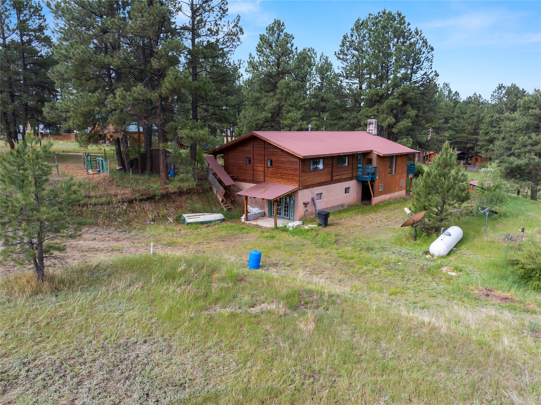 Lucky enough to live in the mountains...then you're lucky enough! This 2-bedroom, 1-bath 2,219 sq ft log cabin on 1.2 acres in La Cueva is the perfect spot! Originally a 3-bedroom, one room was opened up to expand the primary suite--but it could easily be converted back. The fabulous Panabode cabin with its interlocking log design blends modern living with traditional. From the wagon wheel-antler chandelier to the arched doorways & rustic warm interiors, the cedar tongue-&-groove cathedral wood ceiling, & the inviting rocking chair wrap-around covered porch, every detail enhances the home's irresistible charm! The spacious main bedroom is perfect to add in a cozy reading nook or office. Walk-out basement offers endless possibilities--finish it for extra bedrooms or a rec room or keep it as a workshop. You won't find a better location for a sweet weekend getaway or a full-time residence!