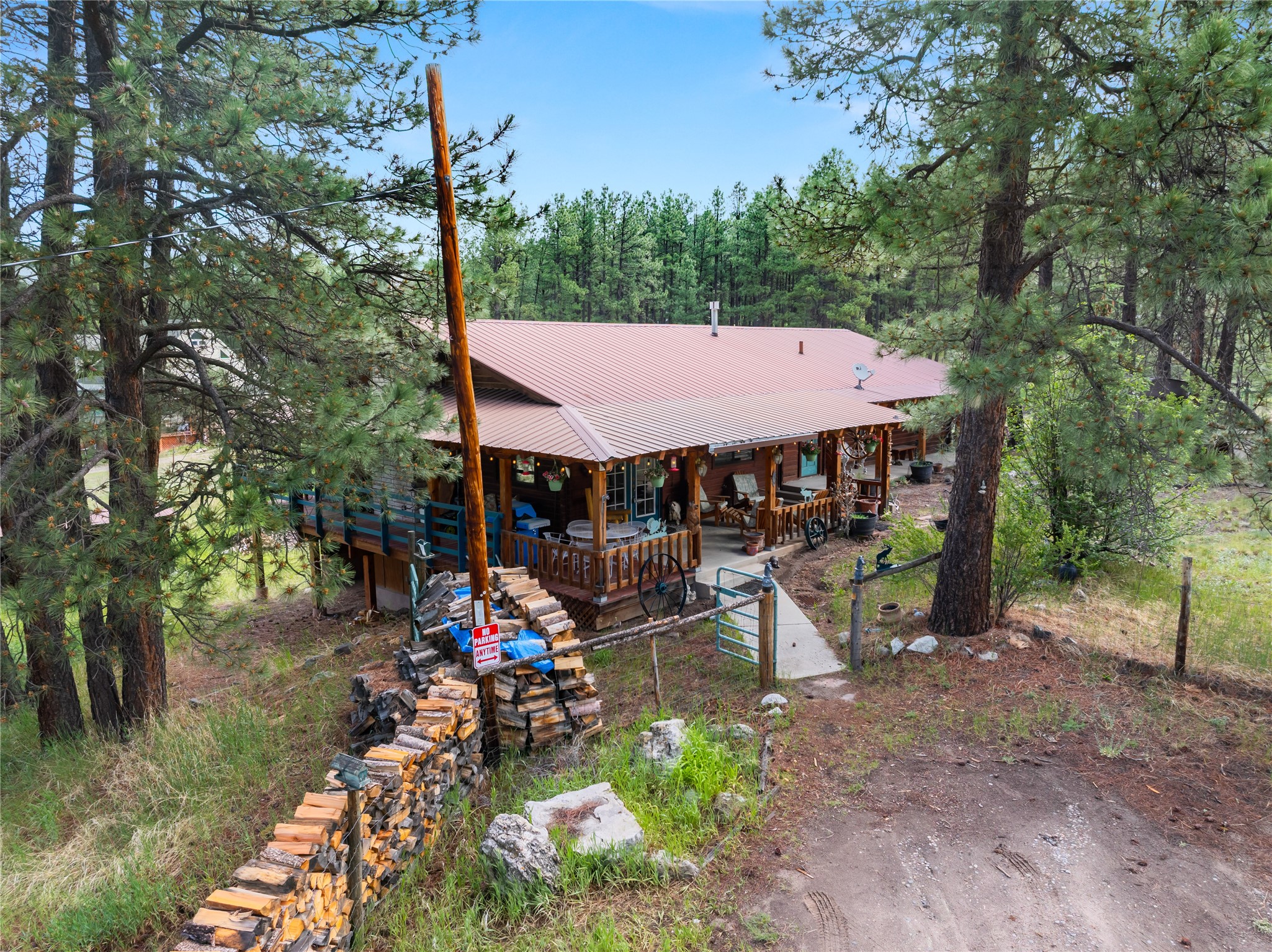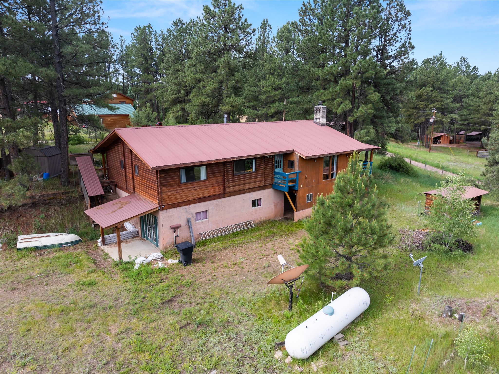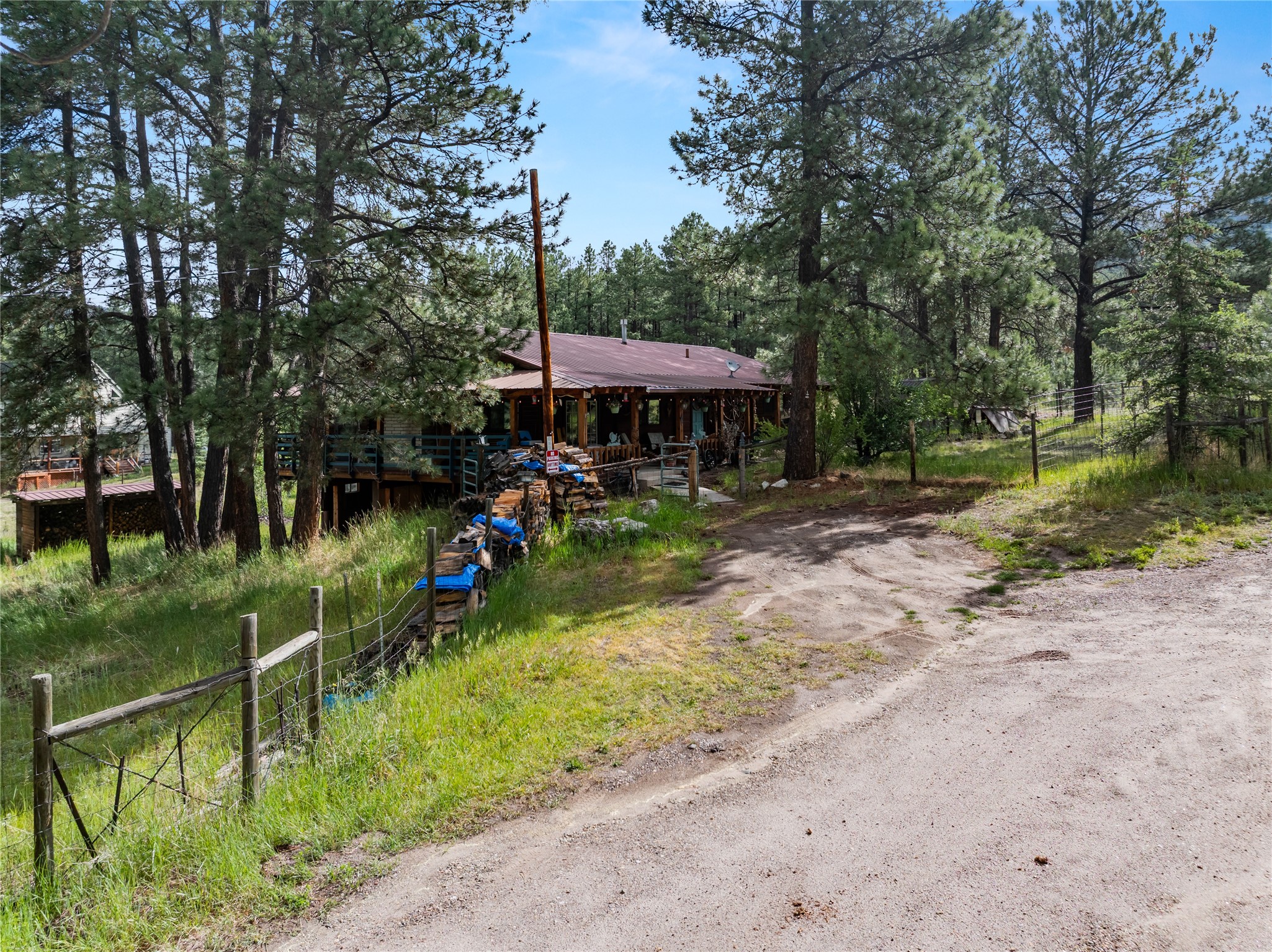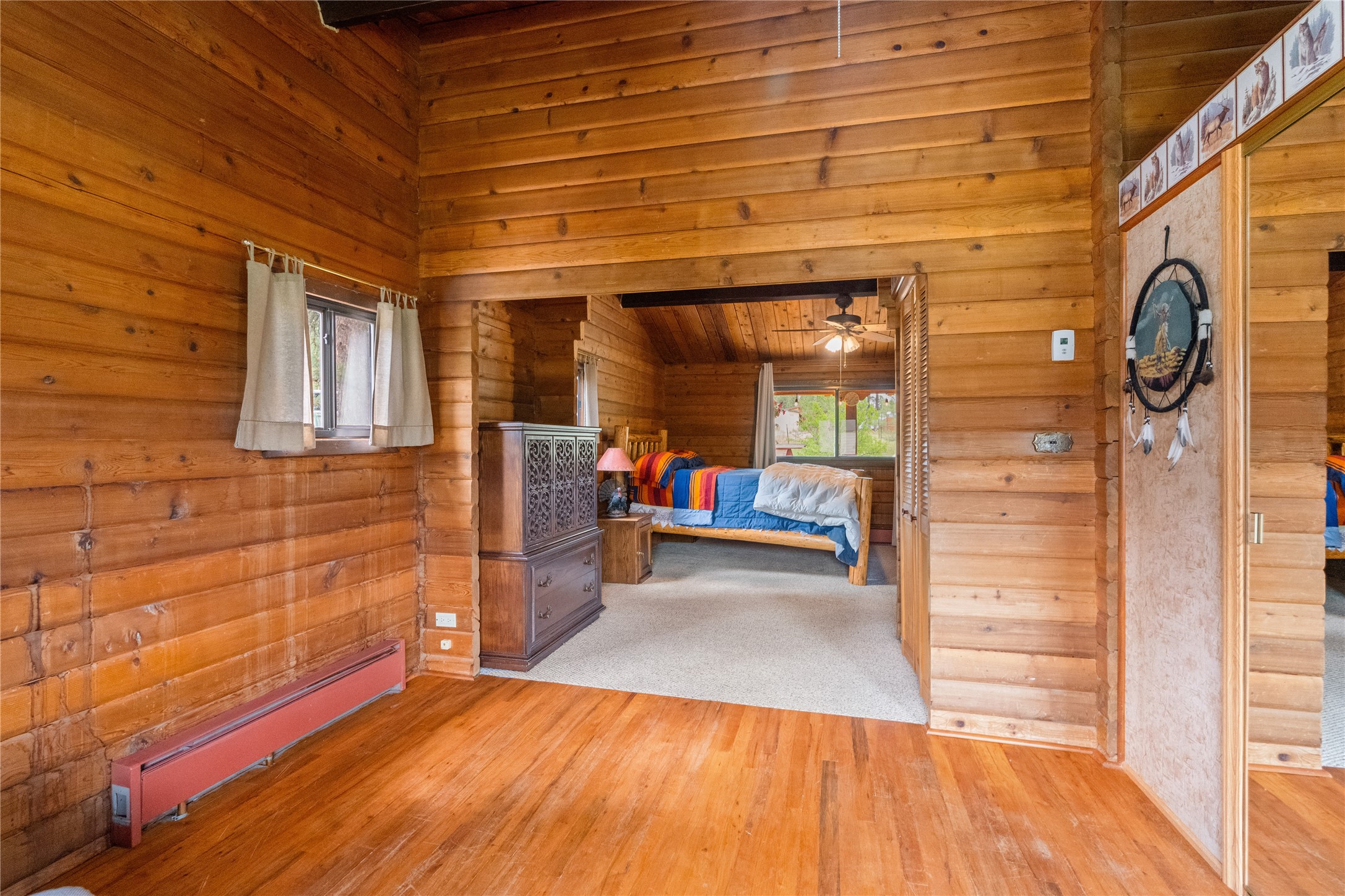 Lucky enough to live in the mountains...then you're lucky enough! This 2-bedroom, 1-bath 2,219 sq ft log cabin on 1.2 acres in La Cueva is the perfect spot! Originally a 3-bedroom, one room was opened up to expand the primary suite--but it could easily be converted back. The fabulous Panabode cabin with its interlocking log design blends modern living with traditional. From the wagon wheel-antler chandelier to the arched doorways & rustic warm interiors, the cedar tongue-&-groove cathedral wood ceiling, & the inviting rocking chair wrap-around covered porch, every detail enhances the home's irresistible charm! The spacious main bedroom is perfect to add in a cozy reading nook or office. Walk-out basement offers endless possibilities--finish it for extra bedrooms or a rec room or keep it as a workshop. You won't find a better location for a sweet weekend getaway or a full-time residence!
