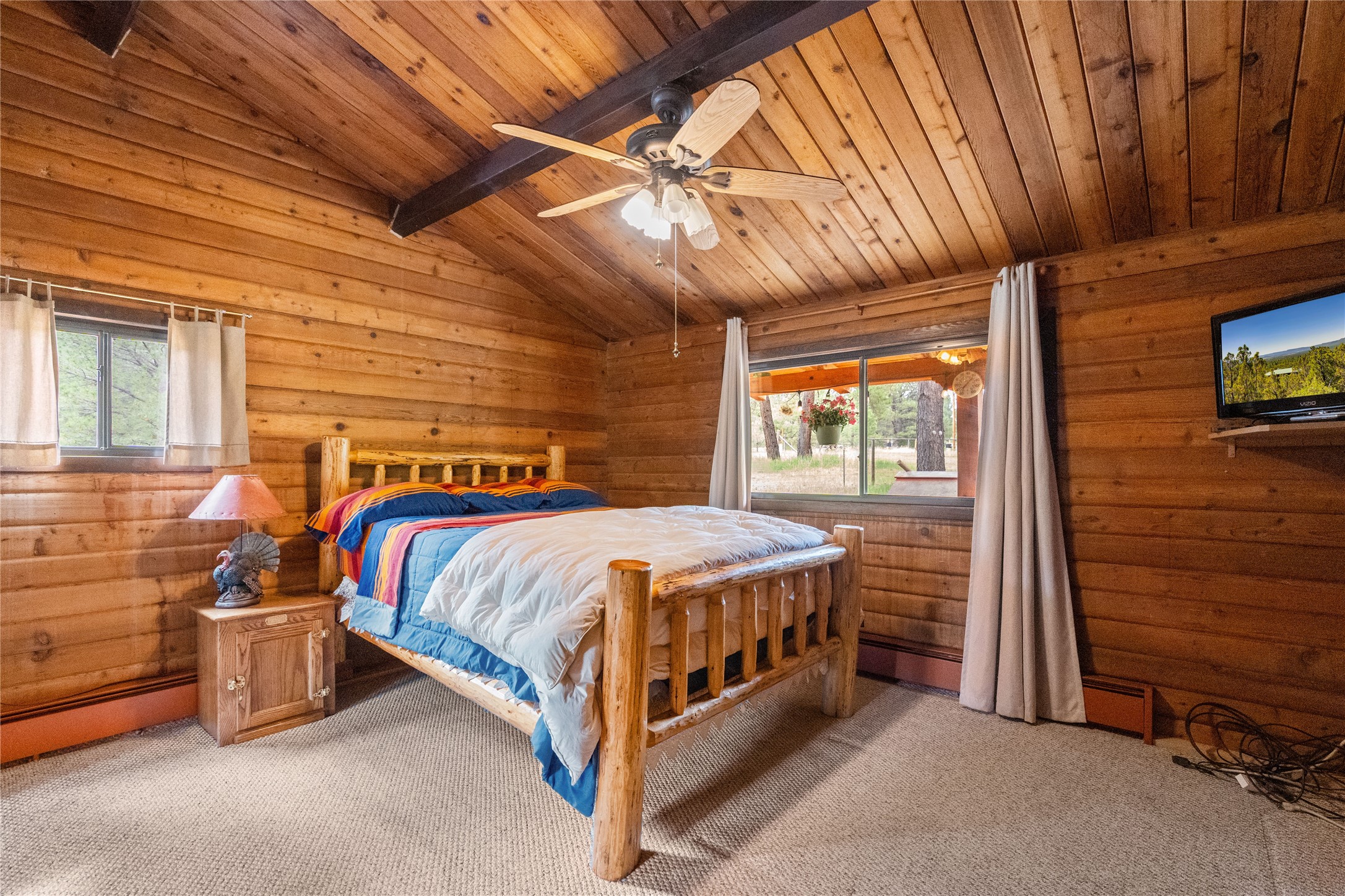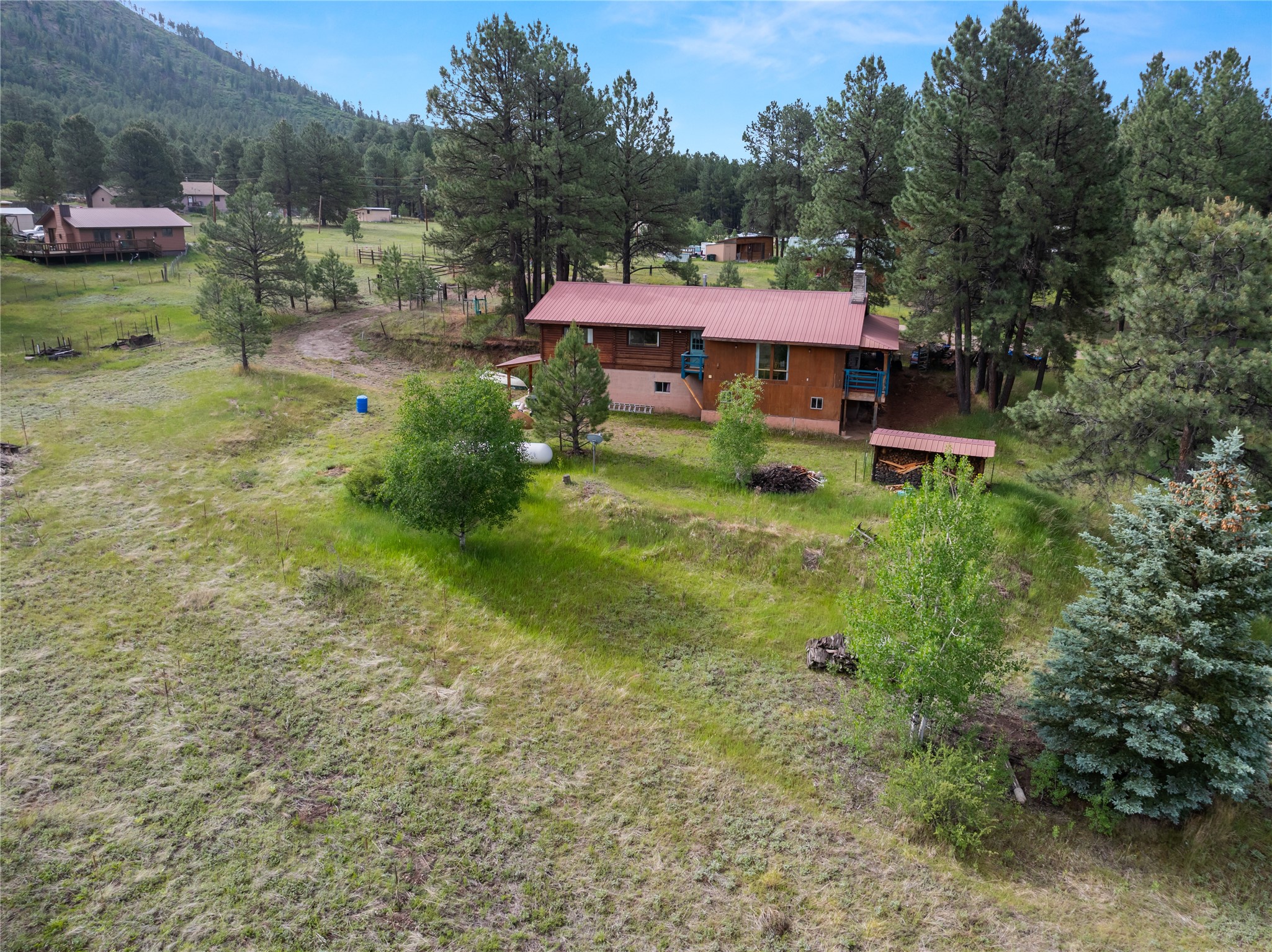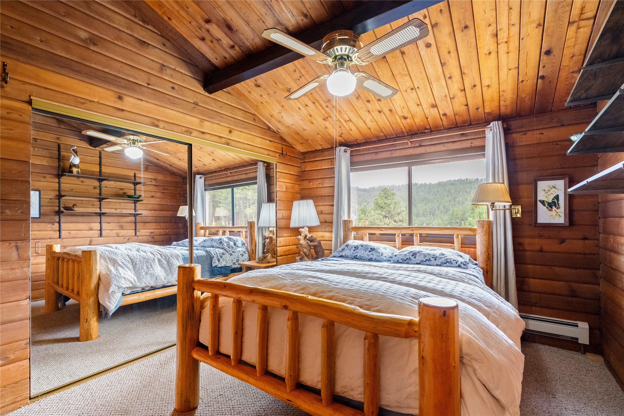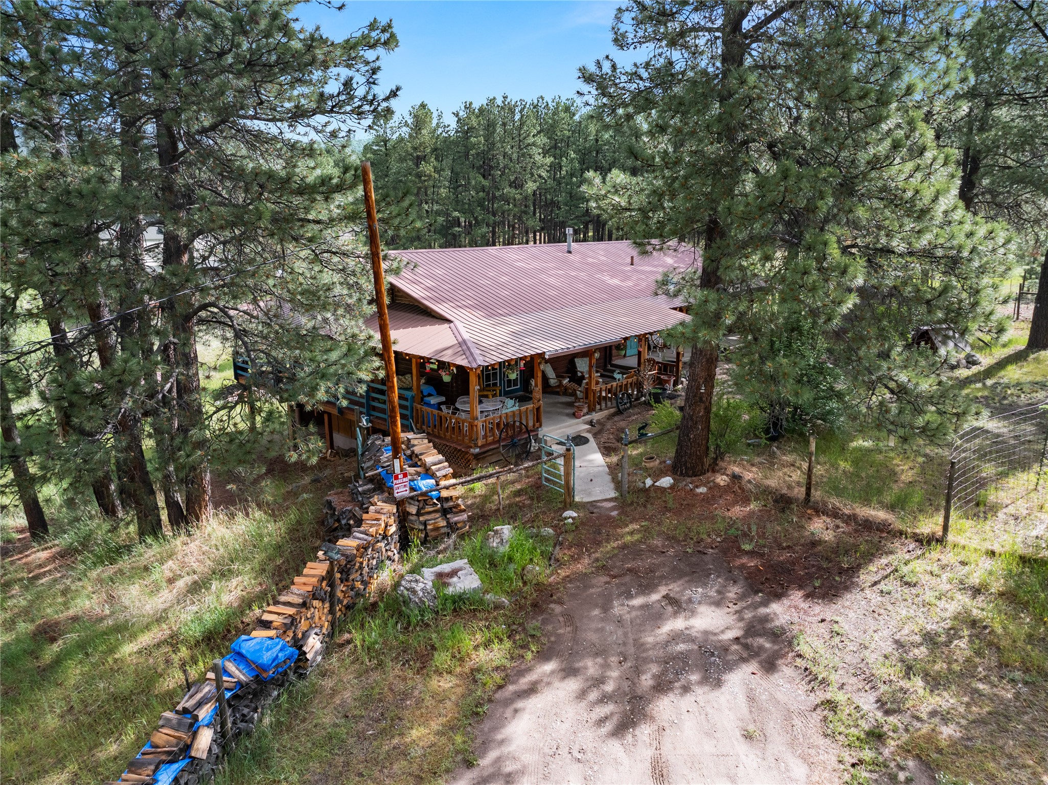 Lucky enough to live in the mountains...then you're lucky enough! This 2-bedroom, 1-bath 2,219 sq ft log cabin on 1.2 acres in La Cueva is the perfect spot! Originally a 3-bedroom, one room was opened up to expand the primary suite--but it could easily be converted back. The fabulous Panabode cabin with its interlocking log design blends modern living with traditional. From the wagon wheel-antler chandelier to the arched doorways & rustic warm interiors, the cedar tongue-&-groove cathedral wood ceiling, & the inviting rocking chair wrap-around covered porch, every detail enhances the home's irresistible charm! The spacious main bedroom is perfect to add in a cozy reading nook or office. Walk-out basement offers endless possibilities--finish it for extra bedrooms or a rec room or keep it as a workshop. You won't find a better location for a sweet weekend getaway or a full-time residence!