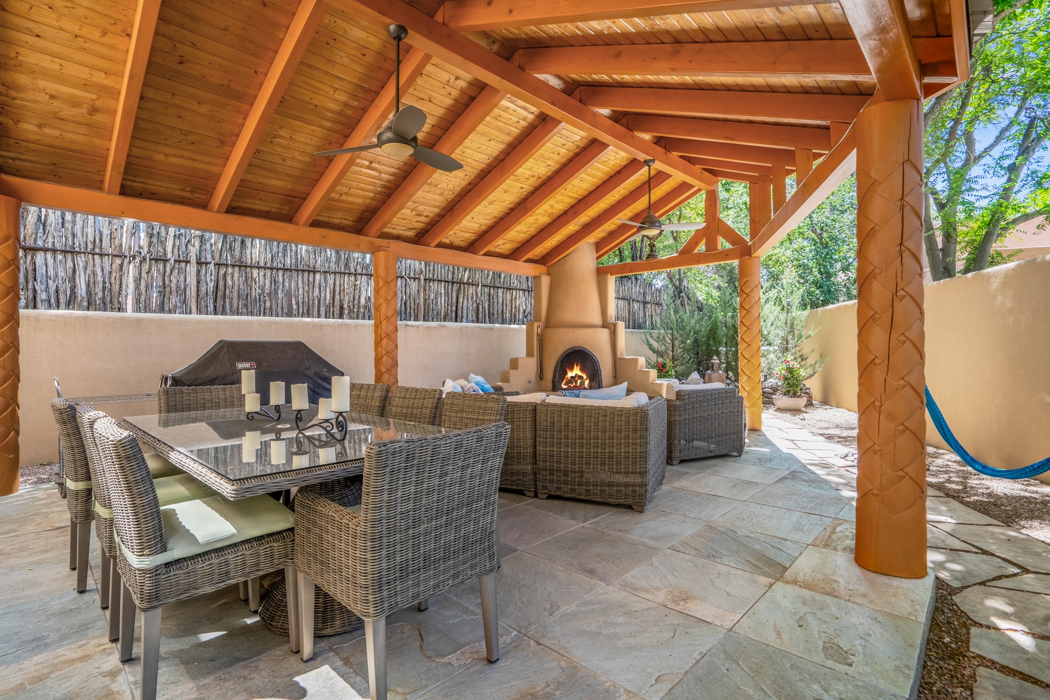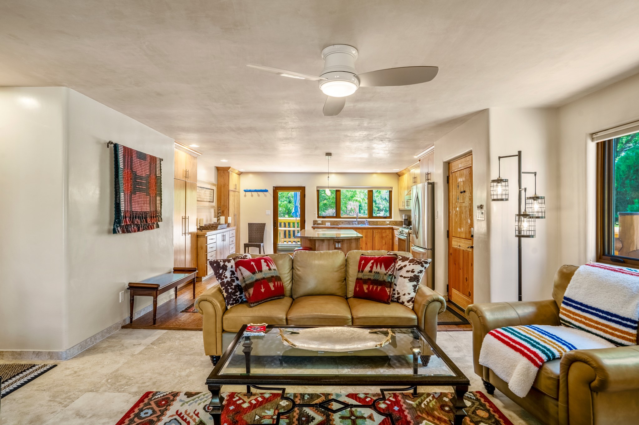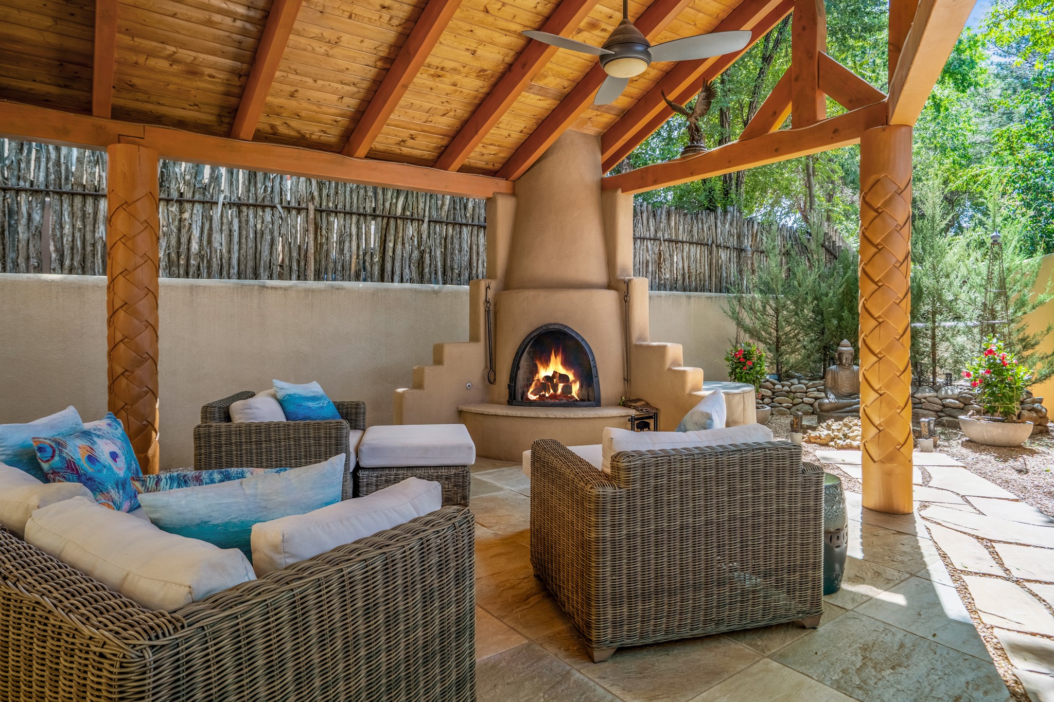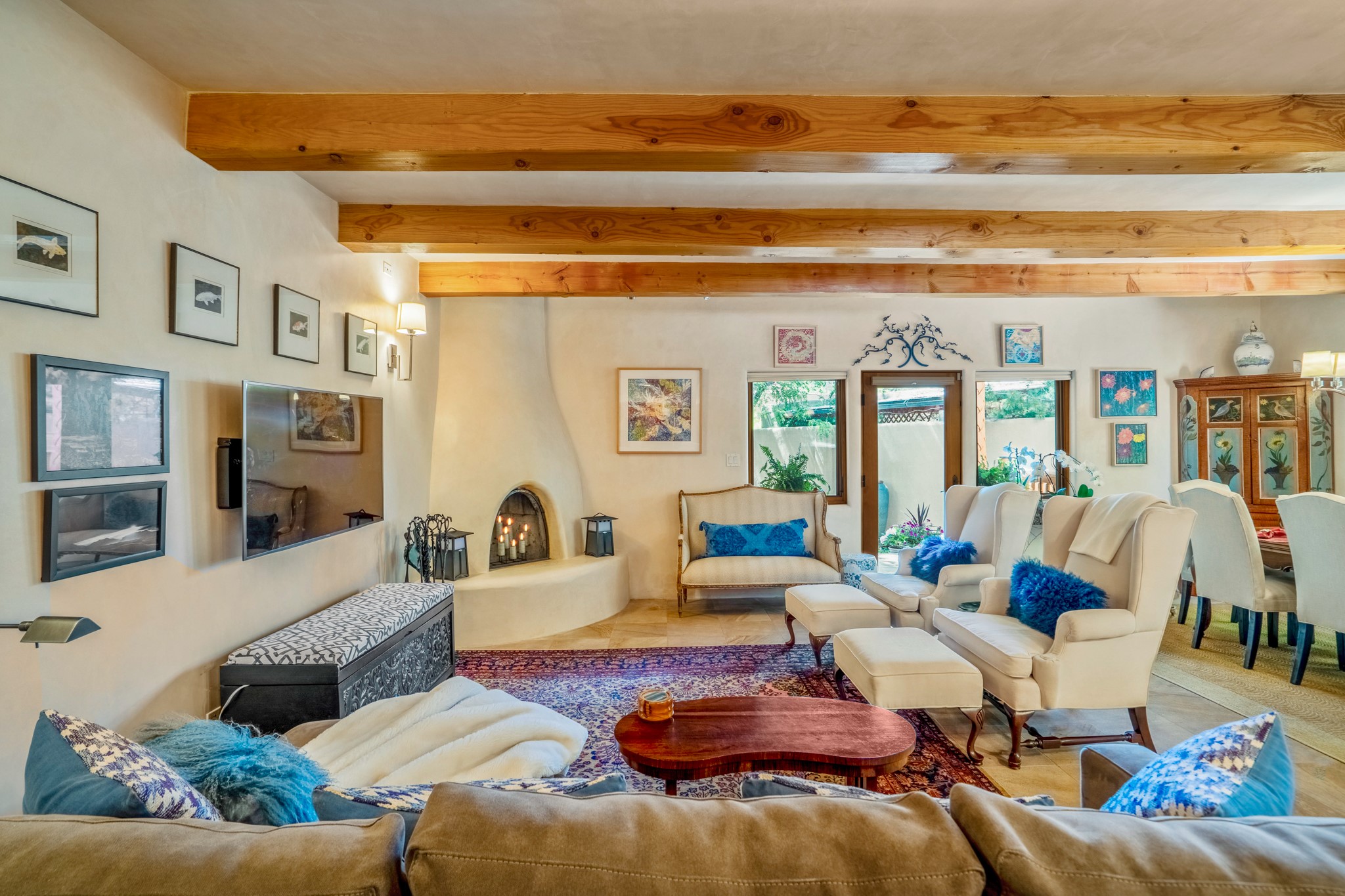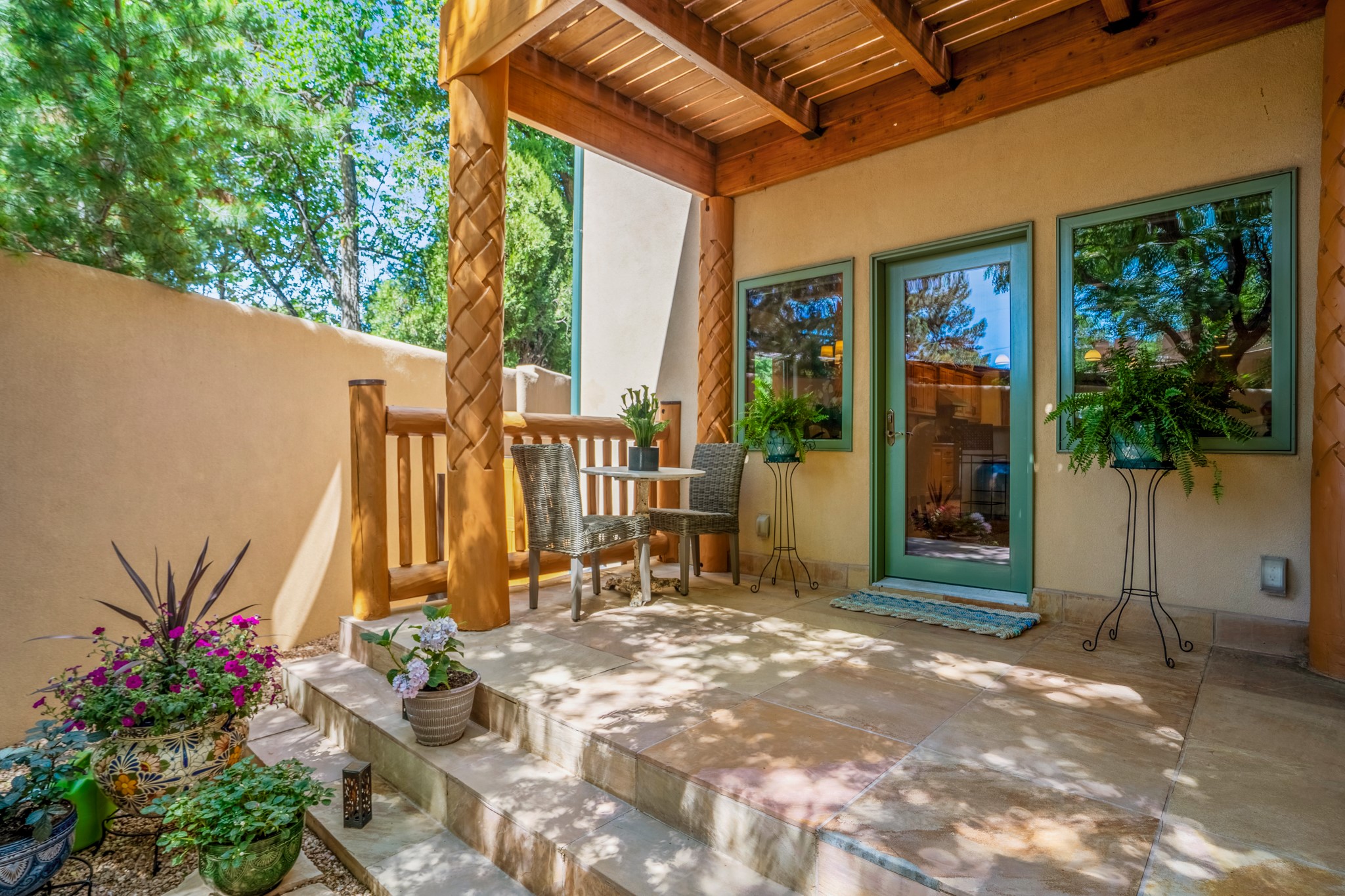 Beautifully maintained and updated, these 2 separate condominium units being sold together comprise the full Homeowners Association. Each unit features two bedrooms and two bathrooms (one full and one three-quarter bathroom), separate on-demand water heaters, and mini-splits. Plaster walls, upscale countertops, sandstone, and upscale flooring complement each unit. En-suite bathrooms are in the primary bedrooms, along with ample closet space. The backyard has a fabulous covered patio with a kiva fireplace. Fully landscaped and gated, the property has been impeccably maintained by its current owner. Walk to the Plaza, countless retail stores and restaurants, and to Ft Marcy complex.