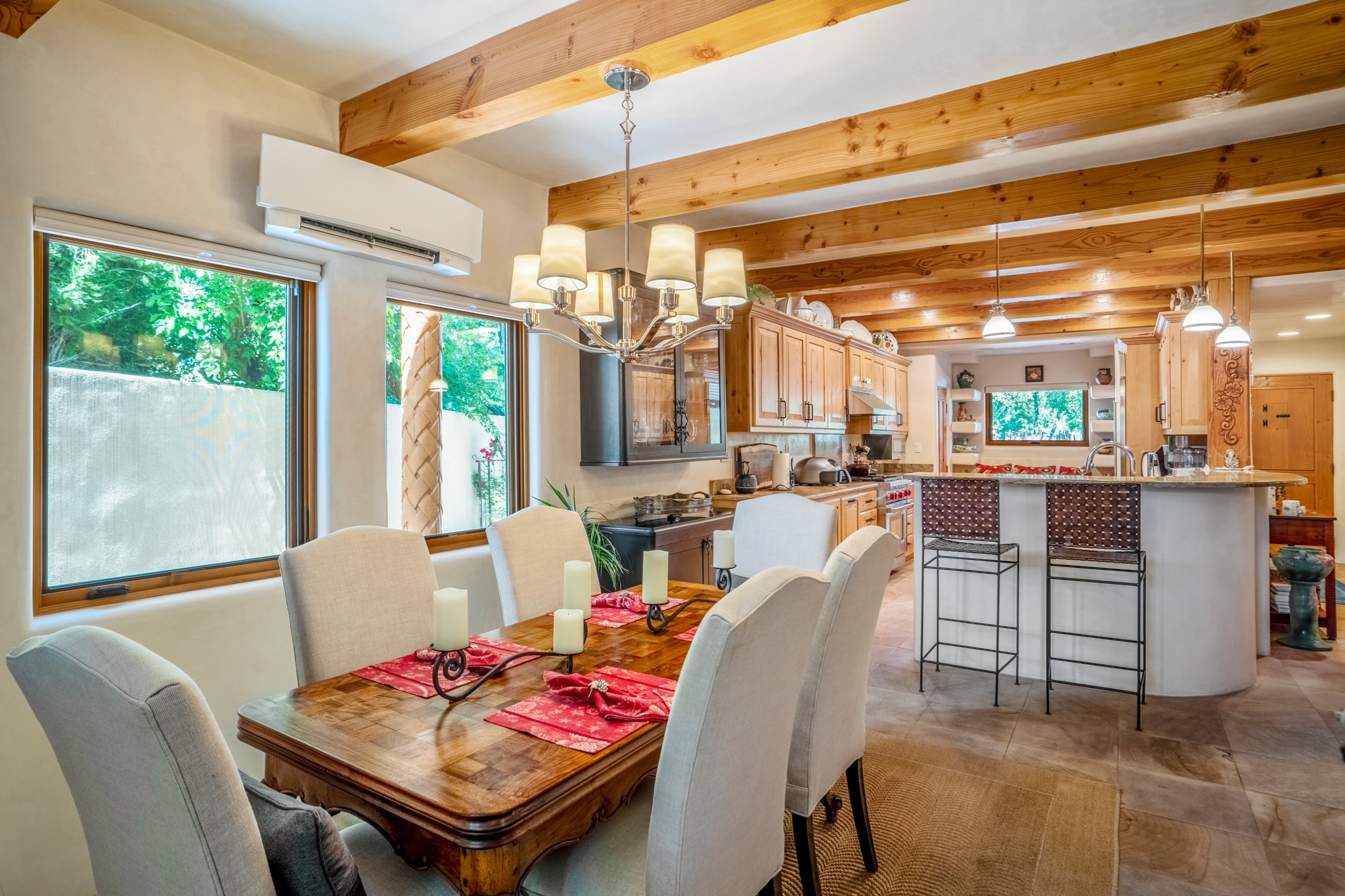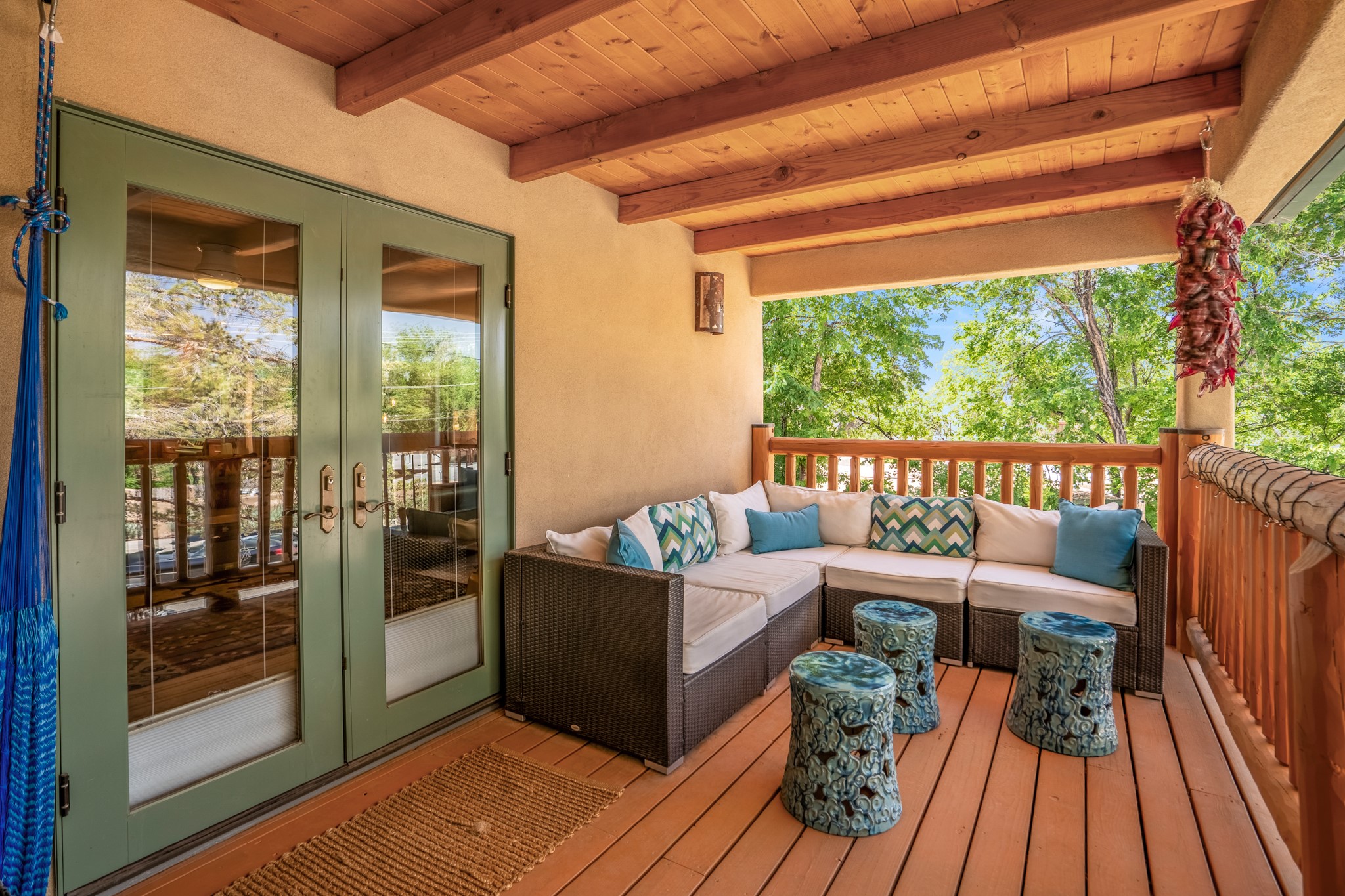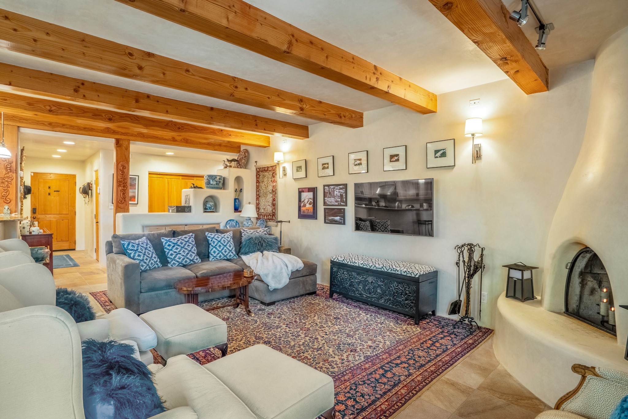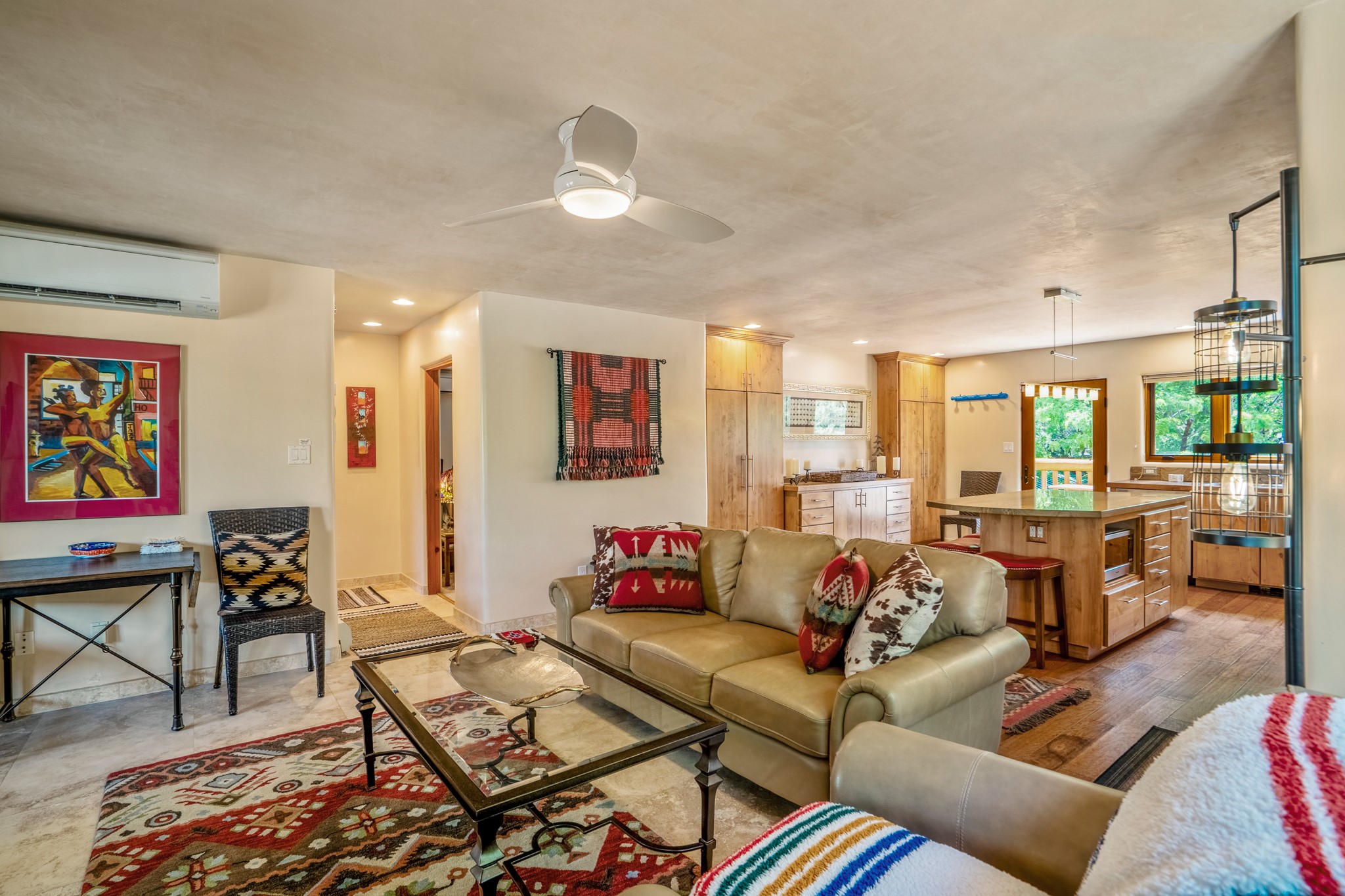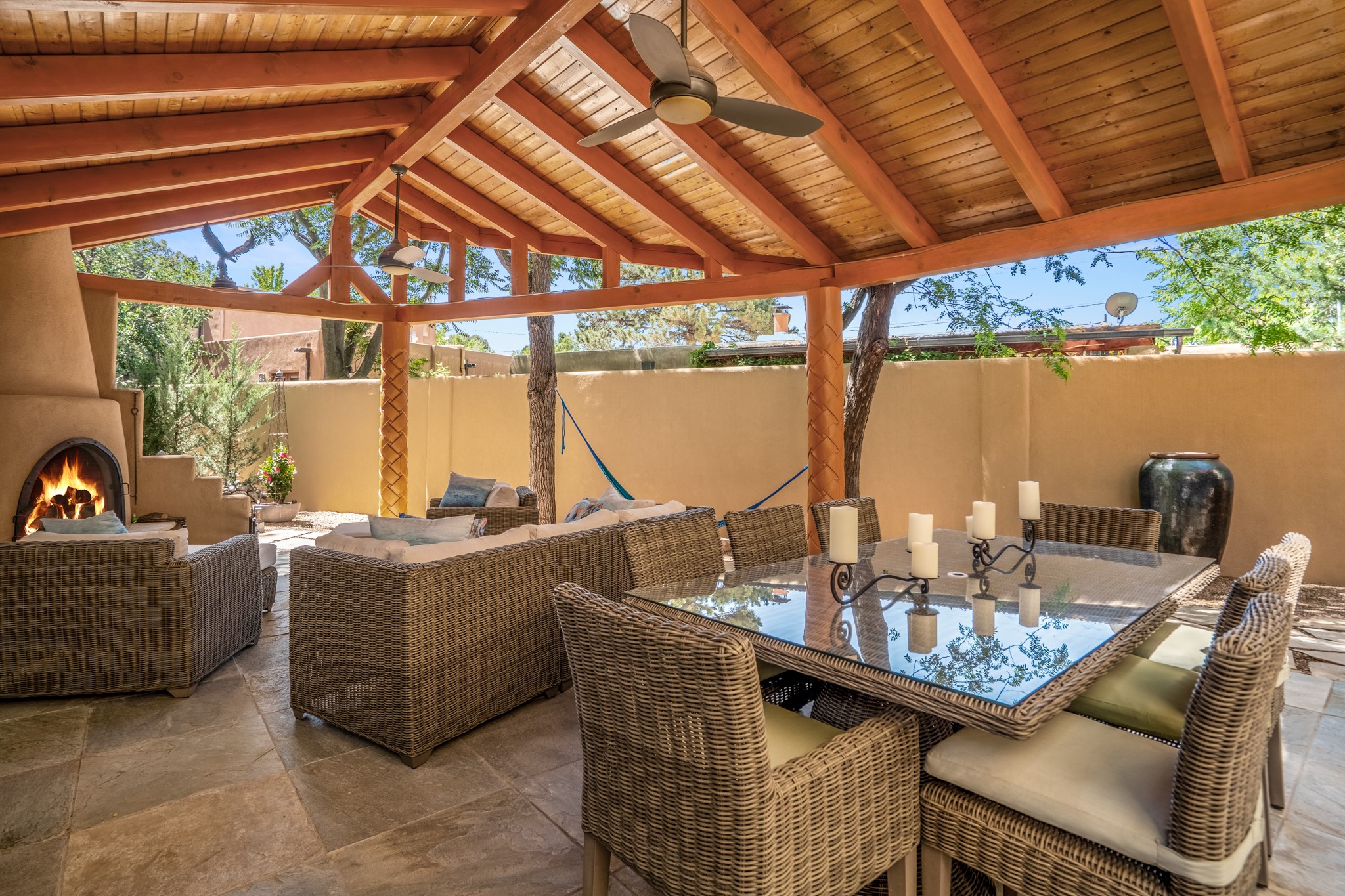 Beautifully maintained and updated, these 2 separate condominium units being sold together comprise the full Homeowners Association. Each unit features two bedrooms and two bathrooms (one full and one three-quarter bathroom), separate on-demand water heaters, and mini-splits. Plaster walls, upscale countertops, sandstone, and upscale flooring complement each unit. En-suite bathrooms are in the primary bedrooms, along with ample closet space. The backyard has a fabulous covered patio with a kiva fireplace. Fully landscaped and gated, the property has been impeccably maintained by its current owner. Walk to the Plaza, countless retail stores and restaurants, and to Ft Marcy complex.