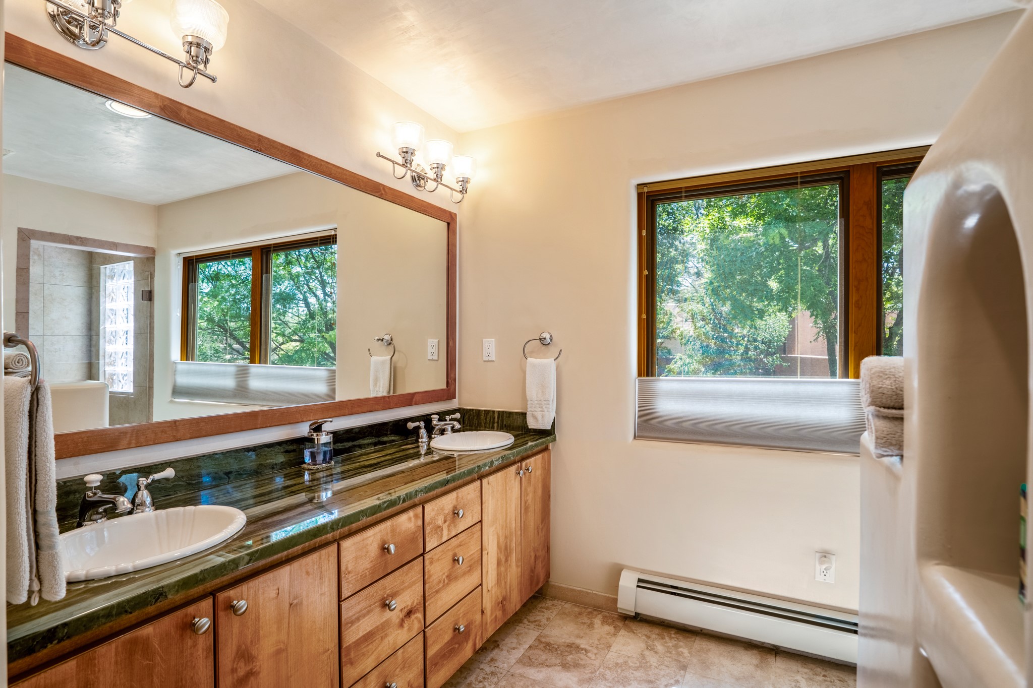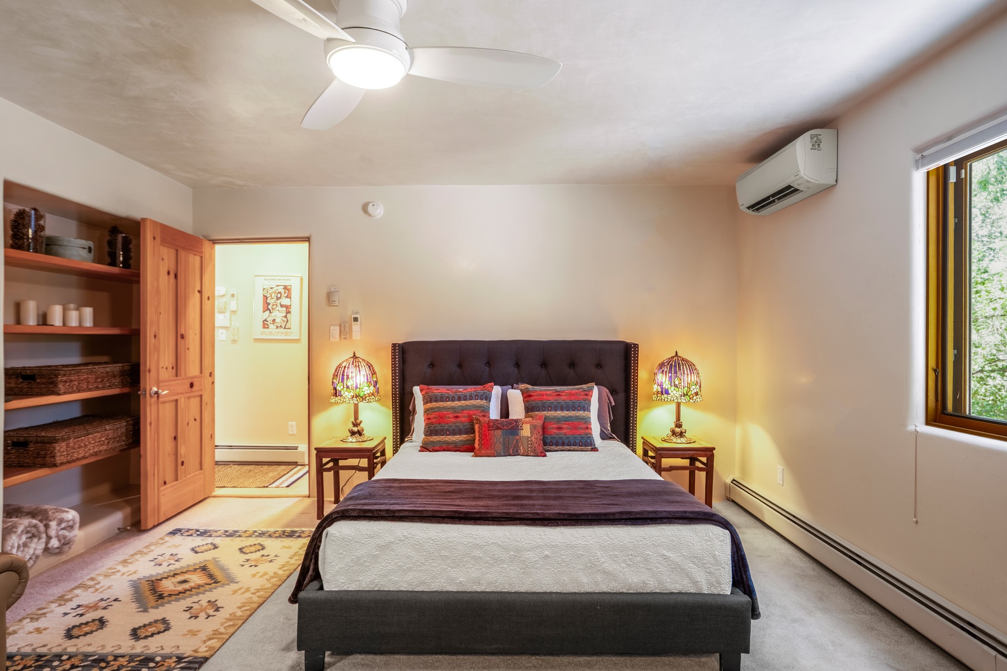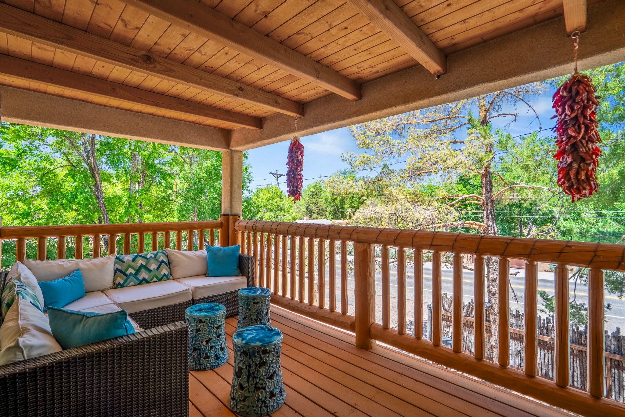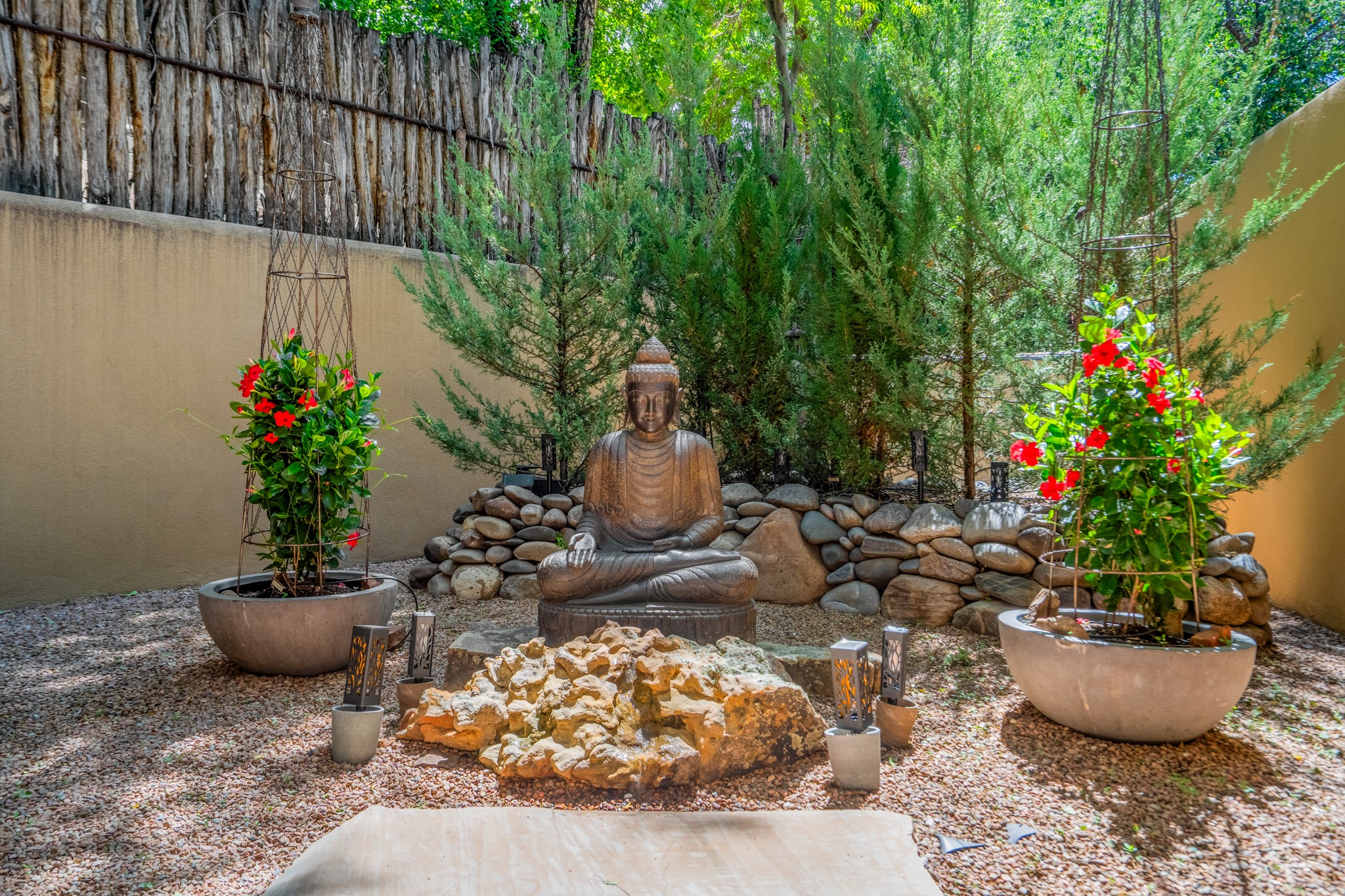 Beautifully maintained and updated, these 2 separate condominium units being sold together comprise the full Homeowners Association. Each unit features two bedrooms and two bathrooms (one full and one three-quarter bathroom), separate on-demand water heaters, and mini-splits. Plaster walls, upscale countertops, sandstone, and upscale flooring complement each unit. En-suite bathrooms are in the primary bedrooms, along with ample closet space. The backyard has a fabulous covered patio with a kiva fireplace. Fully landscaped and gated, the property has been impeccably maintained by its current owner. Walk to the Plaza, countless retail stores and restaurants, and to Ft Marcy complex.