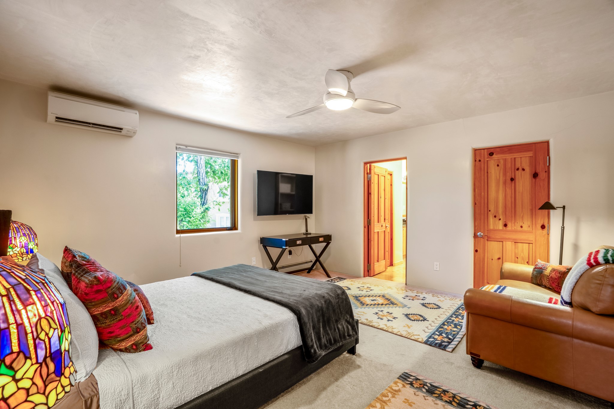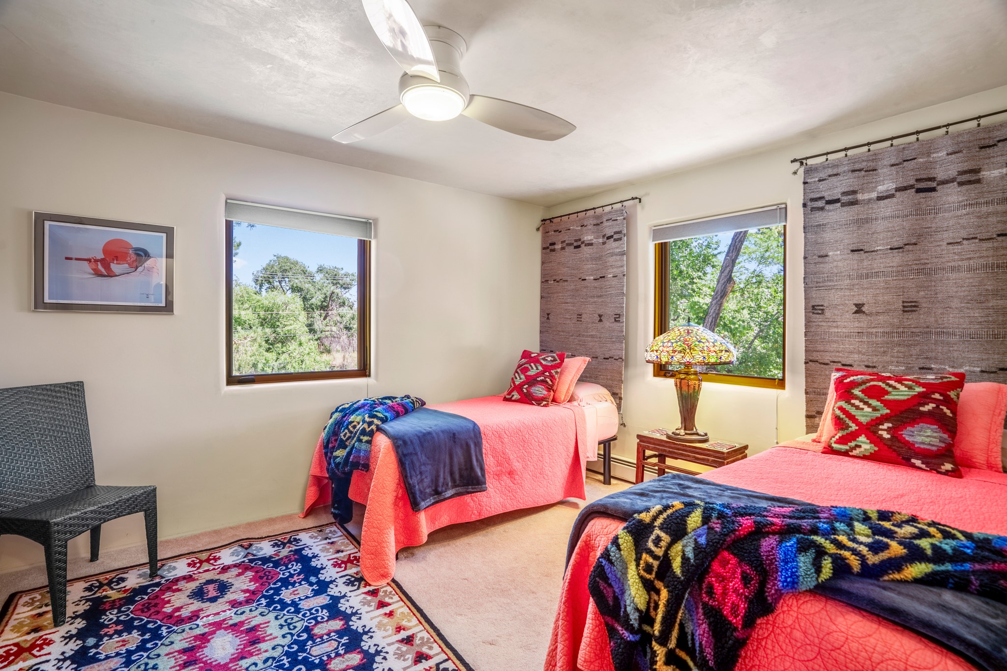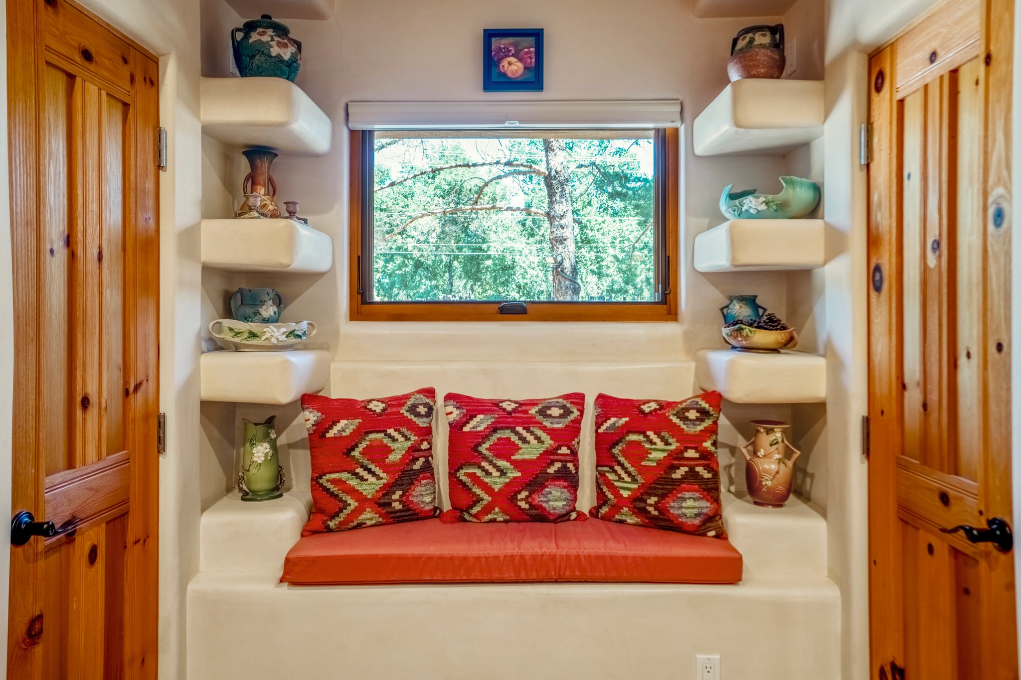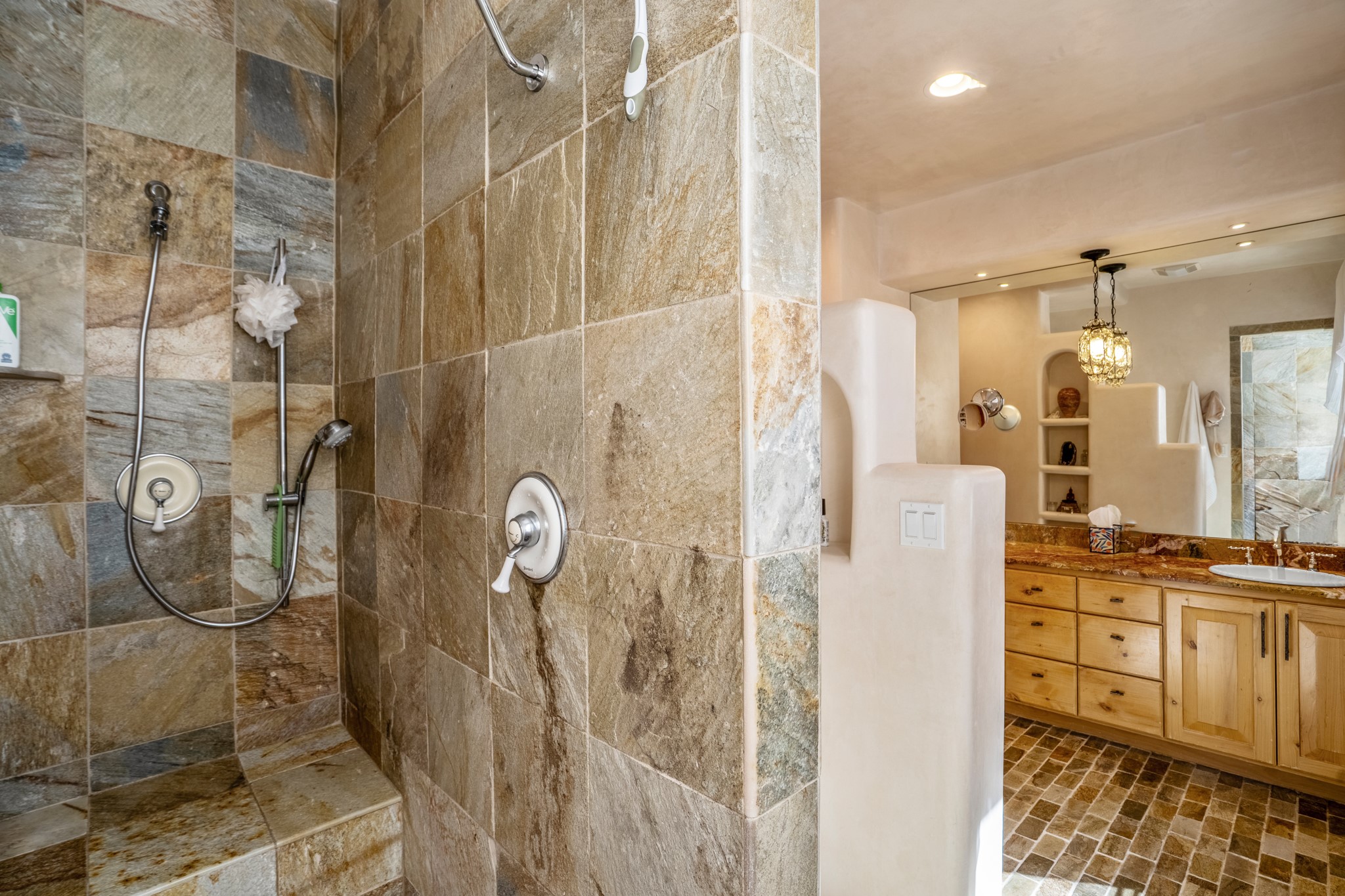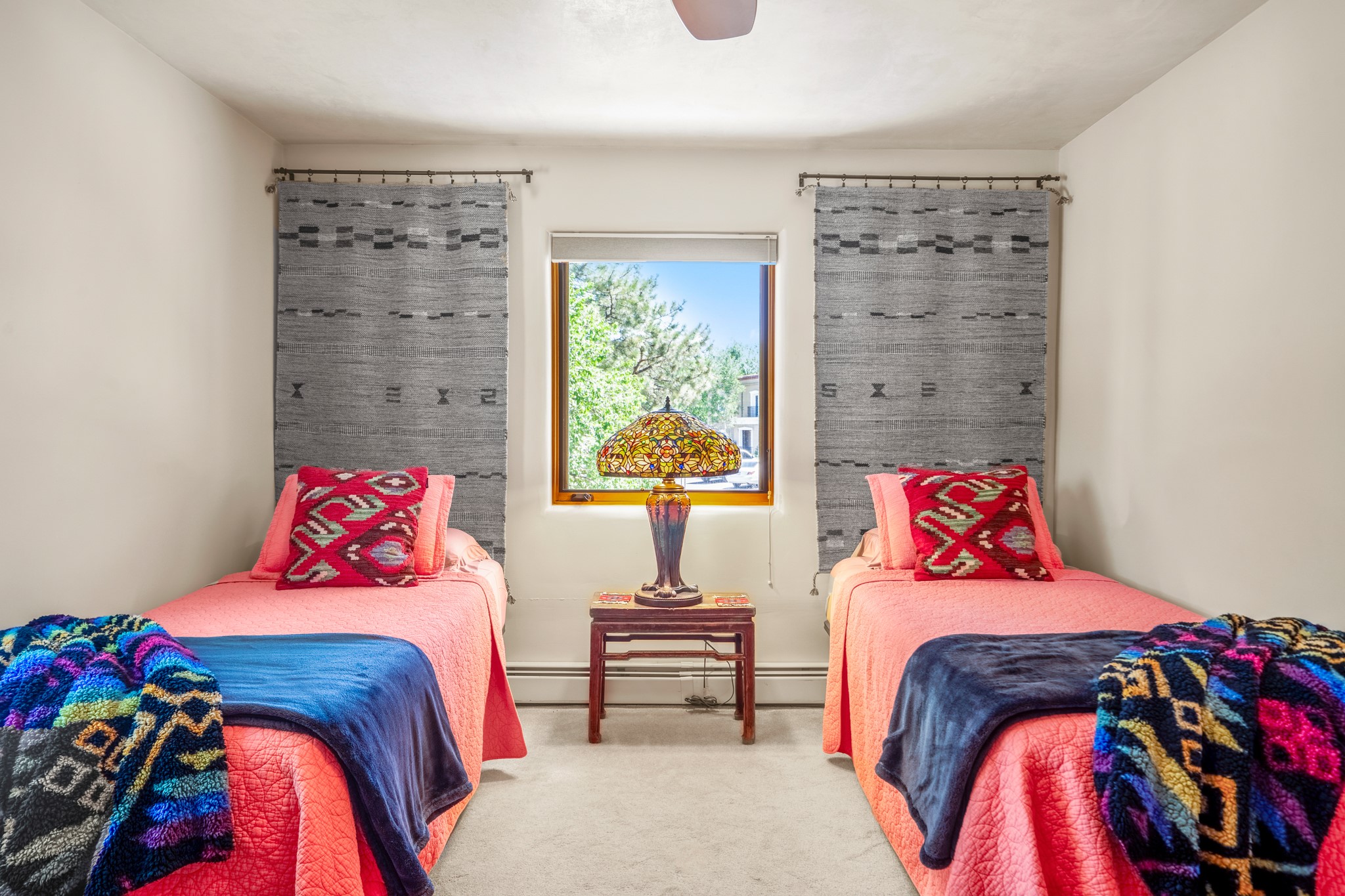 Beautifully maintained and updated, these 2 separate condominium units being sold together comprise the full Homeowners Association. Each unit features two bedrooms and two bathrooms (one full and one three-quarter bathroom), separate on-demand water heaters, and mini-splits. Plaster walls, upscale countertops, sandstone, and upscale flooring complement each unit. En-suite bathrooms are in the primary bedrooms, along with ample closet space. The backyard has a fabulous covered patio with a kiva fireplace. Fully landscaped and gated, the property has been impeccably maintained by its current owner. Walk to the Plaza, countless retail stores and restaurants, and to Ft Marcy complex.