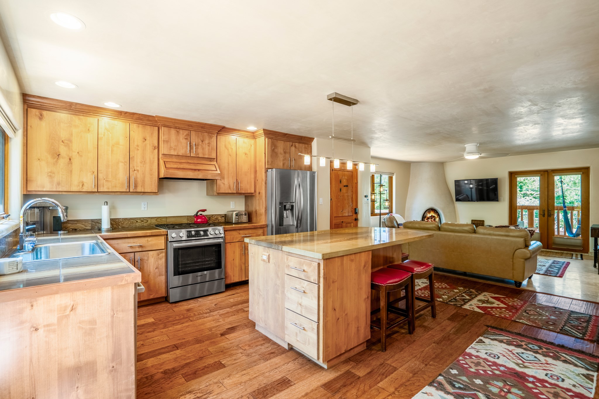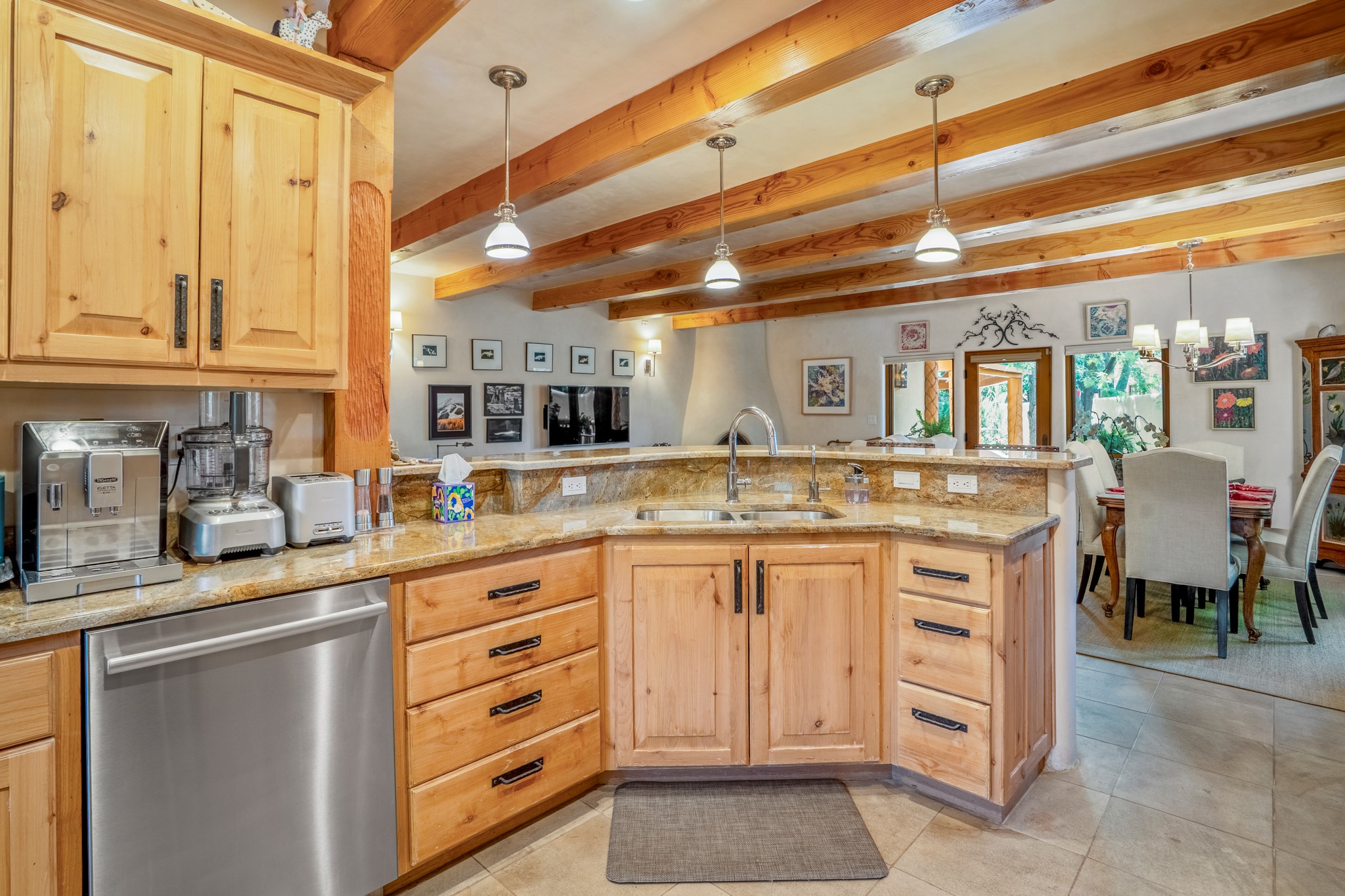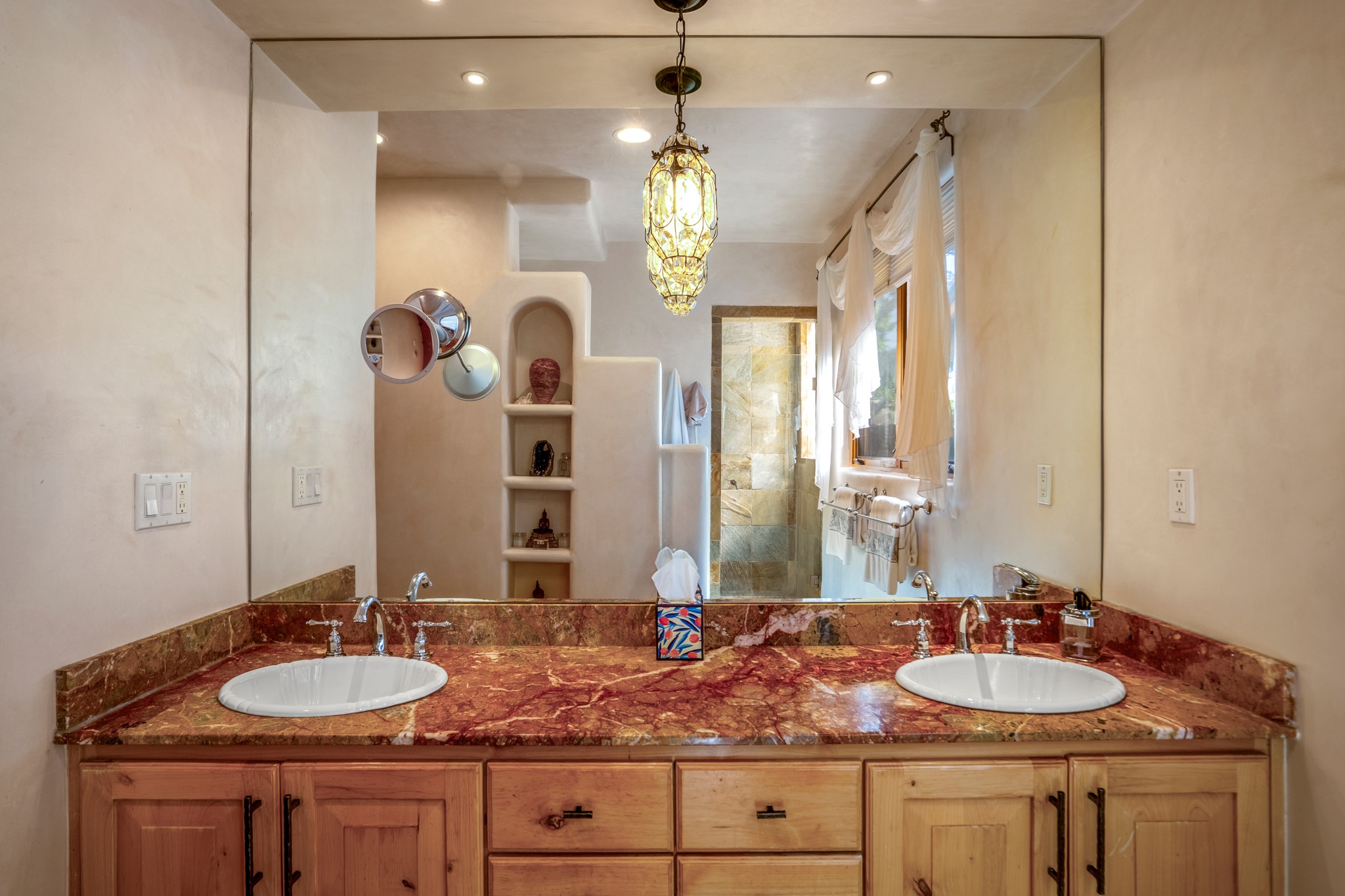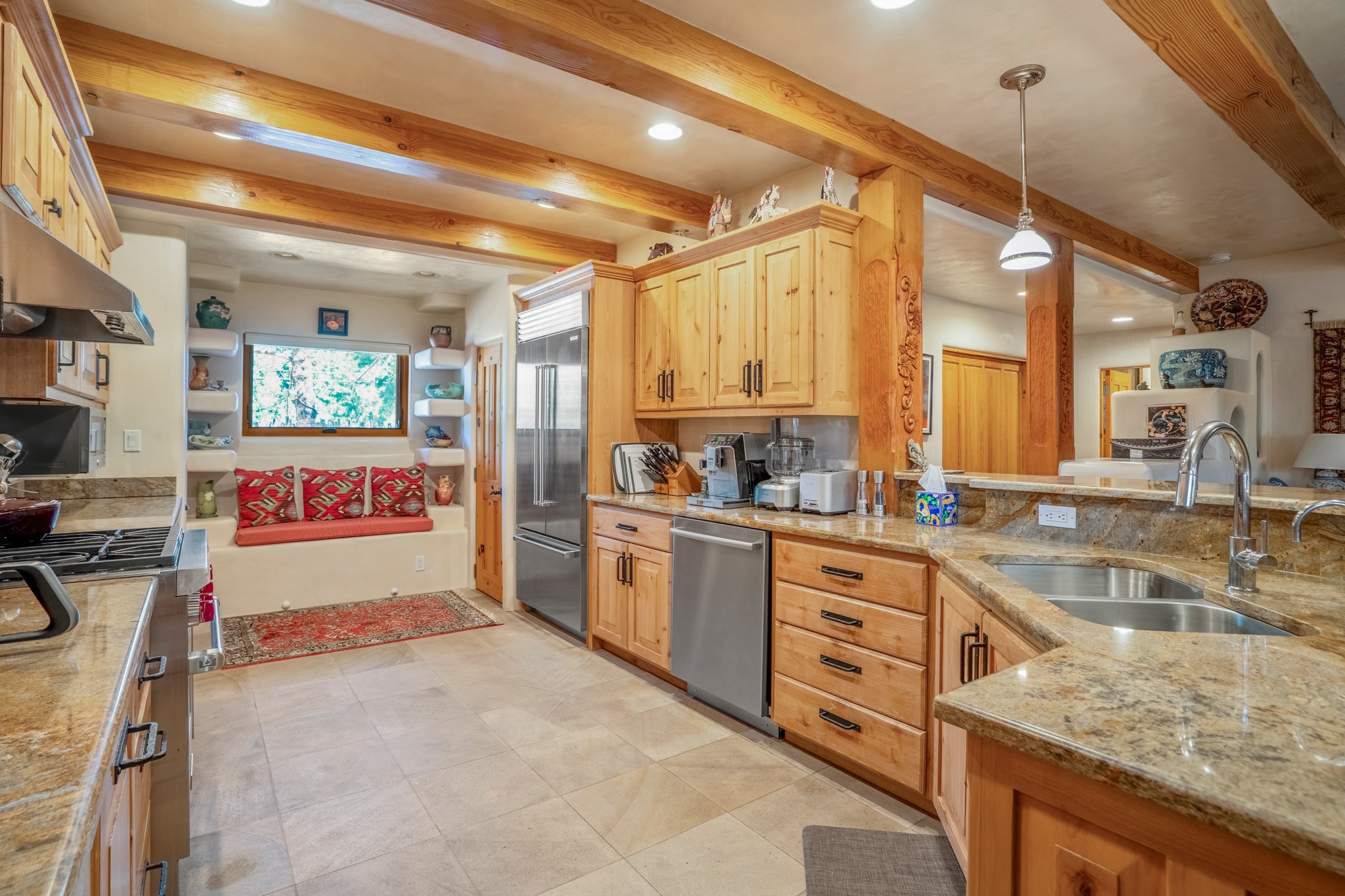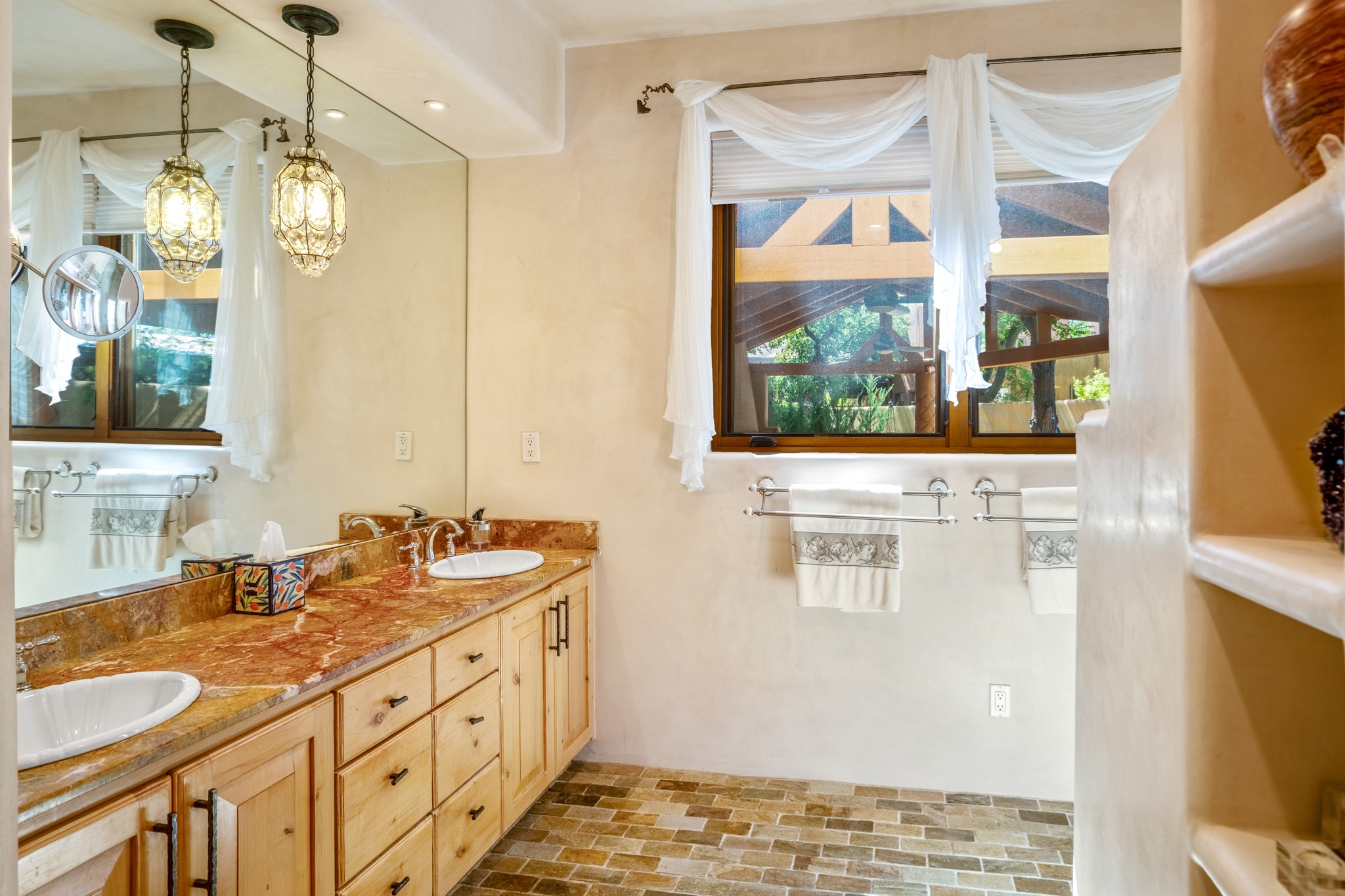 Beautifully maintained and updated, these 2 separate condominium units being sold together comprise the full Homeowners Association. Each unit features two bedrooms and two bathrooms (one full and one three-quarter bathroom), separate on-demand water heaters, and mini-splits. Plaster walls, upscale countertops, sandstone, and upscale flooring complement each unit. En-suite bathrooms are in the primary bedrooms, along with ample closet space. The backyard has a fabulous covered patio with a kiva fireplace. Fully landscaped and gated, the property has been impeccably maintained by its current owner. Walk to the Plaza, countless retail stores and restaurants, and to Ft Marcy complex.