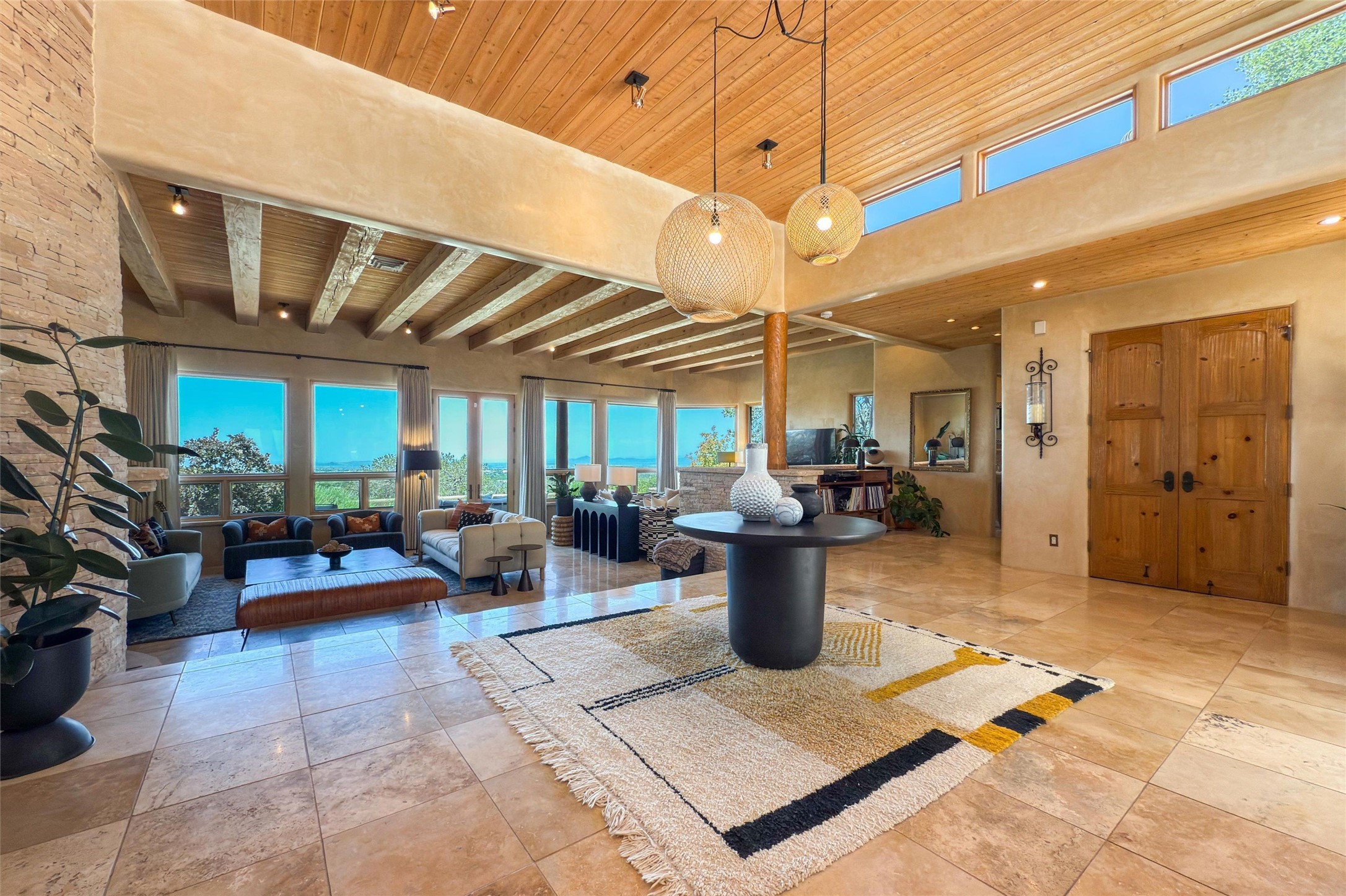 Embrace a lifestyle of sophistication and creativity in this stunning Northern New Mexico Compound that offers dramatic views of Sun and Moon Mountain. Situated on 2.5 acres, this special residence invites you to revel in the beauty of the surrounding landscape, with mountain vistas and city lights visible from indoor windows and the expansive 2,500 sq. ft. covered portal. A private quarter-mile walking path winds through the property, offering a tranquil way to connect with the land and enjoy the scenery. Gather around the outdoor kiva fireplace to enjoy views of the enchanting New Mexican nights. The property includes a main residence with two spacious bedrooms, a detached bedroom with a full bath, and a one-bedroom casita with a living area, kitchen, and full bath. In addition, there is a 100-year-old adobe studio. Inside the main house, the large great room is highlighted by soaring vigas and a striking, stacked stone fireplace that serves as the focal point. Culinary enthusiasts will delight in the generous gourmet kitchen, equipped with a central island and top-tier appliances. Retreat to the owner's suite, featuring another stacked stone fireplace, a jacuzzi tub, and an infrared sauna with an open-air cold plunge pool. The outside space is complete with a cedar tub, outdoor shower, and fire pit. Convenience and comfort are enhanced with a whole house generator. Recent upgrades include a new boiler system, water softener, modernized electrical, a new pantry system, custom California Closets and more. Fully fenced yard with drip irrigation is enhanced by the recent planting of over 30 trees. Located minutes from the Historic Santa Fe Plaza.
