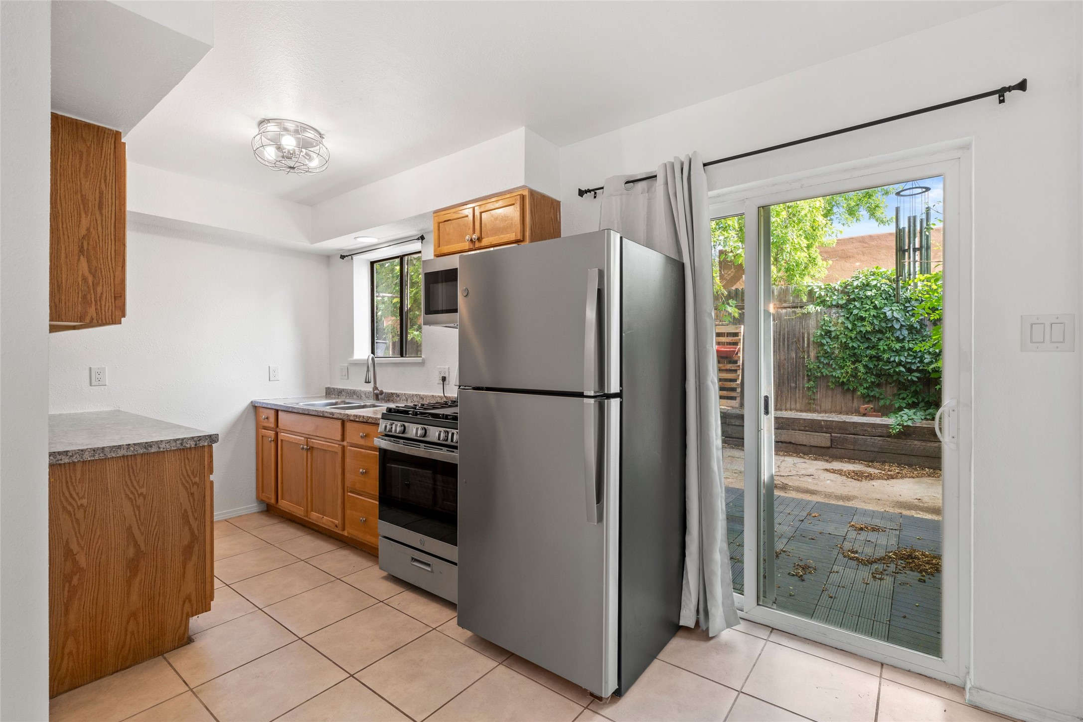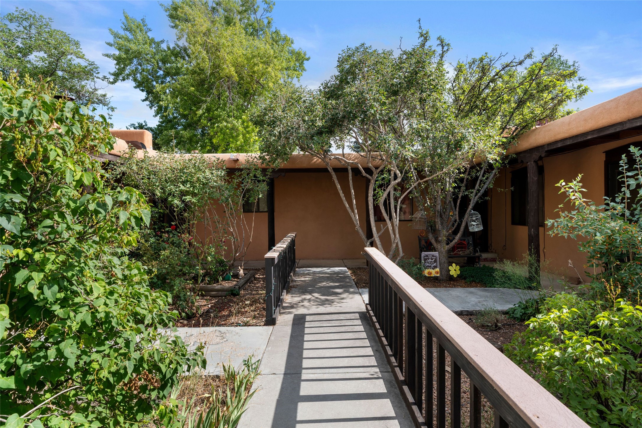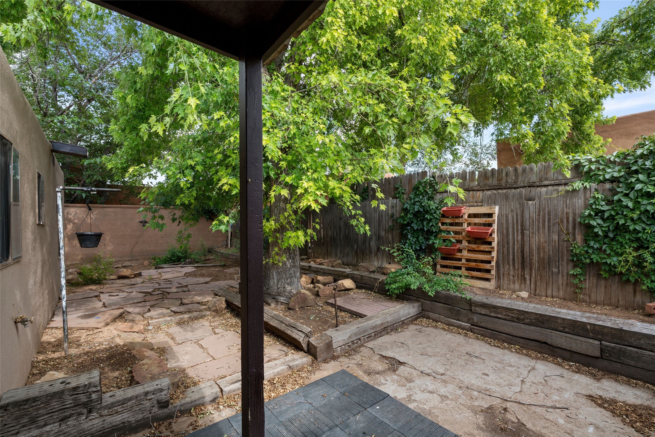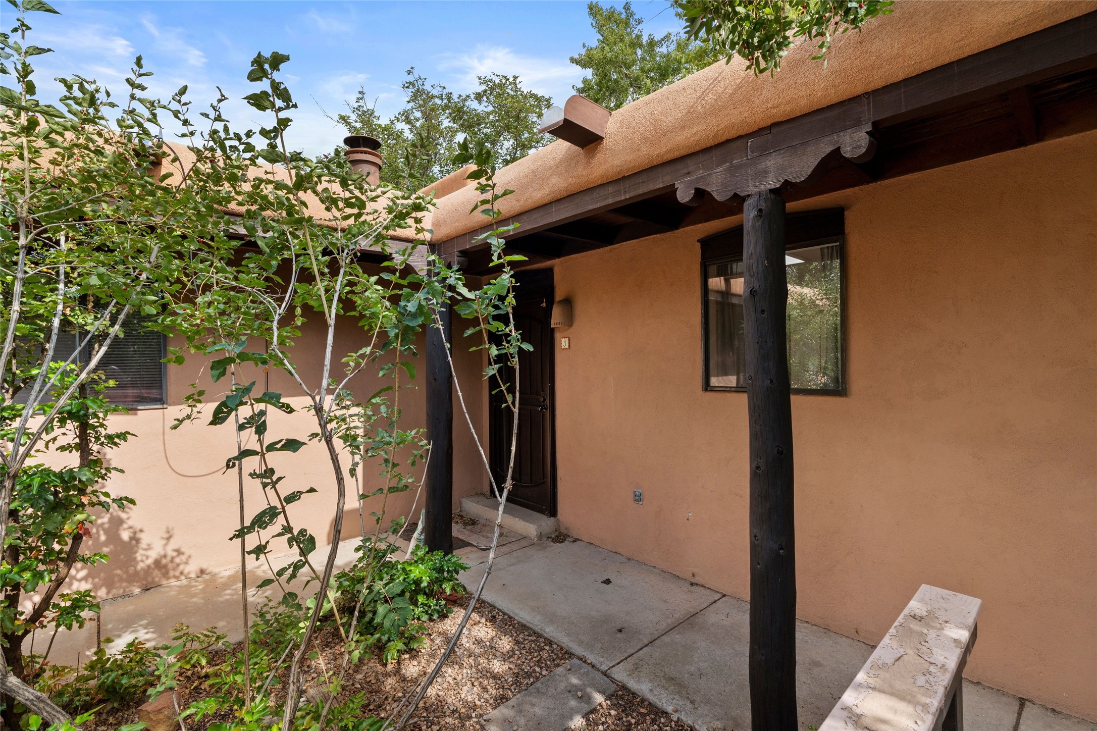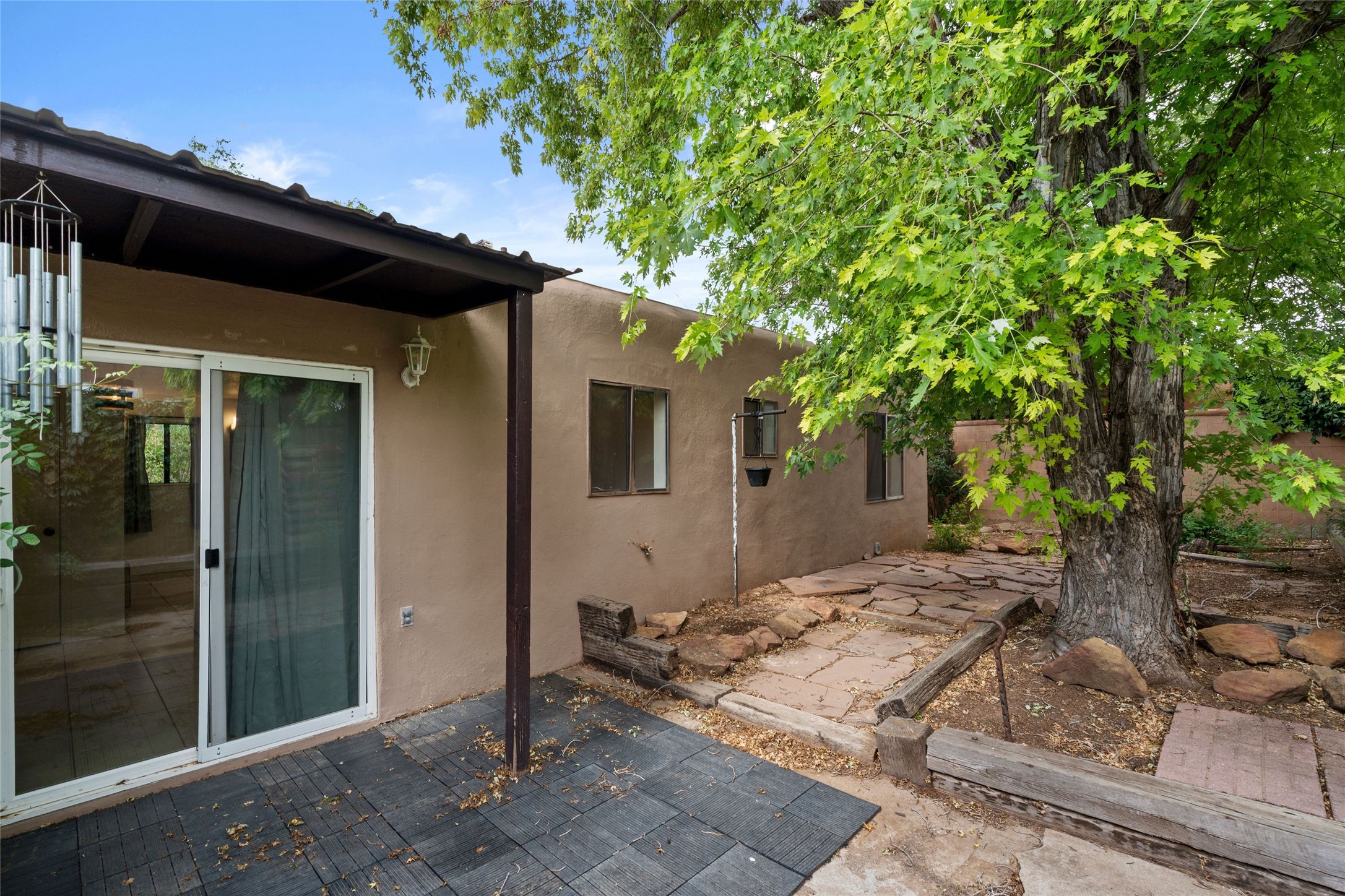 Located in a small community off Camino Capitan, this updated 2-bedroom, 1-bathroom condo with a new TPO roof in 2019 offers practical living in a convenient Santa Fe location. With 736 square feet, the home features a functional layout, tile flooring throughout, and good natural light. The living room includes a wood-burning fireplace and skylight. The kitchen has been updated with stainless steel appliances, new countertops, and added cabinetry. Just off the kitchen is a dining nook with a Pella sliding door that leads to the backyard. Outside, the private yard includes mature shade trees, flagstone paths, and a garden area. Additional features include a full bath with an updated vanity, two well-sized bedrooms, and modern light fixtures. Located near shopping, parks, schools, and the Rail Runner commuter train, this condo is a solid option for first-time buyers, investors, or anyone looking for a low-maintenance property in town.