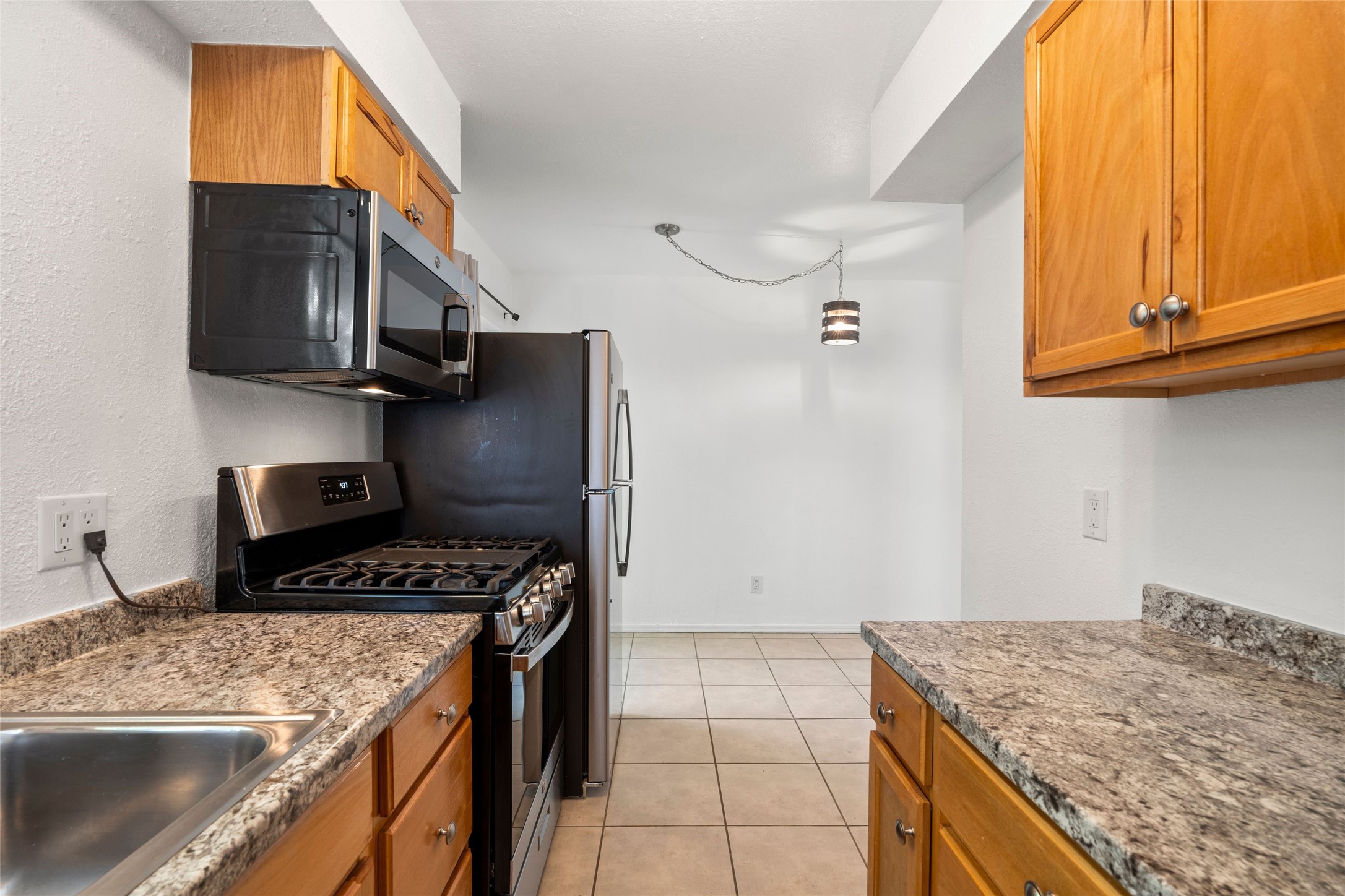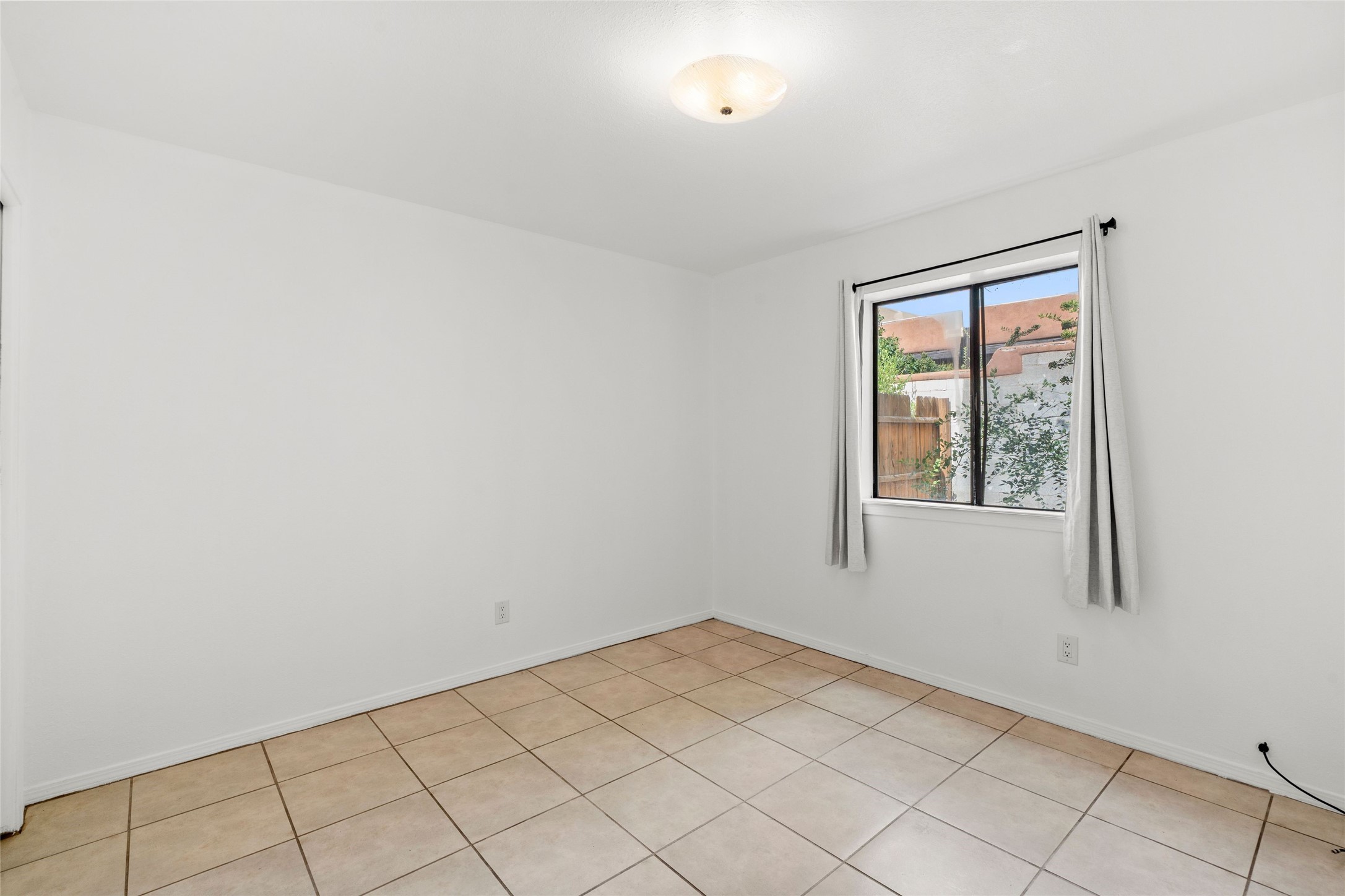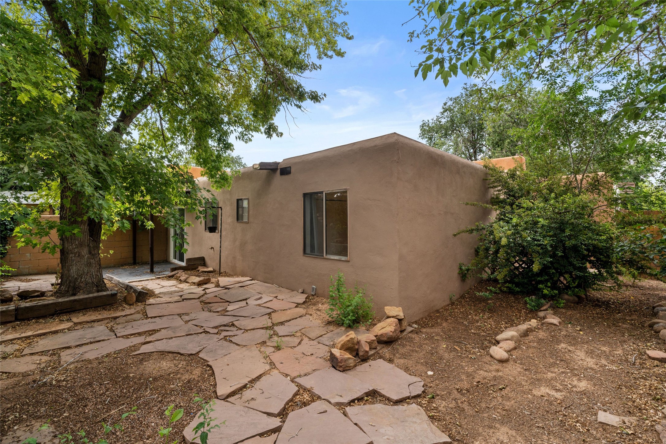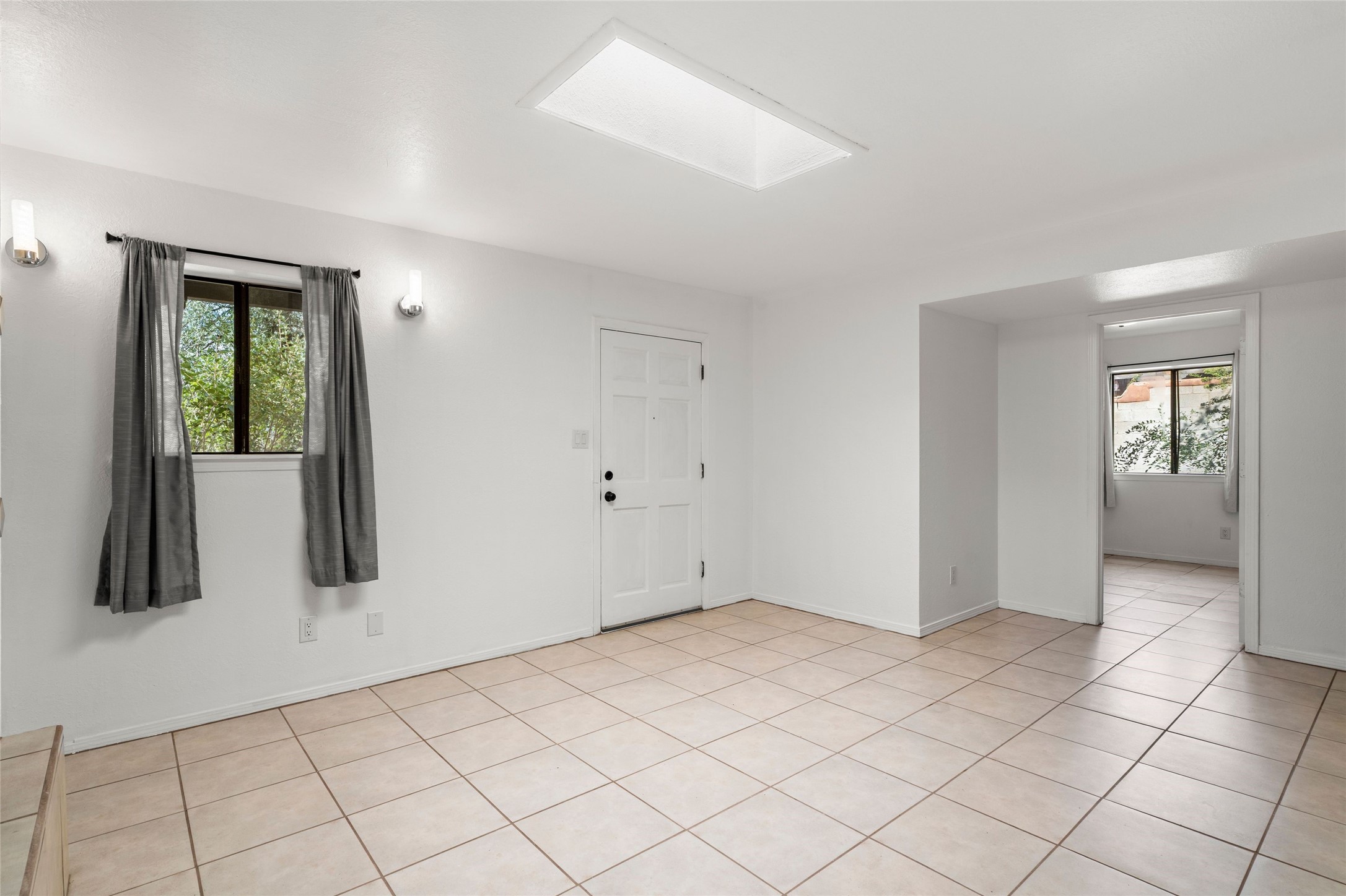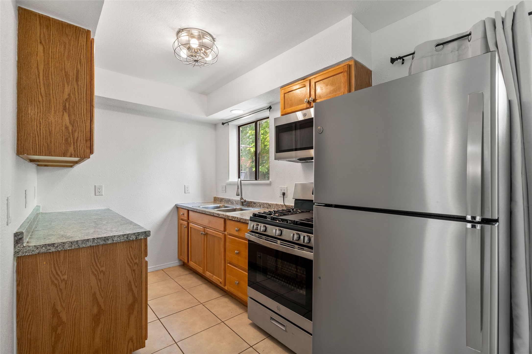 Located in a small community off Camino Capitan, this updated 2-bedroom, 1-bathroom condo with a new TPO roof in 2019 offers practical living in a convenient Santa Fe location. With 736 square feet, the home features a functional layout, tile flooring throughout, and good natural light. The living room includes a wood-burning fireplace and skylight. The kitchen has been updated with stainless steel appliances, new countertops, and added cabinetry. Just off the kitchen is a dining nook with a Pella sliding door that leads to the backyard. Outside, the private yard includes mature shade trees, flagstone paths, and a garden area. Additional features include a full bath with an updated vanity, two well-sized bedrooms, and modern light fixtures. Located near shopping, parks, schools, and the Rail Runner commuter train, this condo is a solid option for first-time buyers, investors, or anyone looking for a low-maintenance property in town.