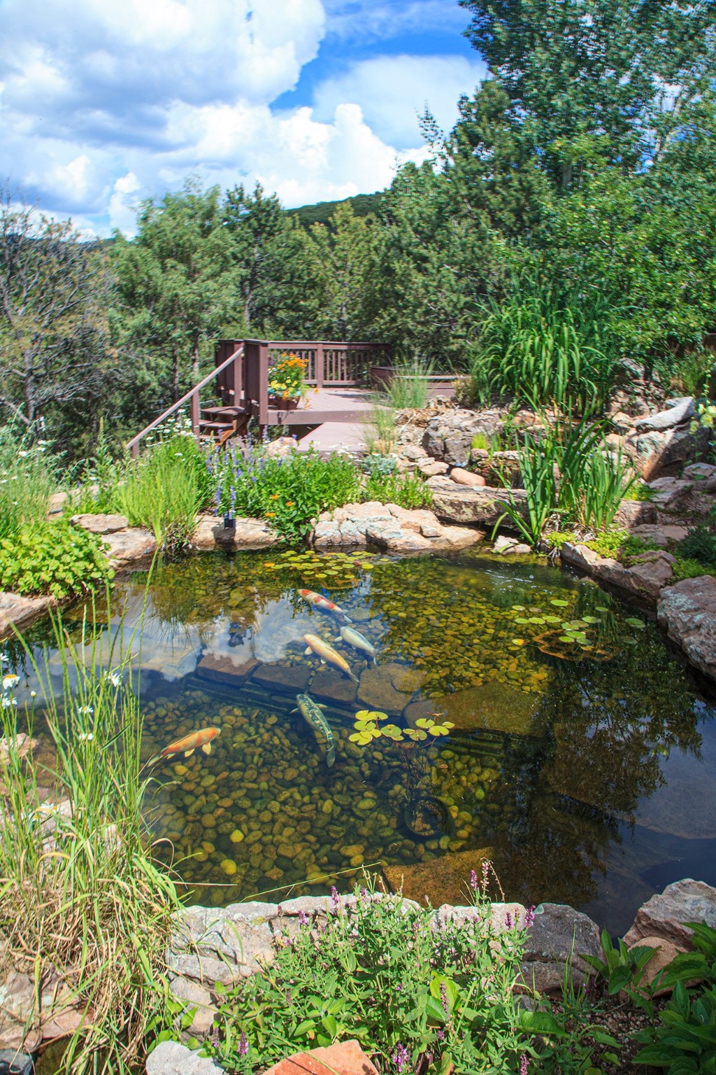 This stunning gated estate sprawls across over 4 acres, offering the perfect blend of privacy and convenience, and only a 20-minute drive to the Santa Fe Ski Basin. The home's architecture is exceptional, featuring a pitched roof, prominent exposed timbers and trusses, a gabled dormer, clerestory windows, a metal roof that enhances its aesthetic appeal and an elevator. The grand entryway is highlighted by a custom steel door and a cascading waterfall feature. The gourmet kitchen is a chef's dream, equipped with a large island, breakfast nook, side-by-side Sub-Zero refrigerator and freezer, a wine and beverage center, and a formal dining area. The spacious living and family rooms are designed for entertaining, with one bedroom in this wing--one large enough to serve as a children's playroom. The expansive master suite includes a sitting area with kiva fireplace, a large bathroom, his and hers closets, and a beautiful view of the adjacent surrounding 25-acre open space. Nearby are an office and two ensuite bedrooms. The lower level features an exercise room, game room, kitchenette, wine cellar, and a bath. Outside, the property is equally impressive, with decks, porches, and patios nestled among lush fruit trees, aspens, and gardens. The outdoor living spaces include a professional BBQ, fireplace, and seating area around a tranquil Koi Pond. A separate combination car/RV garage provides ample space for large vehicles, with a private one-bedroom, one-bath guest house situated above it. This is quite simply a little slice of heaven just minutes from downtown Santa Fe and the Historic Plaza!