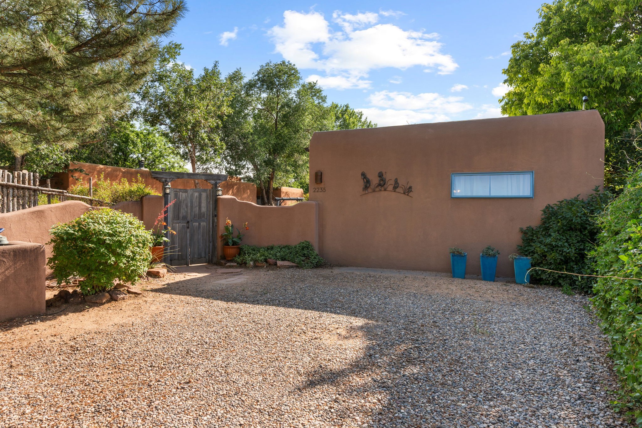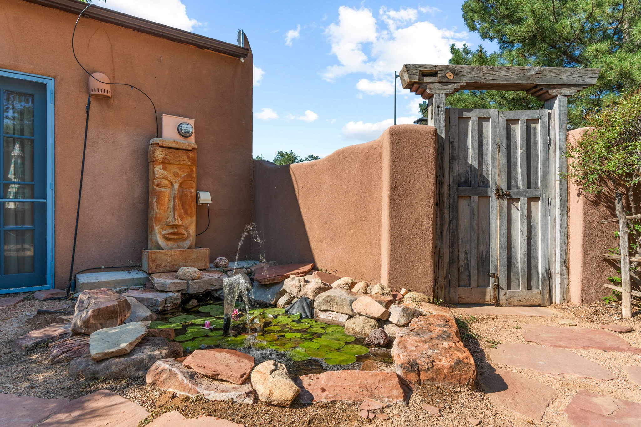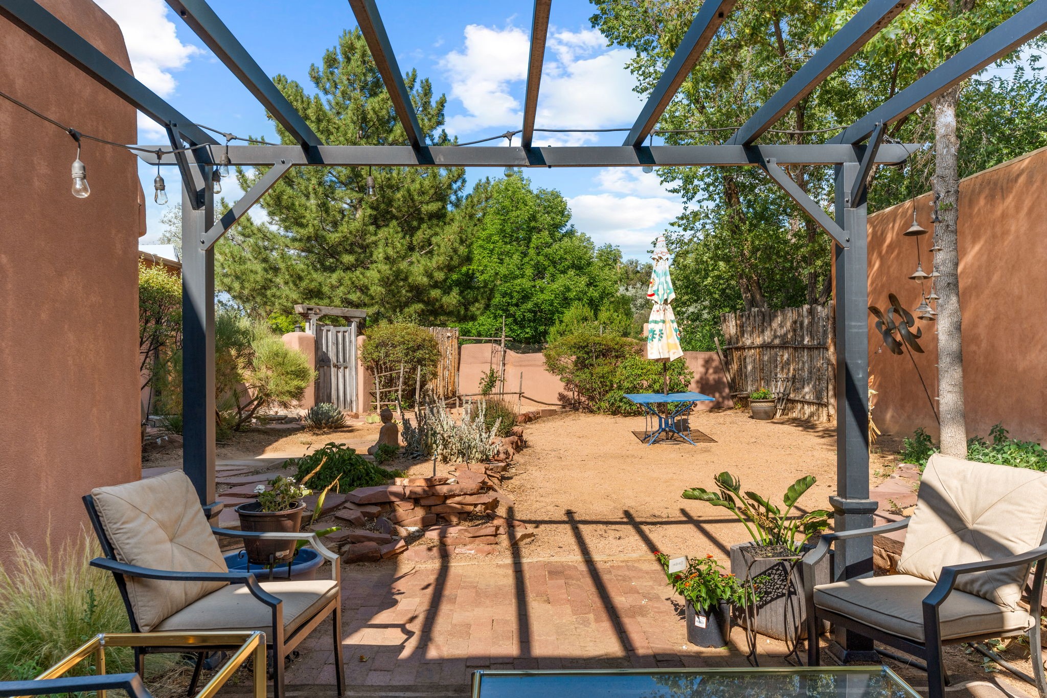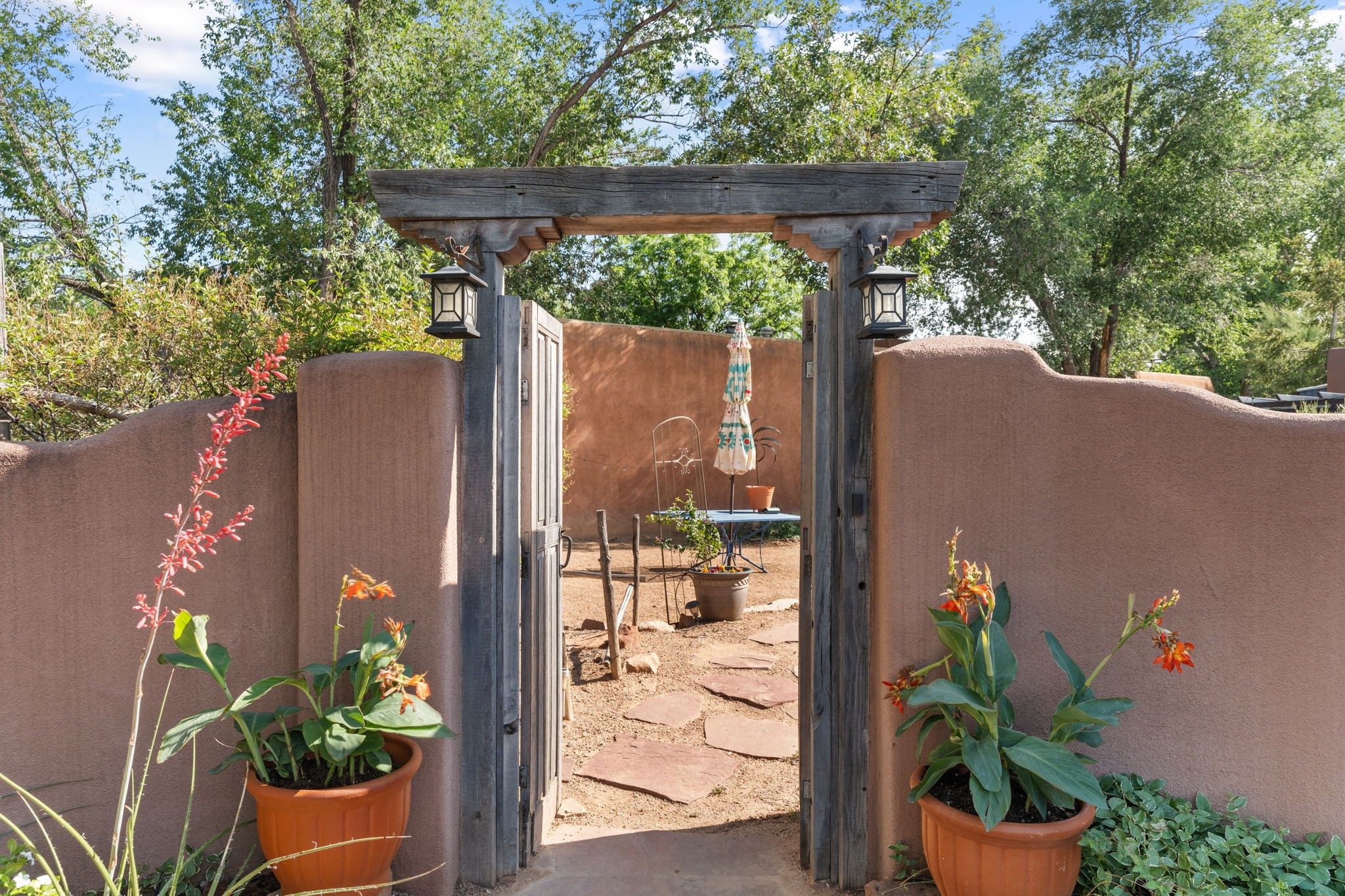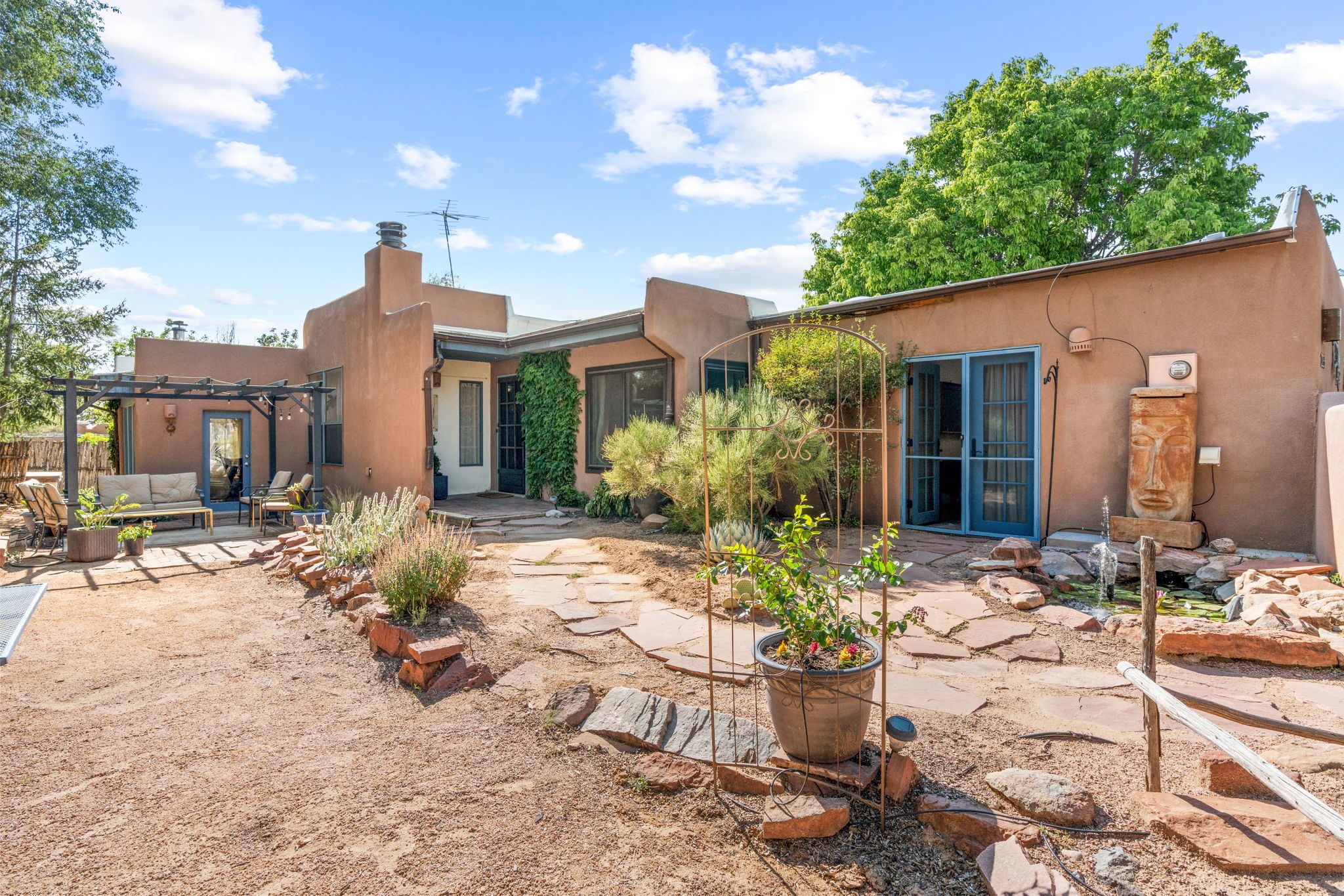 Welcome to your private retreat in the heart of the coveted Pueblo Alegre neighborhood! This quintessential Santa Fe-style home is a true gem, offering timeless charm, abundant outdoor living, and an unbeatable location directly across from one of the community's lush green parks.Tucked behind a lovely gated entry, this fully fenced property offers a peaceful sense of seclusion surrounded by mature trees, meandering garden paths, a serene lily pond, with a trickling fountain. Almost every room in the home opens to the outdoors, creating a seamless connection with nature and inviting light into every corner.Inside, you'll find a unique layout featuring three bedrooms and three full bathrooms, arranged in a split floor plan for maximum privacy. The home boasts two distinct living rooms--one an inviting adobe space with a cozy wood stove, the other near the kitchen and dining area with a classic wood-burning corner fireplace, perfect for gathering on cool evenings.The galley kitchen is charming and functional, featuring a vibrant Talavera-tiled bar, newer stainless steel appliances, and a gas stove--ideal for home chefs and entertainers alike. Step outside to multiple sitting areas that beckon for morning coffee, al fresco dining, or quiet moments with a book.Two ensuite primary bedrooms offer flexibility and comfort, while a third guest bedroom provides space for visitors, a studio, or an office. Brick, tile and soft carpet flooring add to the home's warmth and character.Peaceful and private, yet just minutes to shopping, dining, and all the best of Santa Fe, this is a rare opportunity to own a soulful haven in a highly desirable neighborhood.Don't miss this true Santa Fe treasure--schedule your private showing today!