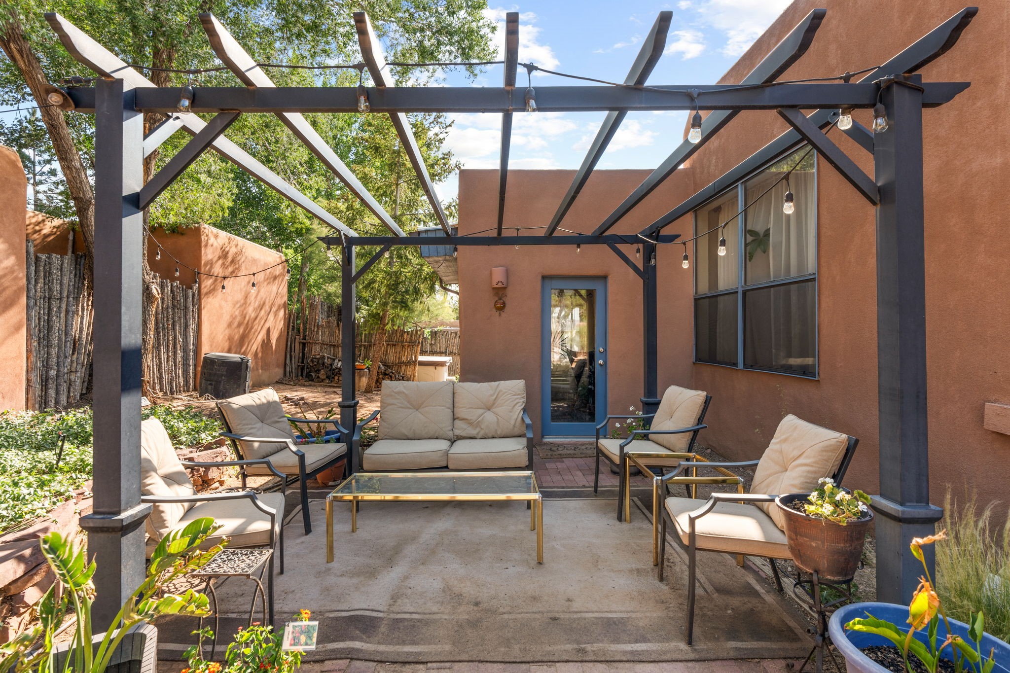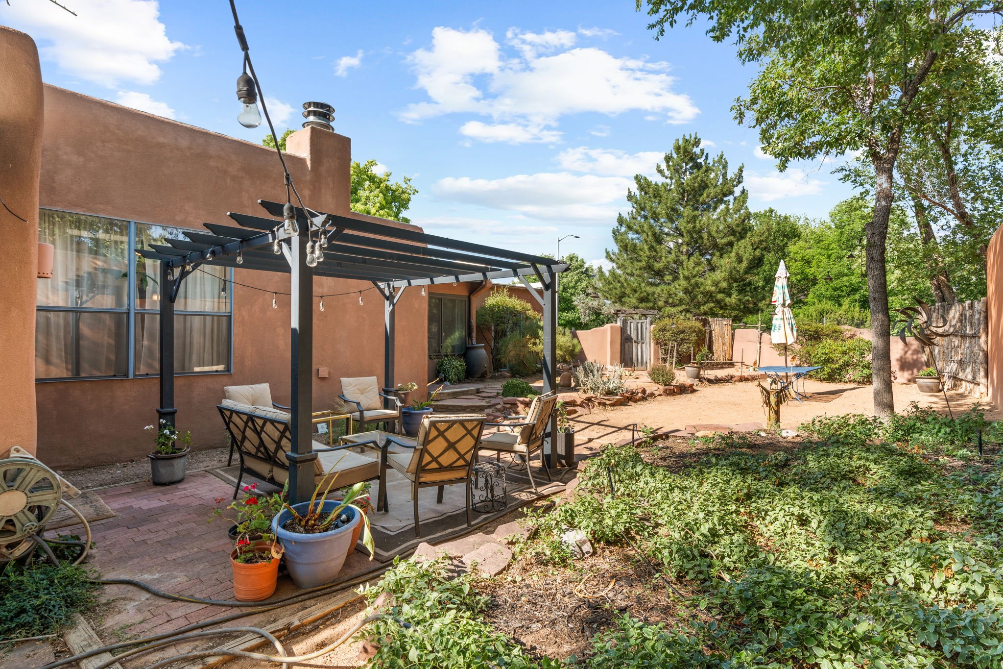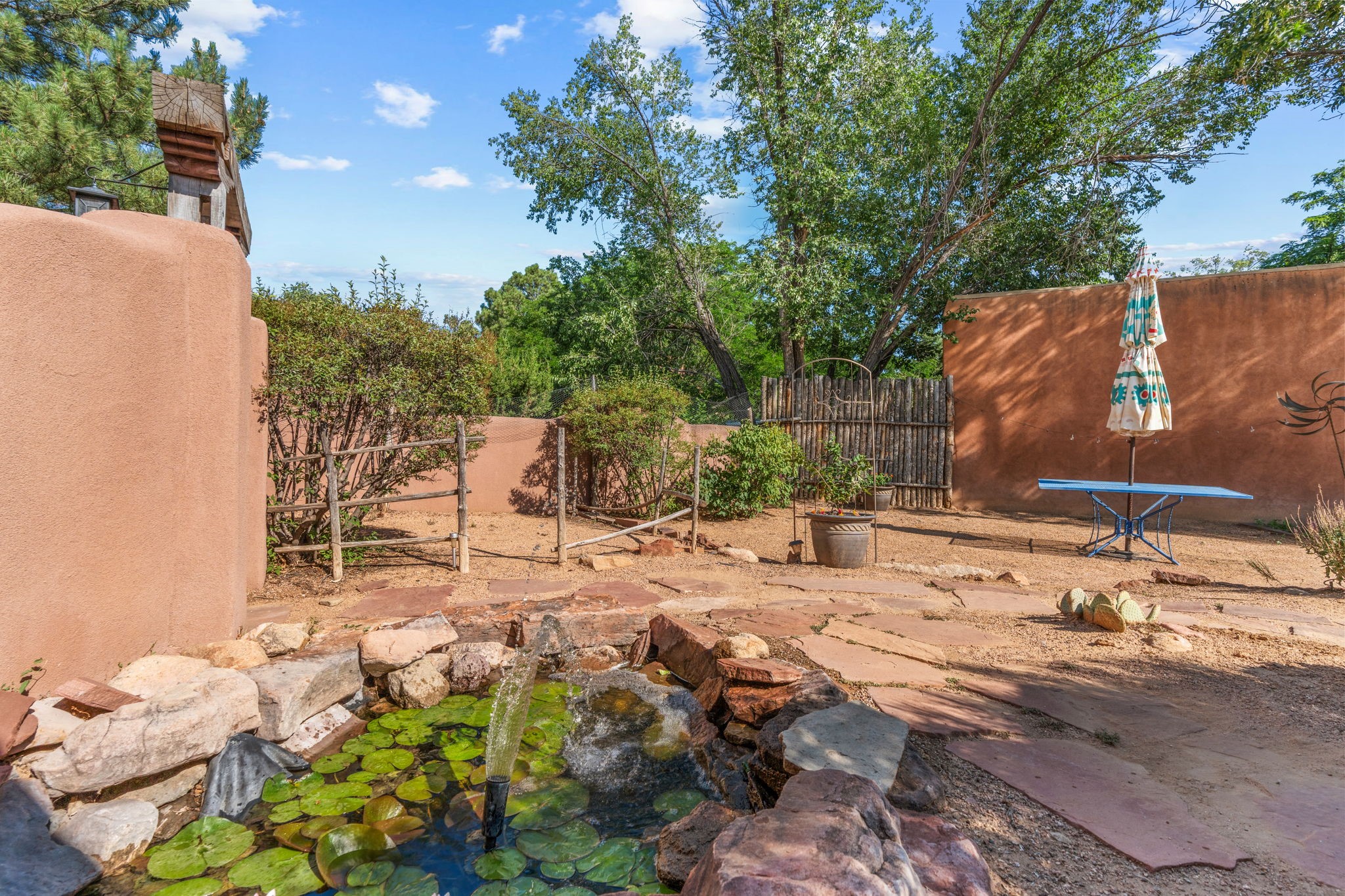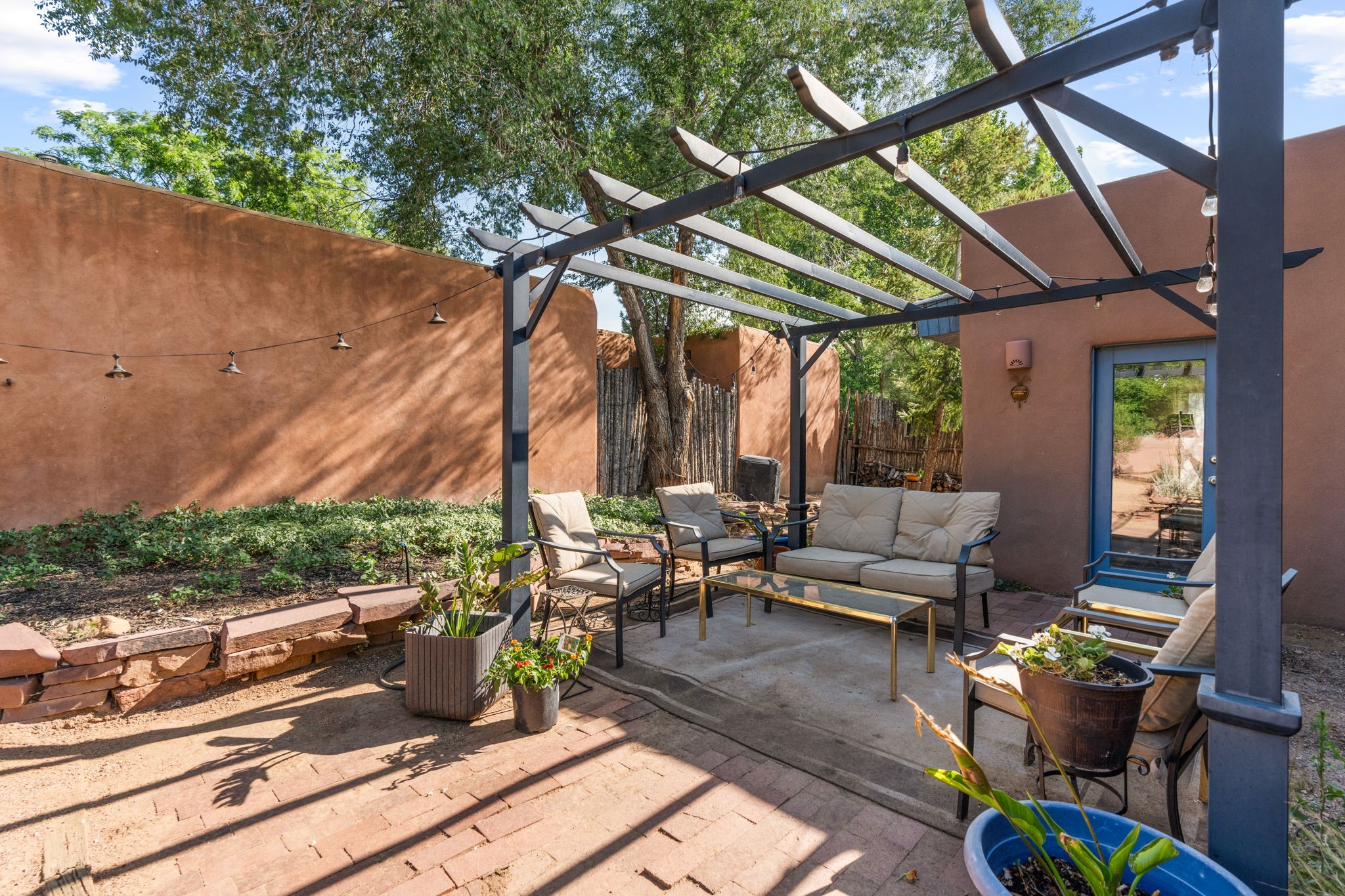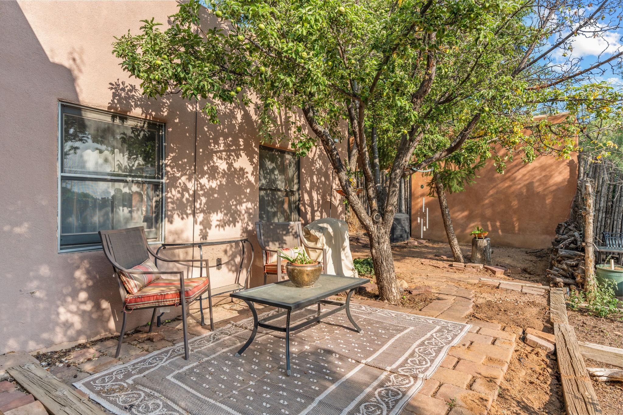Welcome to your private retreat in the heart of the coveted Pueblo Alegre neighborhood! This quintessential Santa Fe-style home is a true gem, offering timeless charm, abundant outdoor living, and an unbeatable location directly across from one of the community's lush green parks.Tucked behind a lovely gated entry, this fully fenced property offers a peaceful sense of seclusion surrounded by mature trees, meandering garden paths, a serene lily pond, with a trickling fountain. Almost every room in the home opens to the outdoors, creating a seamless connection with nature and inviting light into every corner.Inside, you'll find a unique layout featuring three bedrooms and three full bathrooms, arranged in a split floor plan for maximum privacy. The home boasts two distinct living rooms--one an inviting adobe space with a cozy wood stove, the other near the kitchen and dining area with a classic wood-burning corner fireplace, perfect for gathering on cool evenings.The galley kitchen is charming and functional, featuring a vibrant Talavera-tiled bar, newer stainless steel appliances, and a gas stove--ideal for home chefs and entertainers alike. Step outside to multiple sitting areas that beckon for morning coffee, al fresco dining, or quiet moments with a book.Two ensuite primary bedrooms offer flexibility and comfort, while a third guest bedroom provides space for visitors, a studio, or an office. Brick, tile and soft carpet flooring add to the home's warmth and character.Peaceful and private, yet just minutes to shopping, dining, and all the best of Santa Fe, this is a rare opportunity to own a soulful haven in a highly desirable neighborhood.Don't miss this true Santa Fe treasure--schedule your private showing today!