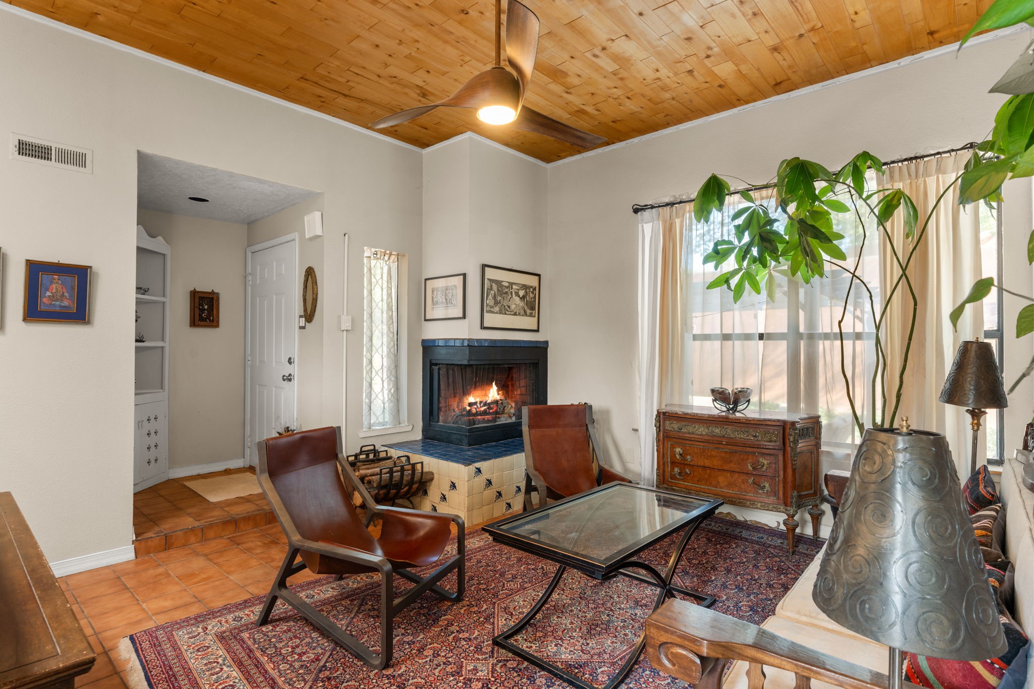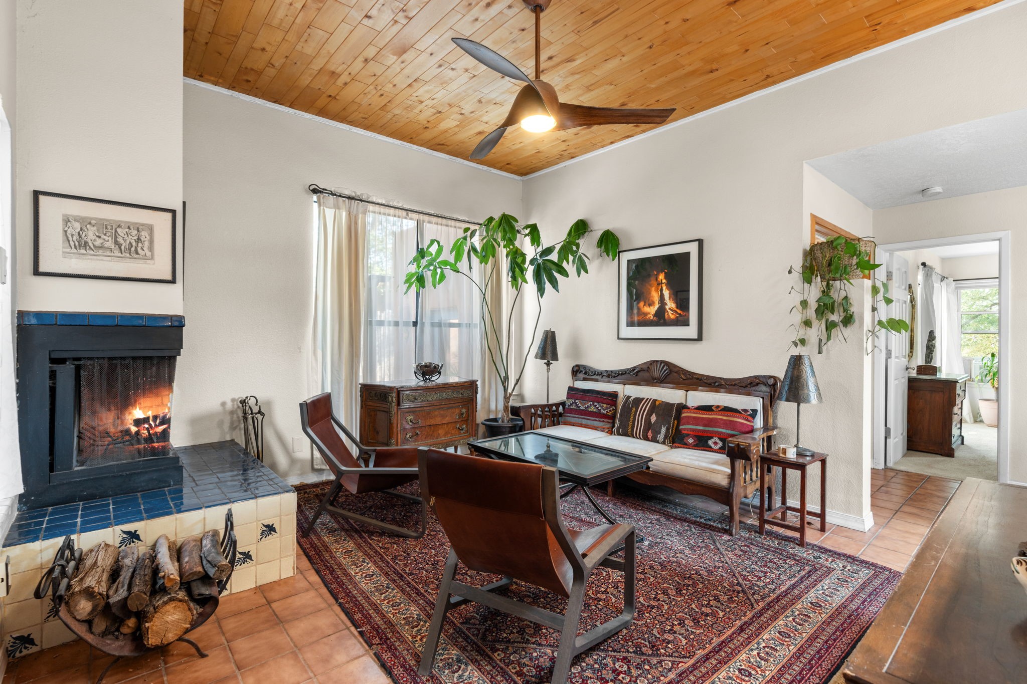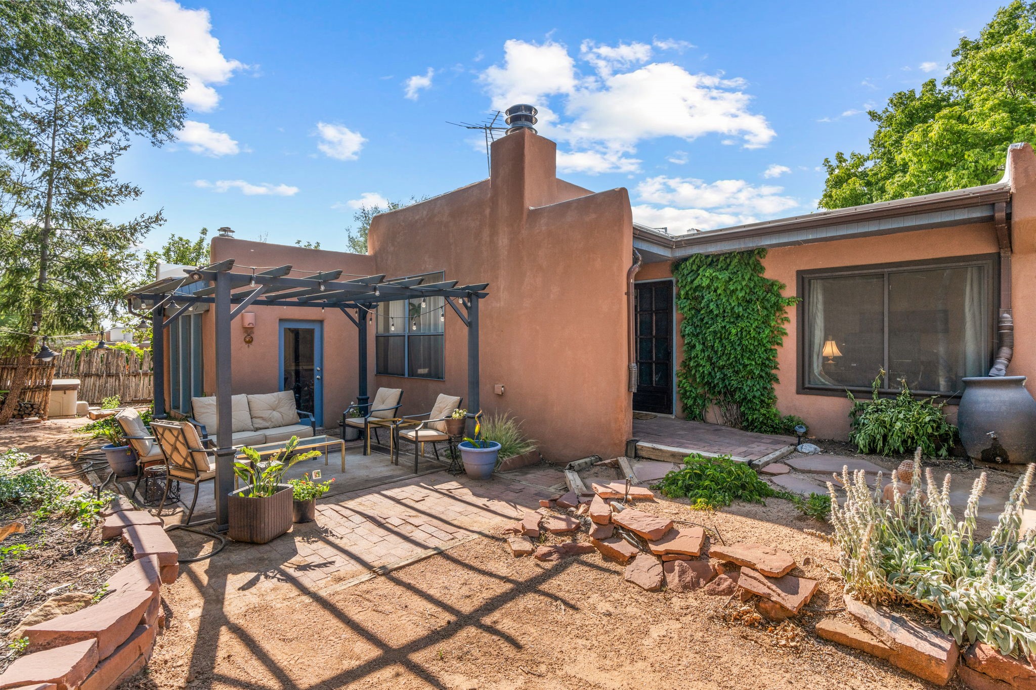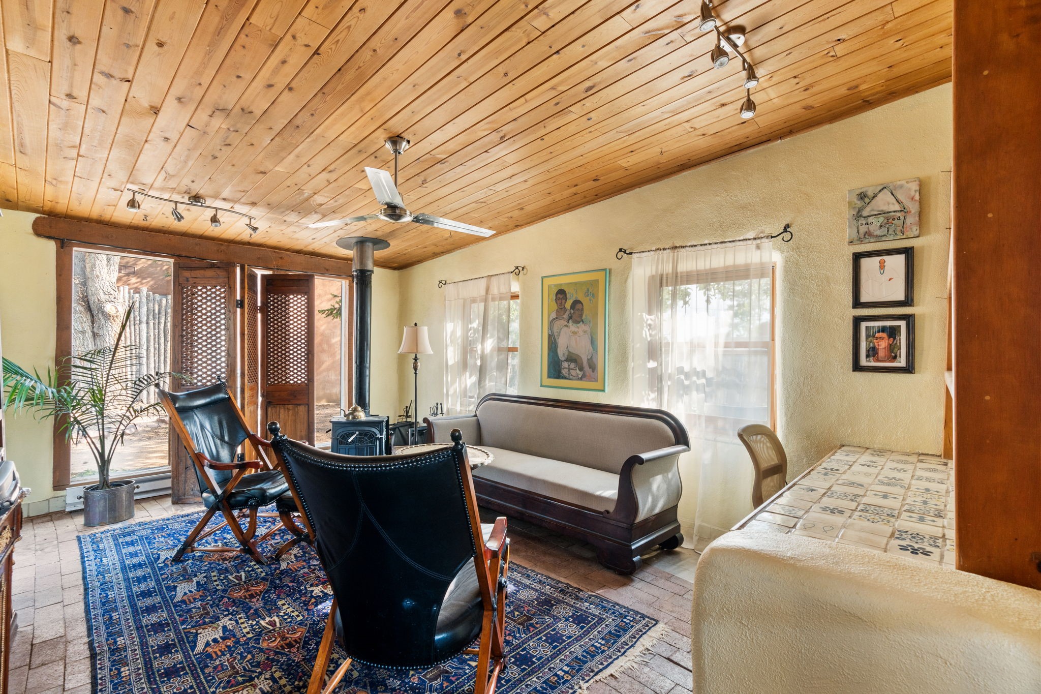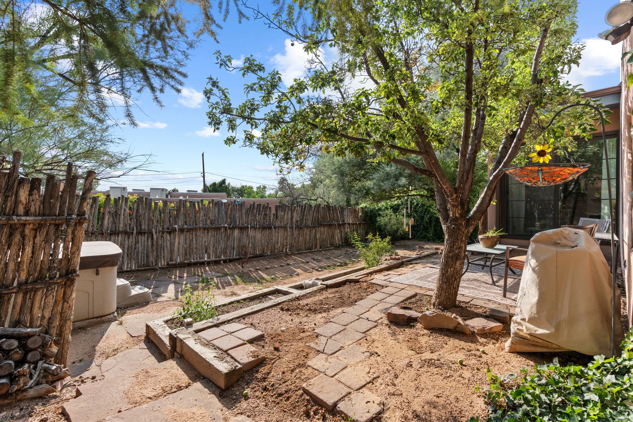Welcome to your private retreat in the heart of the coveted Pueblo Alegre neighborhood! This quintessential Santa Fe-style home is a true gem, offering timeless charm, abundant outdoor living, and an unbeatable location directly across from one of the community's lush green parks.Tucked behind a lovely gated entry, this fully fenced property offers a peaceful sense of seclusion surrounded by mature trees, meandering garden paths, a serene lily pond, with a trickling fountain. Almost every room in the home opens to the outdoors, creating a seamless connection with nature and inviting light into every corner.Inside, you'll find a unique layout featuring three bedrooms and three full bathrooms, arranged in a split floor plan for maximum privacy. The home boasts two distinct living rooms--one an inviting adobe space with a cozy wood stove, the other near the kitchen and dining area with a classic wood-burning corner fireplace, perfect for gathering on cool evenings.The galley kitchen is charming and functional, featuring a vibrant Talavera-tiled bar, newer stainless steel appliances, and a gas stove--ideal for home chefs and entertainers alike. Step outside to multiple sitting areas that beckon for morning coffee, al fresco dining, or quiet moments with a book.Two ensuite primary bedrooms offer flexibility and comfort, while a third guest bedroom provides space for visitors, a studio, or an office. Brick, tile and soft carpet flooring add to the home's warmth and character.Peaceful and private, yet just minutes to shopping, dining, and all the best of Santa Fe, this is a rare opportunity to own a soulful haven in a highly desirable neighborhood.Don't miss this true Santa Fe treasure--schedule your private showing today!