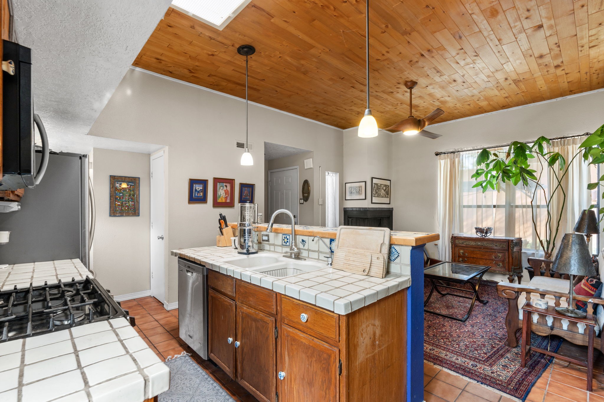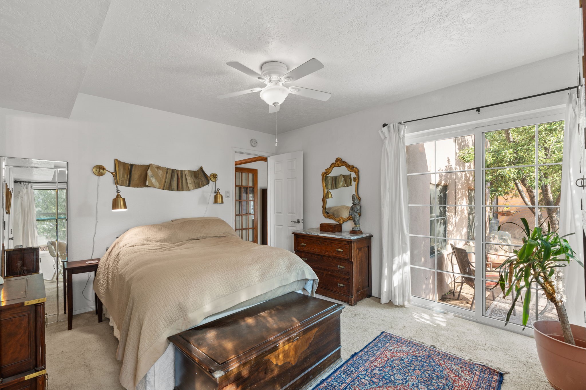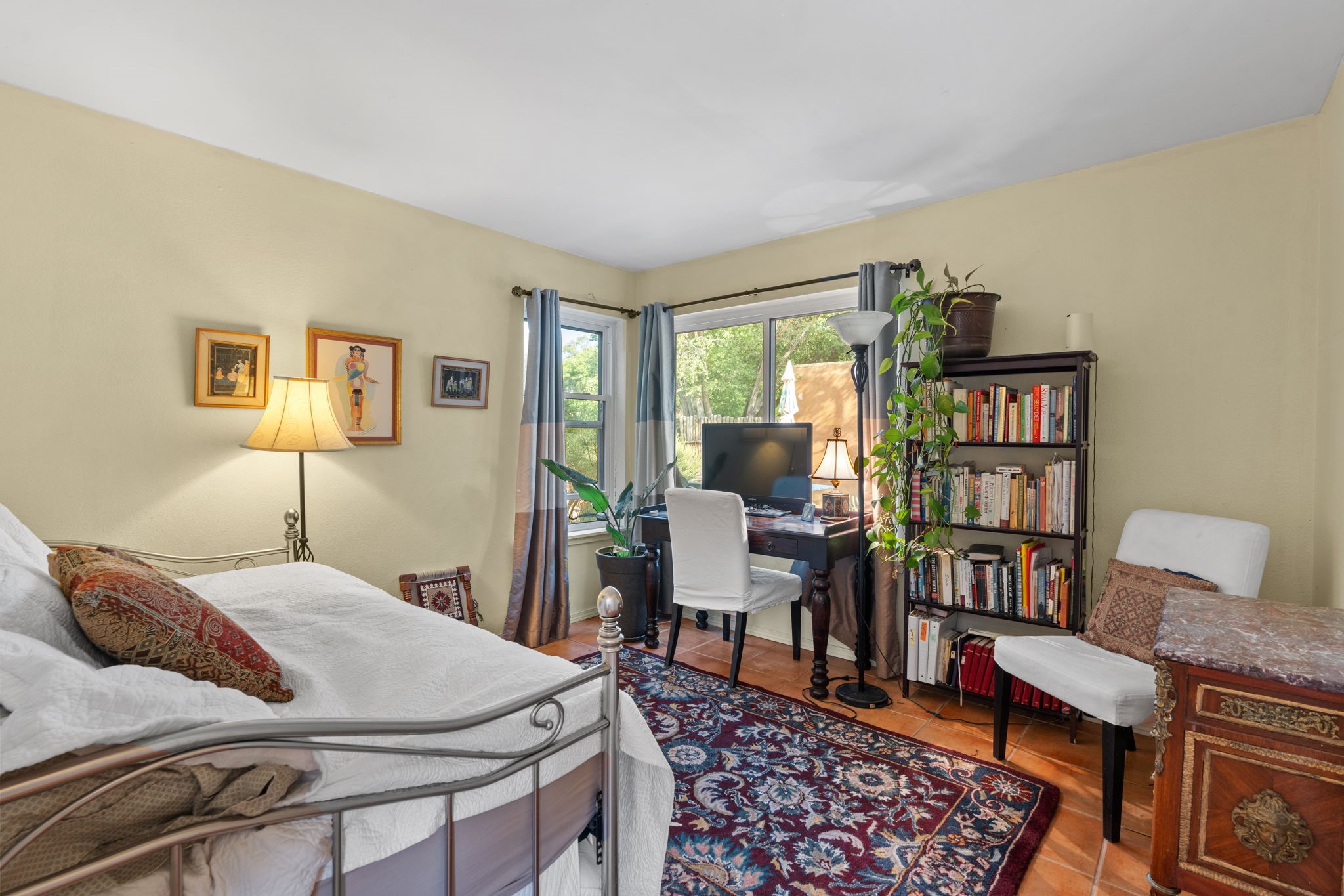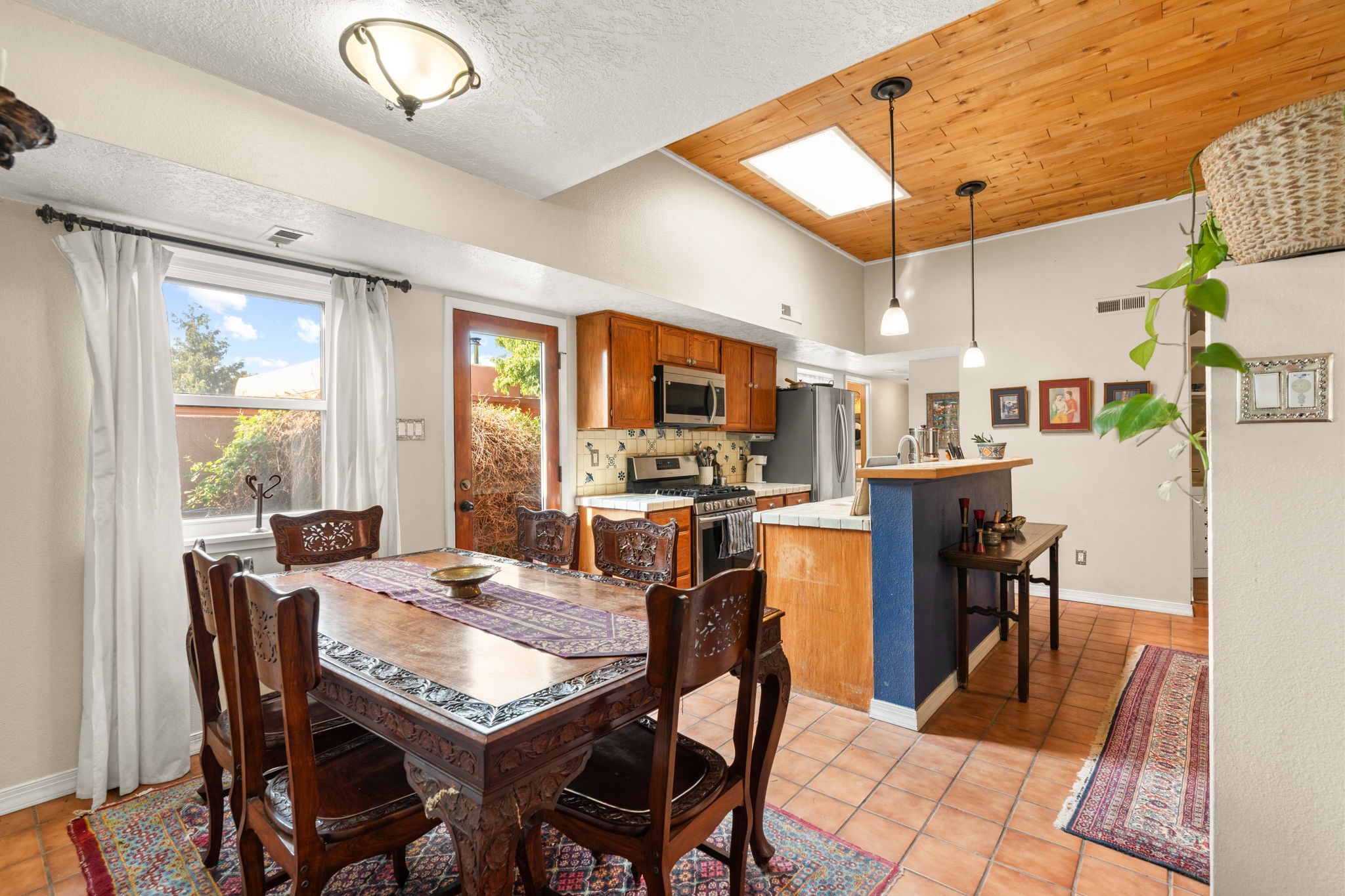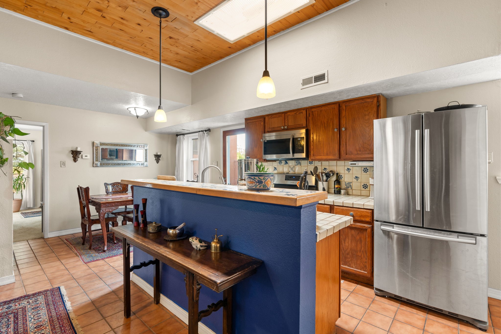 Welcome to your private retreat in the heart of the coveted Pueblo Alegre neighborhood! This quintessential Santa Fe-style home is a true gem, offering timeless charm, abundant outdoor living, and an unbeatable location directly across from one of the community's lush green parks.Tucked behind a lovely gated entry, this fully fenced property offers a peaceful sense of seclusion surrounded by mature trees, meandering garden paths, a serene lily pond, with a trickling fountain. Almost every room in the home opens to the outdoors, creating a seamless connection with nature and inviting light into every corner.Inside, you'll find a unique layout featuring three bedrooms and three full bathrooms, arranged in a split floor plan for maximum privacy. The home boasts two distinct living rooms--one an inviting adobe space with a cozy wood stove, the other near the kitchen and dining area with a classic wood-burning corner fireplace, perfect for gathering on cool evenings.The galley kitchen is charming and functional, featuring a vibrant Talavera-tiled bar, newer stainless steel appliances, and a gas stove--ideal for home chefs and entertainers alike. Step outside to multiple sitting areas that beckon for morning coffee, al fresco dining, or quiet moments with a book.Two ensuite primary bedrooms offer flexibility and comfort, while a third guest bedroom provides space for visitors, a studio, or an office. Brick, tile and soft carpet flooring add to the home's warmth and character.Peaceful and private, yet just minutes to shopping, dining, and all the best of Santa Fe, this is a rare opportunity to own a soulful haven in a highly desirable neighborhood.Don't miss this true Santa Fe treasure--schedule your private showing today!