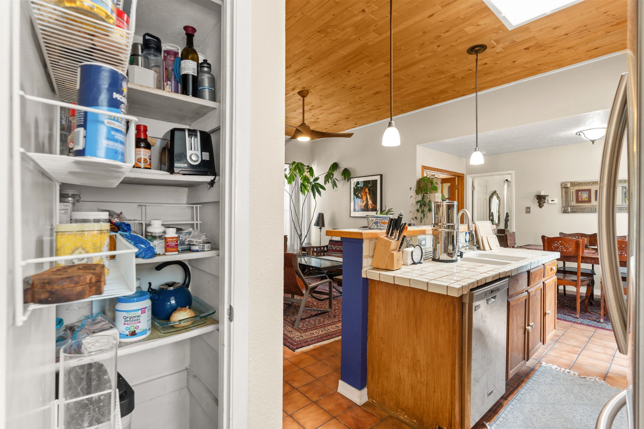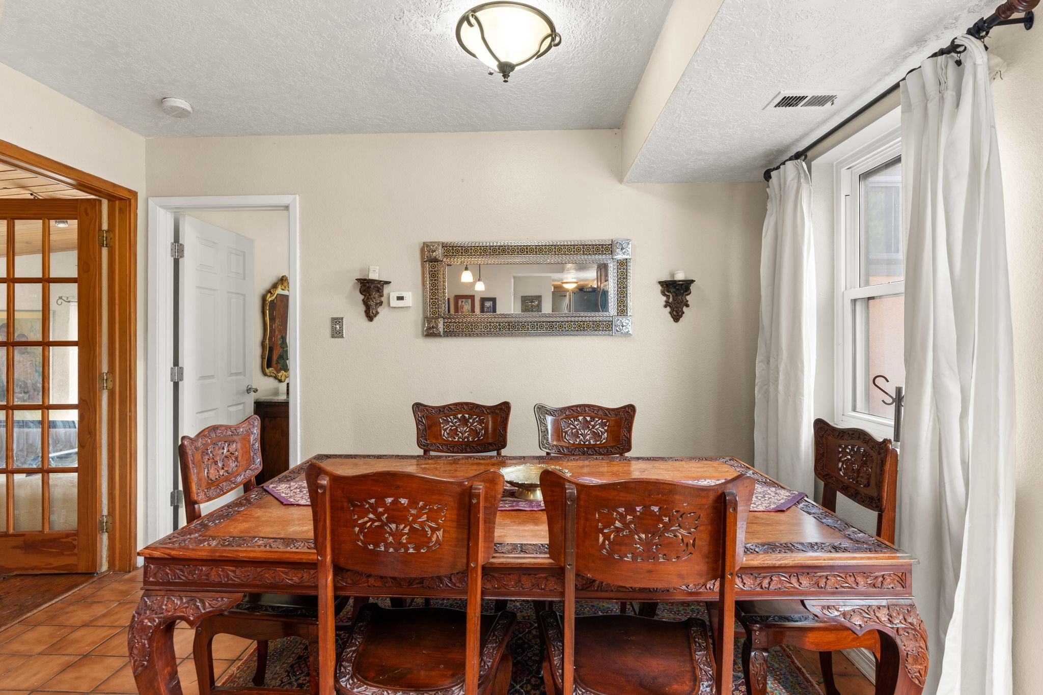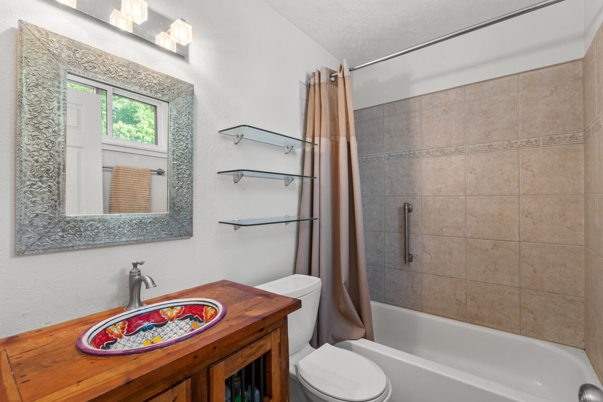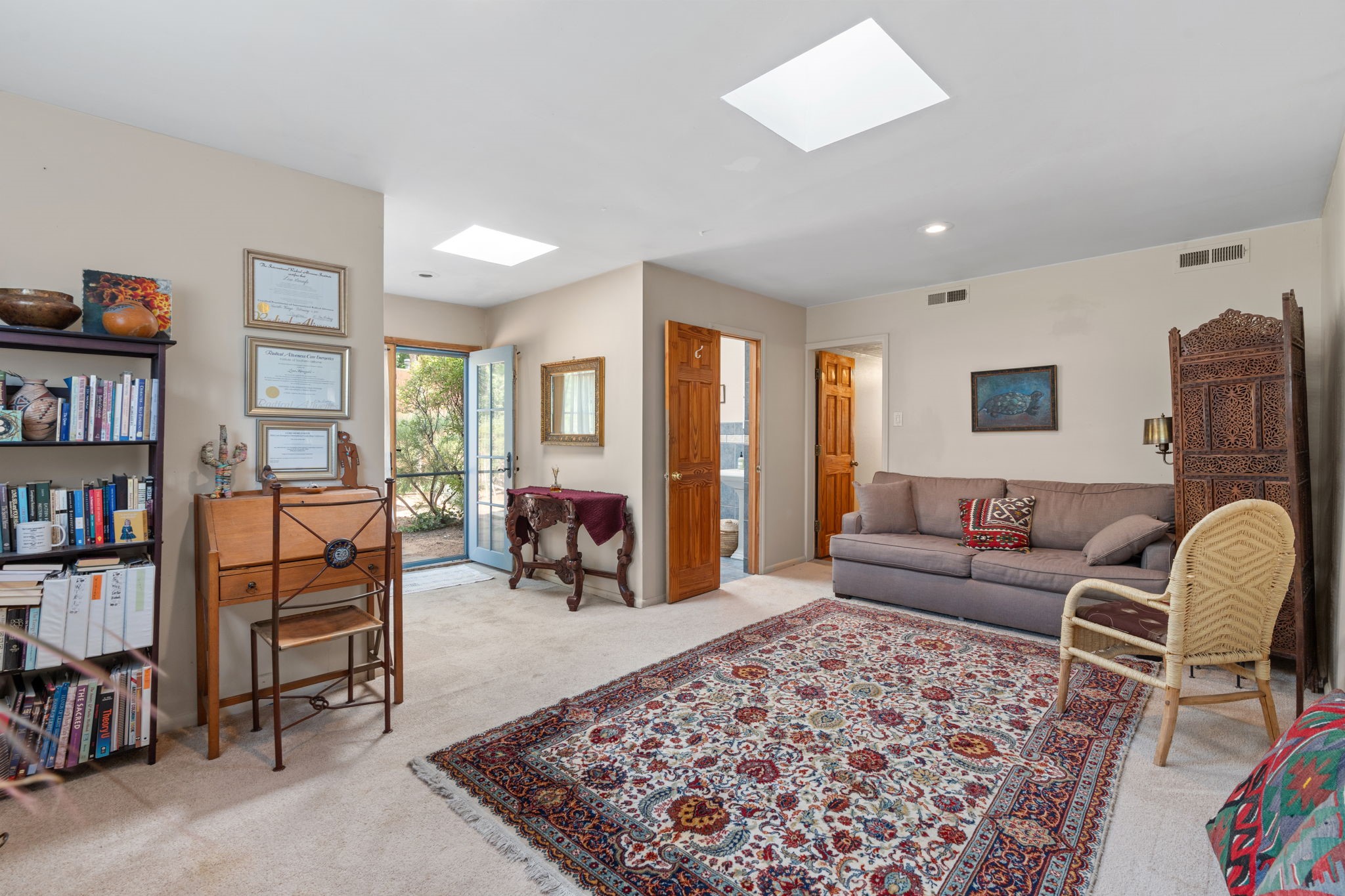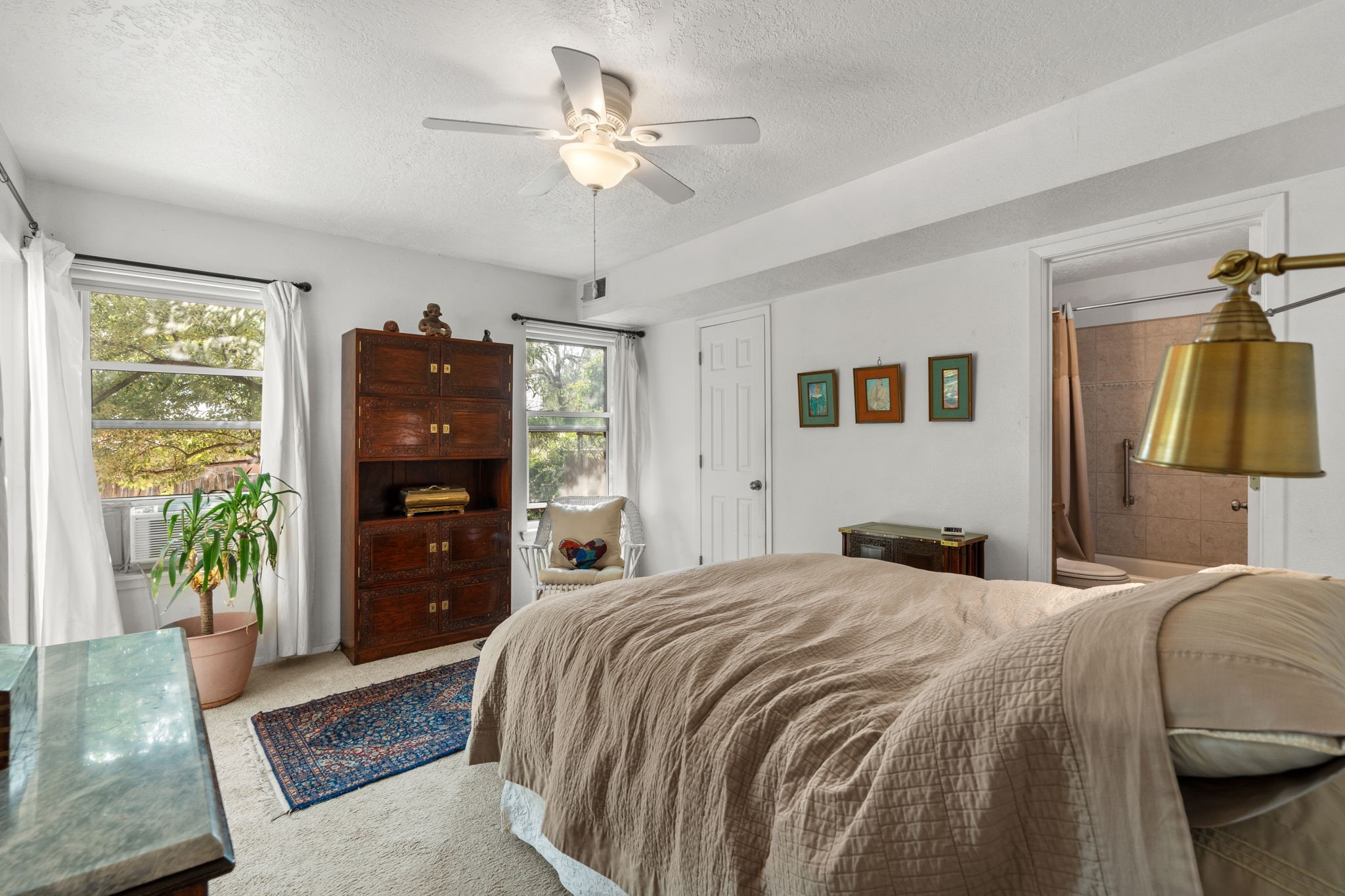 Welcome to your private retreat in the heart of the coveted Pueblo Alegre neighborhood! This quintessential Santa Fe-style home is a true gem, offering timeless charm, abundant outdoor living, and an unbeatable location directly across from one of the community's lush green parks.Tucked behind a lovely gated entry, this fully fenced property offers a peaceful sense of seclusion surrounded by mature trees, meandering garden paths, a serene lily pond, with a trickling fountain. Almost every room in the home opens to the outdoors, creating a seamless connection with nature and inviting light into every corner.Inside, you'll find a unique layout featuring three bedrooms and three full bathrooms, arranged in a split floor plan for maximum privacy. The home boasts two distinct living rooms--one an inviting adobe space with a cozy wood stove, the other near the kitchen and dining area with a classic wood-burning corner fireplace, perfect for gathering on cool evenings.The galley kitchen is charming and functional, featuring a vibrant Talavera-tiled bar, newer stainless steel appliances, and a gas stove--ideal for home chefs and entertainers alike. Step outside to multiple sitting areas that beckon for morning coffee, al fresco dining, or quiet moments with a book.Two ensuite primary bedrooms offer flexibility and comfort, while a third guest bedroom provides space for visitors, a studio, or an office. Brick, tile and soft carpet flooring add to the home's warmth and character.Peaceful and private, yet just minutes to shopping, dining, and all the best of Santa Fe, this is a rare opportunity to own a soulful haven in a highly desirable neighborhood.Don't miss this true Santa Fe treasure--schedule your private showing today!