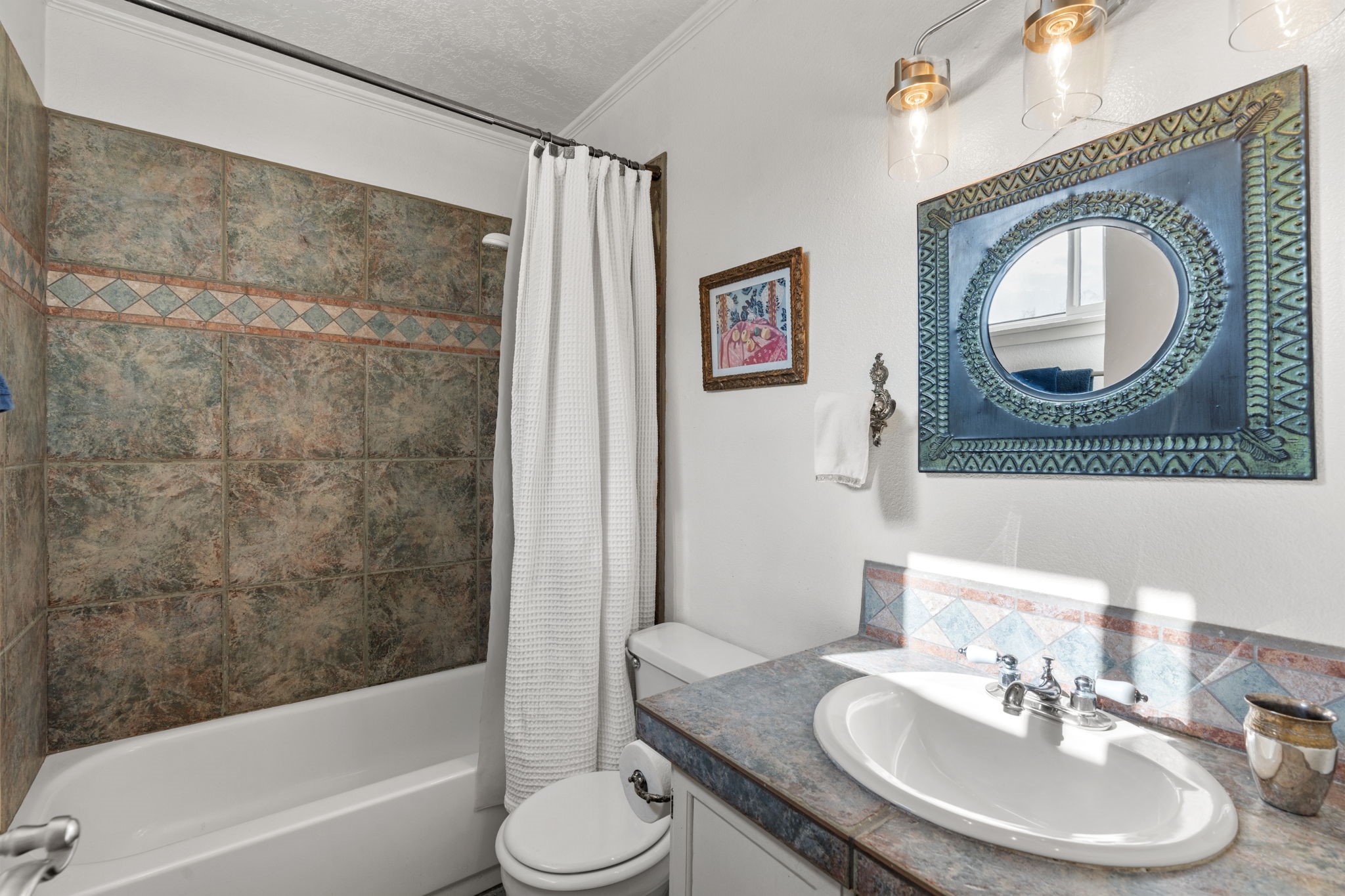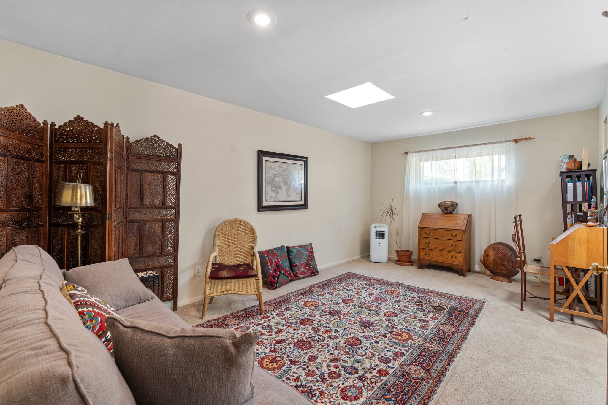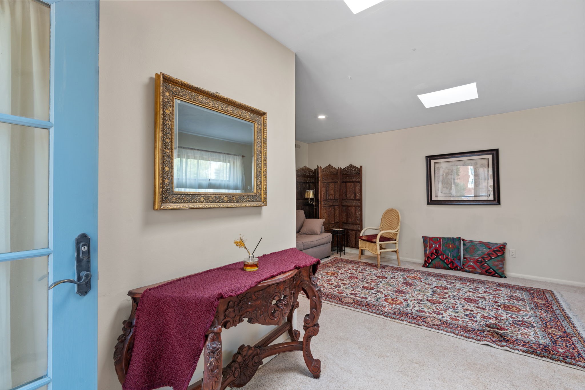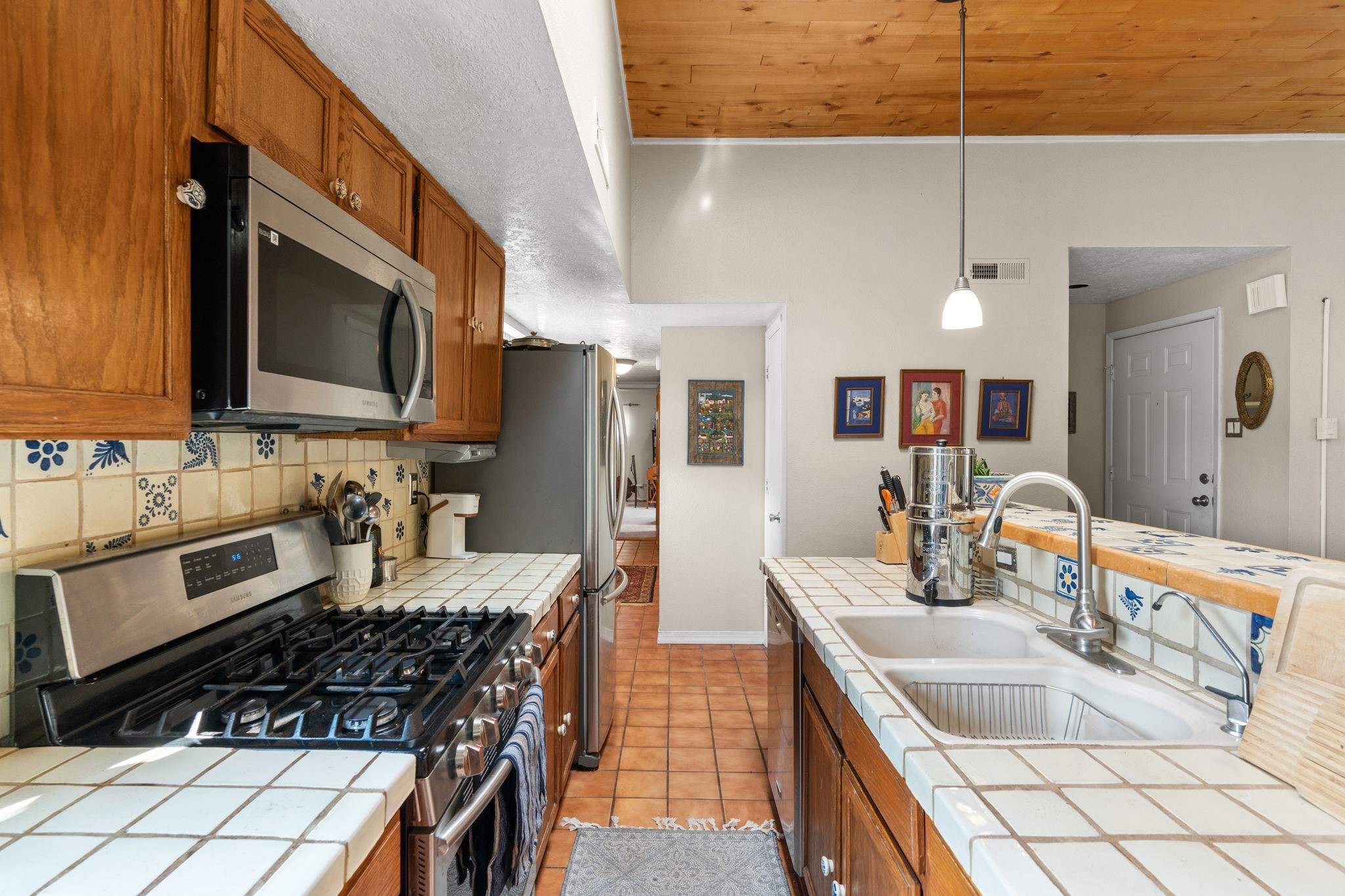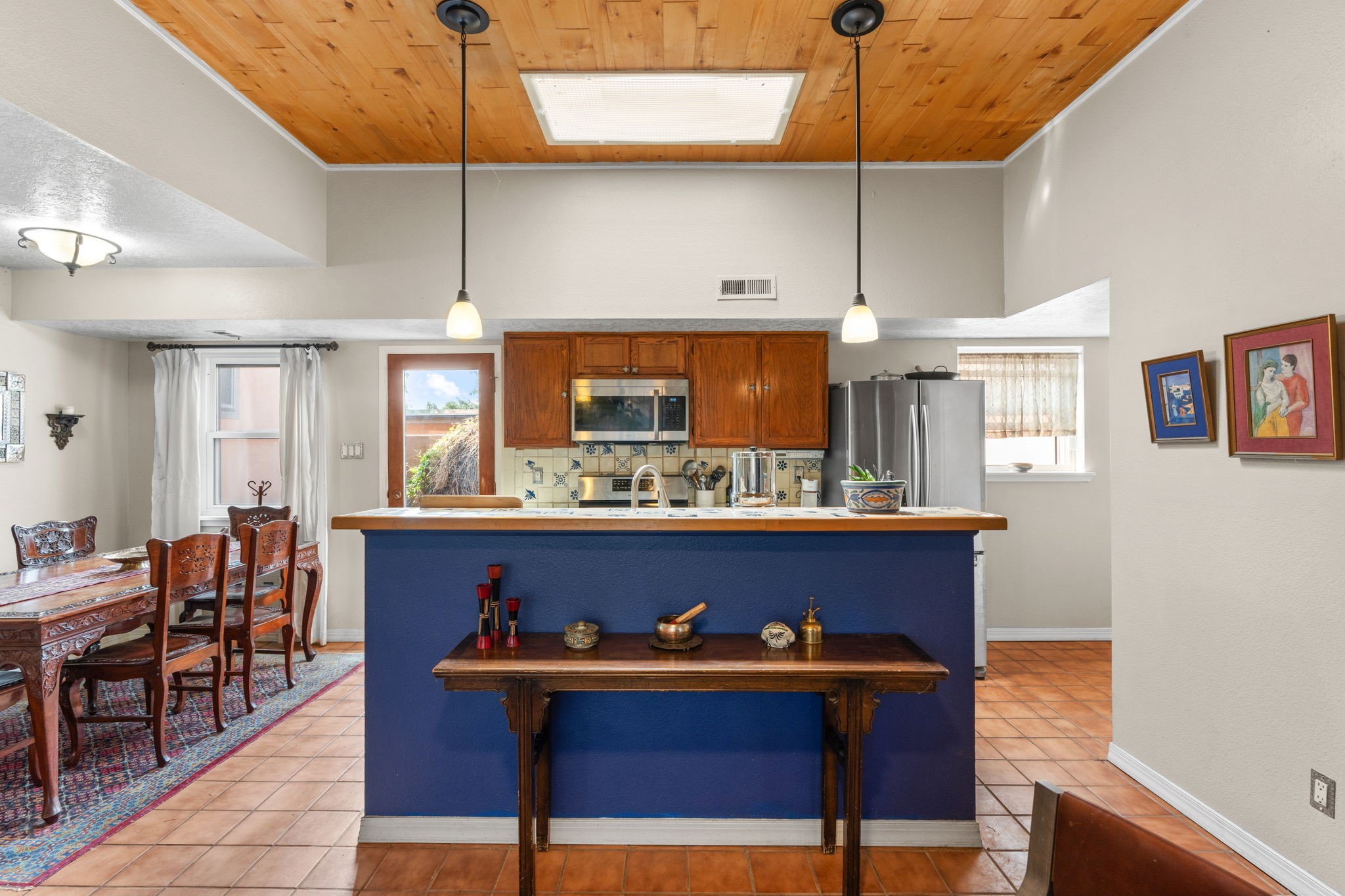 Welcome to your private retreat in the heart of the coveted Pueblo Alegre neighborhood! This quintessential Santa Fe-style home is a true gem, offering timeless charm, abundant outdoor living, and an unbeatable location directly across from one of the community's lush green parks.Tucked behind a lovely gated entry, this fully fenced property offers a peaceful sense of seclusion surrounded by mature trees, meandering garden paths, a serene lily pond, with a trickling fountain. Almost every room in the home opens to the outdoors, creating a seamless connection with nature and inviting light into every corner.Inside, you'll find a unique layout featuring three bedrooms and three full bathrooms, arranged in a split floor plan for maximum privacy. The home boasts two distinct living rooms--one an inviting adobe space with a cozy wood stove, the other near the kitchen and dining area with a classic wood-burning corner fireplace, perfect for gathering on cool evenings.The galley kitchen is charming and functional, featuring a vibrant Talavera-tiled bar, newer stainless steel appliances, and a gas stove--ideal for home chefs and entertainers alike. Step outside to multiple sitting areas that beckon for morning coffee, al fresco dining, or quiet moments with a book.Two ensuite primary bedrooms offer flexibility and comfort, while a third guest bedroom provides space for visitors, a studio, or an office. Brick, tile and soft carpet flooring add to the home's warmth and character.Peaceful and private, yet just minutes to shopping, dining, and all the best of Santa Fe, this is a rare opportunity to own a soulful haven in a highly desirable neighborhood.Don't miss this true Santa Fe treasure--schedule your private showing today!