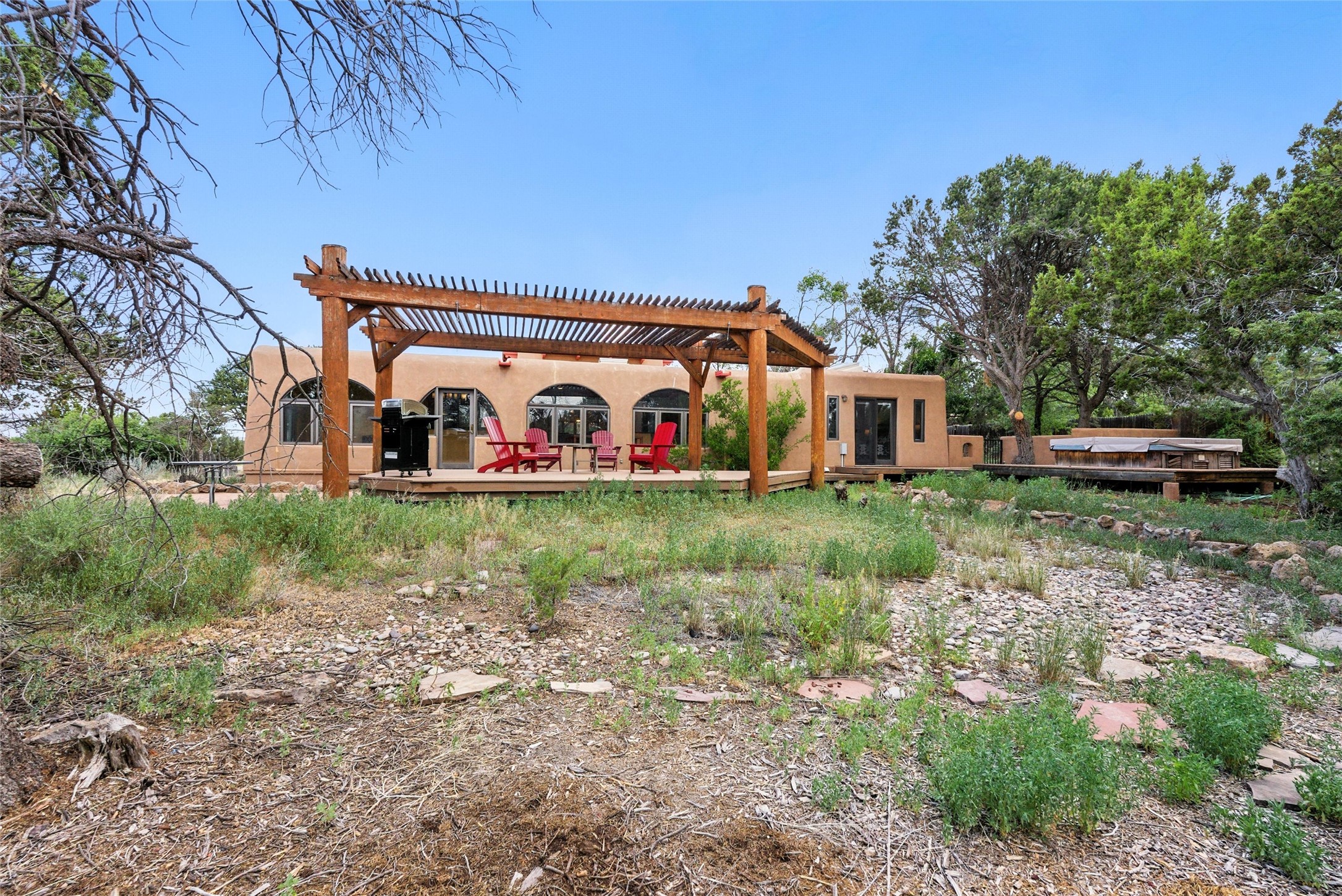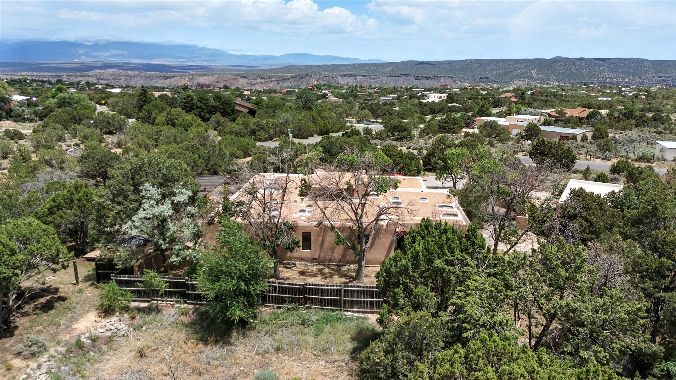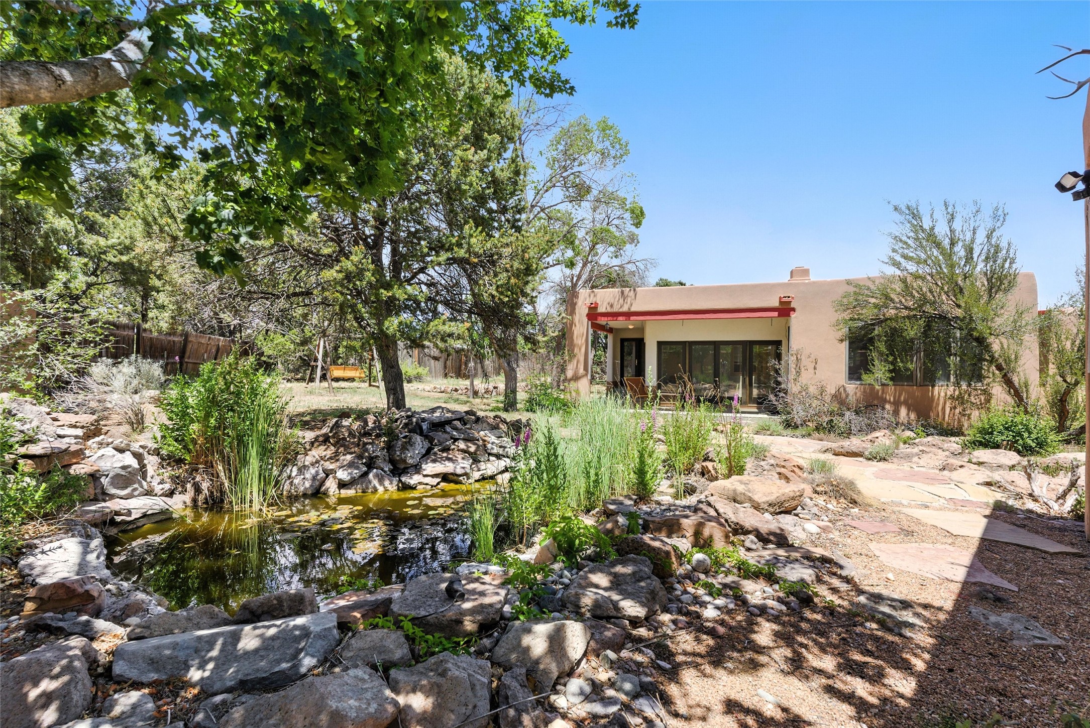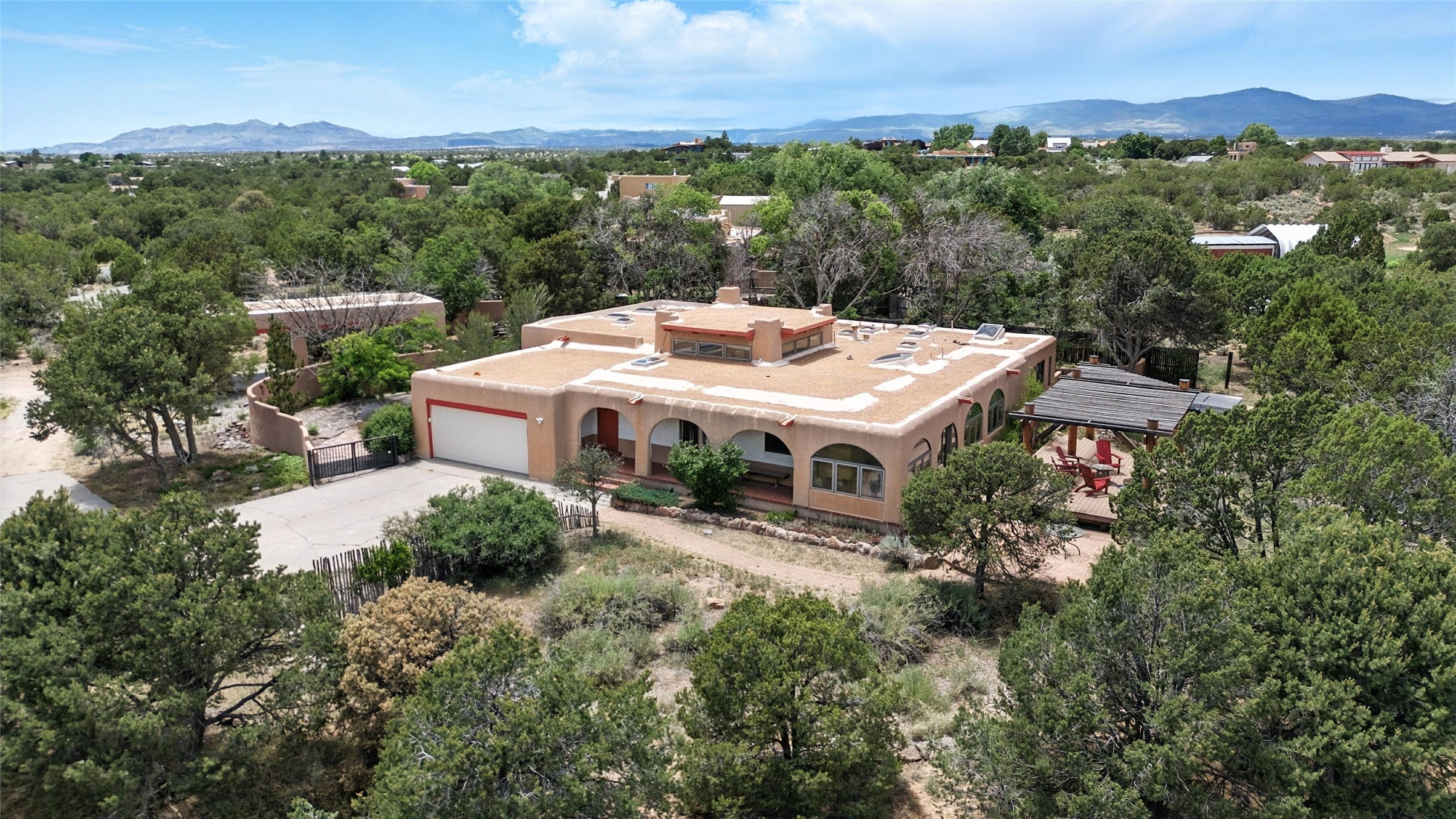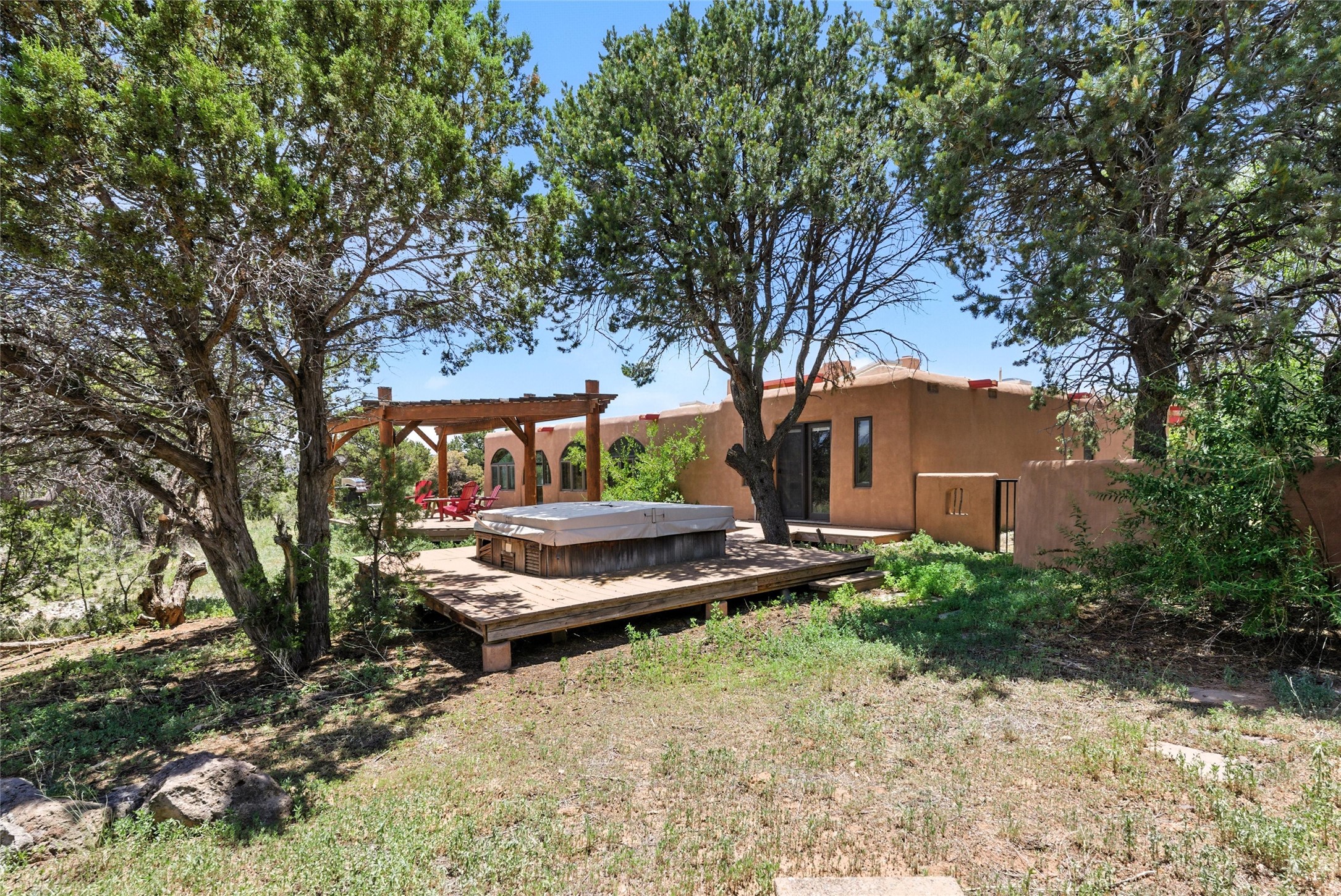 Tucked away on 2.18 peaceful, horse-zoned acres in the heart of White Rock, 123 La Senda is more than a home--it's a private retreat designed for those who value beauty, space, and connection to the land. With graceful portals wrapping three sides, lush gardens, and a tranquil backyard pond, this residence invites you to slow down and savor every season. Beyond the adobe-walled yard, native pion and juniper trees stretch across the landscape, and equine trails wind through the neighborhood--perfect for morning rides, afternoon hikes, or sunset strolls under open skies.A composite-decked pergola creates a shaded outdoor lounge ideal for entertaining or unwinding in the fresh air. Whether dining alfresco or soaking in the hot tub, the outdoor living experience is both refined and serene.Inside, over 3,200 square feet of thoughtfully designed space showcases vaulted rough-hewn viga ceilings , 12 skylights, a classic kiva fireplace, and handcrafted bancos and nichos. Fresh paint in the common areas, new carpet, tile floors, and wood-framed windows enhance the sense of comfort and quality throughout.The custom kitchen features Brookhaven cabinetry, Bosch wall oven and microwave, Wolf 6-burner range, beverage fridge, dual pantries, two islands, and a matching tiled table. A bright sunroom offers additional space to relax year-round and a great greenhouse.The spacious primary suite includes private portal access, generous closet space, and a five-piece bath with jetted tub and dual-head walk-in shower beneath a skylight. Built-ins throughout the home include window seats and a curved living room couch that stays with the home--along with the spa-style hot tub.Additional highlights include a newer septic tank (installed in 2021), a two-car garage, detached RV carport, and direct access to neighborhood trails. Blending timeless style with modern comfort, 123 La Senda is a rare offering in one of White Rock's most peaceful and sought-after settings.