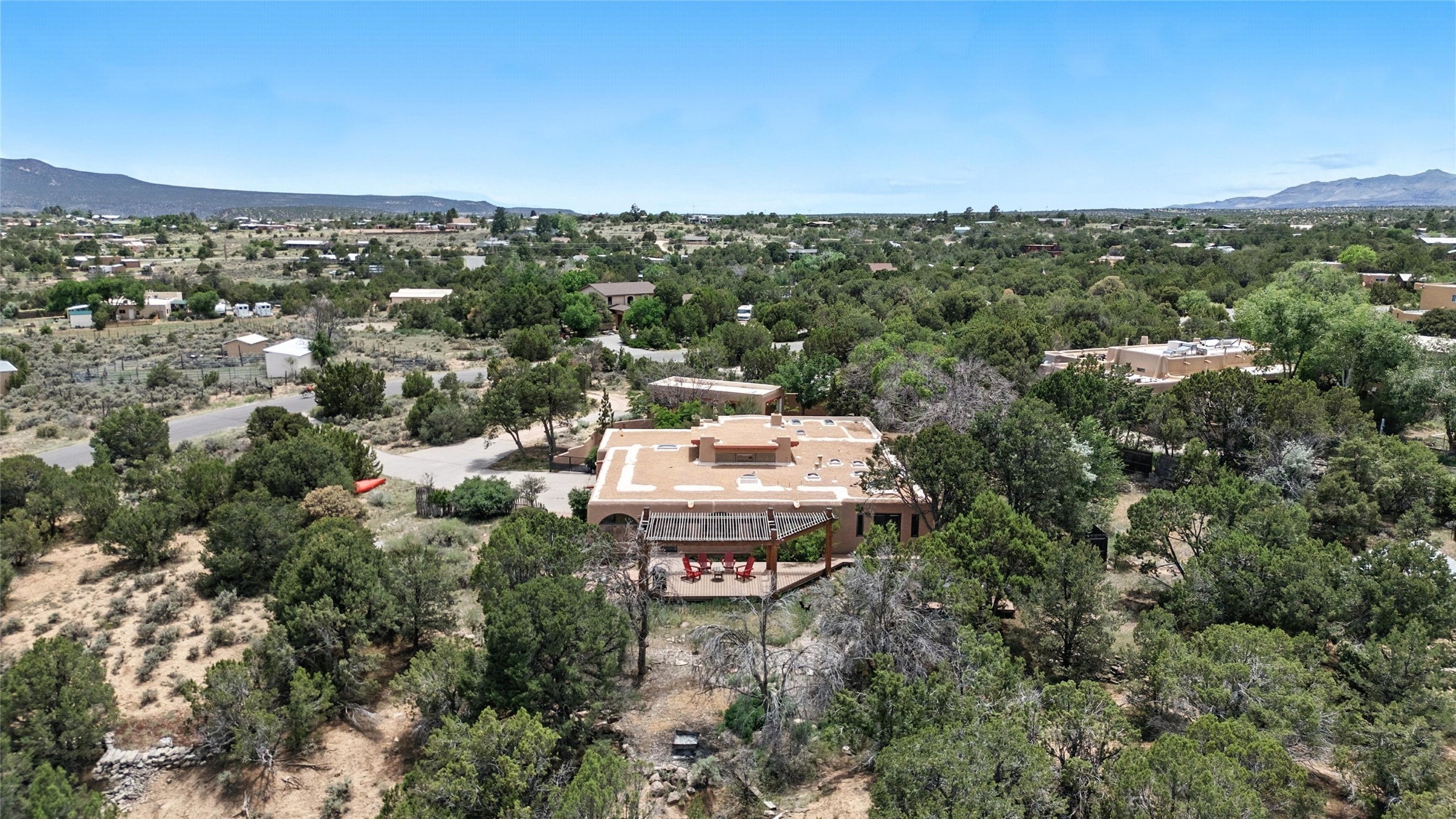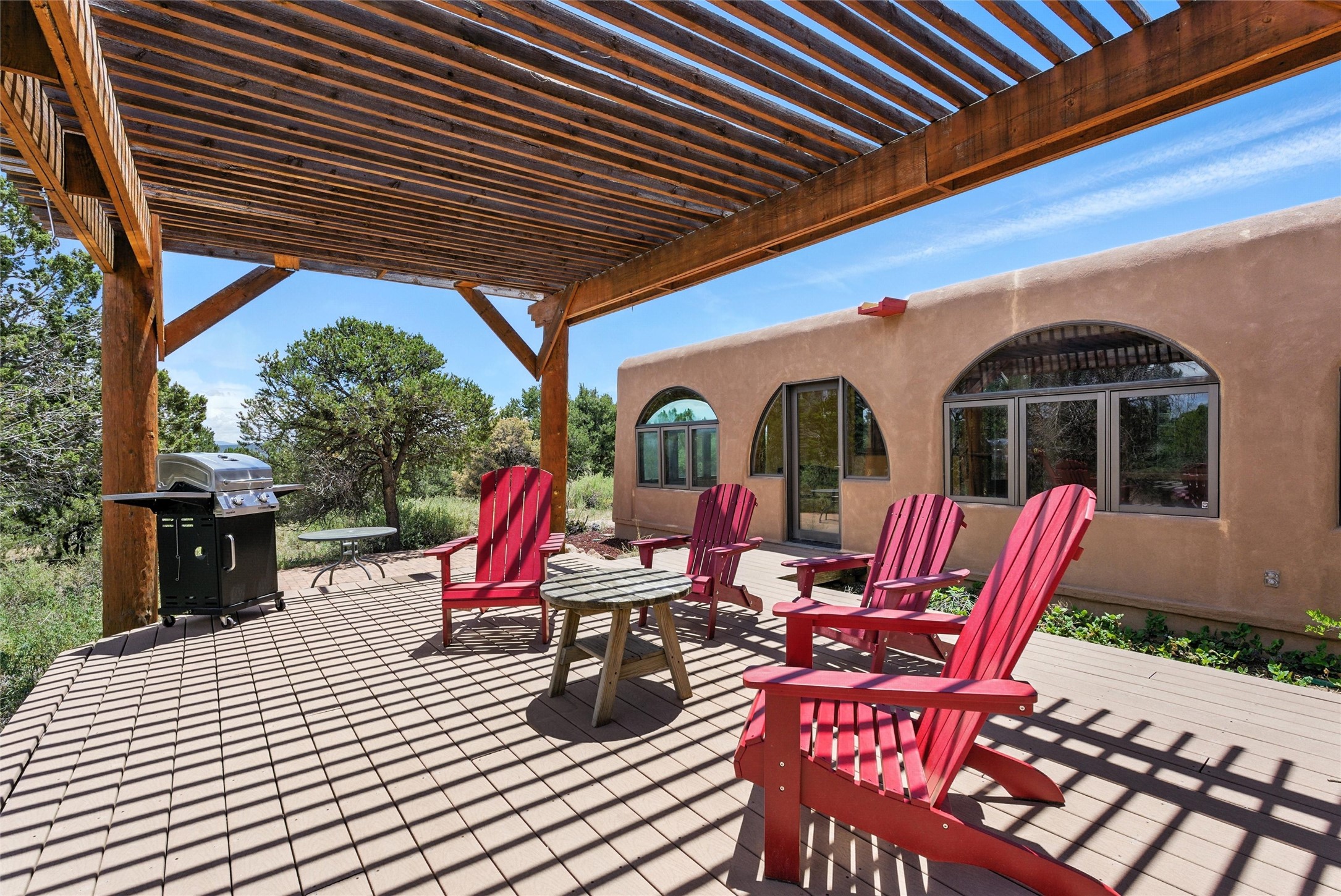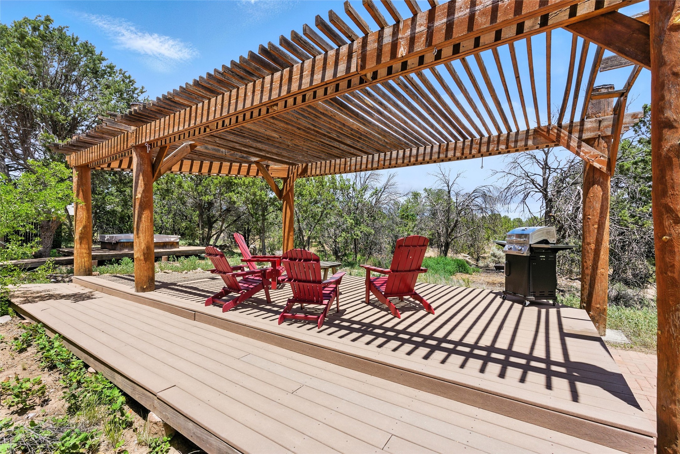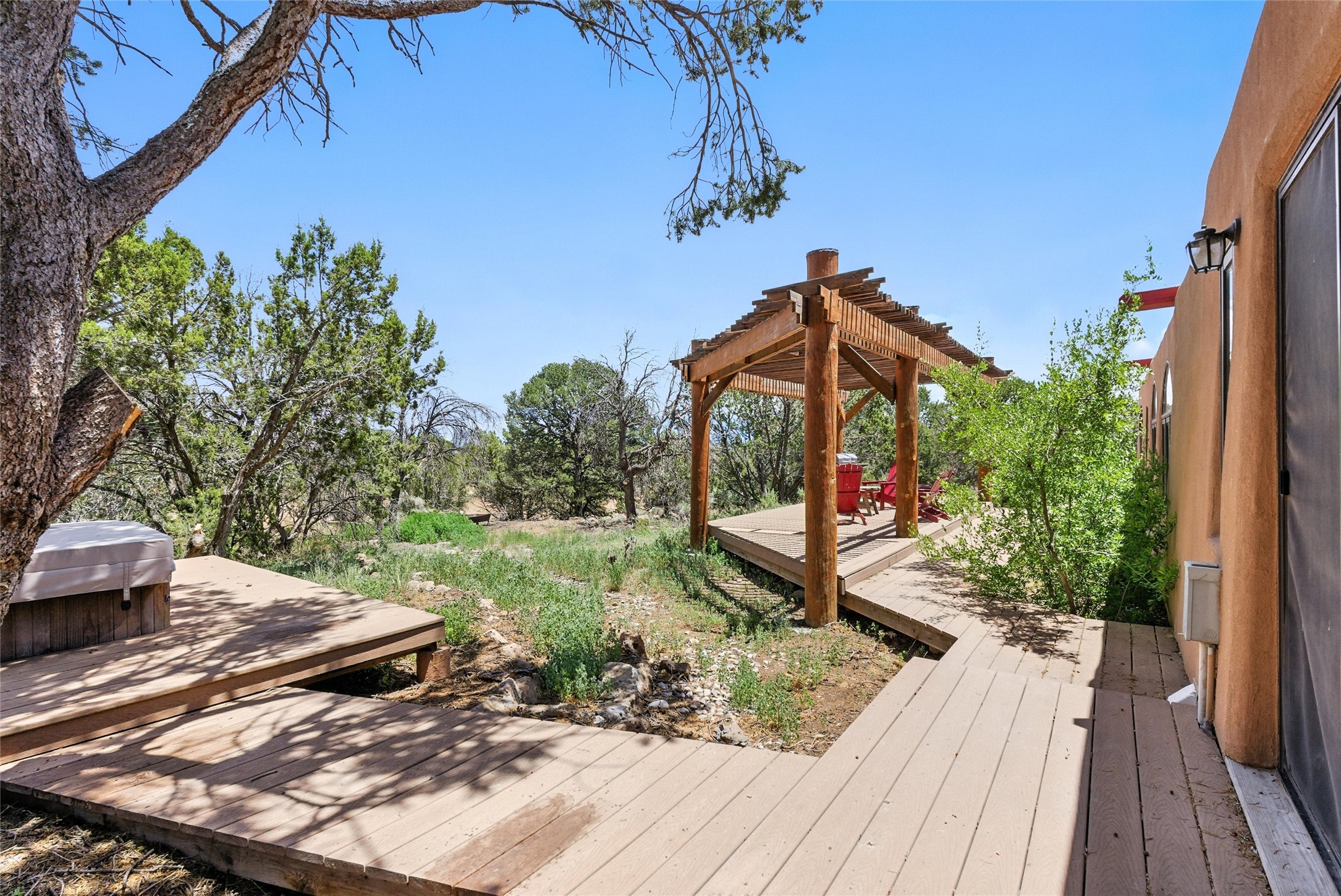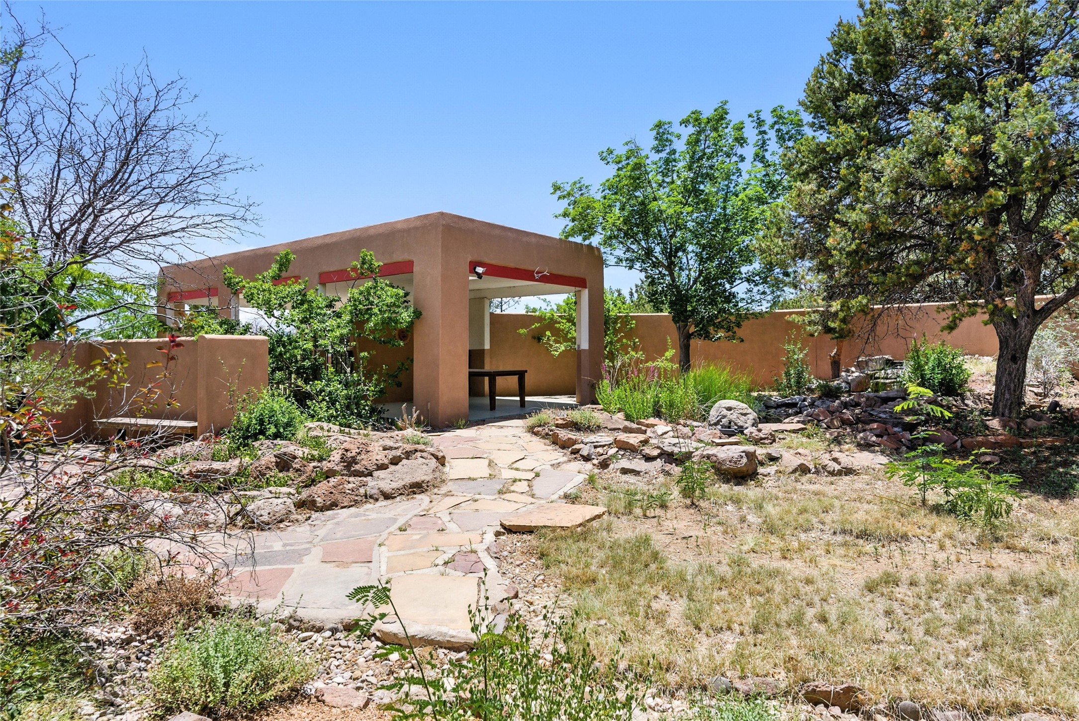 Tucked away on 2.18 peaceful, horse-zoned acres in the heart of White Rock, 123 La Senda is more than a home--it's a private retreat designed for those who value beauty, space, and connection to the land. With graceful portals wrapping three sides, lush gardens, and a tranquil backyard pond, this residence invites you to slow down and savor every season. Beyond the adobe-walled yard, native pion and juniper trees stretch across the landscape, and equine trails wind through the neighborhood--perfect for morning rides, afternoon hikes, or sunset strolls under open skies.A composite-decked pergola creates a shaded outdoor lounge ideal for entertaining or unwinding in the fresh air. Whether dining alfresco or soaking in the hot tub, the outdoor living experience is both refined and serene.Inside, over 3,200 square feet of thoughtfully designed space showcases vaulted rough-hewn viga ceilings , 12 skylights, a classic kiva fireplace, and handcrafted bancos and nichos. Fresh paint in the common areas, new carpet, tile floors, and wood-framed windows enhance the sense of comfort and quality throughout.The custom kitchen features Brookhaven cabinetry, Bosch wall oven and microwave, Wolf 6-burner range, beverage fridge, dual pantries, two islands, and a matching tiled table. A bright sunroom offers additional space to relax year-round and a great greenhouse.The spacious primary suite includes private portal access, generous closet space, and a five-piece bath with jetted tub and dual-head walk-in shower beneath a skylight. Built-ins throughout the home include window seats and a curved living room couch that stays with the home--along with the spa-style hot tub.Additional highlights include a newer septic tank (installed in 2021), a two-car garage, detached RV carport, and direct access to neighborhood trails. Blending timeless style with modern comfort, 123 La Senda is a rare offering in one of White Rock's most peaceful and sought-after settings.