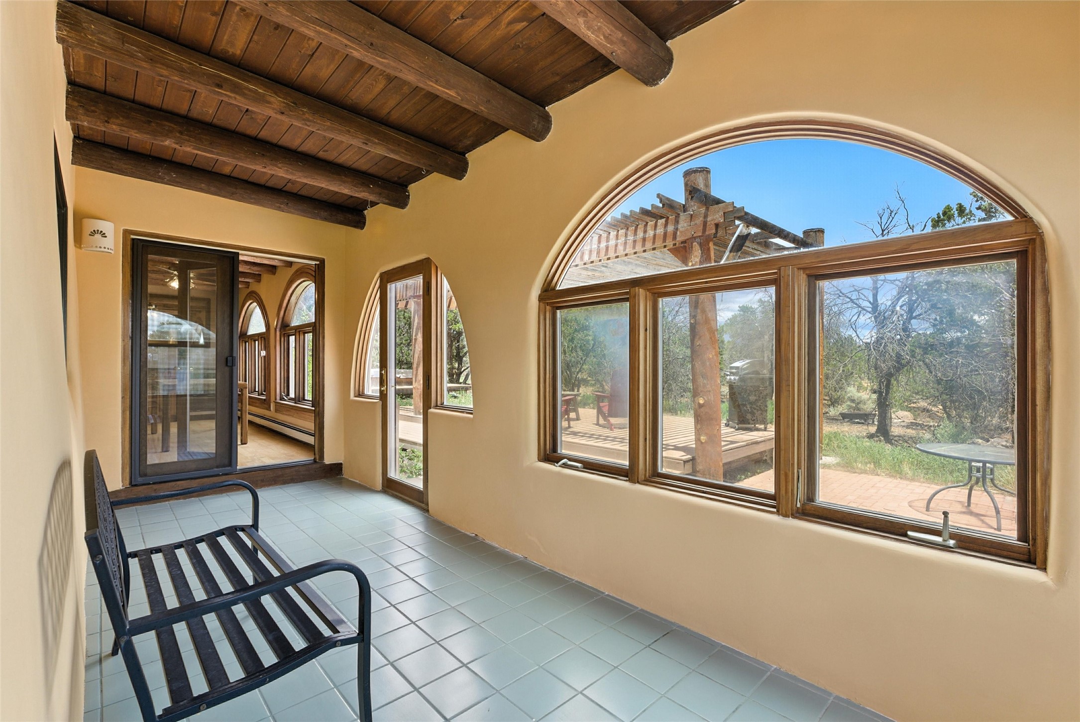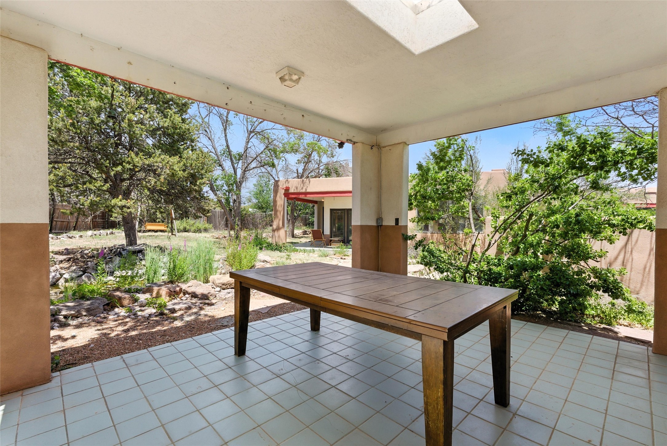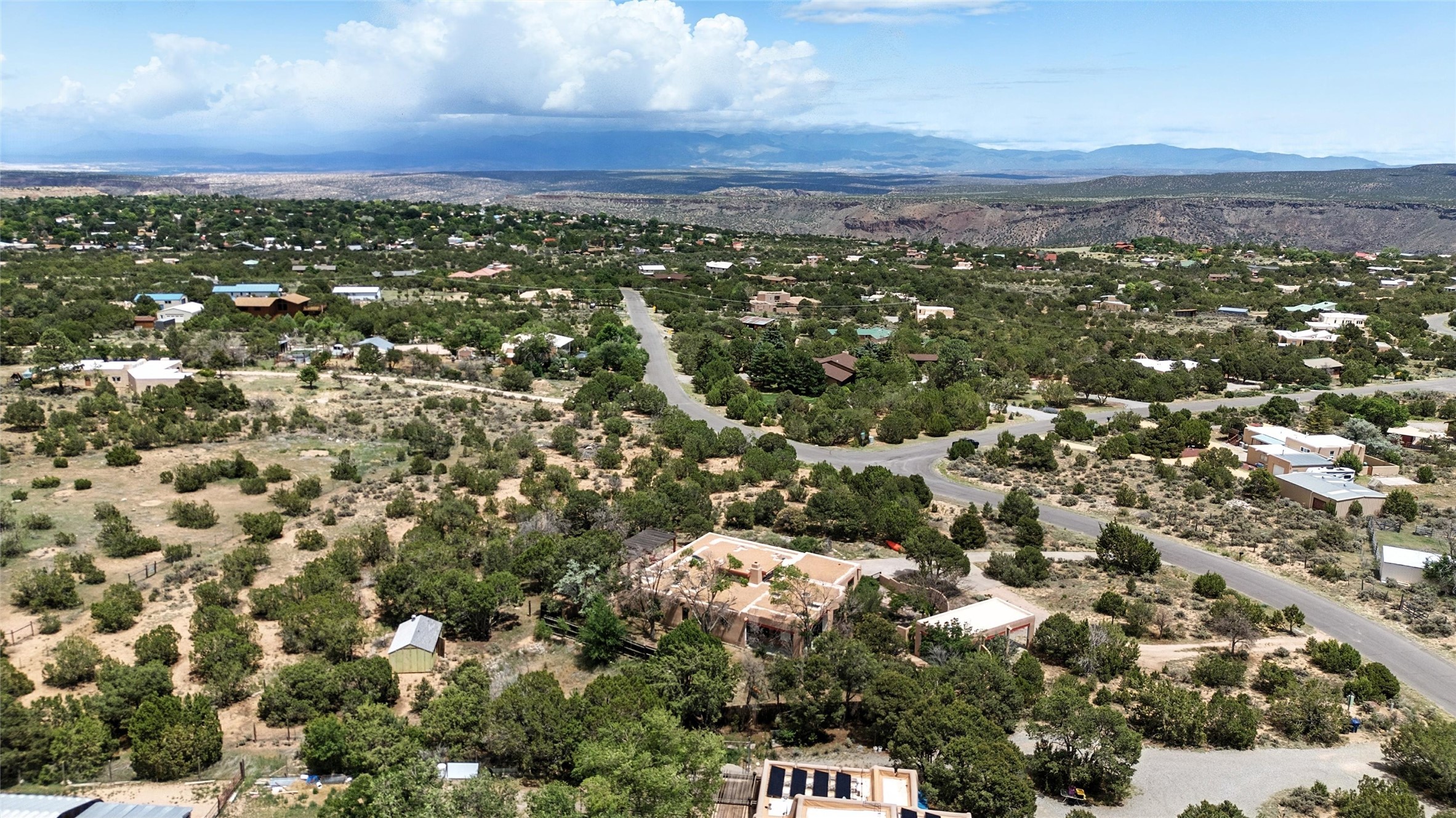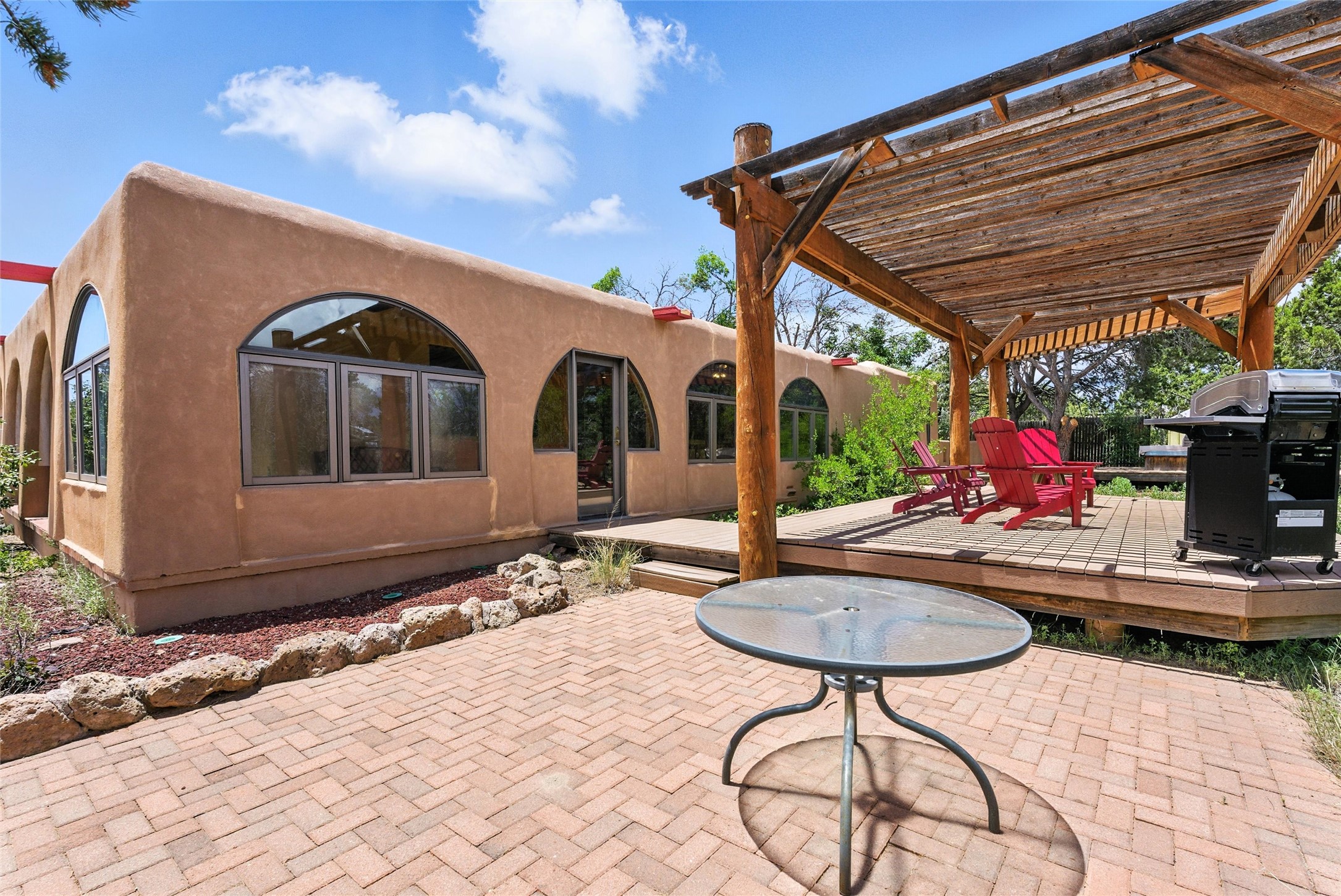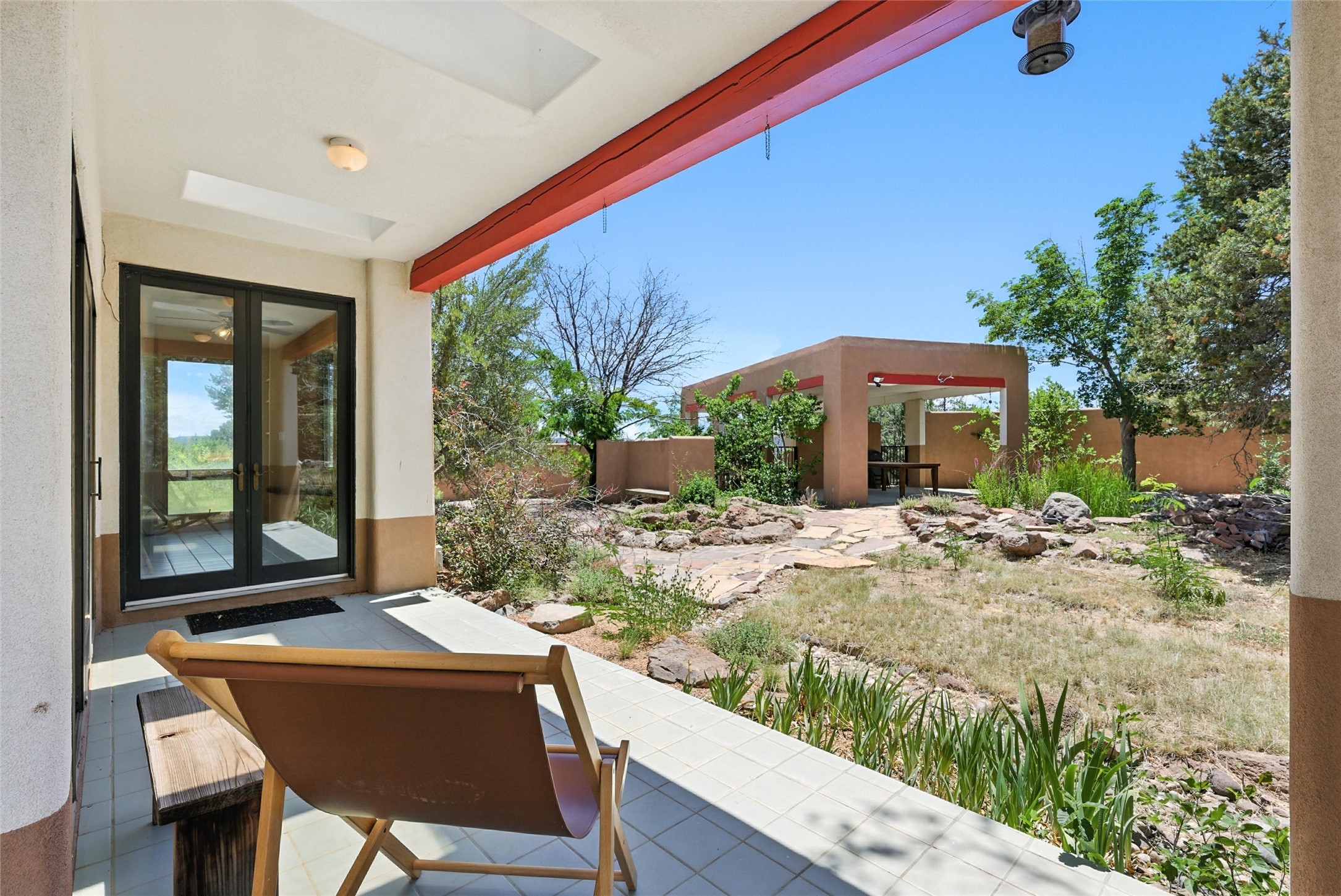 Tucked away on 2.18 peaceful, horse-zoned acres in the heart of White Rock, 123 La Senda is more than a home--it's a private retreat designed for those who value beauty, space, and connection to the land. With graceful portals wrapping three sides, lush gardens, and a tranquil backyard pond, this residence invites you to slow down and savor every season. Beyond the adobe-walled yard, native pion and juniper trees stretch across the landscape, and equine trails wind through the neighborhood--perfect for morning rides, afternoon hikes, or sunset strolls under open skies.A composite-decked pergola creates a shaded outdoor lounge ideal for entertaining or unwinding in the fresh air. Whether dining alfresco or soaking in the hot tub, the outdoor living experience is both refined and serene.Inside, over 3,200 square feet of thoughtfully designed space showcases vaulted rough-hewn viga ceilings , 12 skylights, a classic kiva fireplace, and handcrafted bancos and nichos. Fresh paint in the common areas, new carpet, tile floors, and wood-framed windows enhance the sense of comfort and quality throughout.The custom kitchen features Brookhaven cabinetry, Bosch wall oven and microwave, Wolf 6-burner range, beverage fridge, dual pantries, two islands, and a matching tiled table. A bright sunroom offers additional space to relax year-round and a great greenhouse.The spacious primary suite includes private portal access, generous closet space, and a five-piece bath with jetted tub and dual-head walk-in shower beneath a skylight. Built-ins throughout the home include window seats and a curved living room couch that stays with the home--along with the spa-style hot tub.Additional highlights include a newer septic tank (installed in 2021), a two-car garage, detached RV carport, and direct access to neighborhood trails. Blending timeless style with modern comfort, 123 La Senda is a rare offering in one of White Rock's most peaceful and sought-after settings.