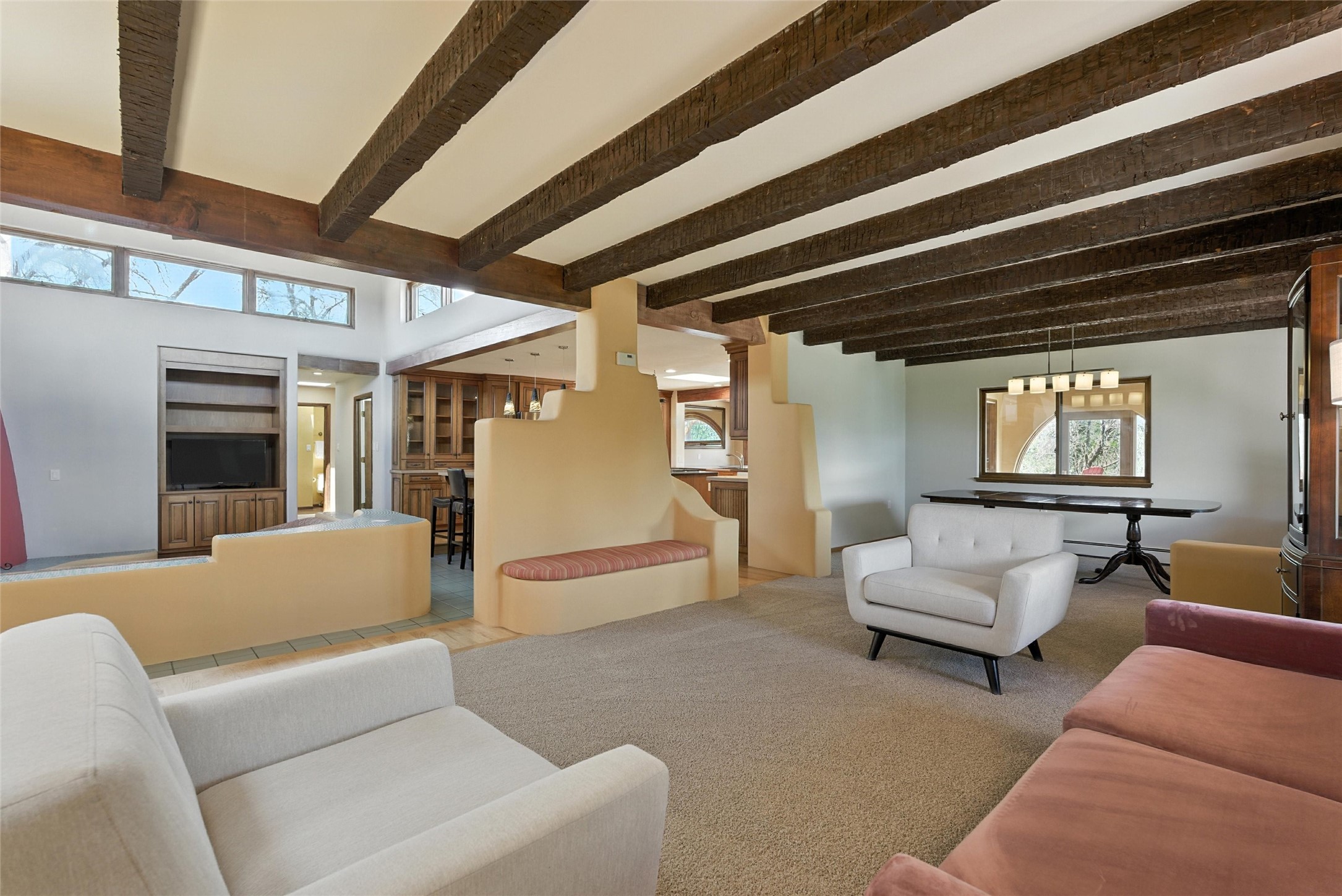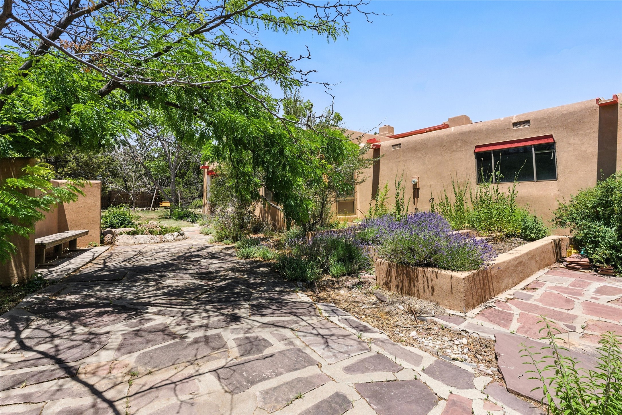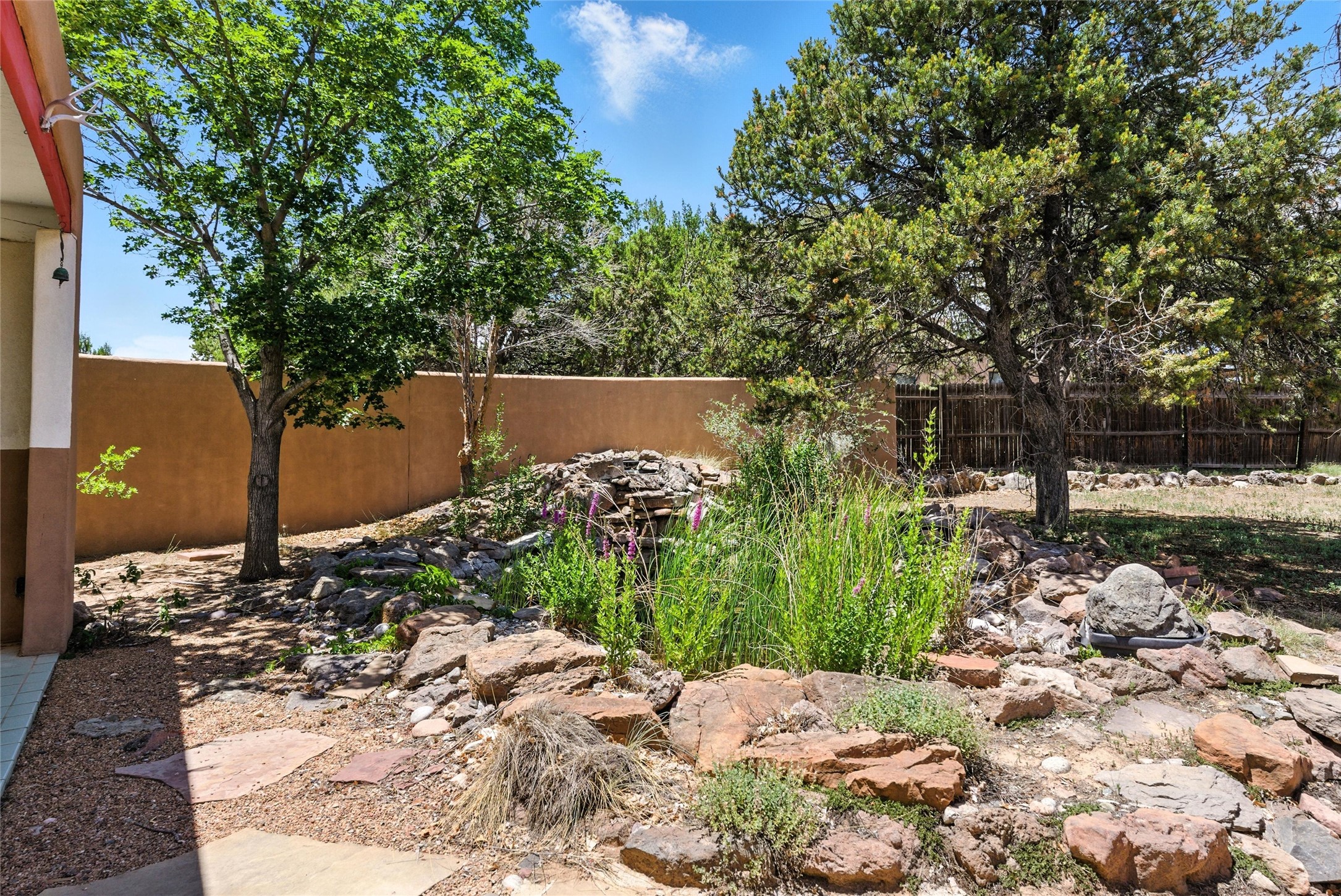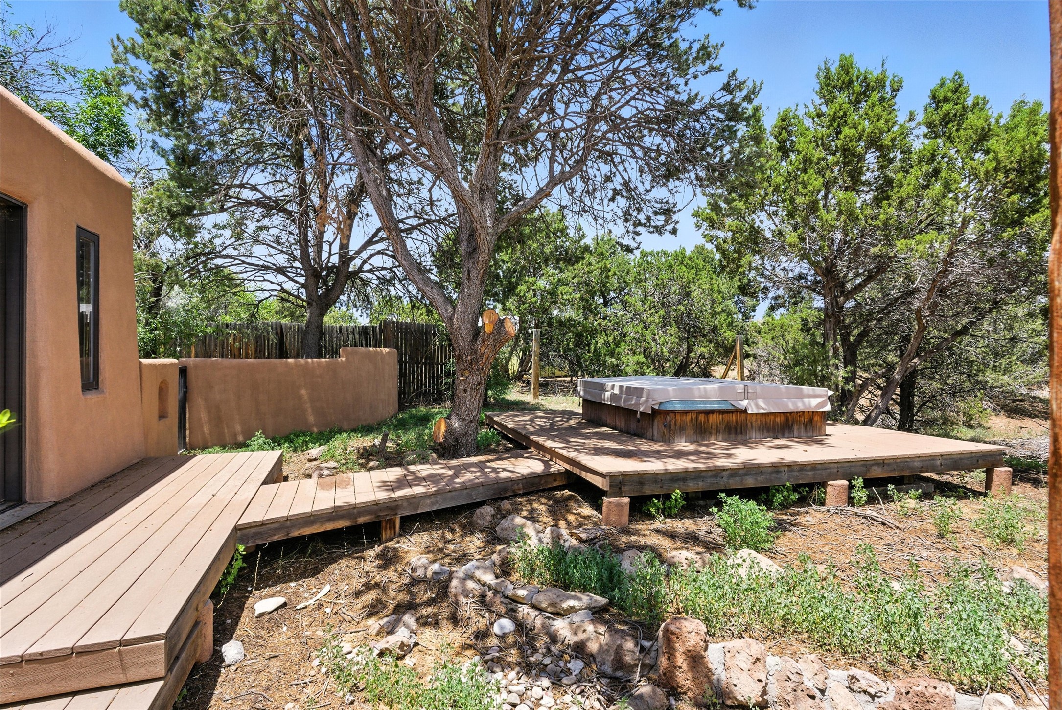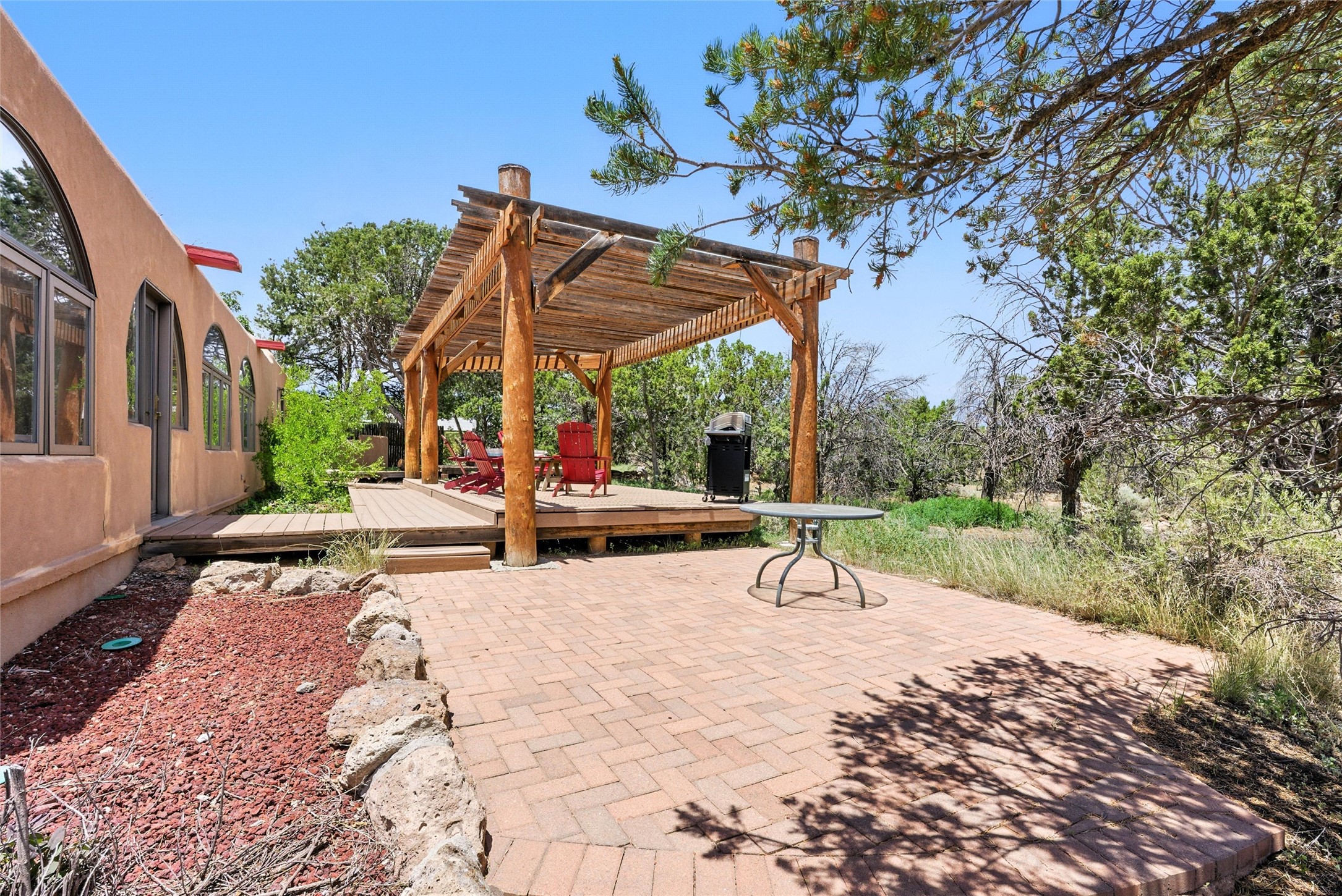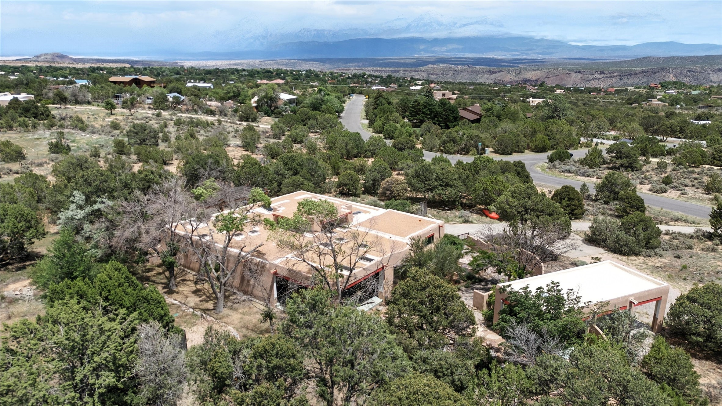Tucked away on 2.18 peaceful, horse-zoned acres in the heart of White Rock, 123 La Senda is more than a home--it's a private retreat designed for those who value beauty, space, and connection to the land. With graceful portals wrapping three sides, lush gardens, and a tranquil backyard pond, this residence invites you to slow down and savor every season. Beyond the adobe-walled yard, native pion and juniper trees stretch across the landscape, and equine trails wind through the neighborhood--perfect for morning rides, afternoon hikes, or sunset strolls under open skies.A composite-decked pergola creates a shaded outdoor lounge ideal for entertaining or unwinding in the fresh air. Whether dining alfresco or soaking in the hot tub, the outdoor living experience is both refined and serene.Inside, over 3,200 square feet of thoughtfully designed space showcases vaulted rough-hewn viga ceilings , 12 skylights, a classic kiva fireplace, and handcrafted bancos and nichos. Fresh paint in the common areas, new carpet, tile floors, and wood-framed windows enhance the sense of comfort and quality throughout.The custom kitchen features Brookhaven cabinetry, Bosch wall oven and microwave, Wolf 6-burner range, beverage fridge, dual pantries, two islands, and a matching tiled table. A bright sunroom offers additional space to relax year-round and a great greenhouse.The spacious primary suite includes private portal access, generous closet space, and a five-piece bath with jetted tub and dual-head walk-in shower beneath a skylight. Built-ins throughout the home include window seats and a curved living room couch that stays with the home--along with the spa-style hot tub.Additional highlights include a newer septic tank (installed in 2021), a two-car garage, detached RV carport, and direct access to neighborhood trails. Blending timeless style with modern comfort, 123 La Senda is a rare offering in one of White Rock's most peaceful and sought-after settings.