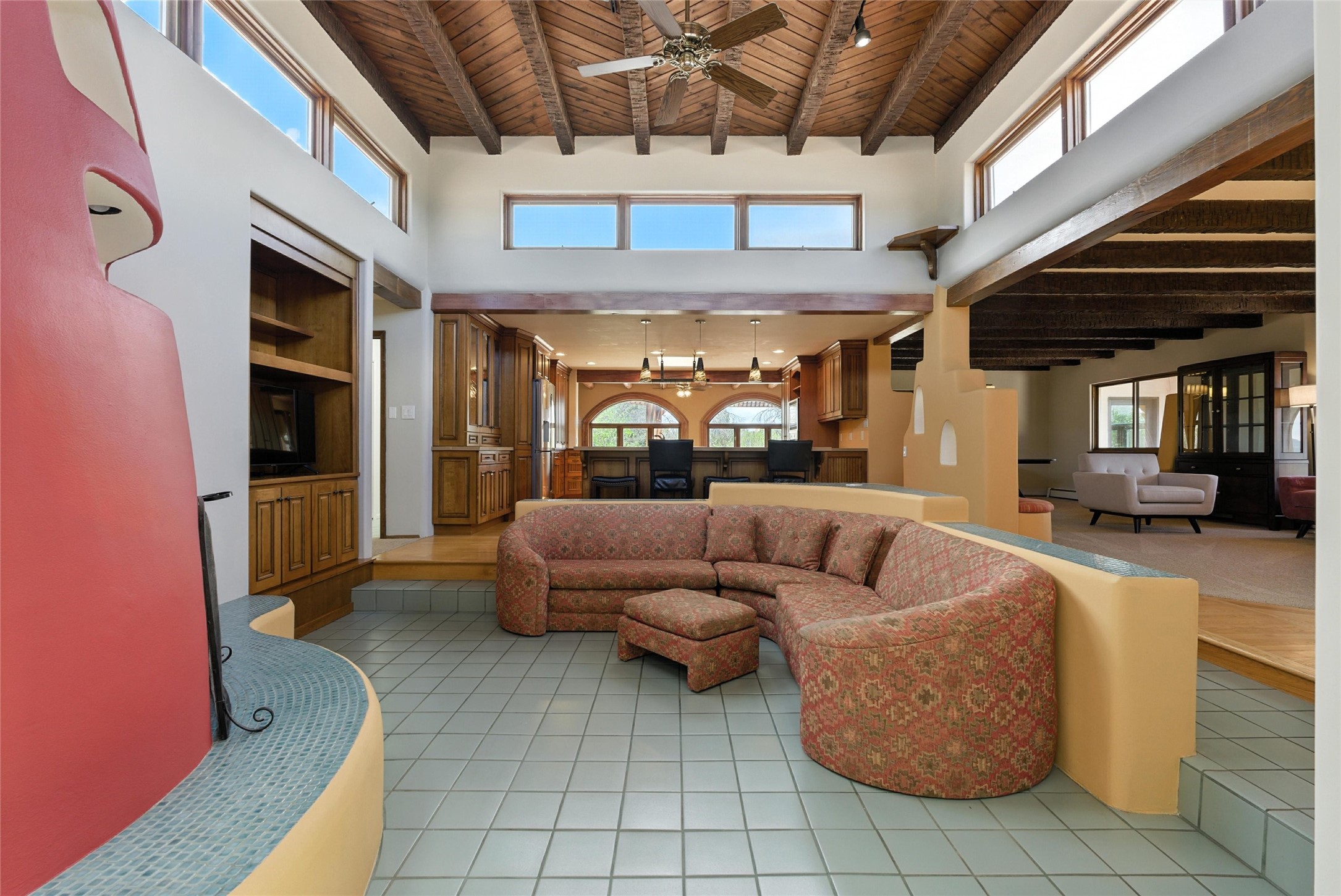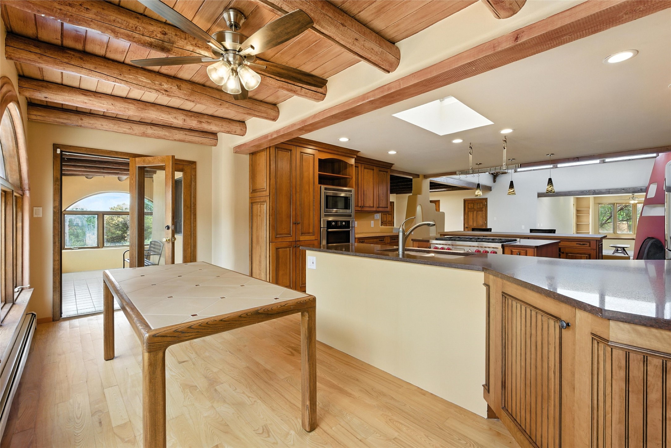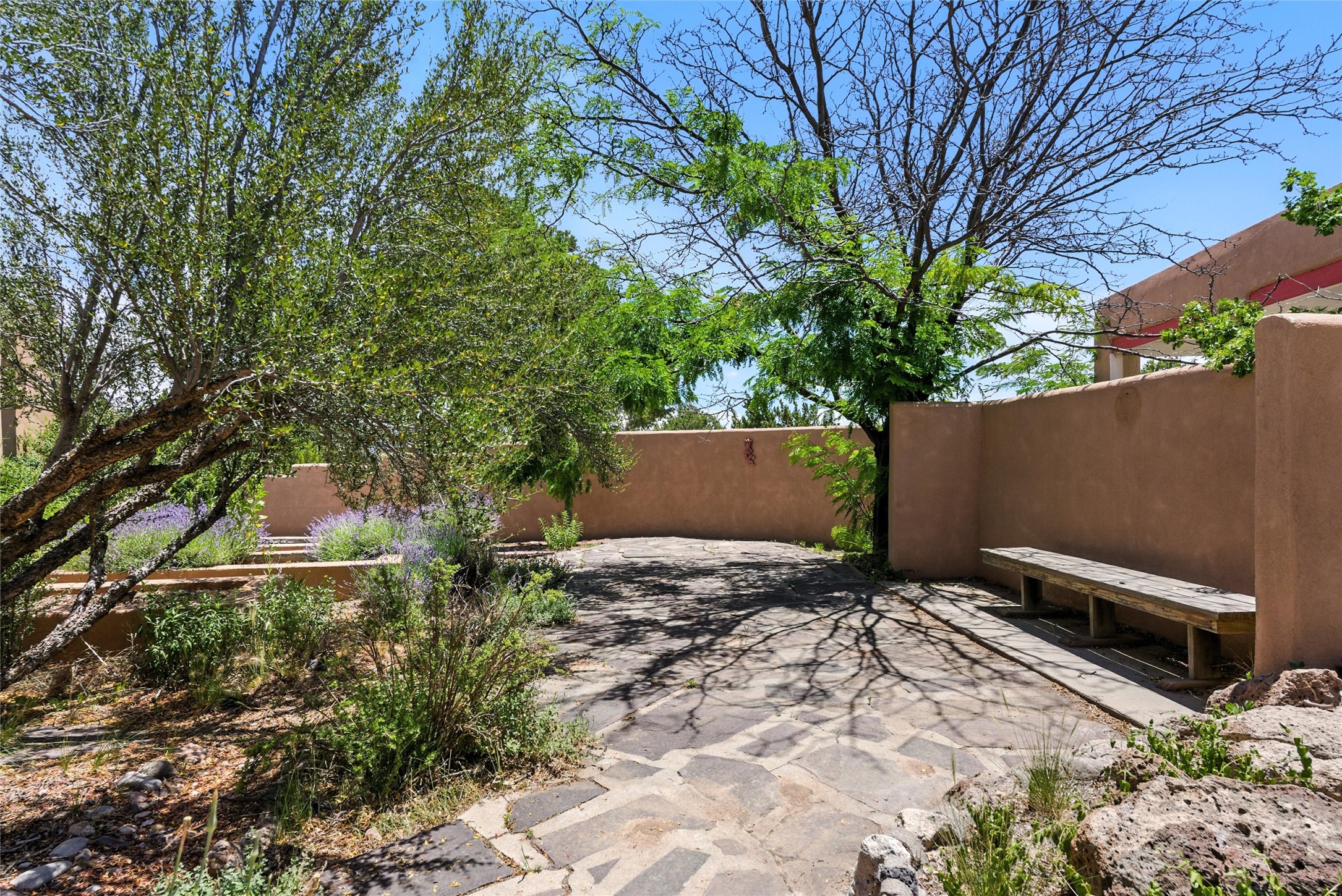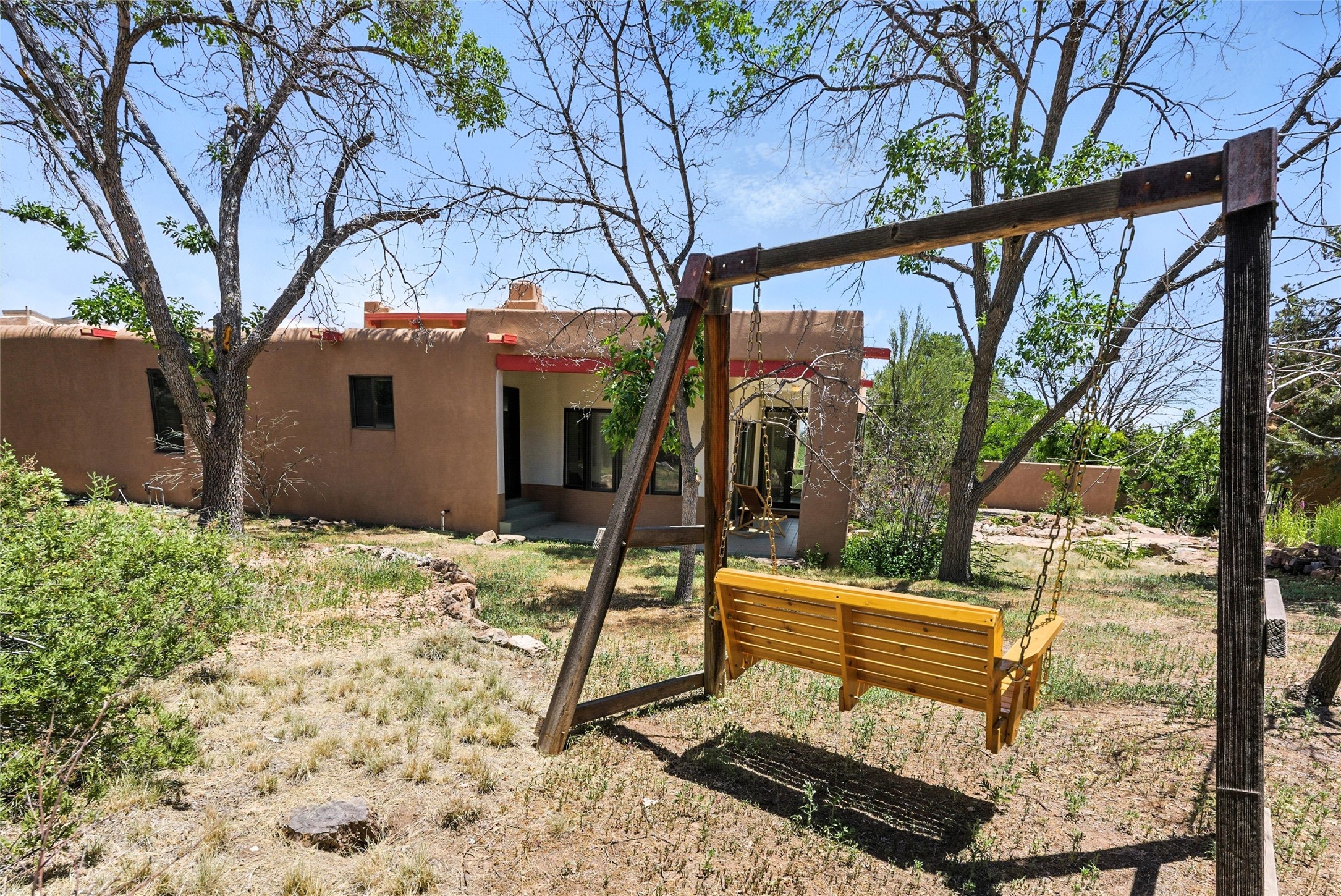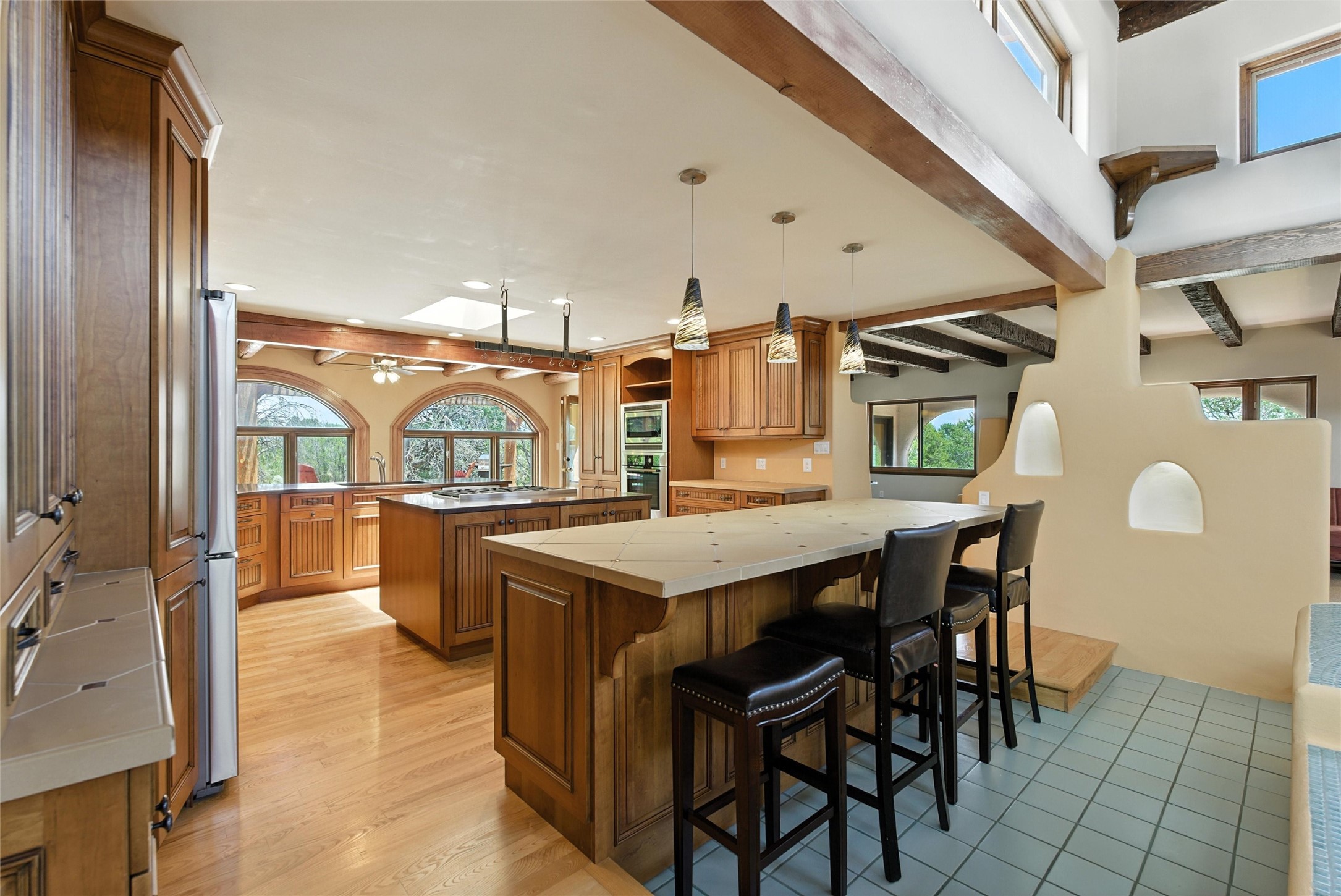 Tucked away on 2.18 peaceful, horse-zoned acres in the heart of White Rock, 123 La Senda is more than a home--it's a private retreat designed for those who value beauty, space, and connection to the land. With graceful portals wrapping three sides, lush gardens, and a tranquil backyard pond, this residence invites you to slow down and savor every season. Beyond the adobe-walled yard, native pion and juniper trees stretch across the landscape, and equine trails wind through the neighborhood--perfect for morning rides, afternoon hikes, or sunset strolls under open skies.A composite-decked pergola creates a shaded outdoor lounge ideal for entertaining or unwinding in the fresh air. Whether dining alfresco or soaking in the hot tub, the outdoor living experience is both refined and serene.Inside, over 3,200 square feet of thoughtfully designed space showcases vaulted rough-hewn viga ceilings , 12 skylights, a classic kiva fireplace, and handcrafted bancos and nichos. Fresh paint in the common areas, new carpet, tile floors, and wood-framed windows enhance the sense of comfort and quality throughout.The custom kitchen features Brookhaven cabinetry, Bosch wall oven and microwave, Wolf 6-burner range, beverage fridge, dual pantries, two islands, and a matching tiled table. A bright sunroom offers additional space to relax year-round and a great greenhouse.The spacious primary suite includes private portal access, generous closet space, and a five-piece bath with jetted tub and dual-head walk-in shower beneath a skylight. Built-ins throughout the home include window seats and a curved living room couch that stays with the home--along with the spa-style hot tub.Additional highlights include a newer septic tank (installed in 2021), a two-car garage, detached RV carport, and direct access to neighborhood trails. Blending timeless style with modern comfort, 123 La Senda is a rare offering in one of White Rock's most peaceful and sought-after settings.