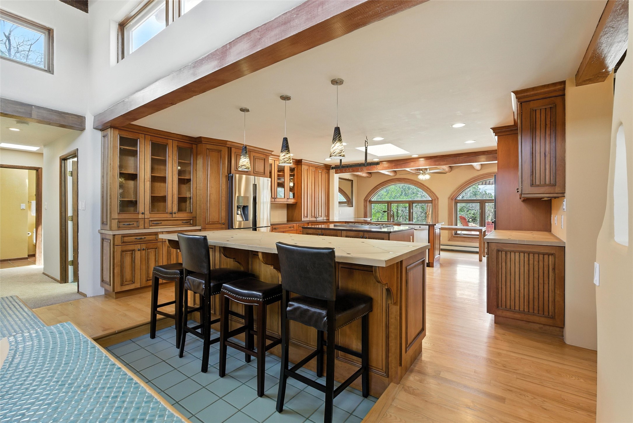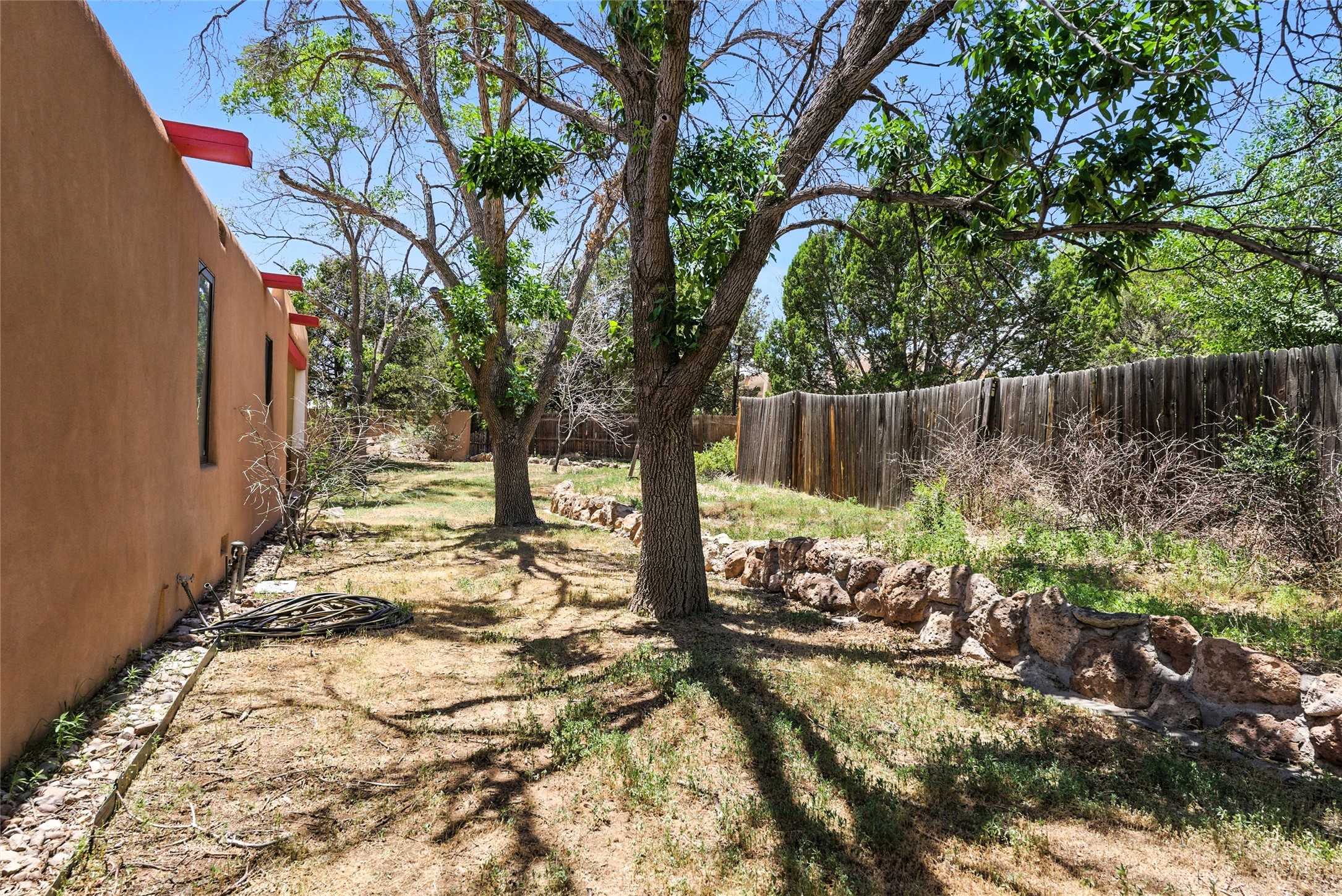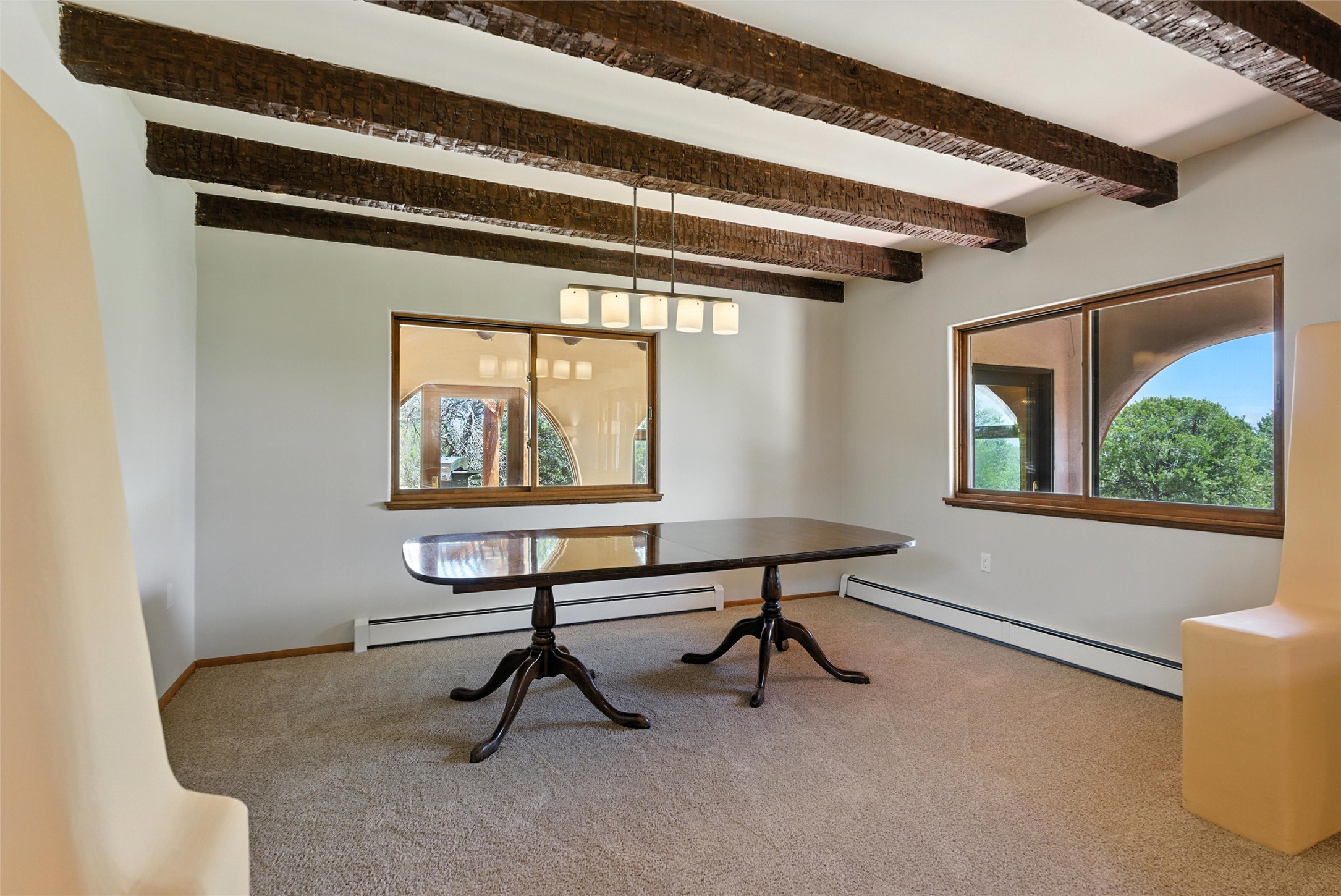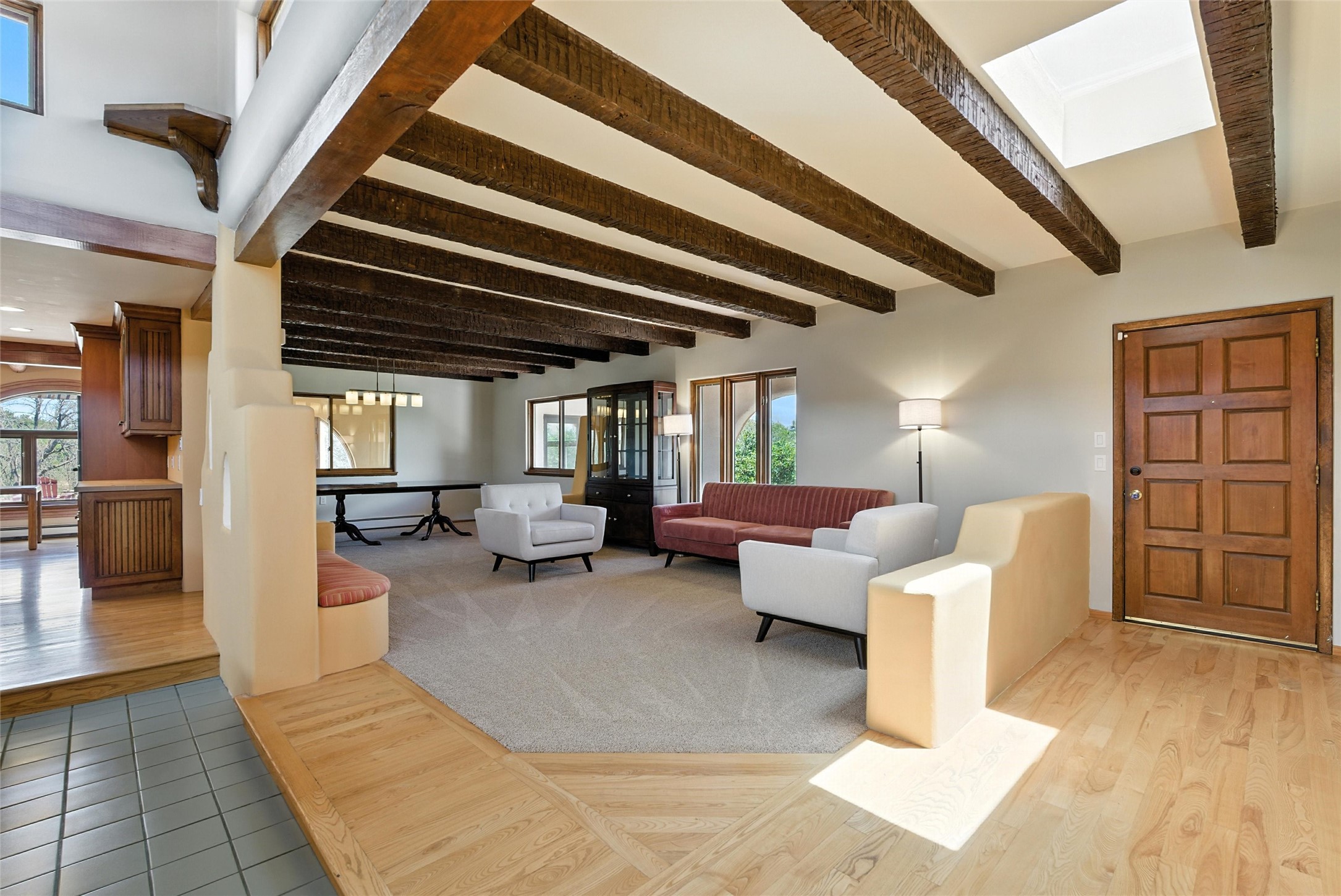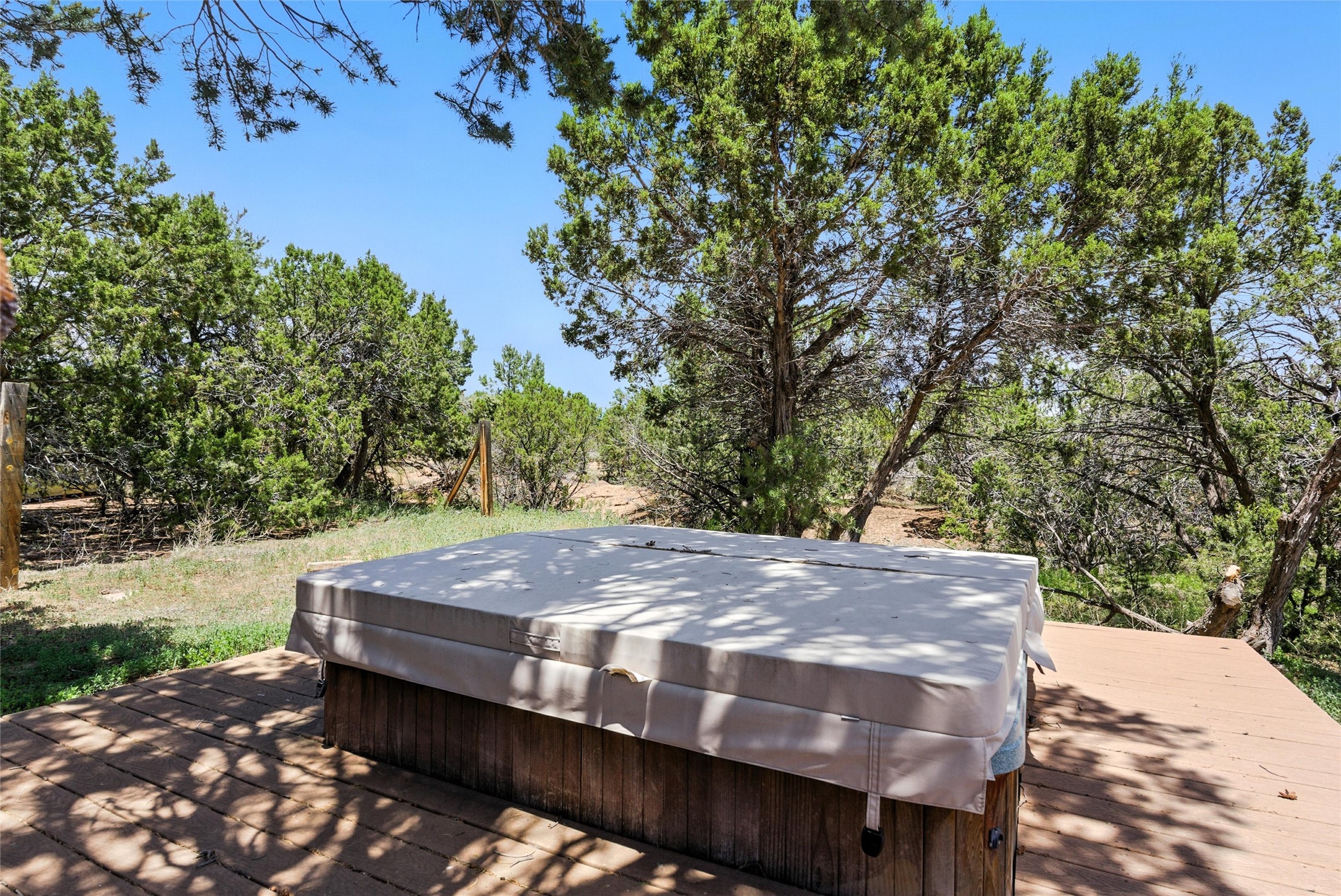 Tucked away on 2.18 peaceful, horse-zoned acres in the heart of White Rock, 123 La Senda is more than a home--it's a private retreat designed for those who value beauty, space, and connection to the land. With graceful portals wrapping three sides, lush gardens, and a tranquil backyard pond, this residence invites you to slow down and savor every season. Beyond the adobe-walled yard, native pion and juniper trees stretch across the landscape, and equine trails wind through the neighborhood--perfect for morning rides, afternoon hikes, or sunset strolls under open skies.A composite-decked pergola creates a shaded outdoor lounge ideal for entertaining or unwinding in the fresh air. Whether dining alfresco or soaking in the hot tub, the outdoor living experience is both refined and serene.Inside, over 3,200 square feet of thoughtfully designed space showcases vaulted rough-hewn viga ceilings , 12 skylights, a classic kiva fireplace, and handcrafted bancos and nichos. Fresh paint in the common areas, new carpet, tile floors, and wood-framed windows enhance the sense of comfort and quality throughout.The custom kitchen features Brookhaven cabinetry, Bosch wall oven and microwave, Wolf 6-burner range, beverage fridge, dual pantries, two islands, and a matching tiled table. A bright sunroom offers additional space to relax year-round and a great greenhouse.The spacious primary suite includes private portal access, generous closet space, and a five-piece bath with jetted tub and dual-head walk-in shower beneath a skylight. Built-ins throughout the home include window seats and a curved living room couch that stays with the home--along with the spa-style hot tub.Additional highlights include a newer septic tank (installed in 2021), a two-car garage, detached RV carport, and direct access to neighborhood trails. Blending timeless style with modern comfort, 123 La Senda is a rare offering in one of White Rock's most peaceful and sought-after settings.