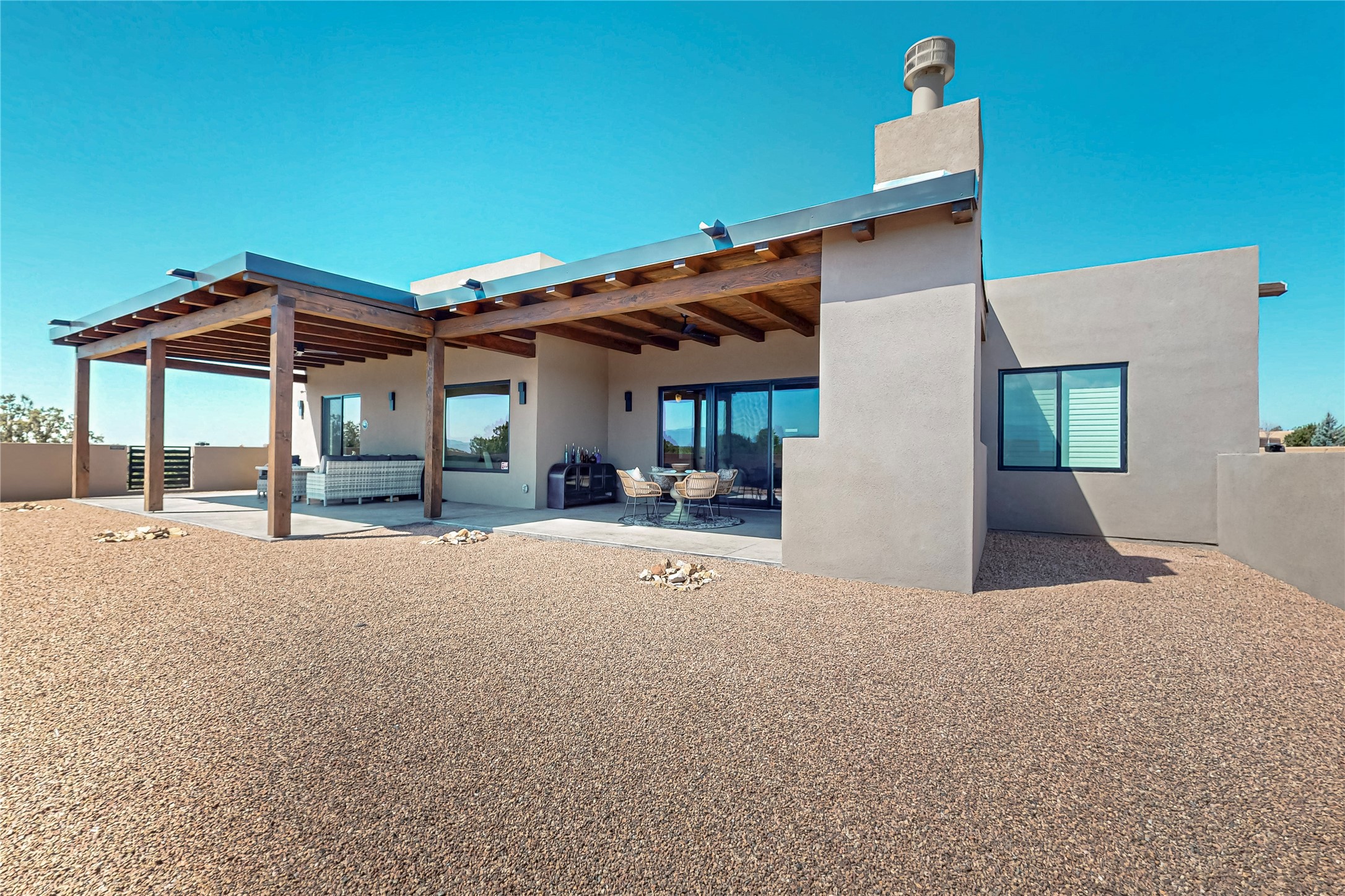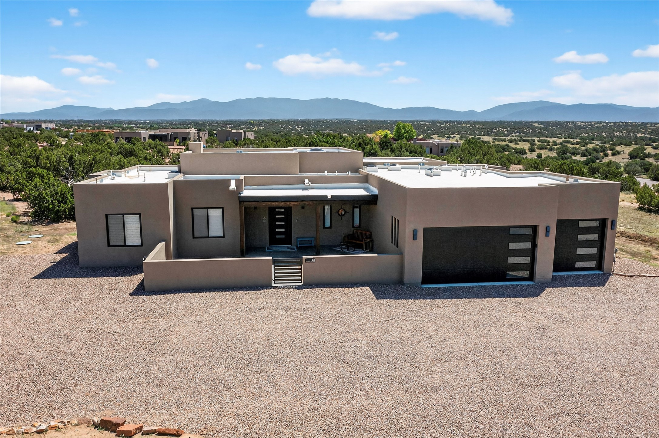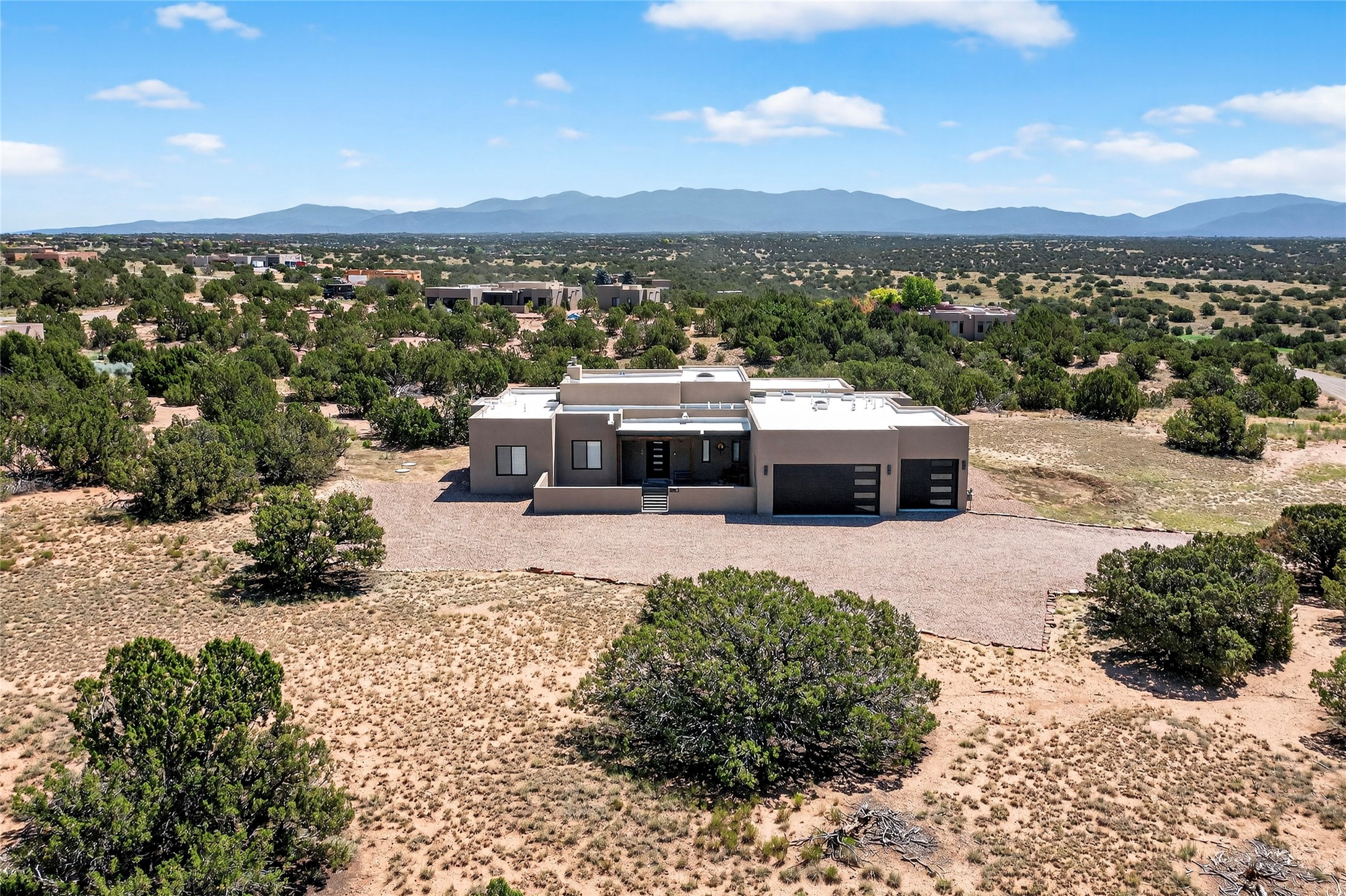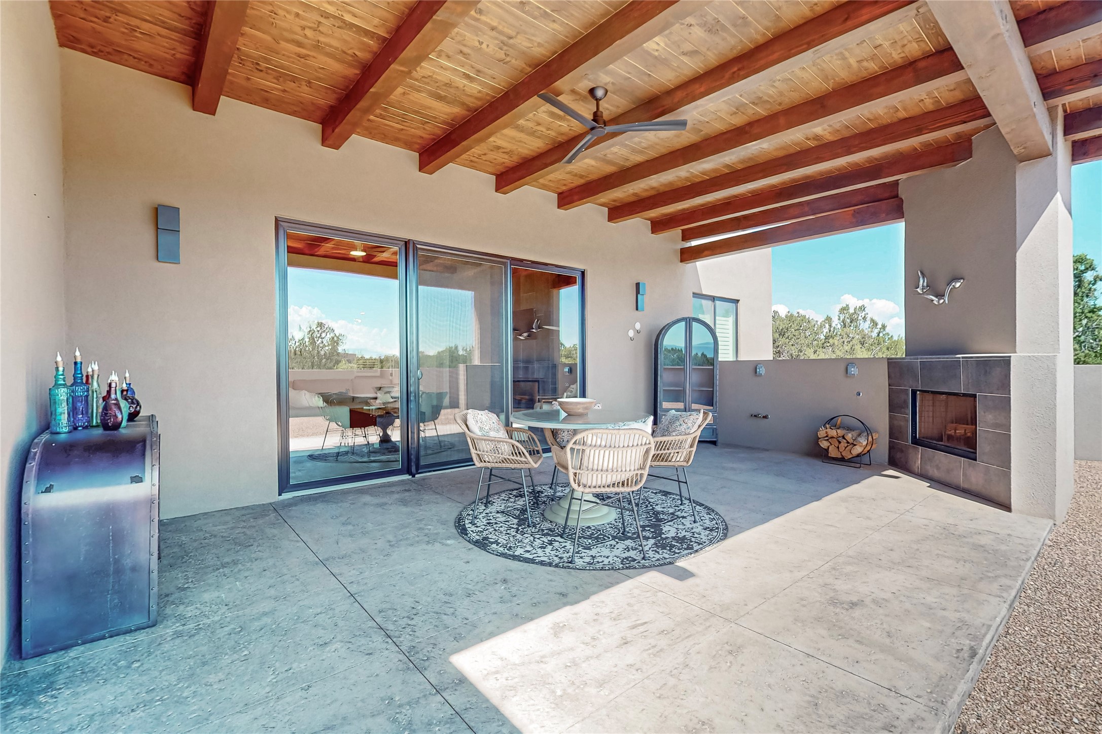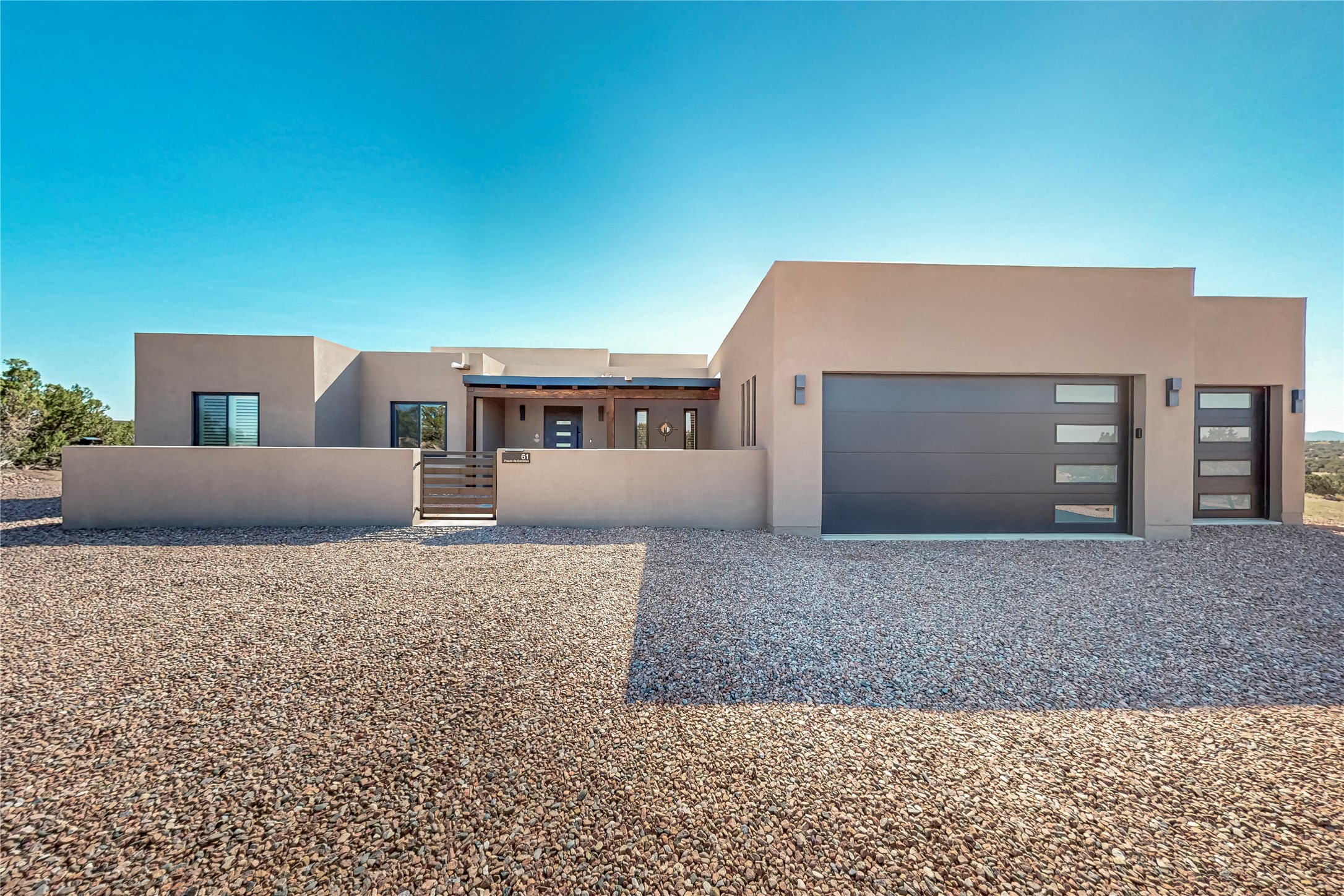 Nestled within the gated subdivision of Rancho de los Nios, this extraordinary residence offers a seamless fusion of modern elegance and timeless Southwestern charm. Resting peacefully on 4.86 acres of serene high desert landscape, the home captures breathtaking views of the Santa Fe mountains and is designed to inspire comfort, sophistication, and effortless entertaining. Inside, the home welcomes you with an atmosphere of calm luxury. A palette of beautiful gray tile, beams and fine trimmings sets a refined tone, complemented by recessed lighting, contemporary skylights, and exquisite light fixtures throughout. The spacious great room, with its tile-clad gas fireplace, invites quiet evenings or lively gatherings and flows gracefully through oversized sliding glass doors onto a covered patio and courtyard, where yet another outdoor fireplace awaits under the Santa Fe sky. The heart of the home is the chef's kitchen, a masterwork featuring ZLINE black stainless steel appliances, quartz countertops, and elegant backsplash tiling--a culinary space as functional as it is stunning. Nearby, a bonus room provides the perfect canvas for a home office, creative studio, or private retreat--whatever your heart desires. The primary suite is a sanctuary unto itself, featuring a spacious master bedroom, remote-controlled blinds, and a luxurious en suite bath with a standalone soaking tub, dual vanity sinks, a walk-in shower, and an expansive walk-in closet. The home offers three bedrooms and three bathrooms in total, all thoughtfully appointed and finished with shutters on the windows to enhance both style and privacy. Comfort and practicality meet with central heating and air conditioning, a three-car garage, and thoughtfully selected fixtures and finishes throughout. This residence is a true gem in one of Santa Fe's most coveted communities--quiet, secure, and remarkably beautiful.Come home to Rancho de los Nios, where sophistication meets serenity.