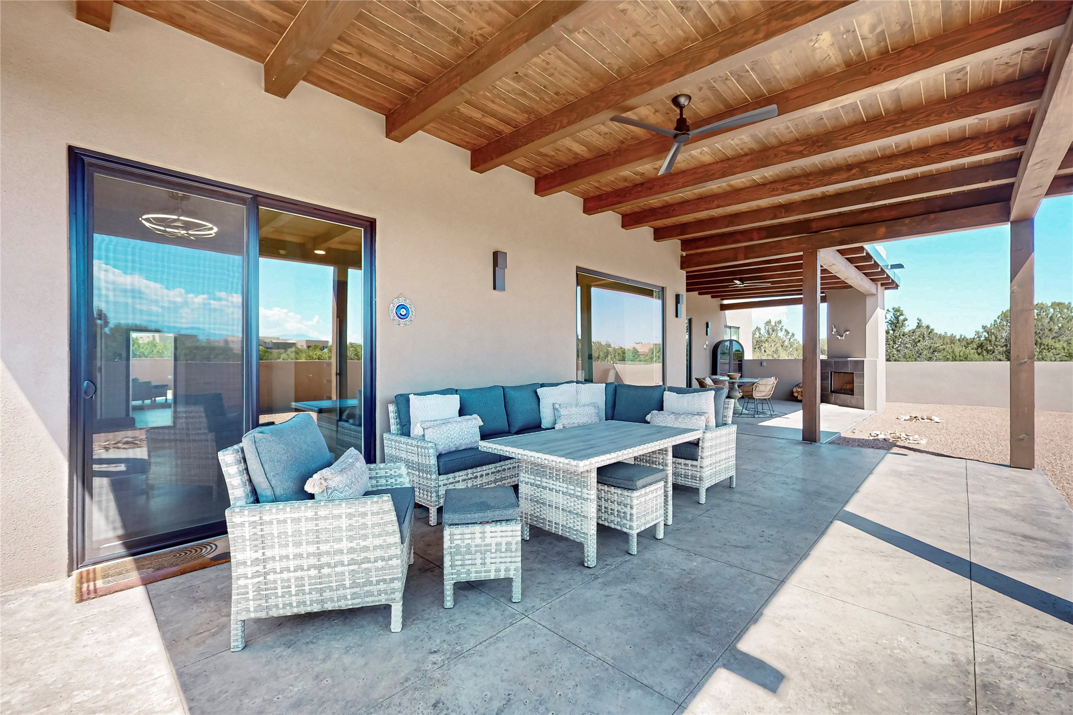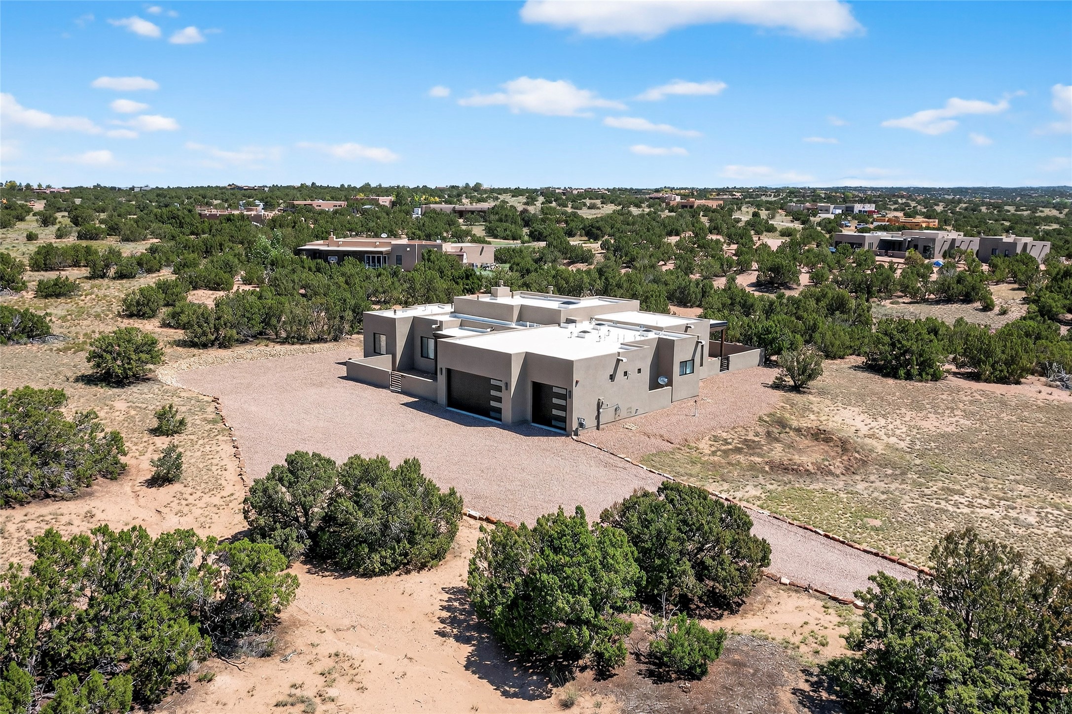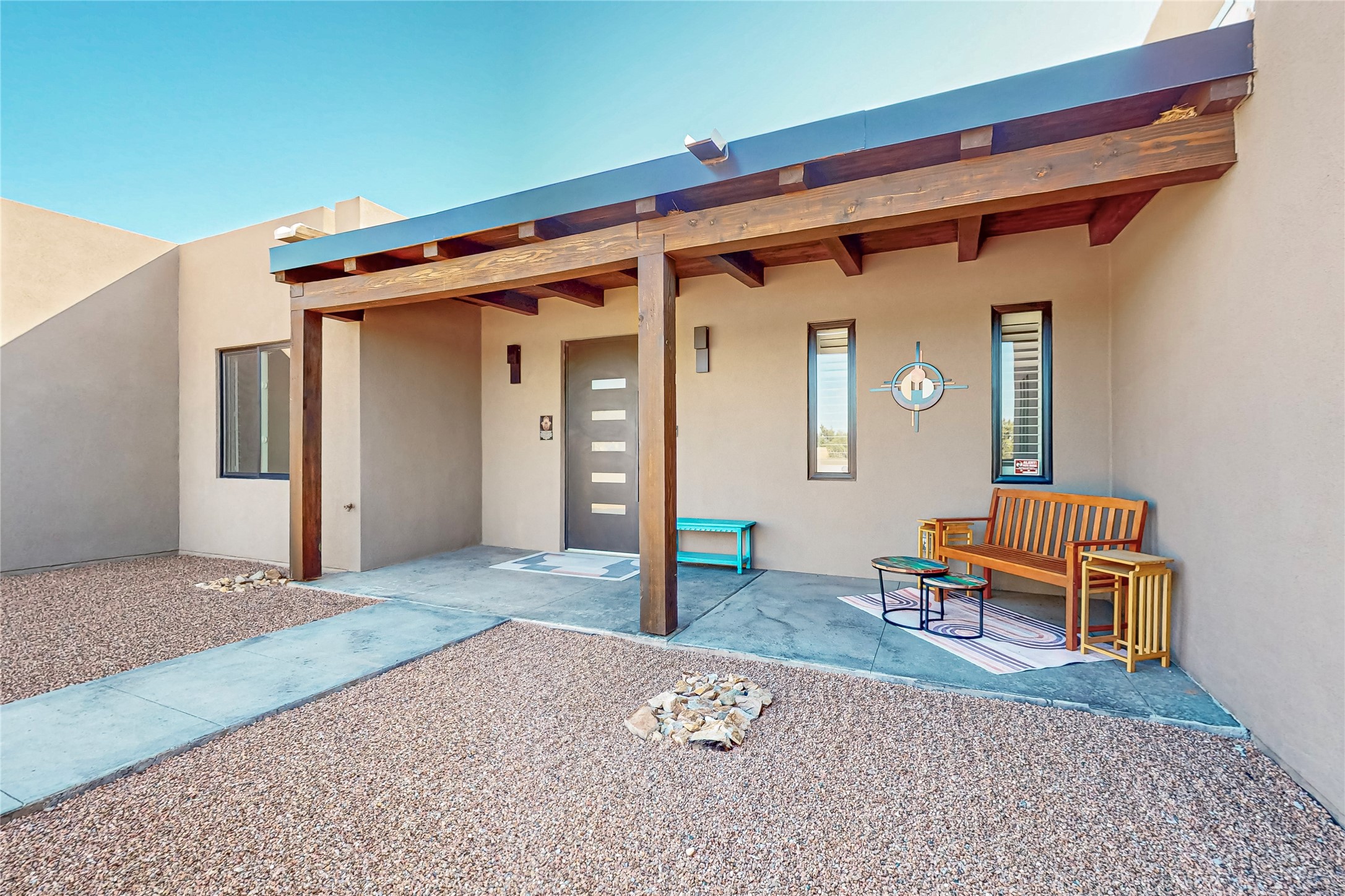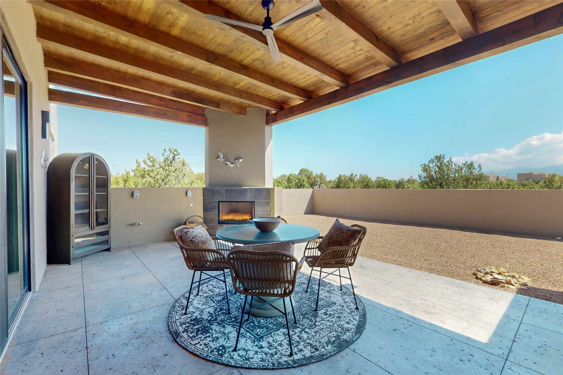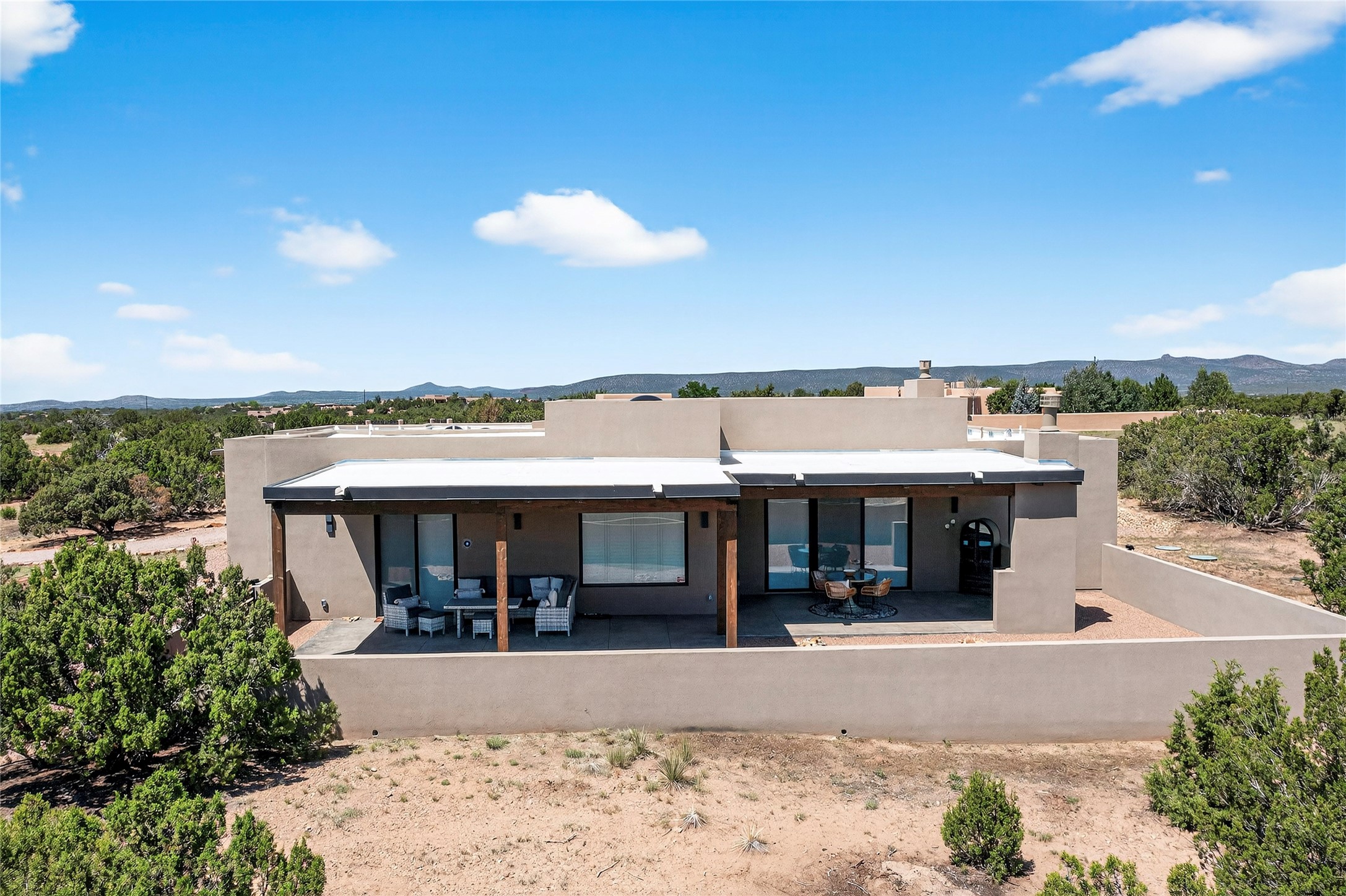Nestled within the gated subdivision of Rancho de los Nios, this extraordinary residence offers a seamless fusion of modern elegance and timeless Southwestern charm. Resting peacefully on 4.86 acres of serene high desert landscape, the home captures breathtaking views of the Santa Fe mountains and is designed to inspire comfort, sophistication, and effortless entertaining. Inside, the home welcomes you with an atmosphere of calm luxury. A palette of beautiful gray tile, beams and fine trimmings sets a refined tone, complemented by recessed lighting, contemporary skylights, and exquisite light fixtures throughout. The spacious great room, with its tile-clad gas fireplace, invites quiet evenings or lively gatherings and flows gracefully through oversized sliding glass doors onto a covered patio and courtyard, where yet another outdoor fireplace awaits under the Santa Fe sky. The heart of the home is the chef's kitchen, a masterwork featuring ZLINE black stainless steel appliances, quartz countertops, and elegant backsplash tiling--a culinary space as functional as it is stunning. Nearby, a bonus room provides the perfect canvas for a home office, creative studio, or private retreat--whatever your heart desires. The primary suite is a sanctuary unto itself, featuring a spacious master bedroom, remote-controlled blinds, and a luxurious en suite bath with a standalone soaking tub, dual vanity sinks, a walk-in shower, and an expansive walk-in closet. The home offers three bedrooms and three bathrooms in total, all thoughtfully appointed and finished with shutters on the windows to enhance both style and privacy. Comfort and practicality meet with central heating and air conditioning, a three-car garage, and thoughtfully selected fixtures and finishes throughout. This residence is a true gem in one of Santa Fe's most coveted communities--quiet, secure, and remarkably beautiful.Come home to Rancho de los Nios, where sophistication meets serenity.