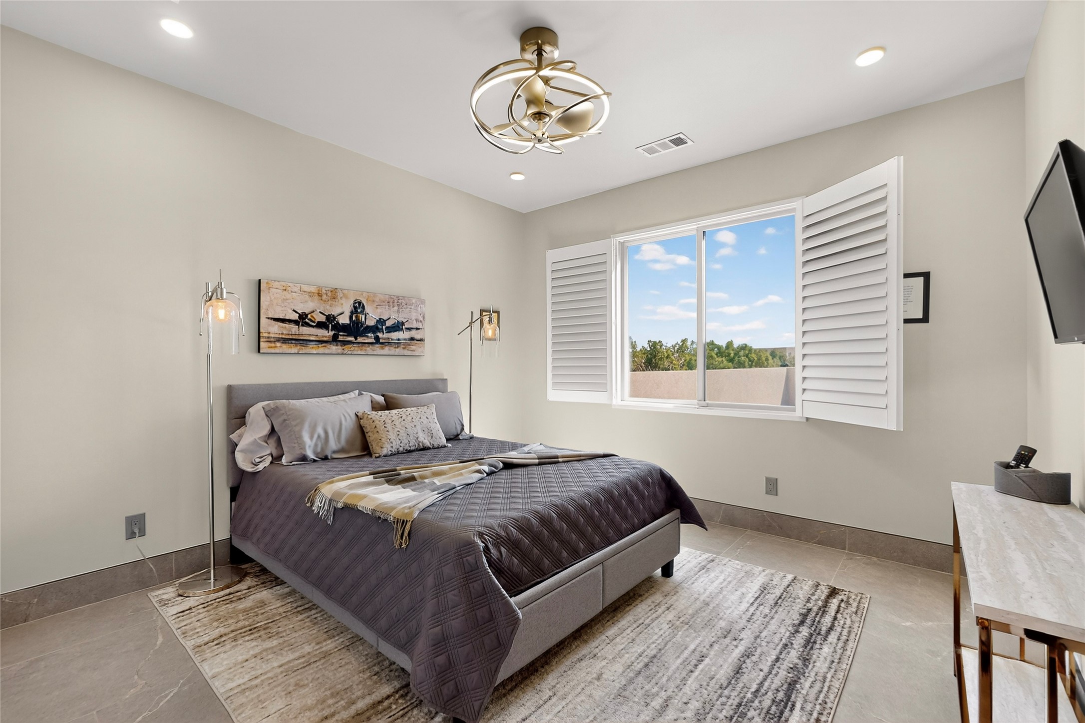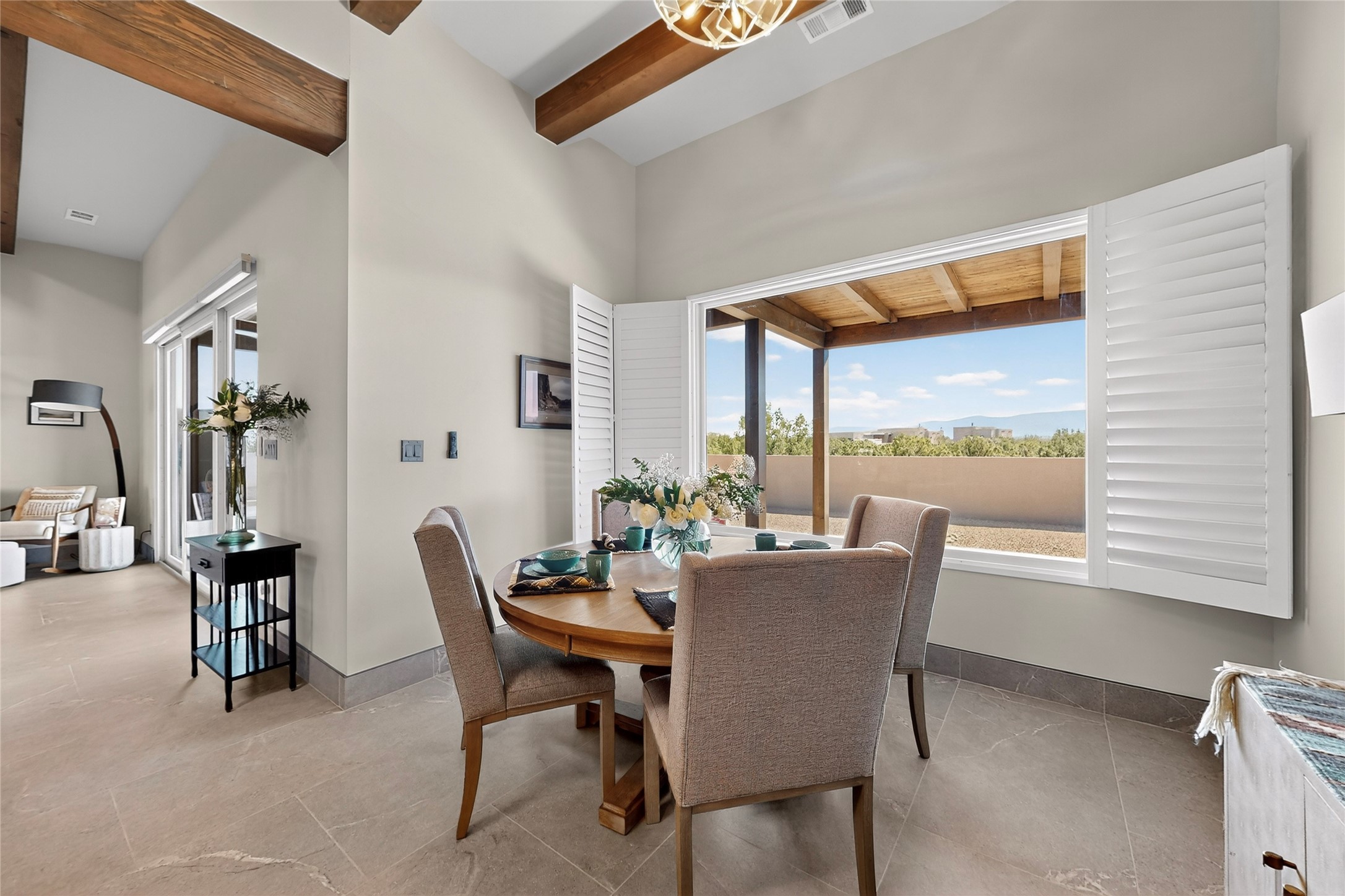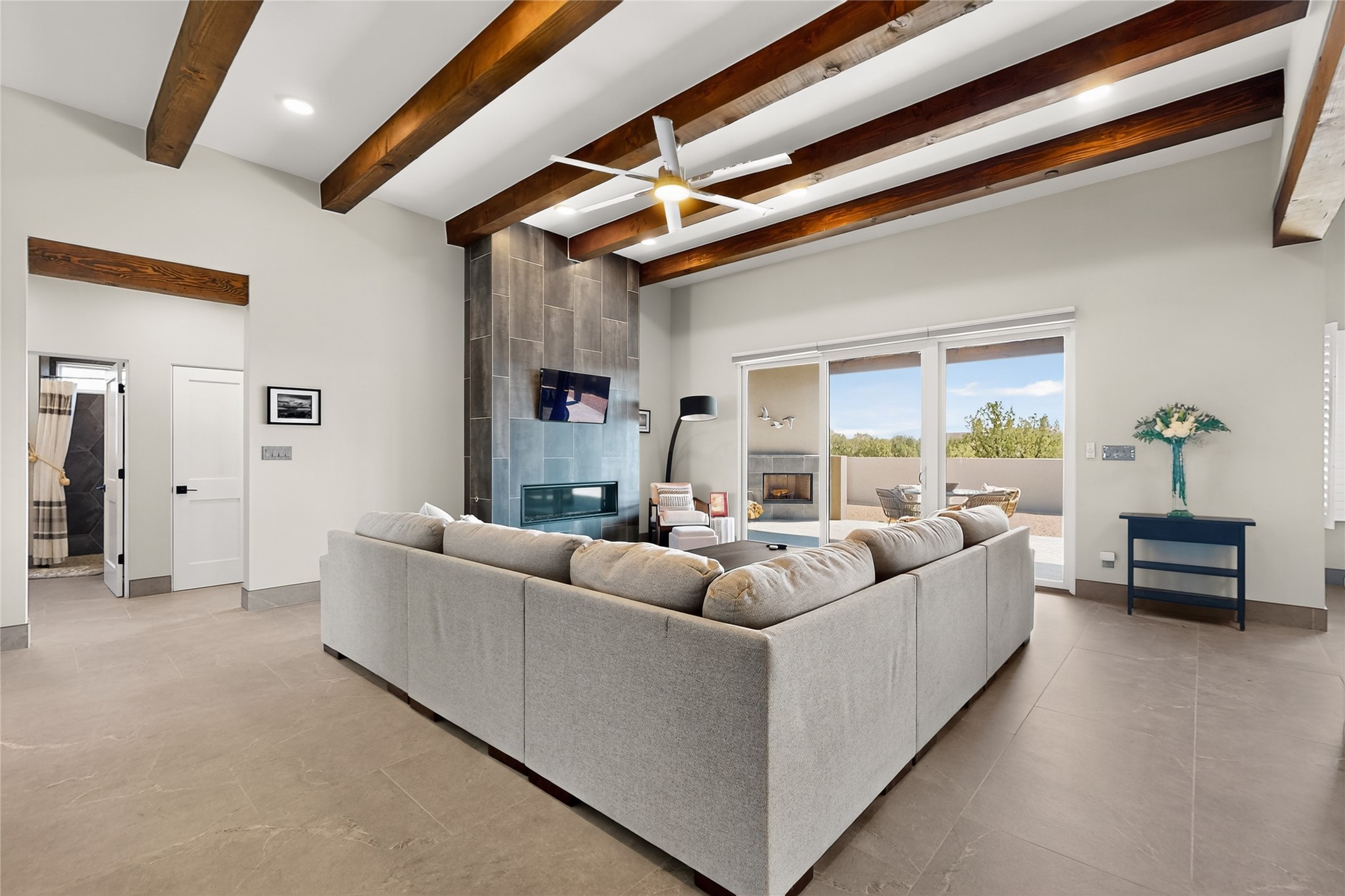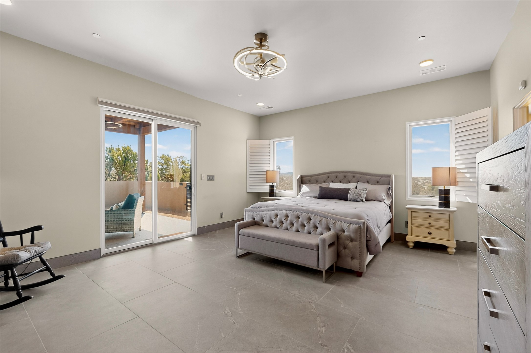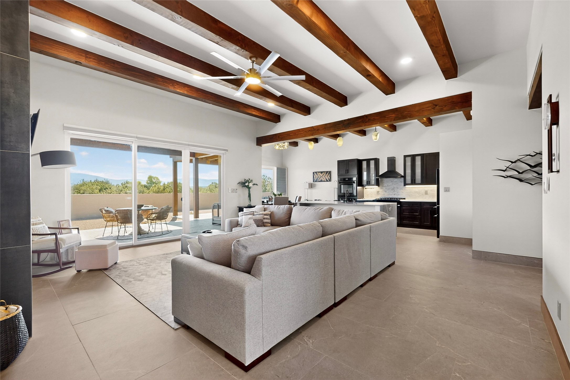 Nestled within the gated subdivision of Rancho de los Nios, this extraordinary residence offers a seamless fusion of modern elegance and timeless Southwestern charm. Resting peacefully on 4.86 acres of serene high desert landscape, the home captures breathtaking views of the Santa Fe mountains and is designed to inspire comfort, sophistication, and effortless entertaining. Inside, the home welcomes you with an atmosphere of calm luxury. A palette of beautiful gray tile, beams and fine trimmings sets a refined tone, complemented by recessed lighting, contemporary skylights, and exquisite light fixtures throughout. The spacious great room, with its tile-clad gas fireplace, invites quiet evenings or lively gatherings and flows gracefully through oversized sliding glass doors onto a covered patio and courtyard, where yet another outdoor fireplace awaits under the Santa Fe sky. The heart of the home is the chef's kitchen, a masterwork featuring ZLINE black stainless steel appliances, quartz countertops, and elegant backsplash tiling--a culinary space as functional as it is stunning. Nearby, a bonus room provides the perfect canvas for a home office, creative studio, or private retreat--whatever your heart desires. The primary suite is a sanctuary unto itself, featuring a spacious master bedroom, remote-controlled blinds, and a luxurious en suite bath with a standalone soaking tub, dual vanity sinks, a walk-in shower, and an expansive walk-in closet. The home offers three bedrooms and three bathrooms in total, all thoughtfully appointed and finished with shutters on the windows to enhance both style and privacy. Comfort and practicality meet with central heating and air conditioning, a three-car garage, and thoughtfully selected fixtures and finishes throughout. This residence is a true gem in one of Santa Fe's most coveted communities--quiet, secure, and remarkably beautiful.Come home to Rancho de los Nios, where sophistication meets serenity.