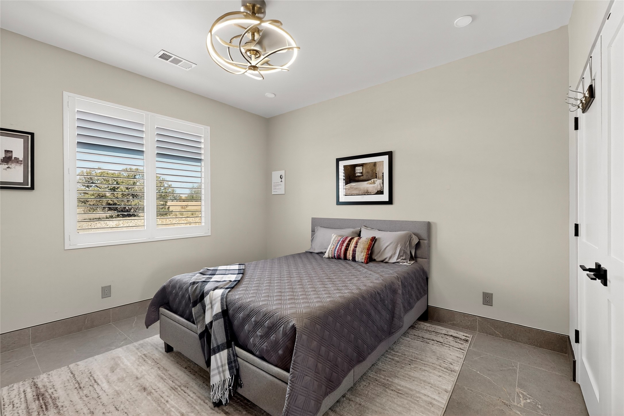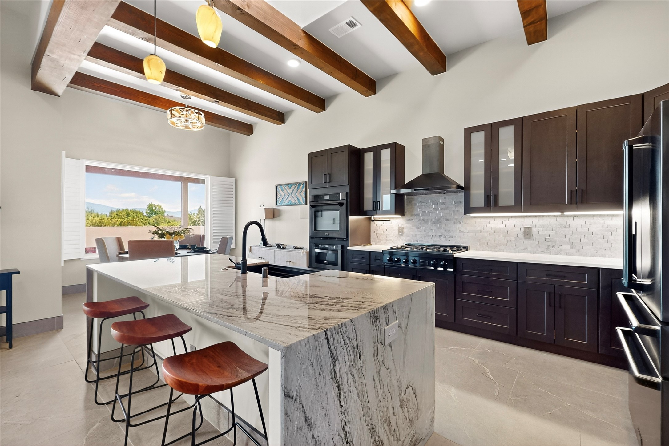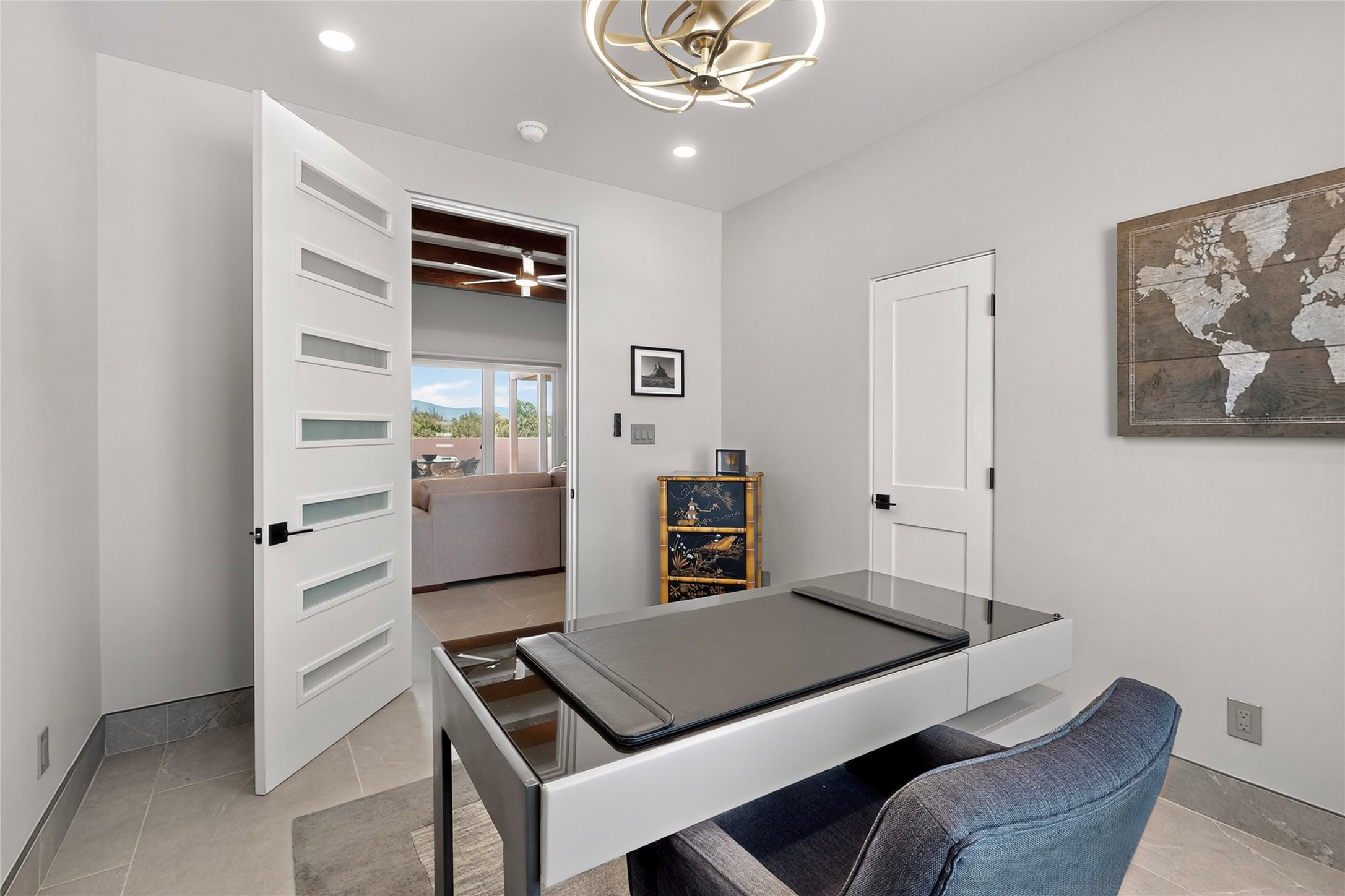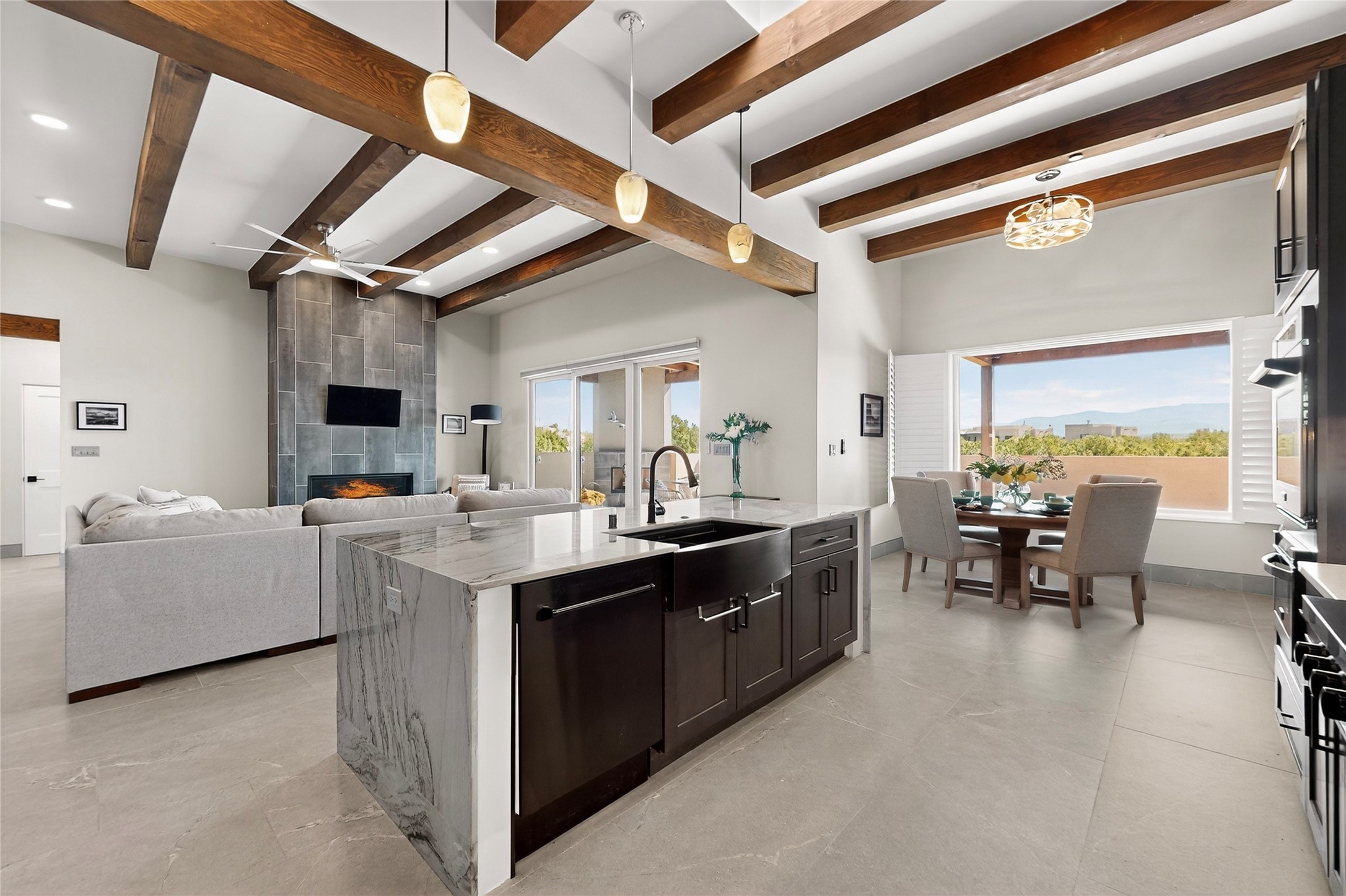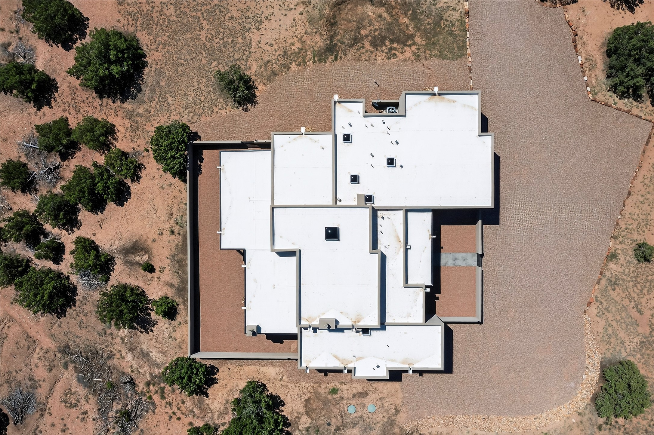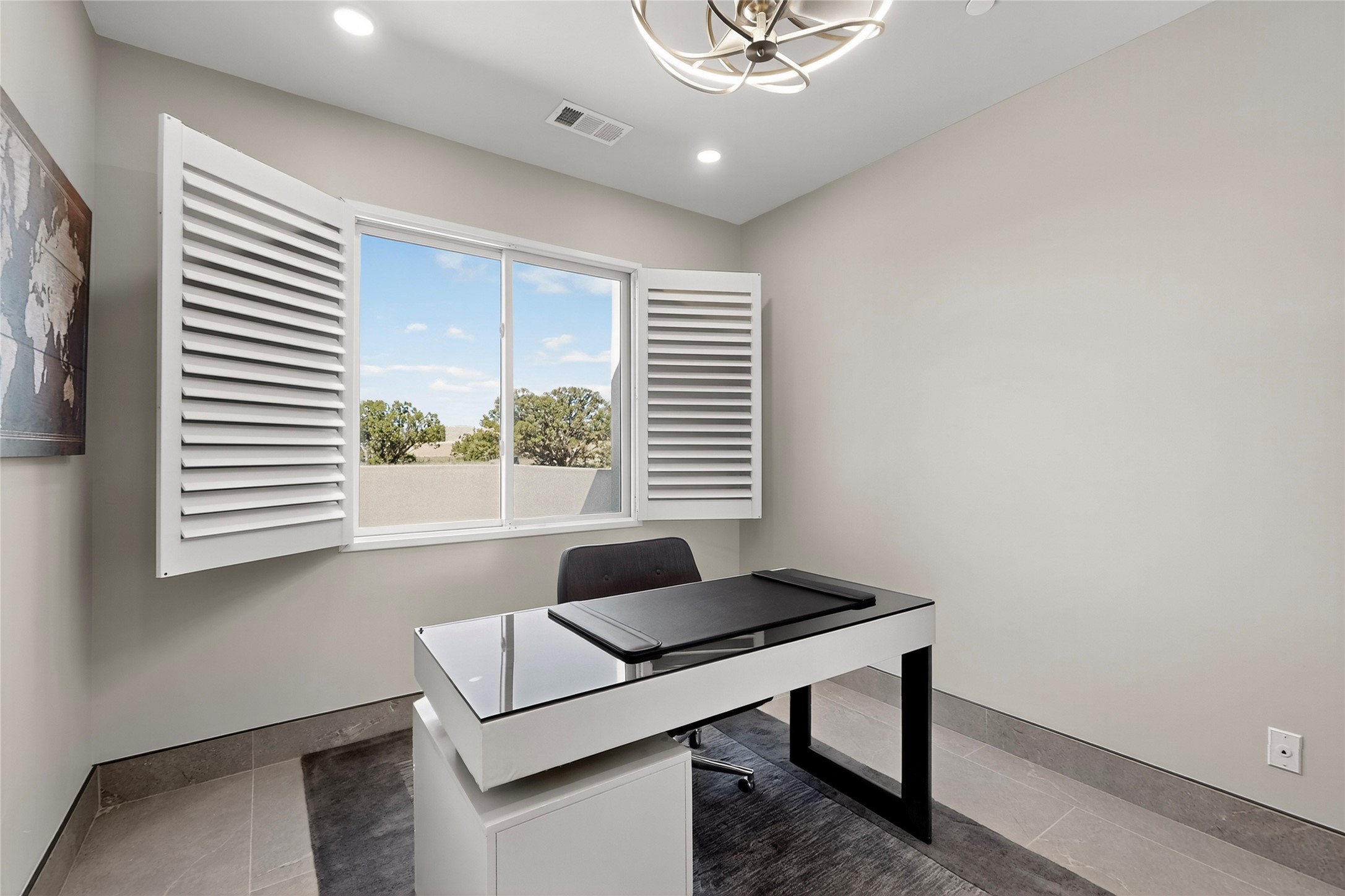 Nestled within the gated subdivision of Rancho de los Nios, this extraordinary residence offers a seamless fusion of modern elegance and timeless Southwestern charm. Resting peacefully on 4.86 acres of serene high desert landscape, the home captures breathtaking views of the Santa Fe mountains and is designed to inspire comfort, sophistication, and effortless entertaining. Inside, the home welcomes you with an atmosphere of calm luxury. A palette of beautiful gray tile, beams and fine trimmings sets a refined tone, complemented by recessed lighting, contemporary skylights, and exquisite light fixtures throughout. The spacious great room, with its tile-clad gas fireplace, invites quiet evenings or lively gatherings and flows gracefully through oversized sliding glass doors onto a covered patio and courtyard, where yet another outdoor fireplace awaits under the Santa Fe sky. The heart of the home is the chef's kitchen, a masterwork featuring ZLINE black stainless steel appliances, quartz countertops, and elegant backsplash tiling--a culinary space as functional as it is stunning. Nearby, a bonus room provides the perfect canvas for a home office, creative studio, or private retreat--whatever your heart desires. The primary suite is a sanctuary unto itself, featuring a spacious master bedroom, remote-controlled blinds, and a luxurious en suite bath with a standalone soaking tub, dual vanity sinks, a walk-in shower, and an expansive walk-in closet. The home offers three bedrooms and three bathrooms in total, all thoughtfully appointed and finished with shutters on the windows to enhance both style and privacy. Comfort and practicality meet with central heating and air conditioning, a three-car garage, and thoughtfully selected fixtures and finishes throughout. This residence is a true gem in one of Santa Fe's most coveted communities--quiet, secure, and remarkably beautiful.Come home to Rancho de los Nios, where sophistication meets serenity.
