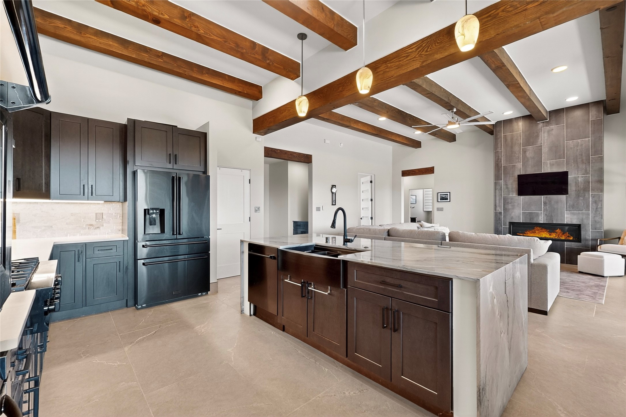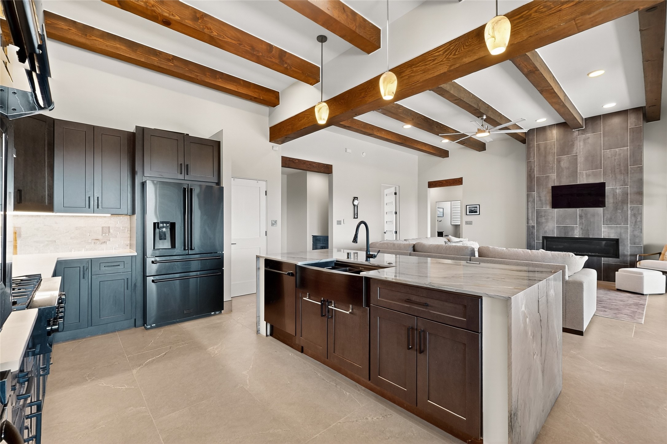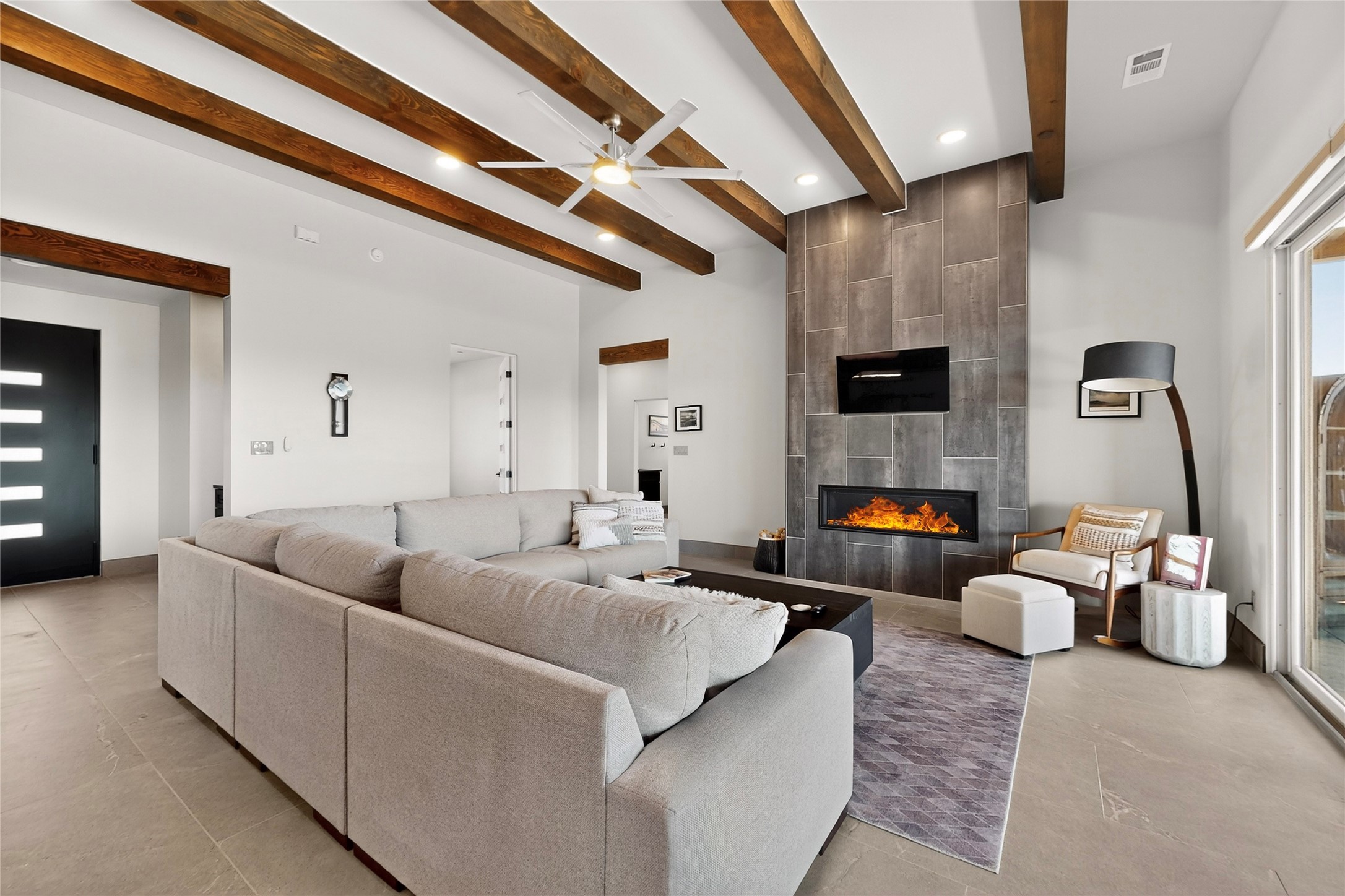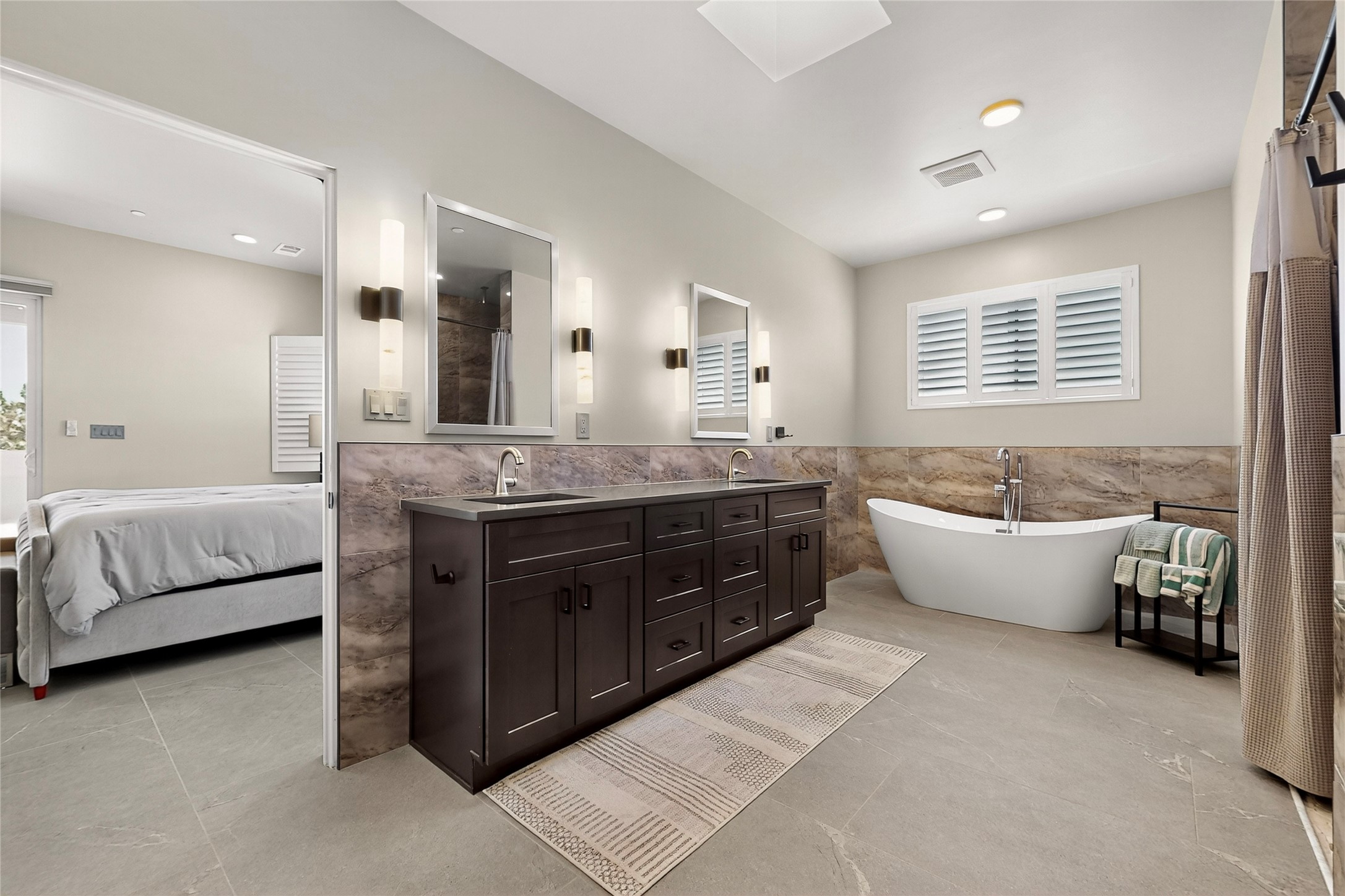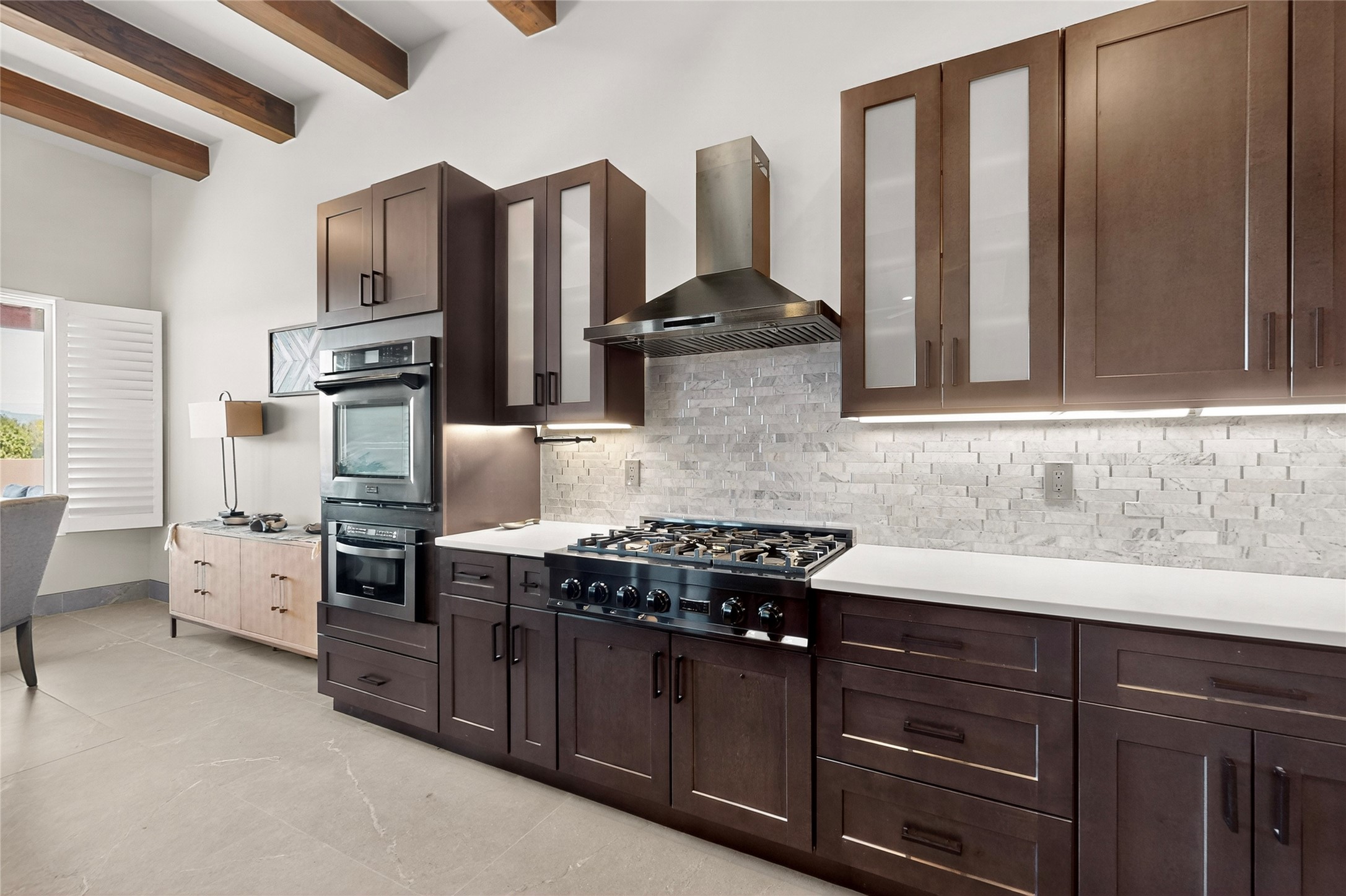 Nestled within the gated subdivision of Rancho de los Nios, this extraordinary residence offers a seamless fusion of modern elegance and timeless Southwestern charm. Resting peacefully on 4.86 acres of serene high desert landscape, the home captures breathtaking views of the Santa Fe mountains and is designed to inspire comfort, sophistication, and effortless entertaining. Inside, the home welcomes you with an atmosphere of calm luxury. A palette of beautiful gray tile, beams and fine trimmings sets a refined tone, complemented by recessed lighting, contemporary skylights, and exquisite light fixtures throughout. The spacious great room, with its tile-clad gas fireplace, invites quiet evenings or lively gatherings and flows gracefully through oversized sliding glass doors onto a covered patio and courtyard, where yet another outdoor fireplace awaits under the Santa Fe sky. The heart of the home is the chef's kitchen, a masterwork featuring ZLINE black stainless steel appliances, quartz countertops, and elegant backsplash tiling--a culinary space as functional as it is stunning. Nearby, a bonus room provides the perfect canvas for a home office, creative studio, or private retreat--whatever your heart desires. The primary suite is a sanctuary unto itself, featuring a spacious master bedroom, remote-controlled blinds, and a luxurious en suite bath with a standalone soaking tub, dual vanity sinks, a walk-in shower, and an expansive walk-in closet. The home offers three bedrooms and three bathrooms in total, all thoughtfully appointed and finished with shutters on the windows to enhance both style and privacy. Comfort and practicality meet with central heating and air conditioning, a three-car garage, and thoughtfully selected fixtures and finishes throughout. This residence is a true gem in one of Santa Fe's most coveted communities--quiet, secure, and remarkably beautiful.Come home to Rancho de los Nios, where sophistication meets serenity.