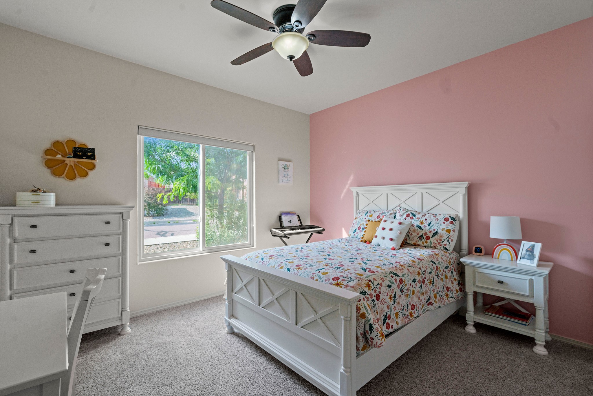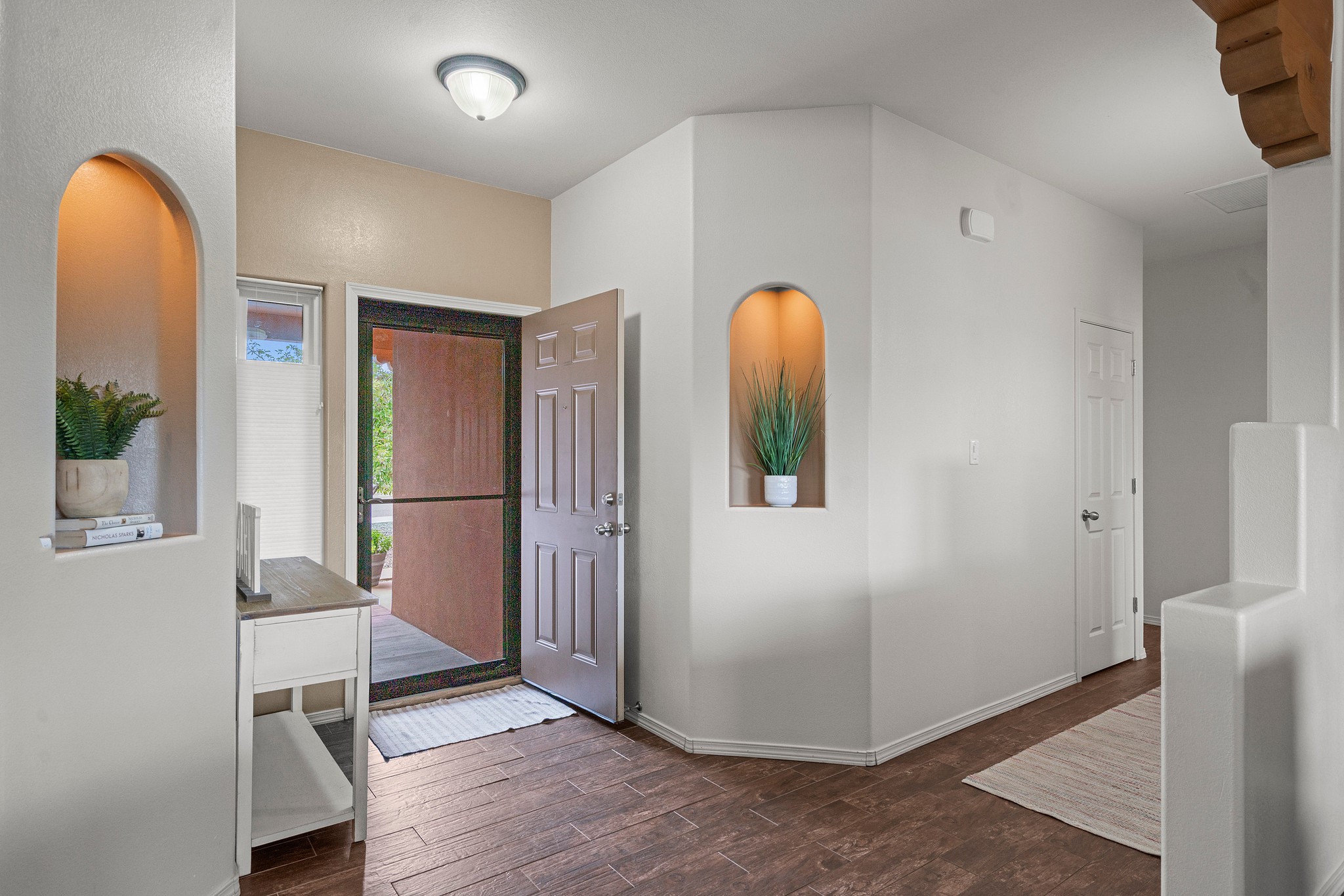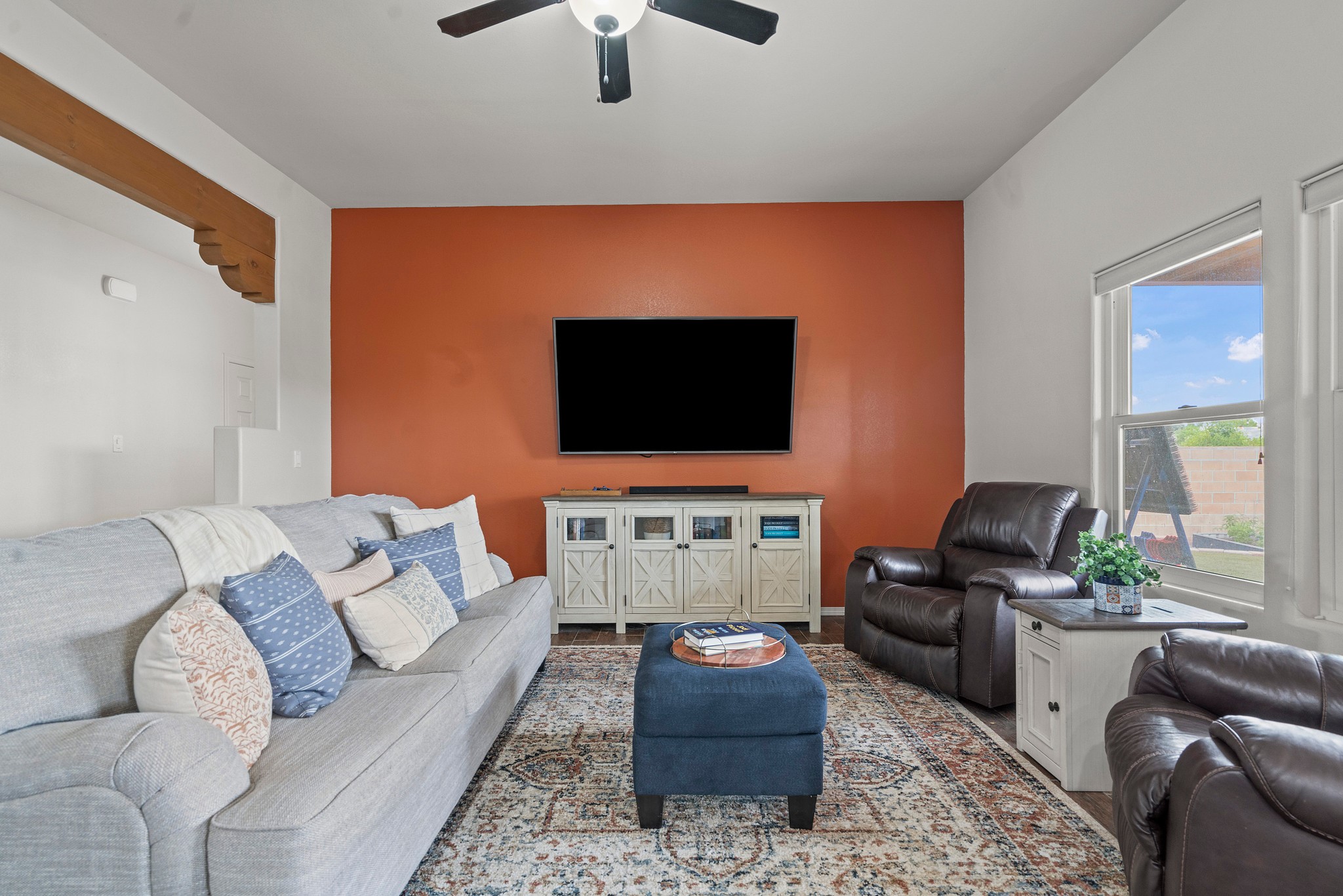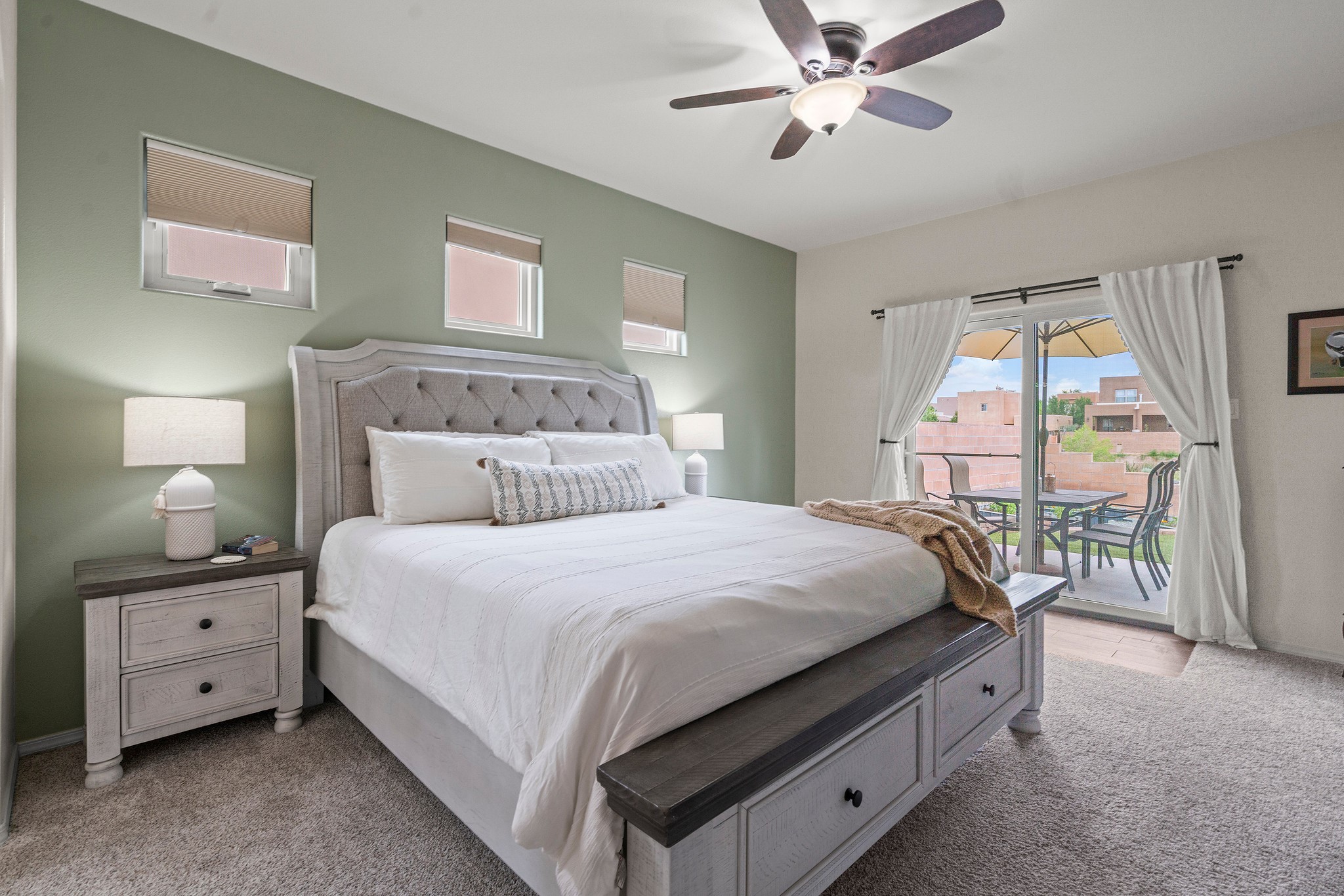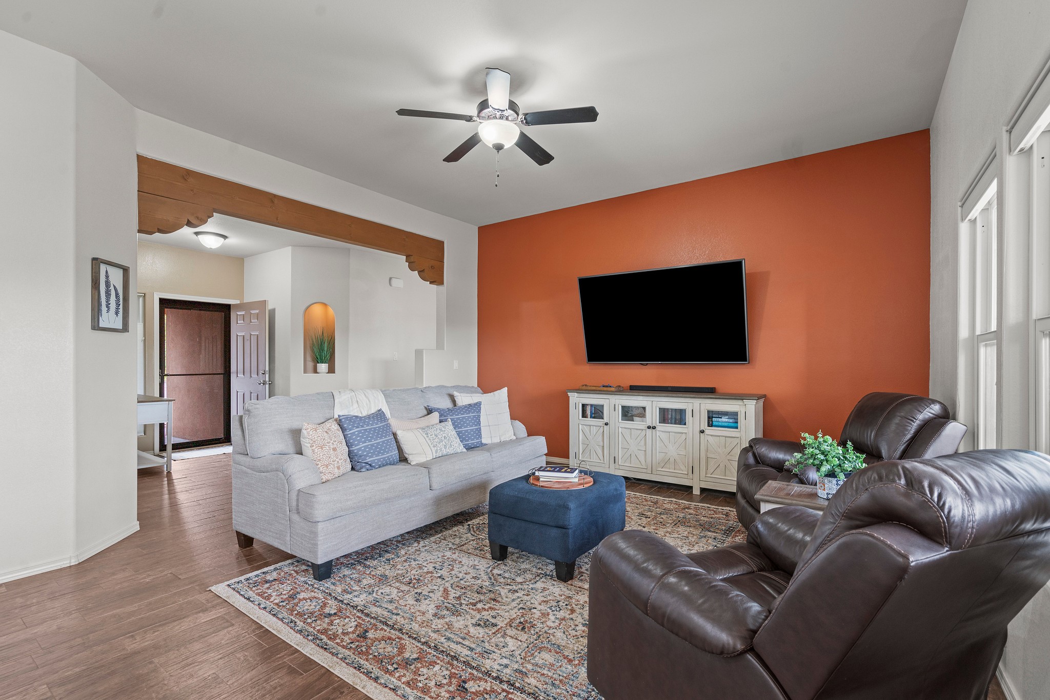 Immaculately Maintained 3-Bedroom, Energy-Efficient Green Home on a Well-Established, Low-Traffic StreetThis beautifully maintained 3-bedroom, 2-bath home features a two-car garage and a newly paved three-car driveway with a custom gate to the backyard. Located in a peaceful neighborhood with easy access to NM-599, the home offers radiant heat and recent upgrades including new tile, carpeted bedrooms, and updated appliances.The spacious, landscaped backyard is perfect for relaxing or entertaining, with a covered portal, extended porch, fire pit, fruit tree, and irrigated raised garden beds. Enjoy added privacy with a natural arroyo located directly behind the home.