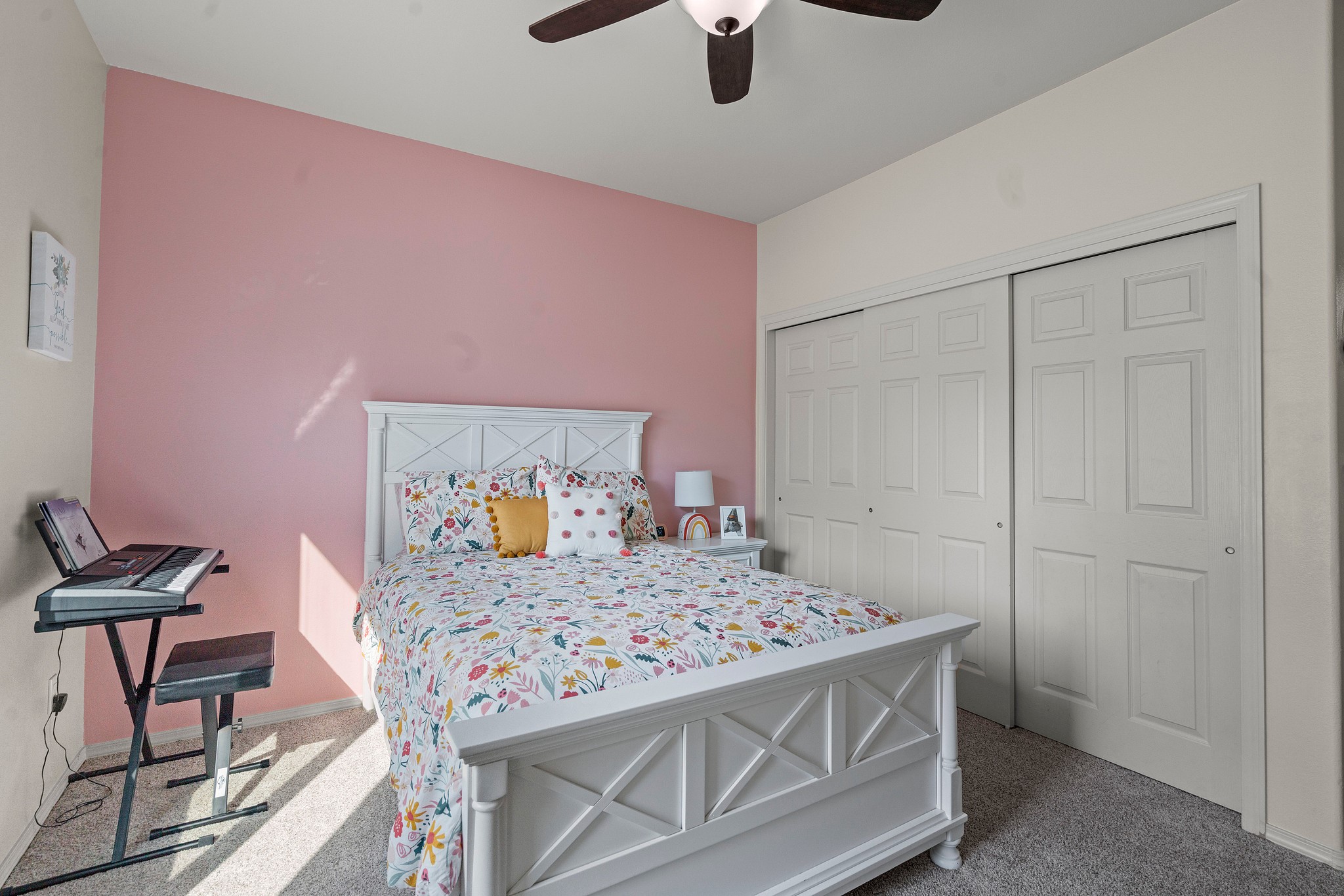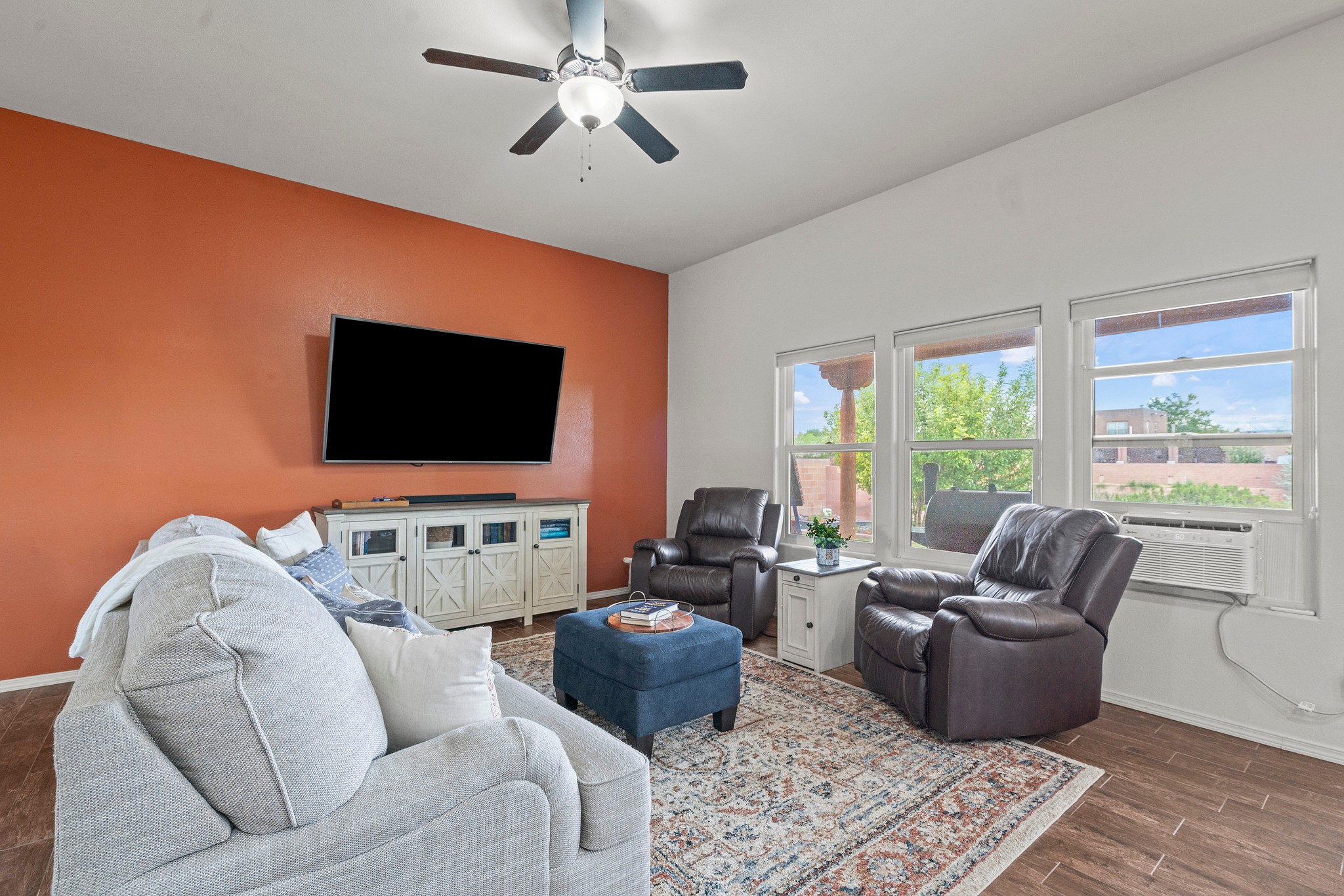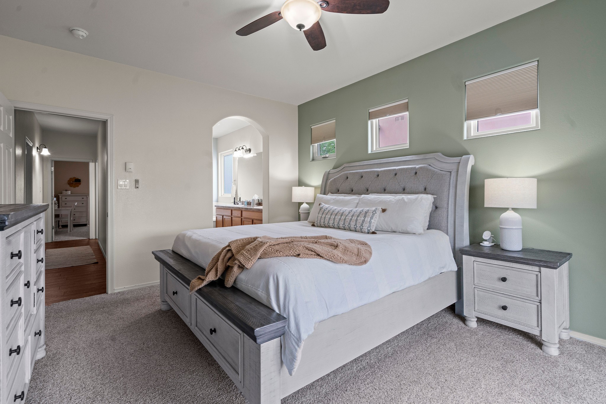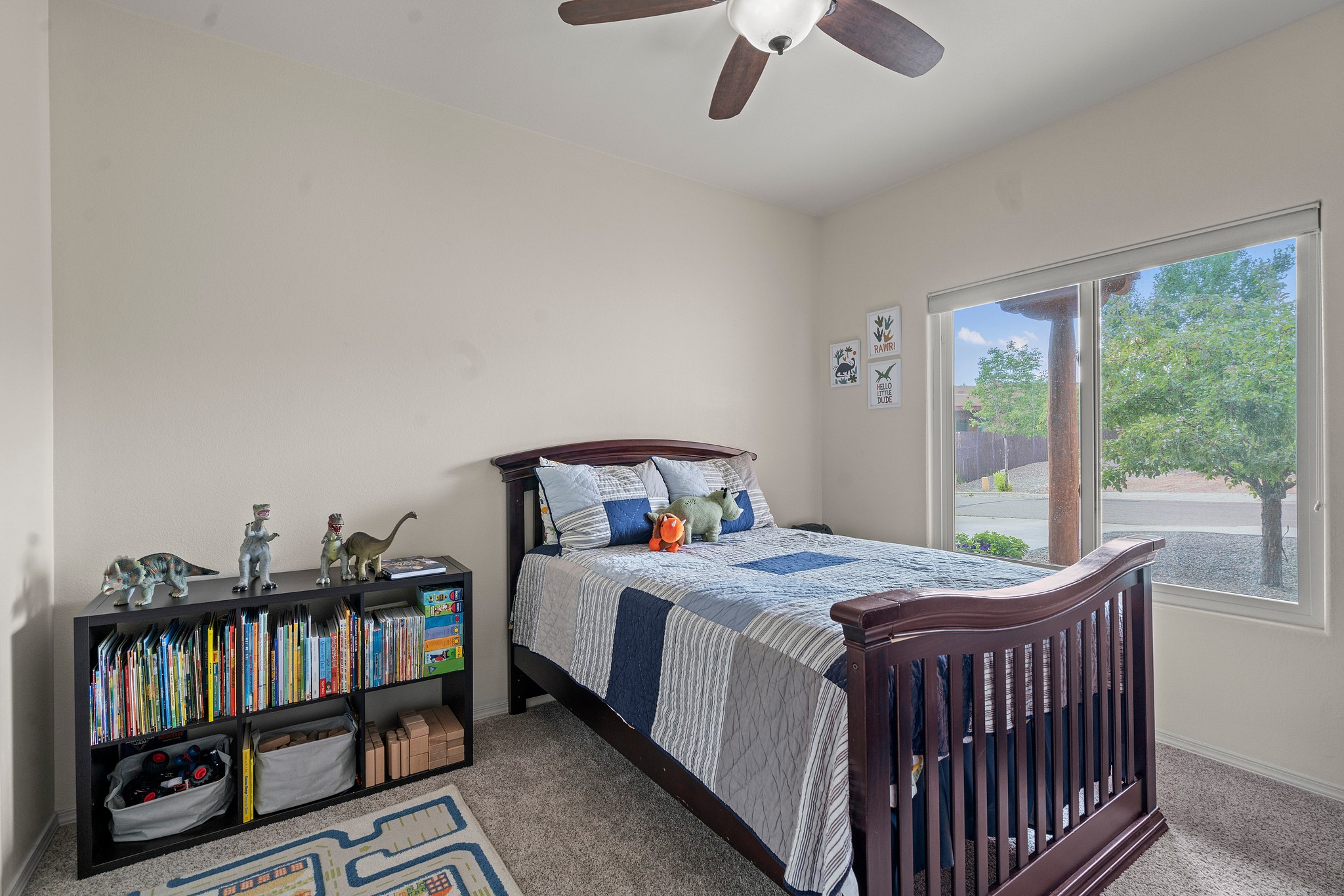 Immaculately Maintained 3-Bedroom, Energy-Efficient Green Home on a Well-Established, Low-Traffic StreetThis beautifully maintained 3-bedroom, 2-bath home features a two-car garage and a newly paved three-car driveway with a custom gate to the backyard. Located in a peaceful neighborhood with easy access to NM-599, the home offers radiant heat and recent upgrades including new tile, carpeted bedrooms, and updated appliances.The spacious, landscaped backyard is perfect for relaxing or entertaining, with a covered portal, extended porch, fire pit, fruit tree, and irrigated raised garden beds. Enjoy added privacy with a natural arroyo located directly behind the home.