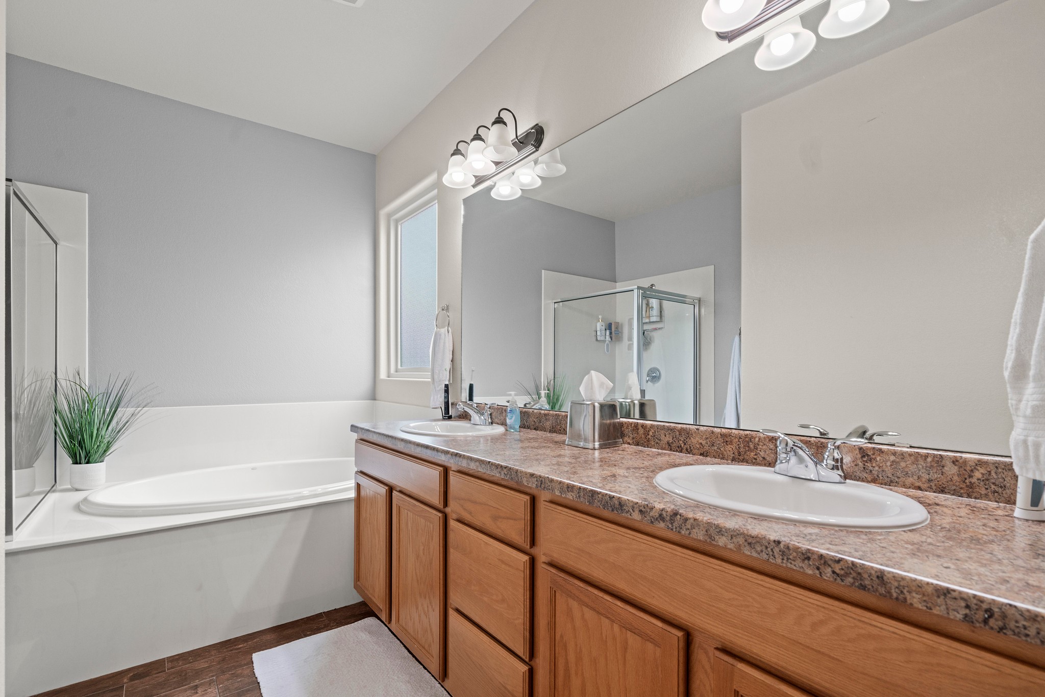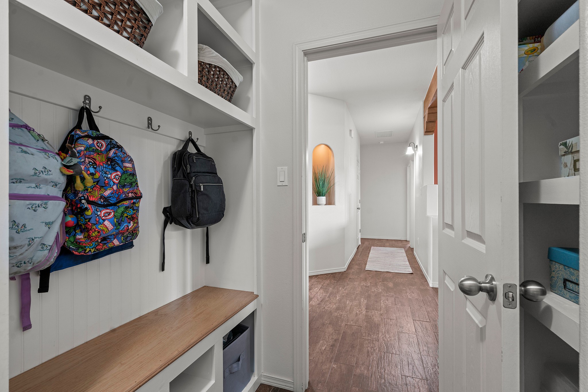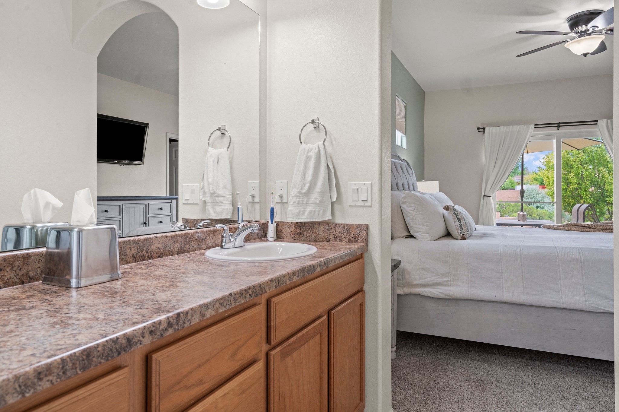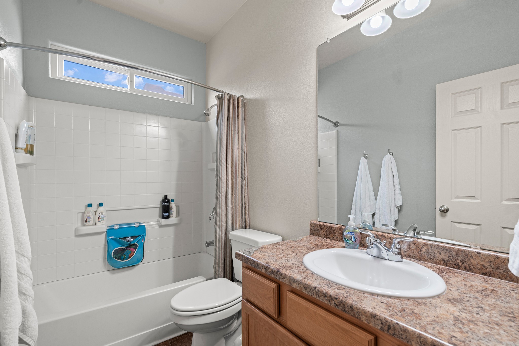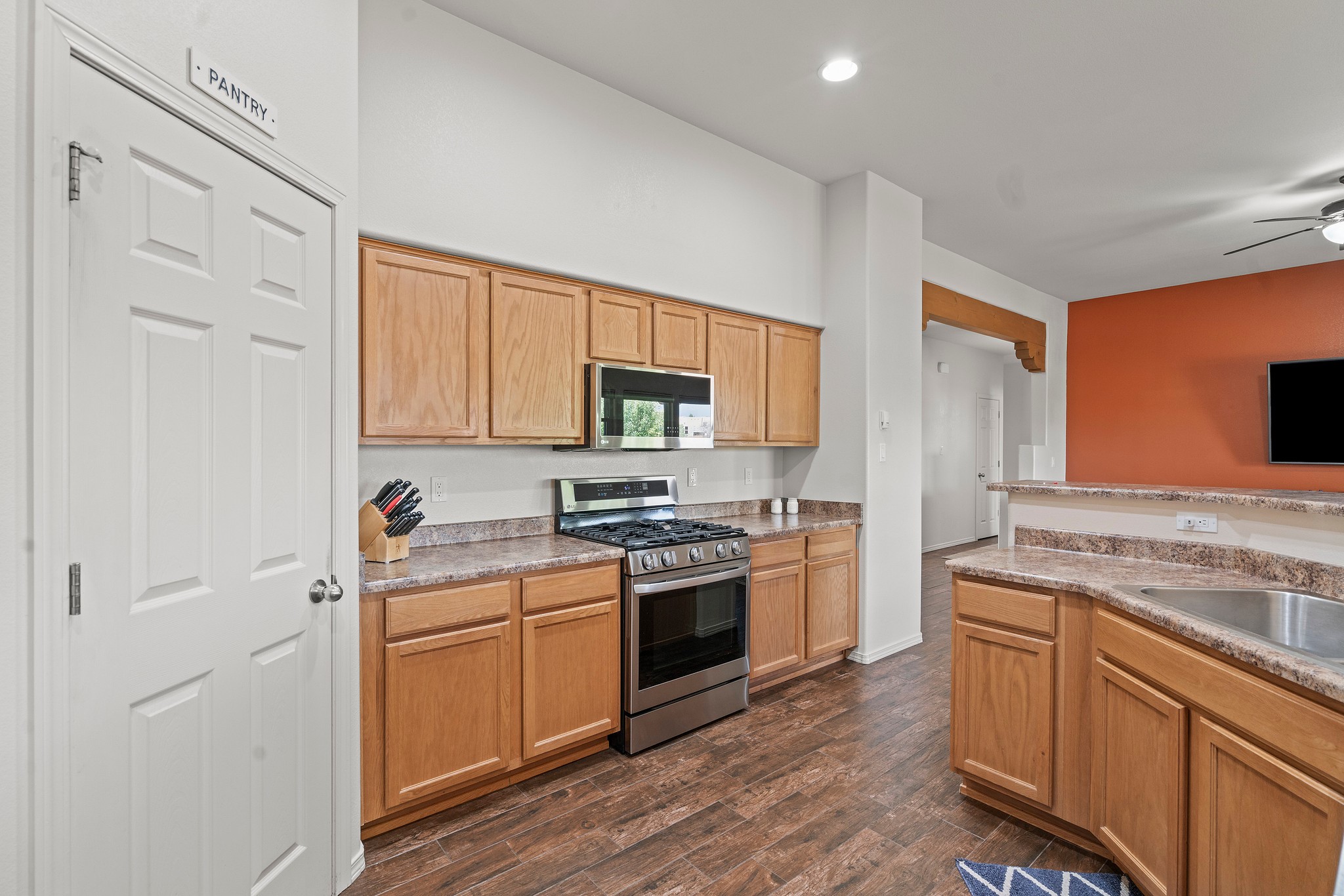 Immaculately Maintained 3-Bedroom, Energy-Efficient Green Home on a Well-Established, Low-Traffic StreetThis beautifully maintained 3-bedroom, 2-bath home features a two-car garage and a newly paved three-car driveway with a custom gate to the backyard. Located in a peaceful neighborhood with easy access to NM-599, the home offers radiant heat and recent upgrades including new tile, carpeted bedrooms, and updated appliances.The spacious, landscaped backyard is perfect for relaxing or entertaining, with a covered portal, extended porch, fire pit, fruit tree, and irrigated raised garden beds. Enjoy added privacy with a natural arroyo located directly behind the home.