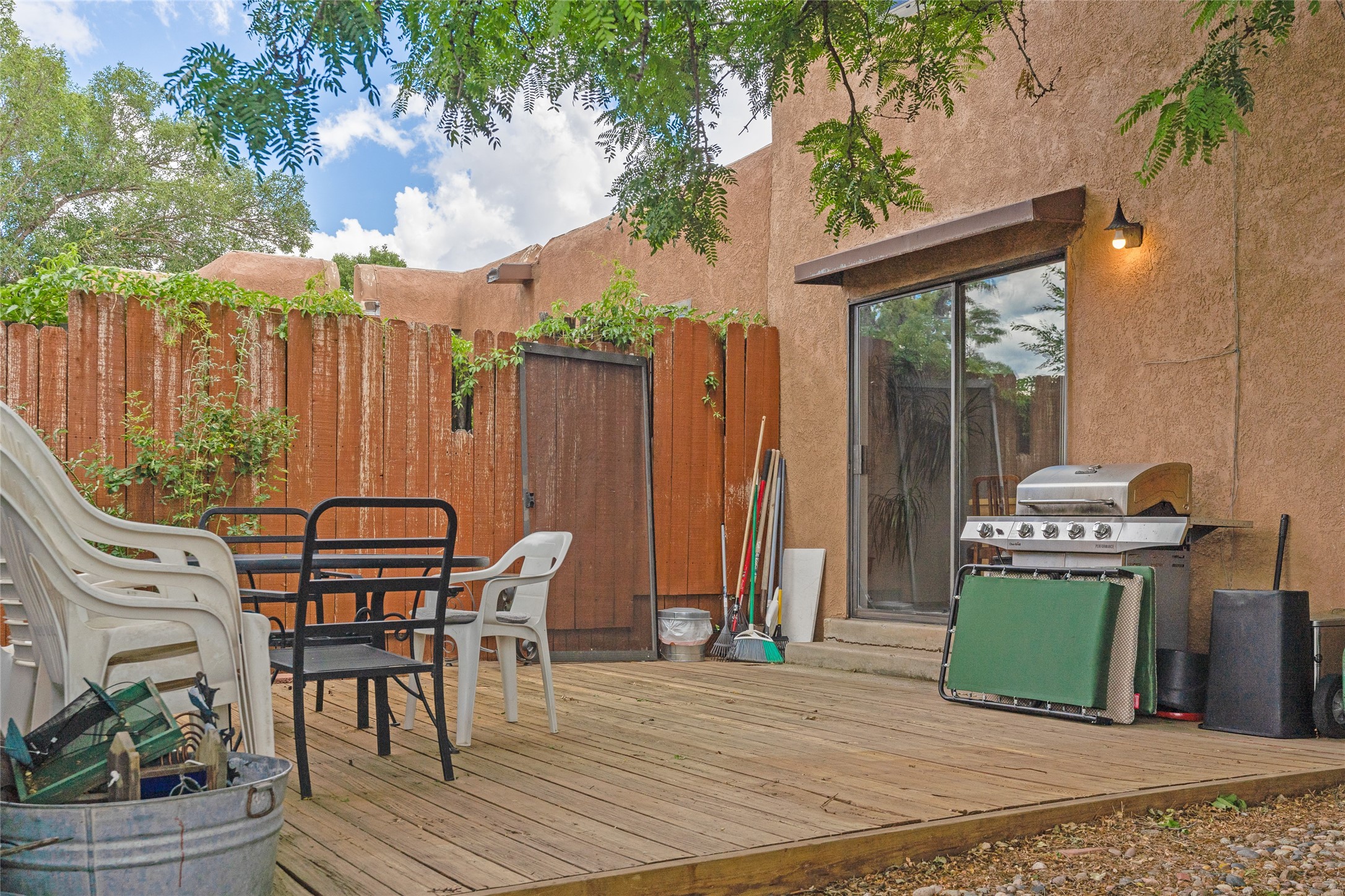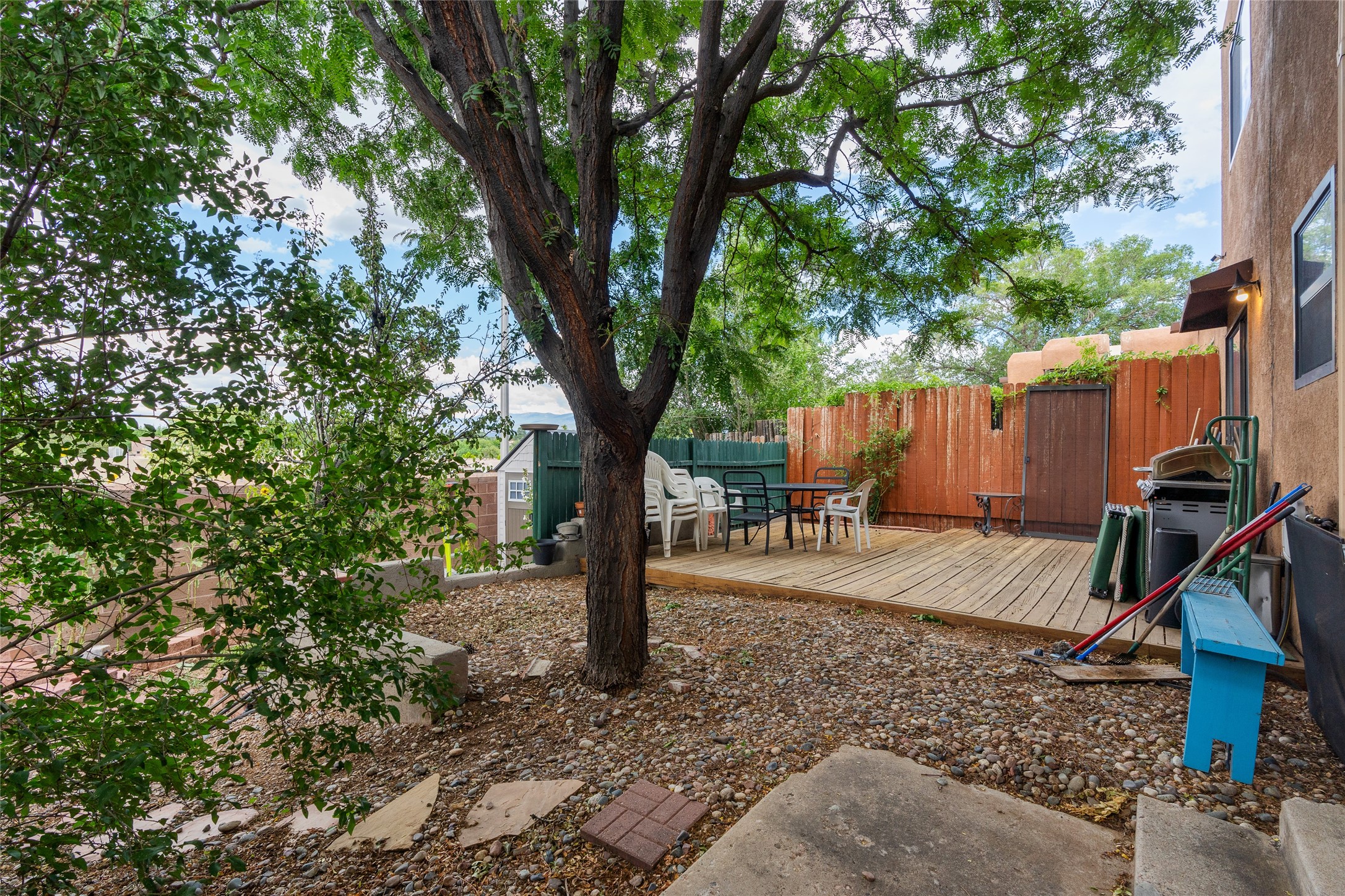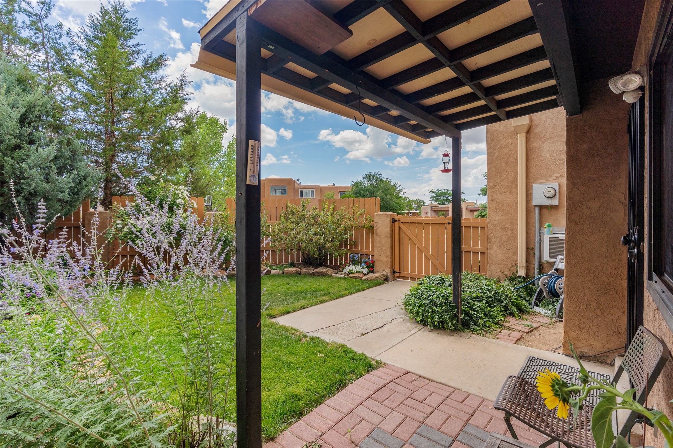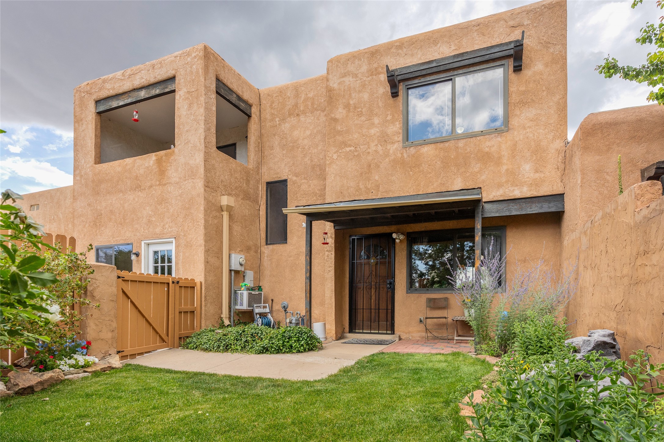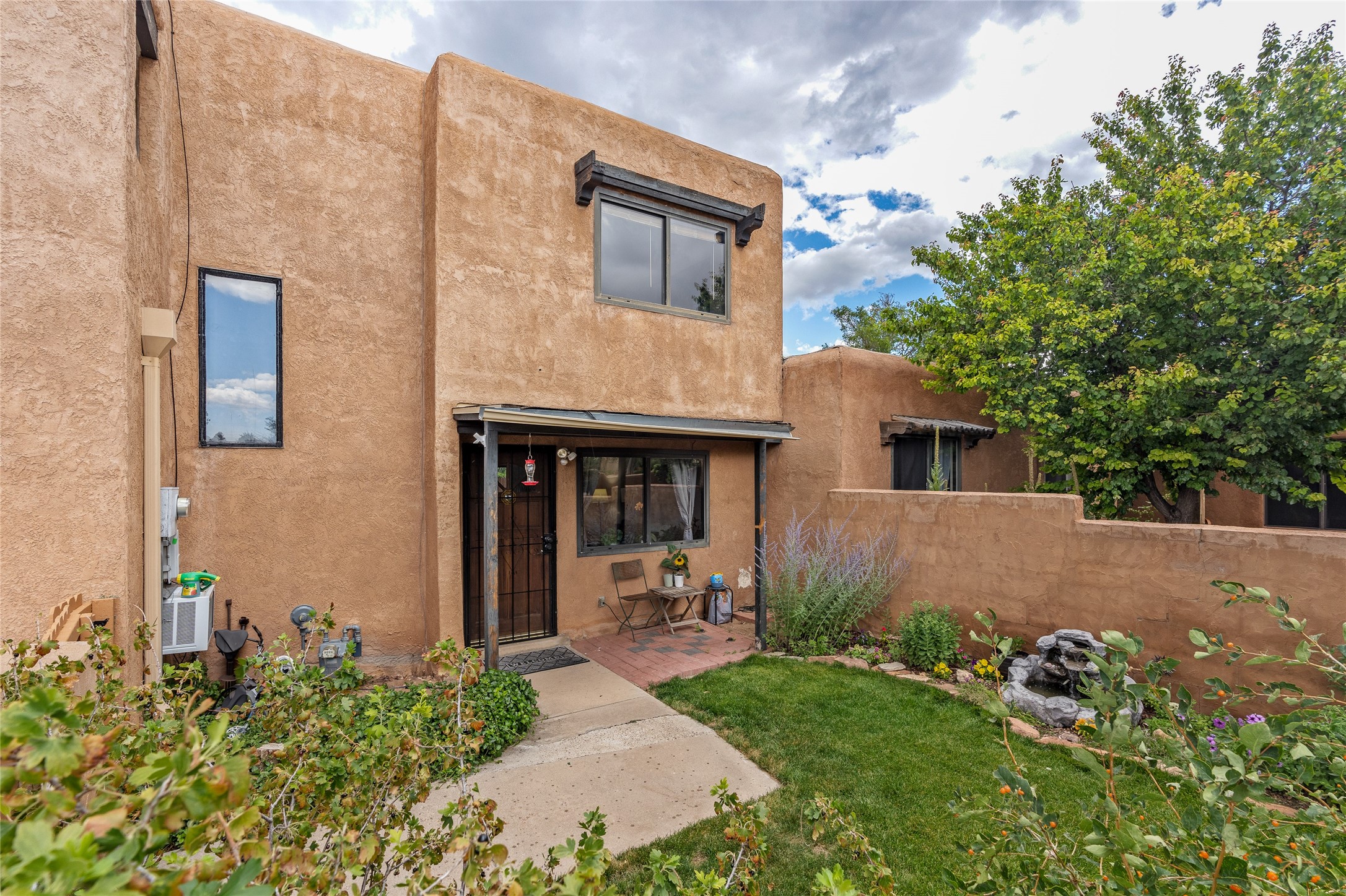 This fabulous 4 bedroom 3 bath townhome off of Rodeo Road makes a great starter home or even a wonderful lock-and-leave second home, with a tranquil gated front courtyard featuring grass, flowers and a water feature. A beautiful backyard showcases mountain views and a deck for entertaining. There is also an eat-in kitchen, a dedicated laundry room, and three bedrooms and two baths upstairs. The convenient location is everything! A 5 min drive to the Plaza, or a short bike ride up to the Zia Railrunner station will have you adventuring into downtown, or even down to Albuquerque in no time! Quick access to nearby parks, shopping, and the Chavez Center is also a huge time saver. As an additional bonus, this property comes with a mother-in-law unit that could be used as a large downstairs primary suite, or could potentially be rented out for extra income. The possibilities are endless. Claim this versatile property before someone else does!