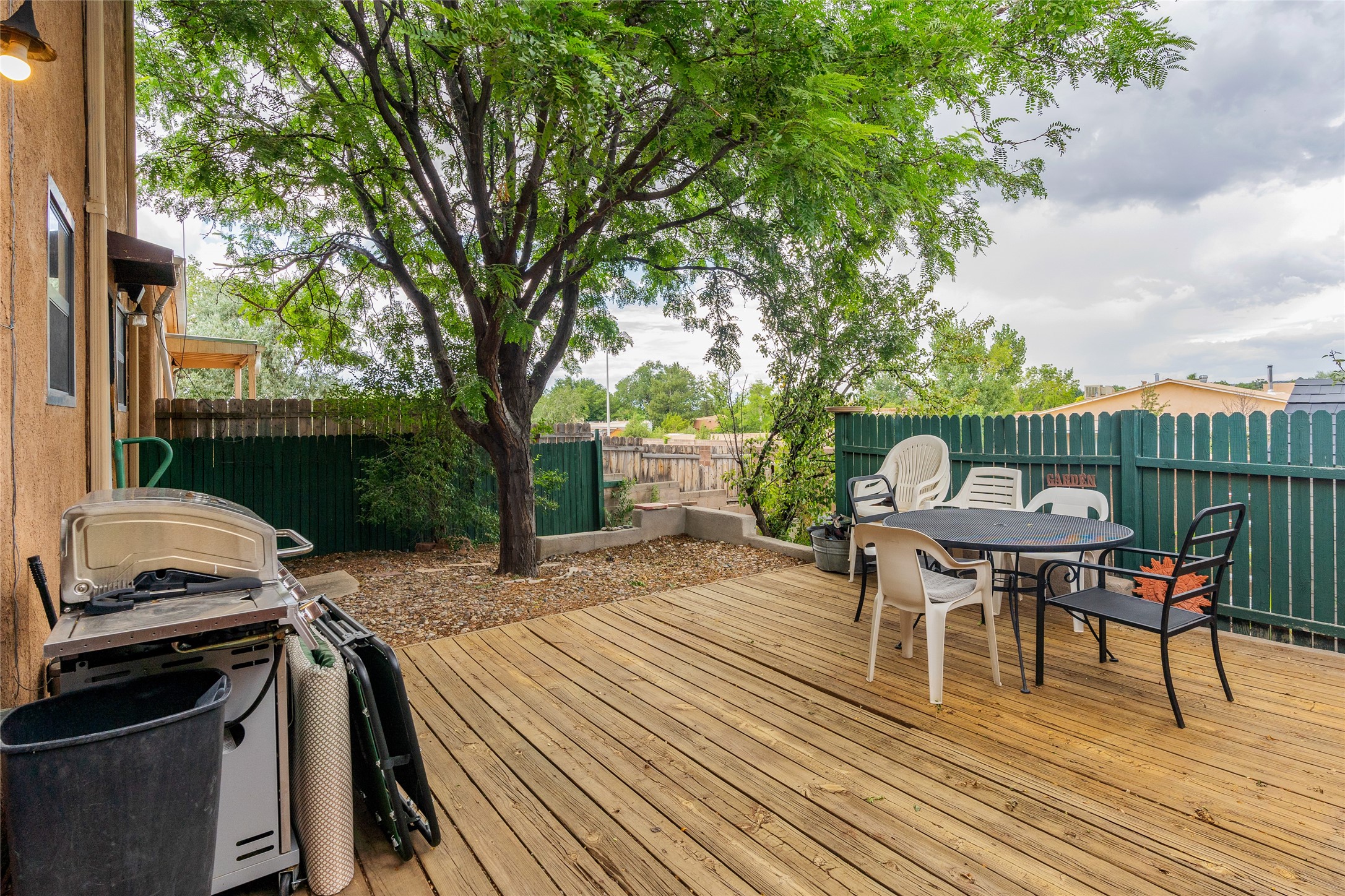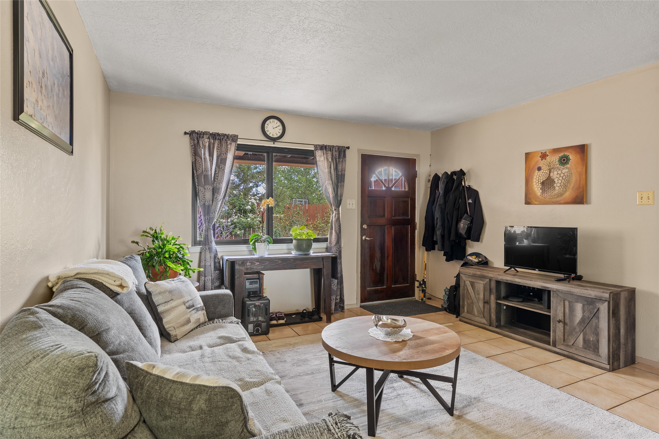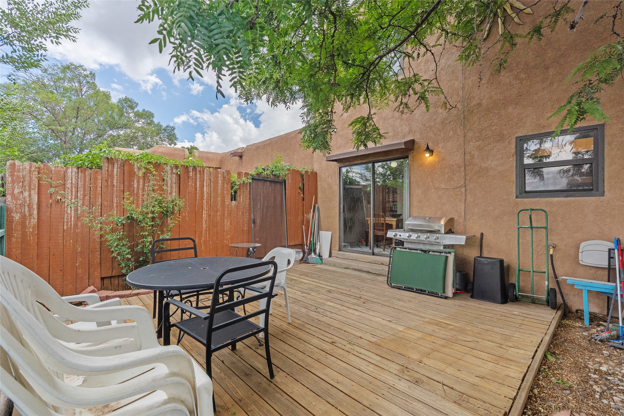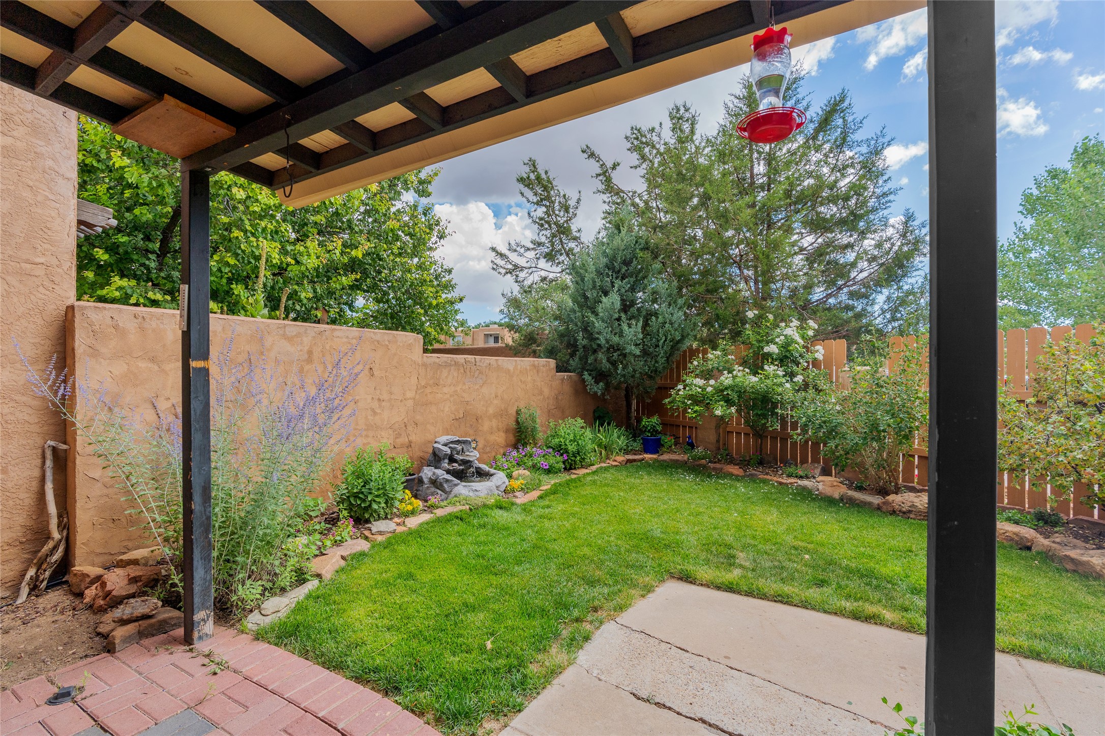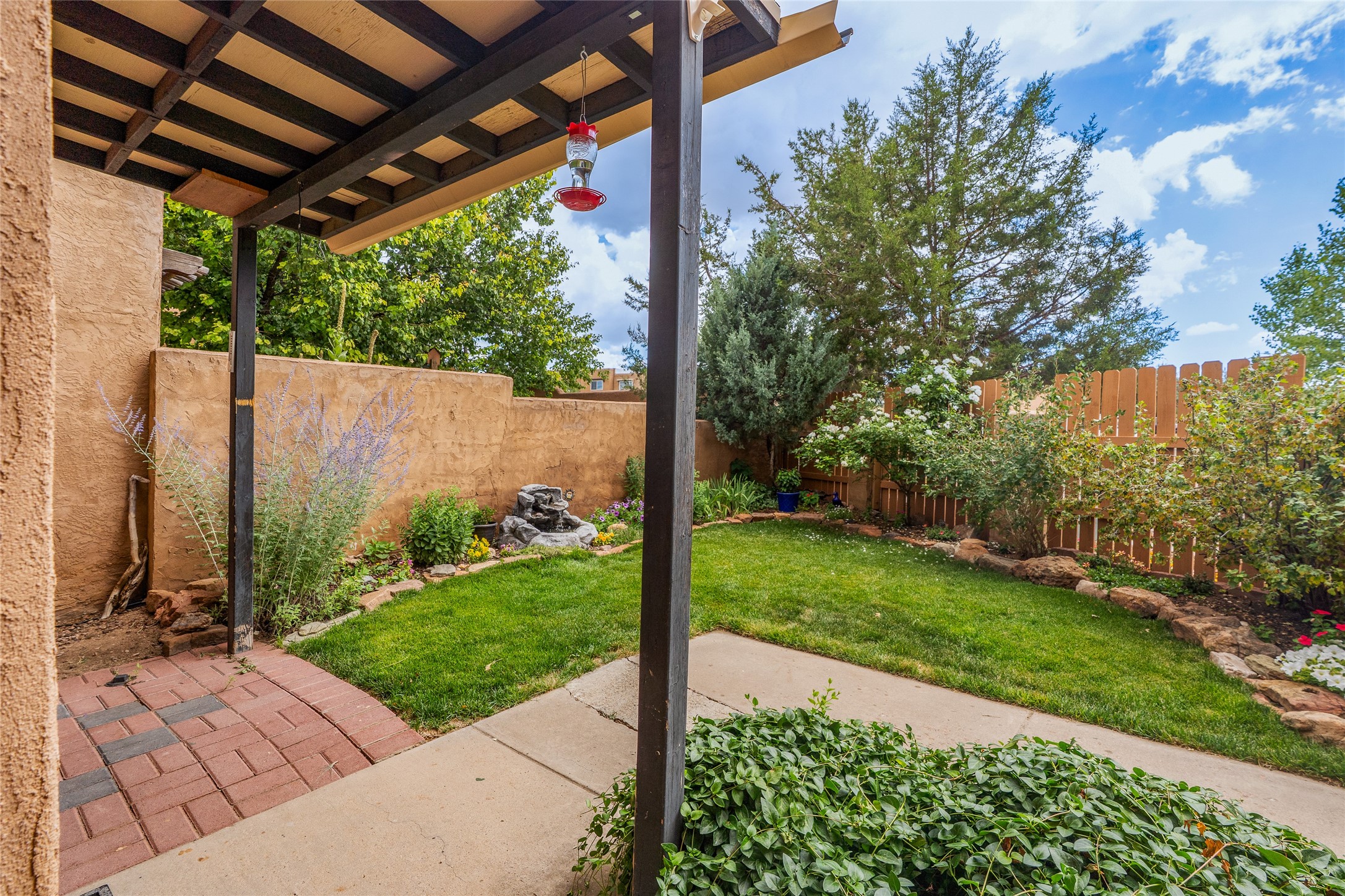 This fabulous 4 bedroom 3 bath townhome off of Rodeo Road makes a great starter home or even a wonderful lock-and-leave second home, with a tranquil gated front courtyard featuring grass, flowers and a water feature. A beautiful backyard showcases mountain views and a deck for entertaining. There is also an eat-in kitchen, a dedicated laundry room, and three bedrooms and two baths upstairs. The convenient location is everything! A 5 min drive to the Plaza, or a short bike ride up to the Zia Railrunner station will have you adventuring into downtown, or even down to Albuquerque in no time! Quick access to nearby parks, shopping, and the Chavez Center is also a huge time saver. As an additional bonus, this property comes with a mother-in-law unit that could be used as a large downstairs primary suite, or could potentially be rented out for extra income. The possibilities are endless. Claim this versatile property before someone else does!