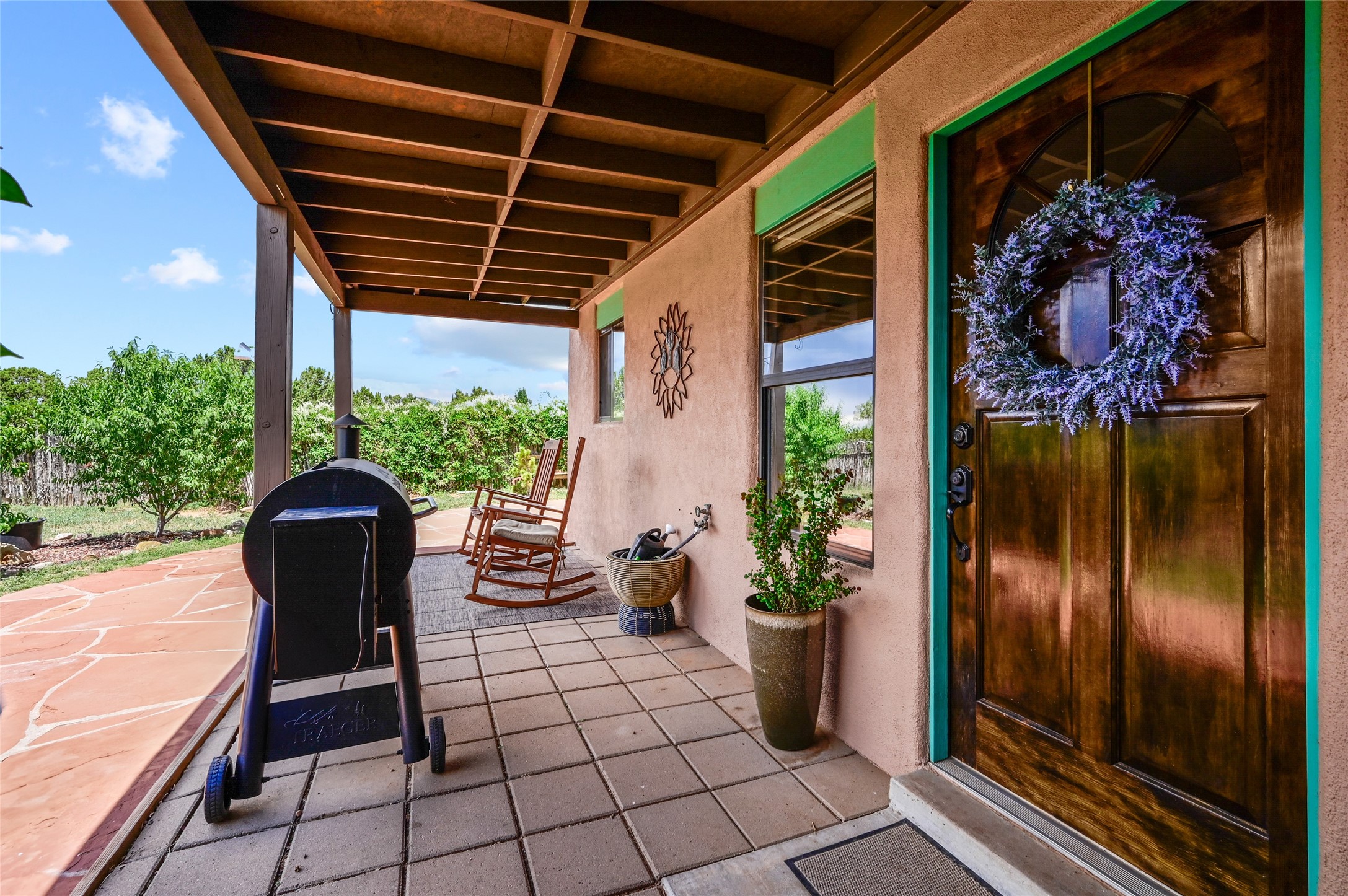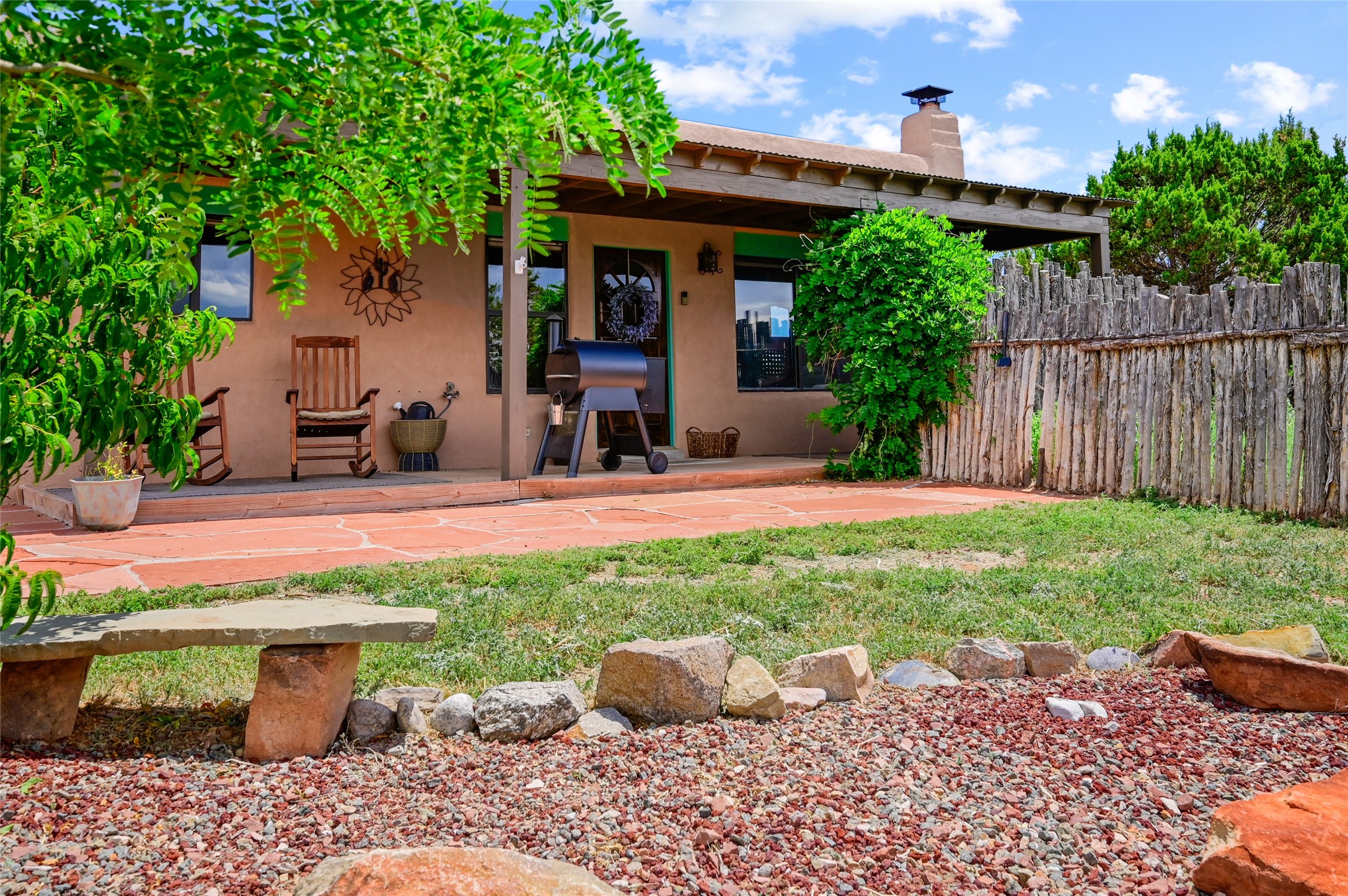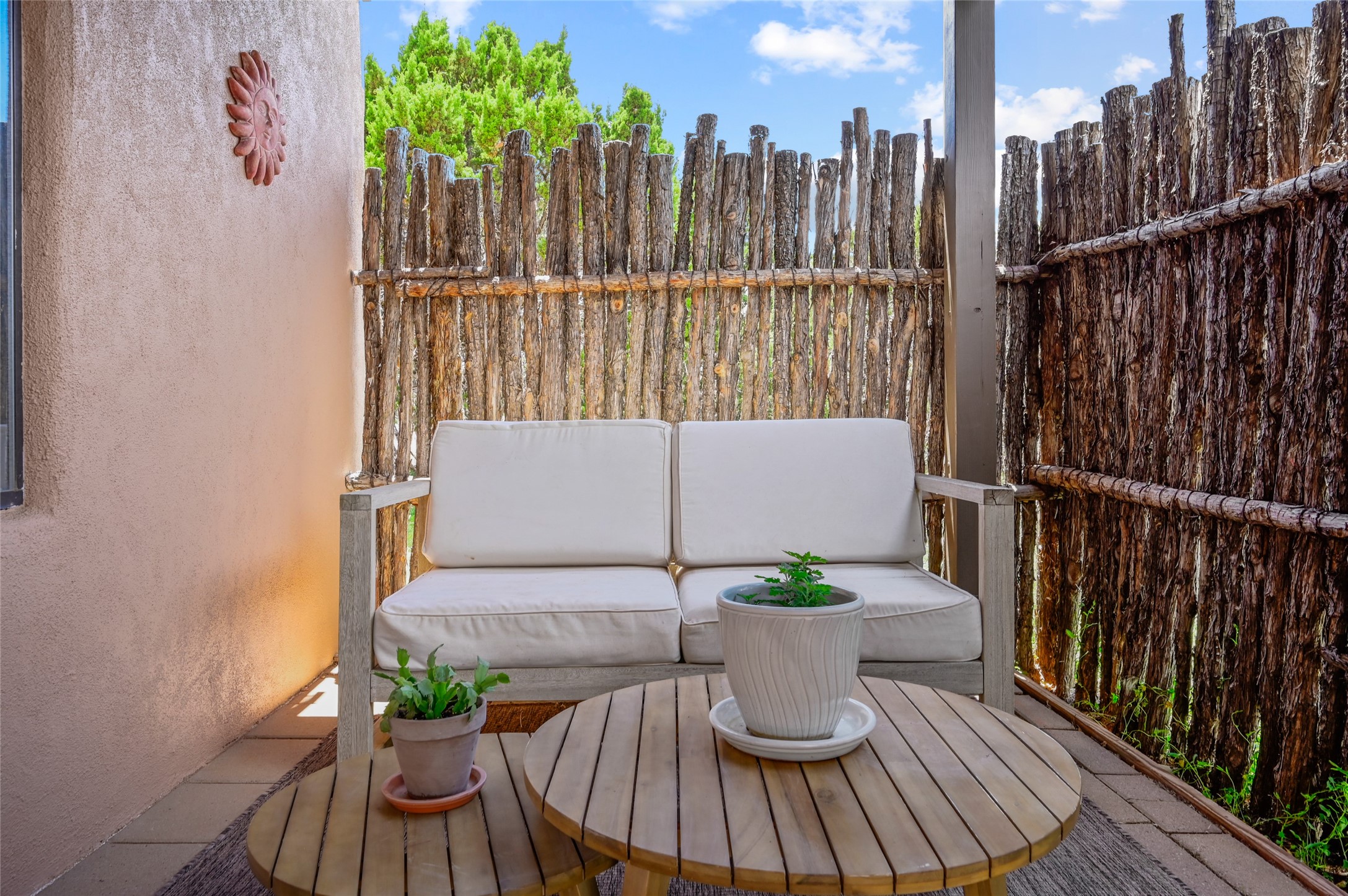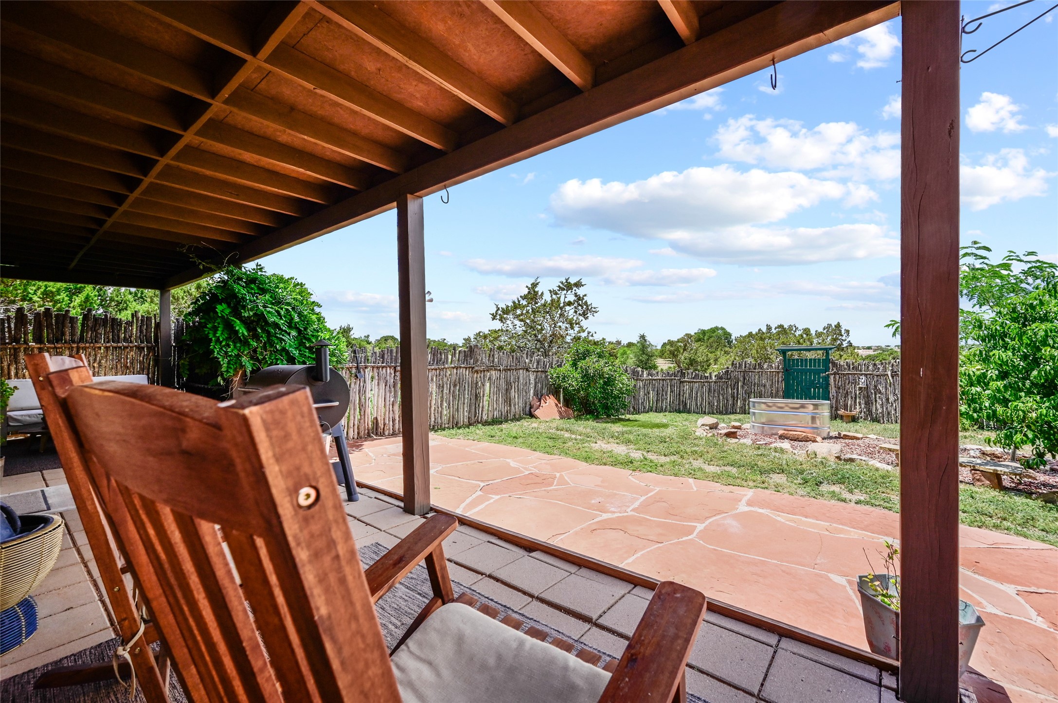 Efficient, Charming, Scenic Views. This delightful Eldorado home is sited on a elevated view lot and features a welcoming front porch and a coyote-fenced courtyard / yard. Inside, the home exudes charm with a cozy kiva fireplace, concrete floors, and a private walled courtyard off the living room. This is an ideal spot for morning coffee or quiet reflection. The main courtyard is fully fenced for dogs or privacy. Comfort meets functionality with efficient in-floor radiant heat and a mini-split unit providing AC and Heat to the primary bedroom. Eldorado offers an array of community amenities including miles of scenic walking trails, greenbelt hiking, a seasonal community pool, community center, tennis and pickleball courts and much more. Don't miss the opportunity to experience this Eldorado charmer for yourself.