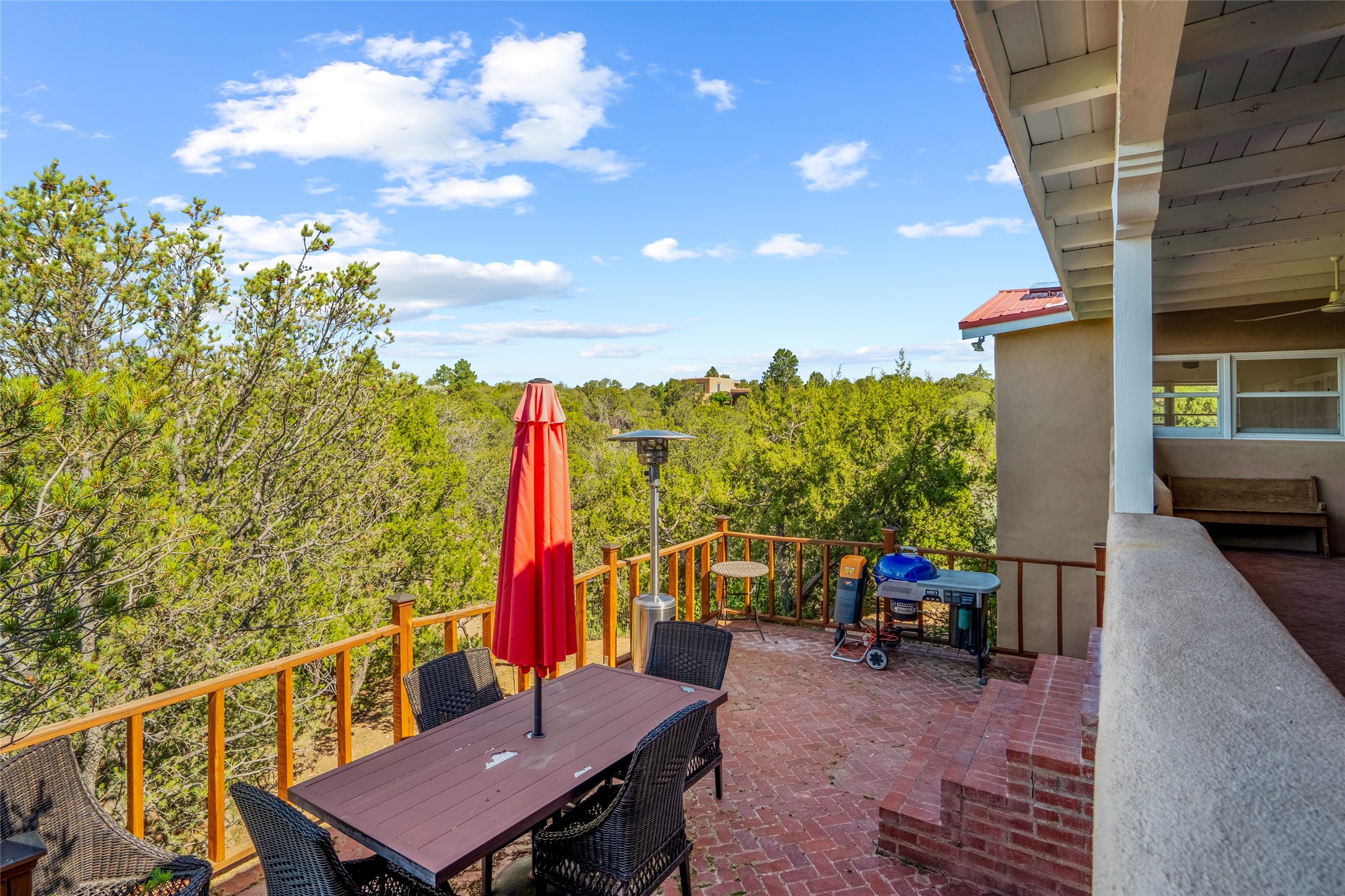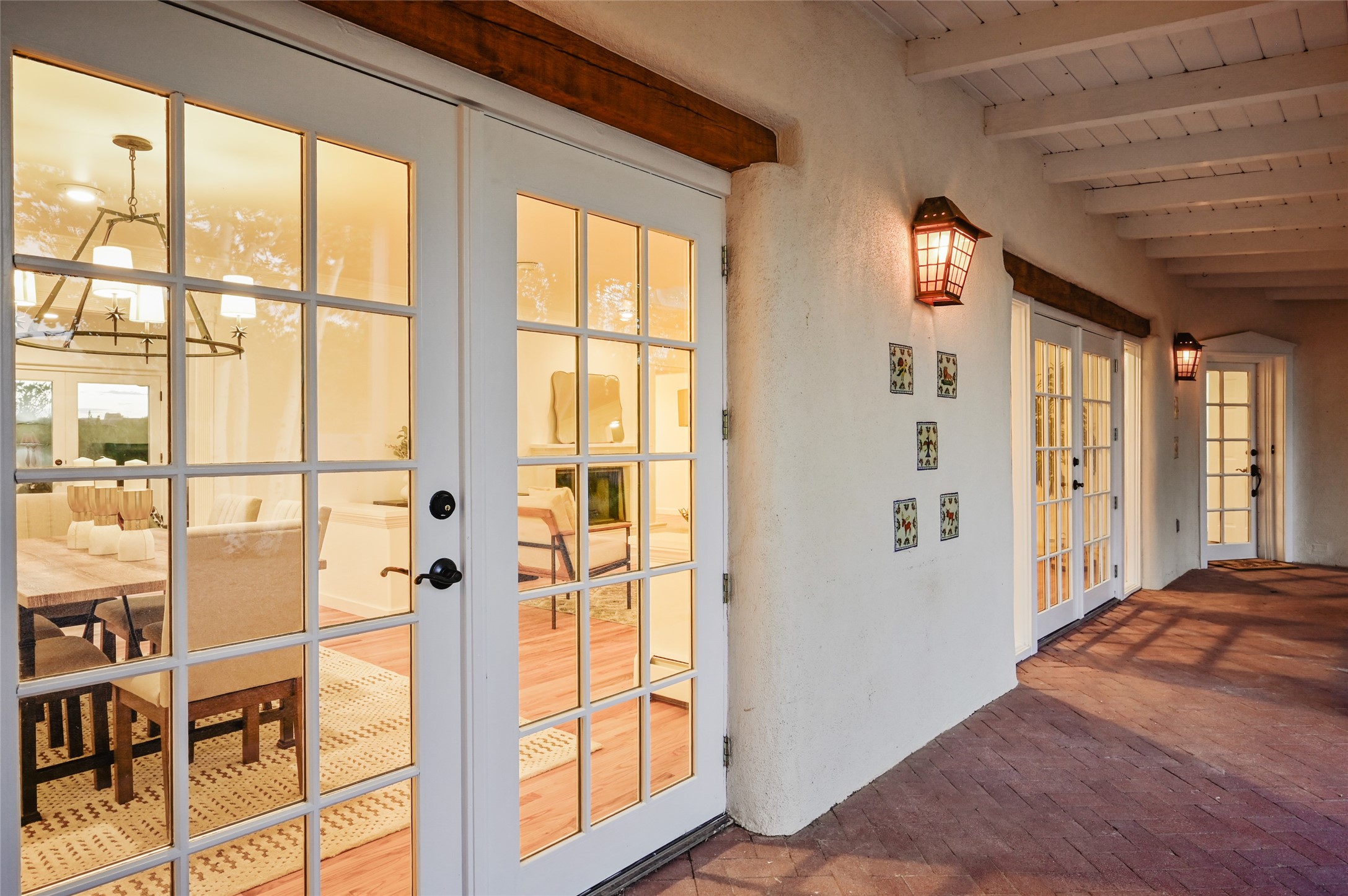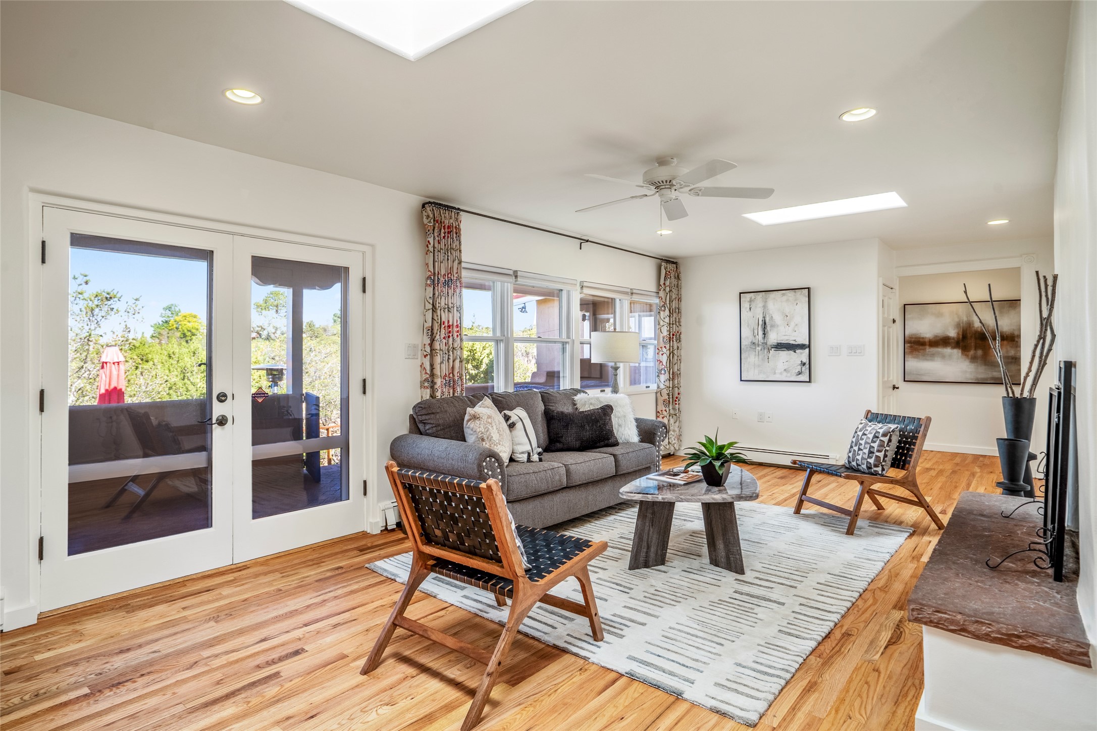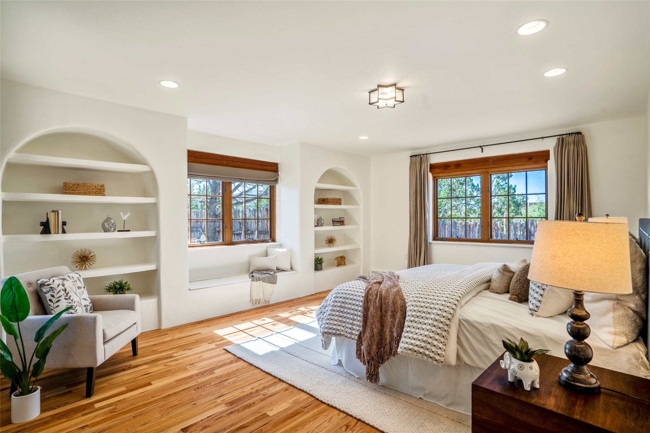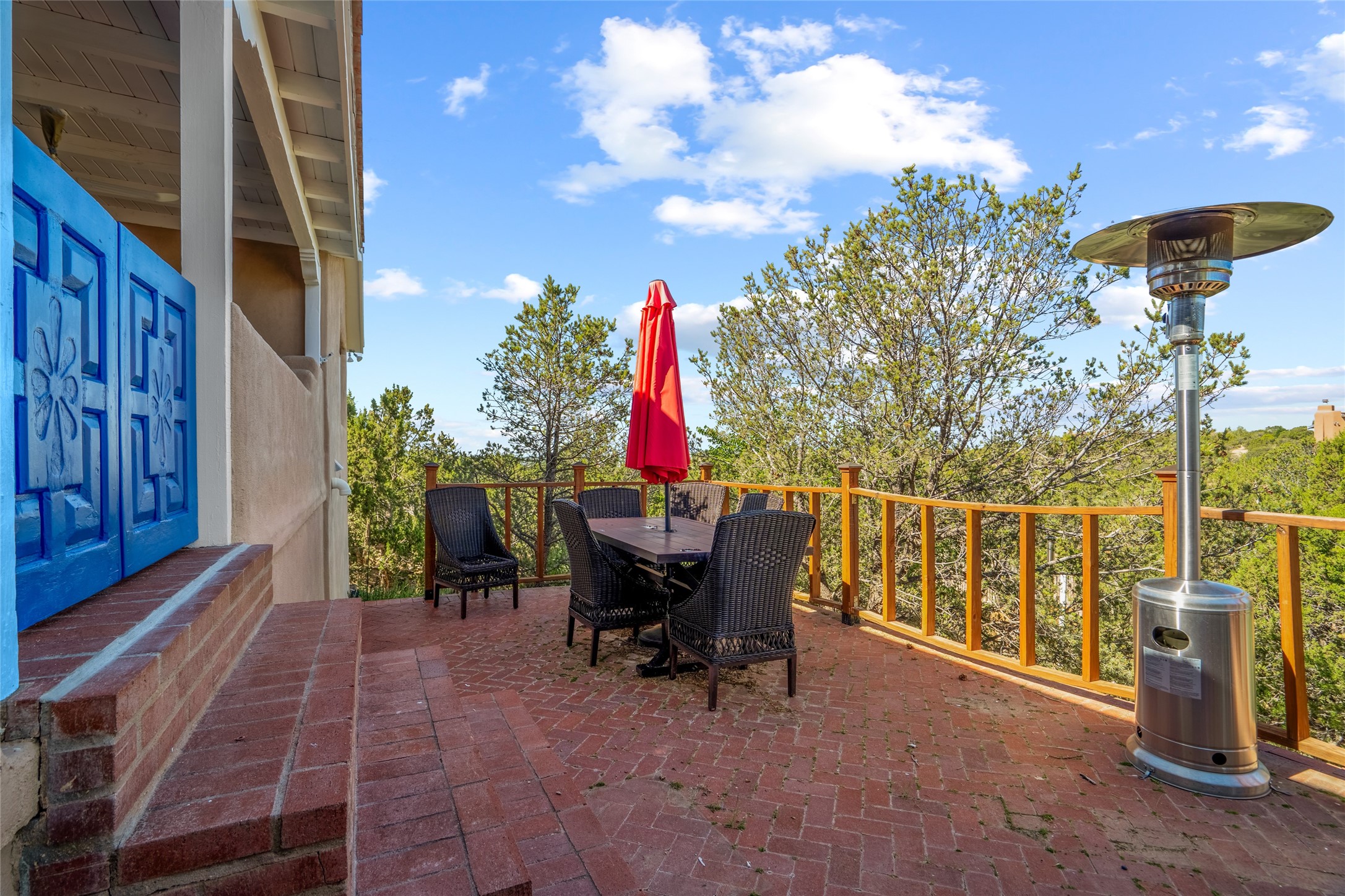 Spacious home near the downtown Plaza, Canyon Road, restaurants, and shopping. Five bedroom home plus a large downstairs area that is perfect as an attached guest house, multi-generational living, studio or office(s). Dual living areas upstairs, both with fireplaces. The dining area has french doors opening up to the front patio perfectly accommodating large gatherings. Lovely, cozy primary suite with a large updated bathroom featuring a large shower and soaking tub. Spacious bright kitchen featuring stainless steel appliances, walk-in pantry, and large breakfast nook area overlooking the City. The portal area on the west side of the home is perfect for evening dining or morning coffee. The downstairs area has two multi-purpose rooms, with the fifth bedroom/bathroom being located downstairs. Newer solar system just a few years old that is owned. Large and spacious basement storage area. Lovely views of the City lights, Ortiz, Sandia, and Sangre de Cristo Mountains.