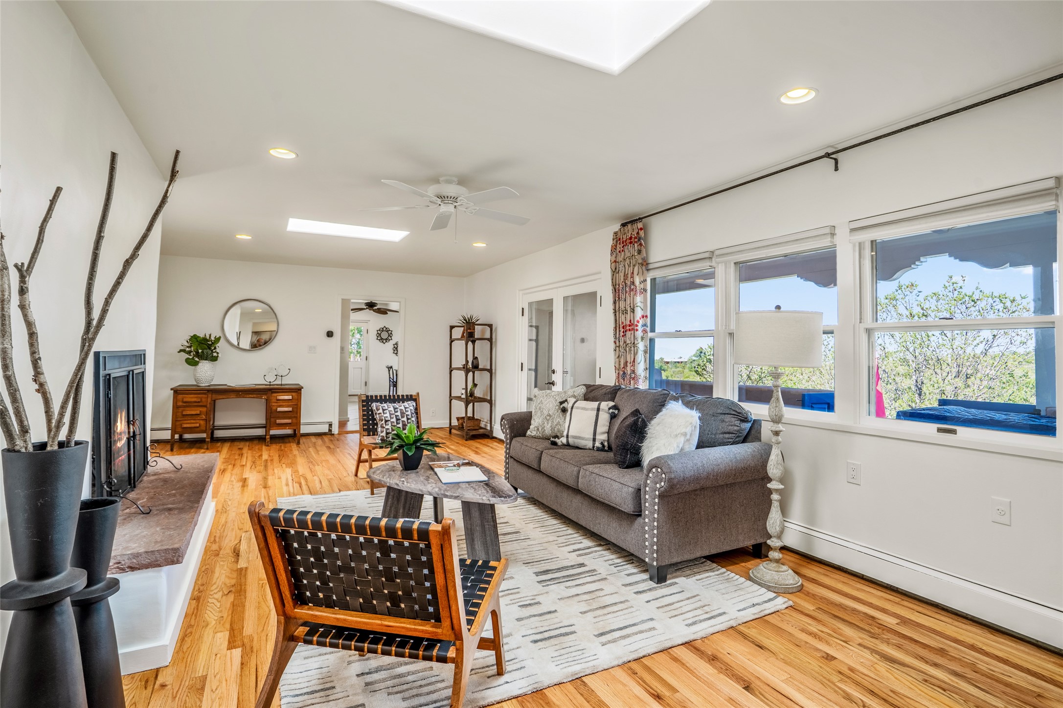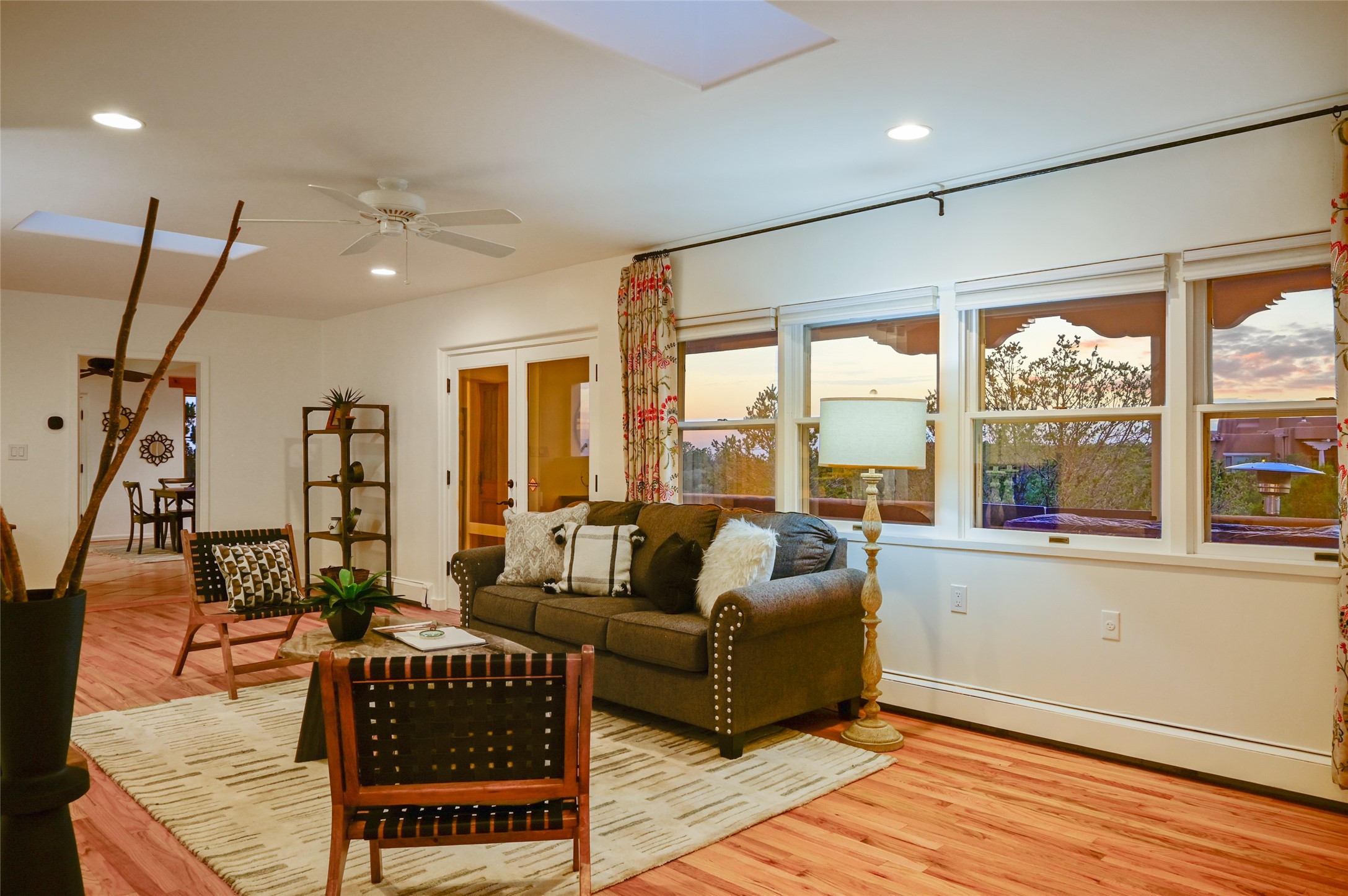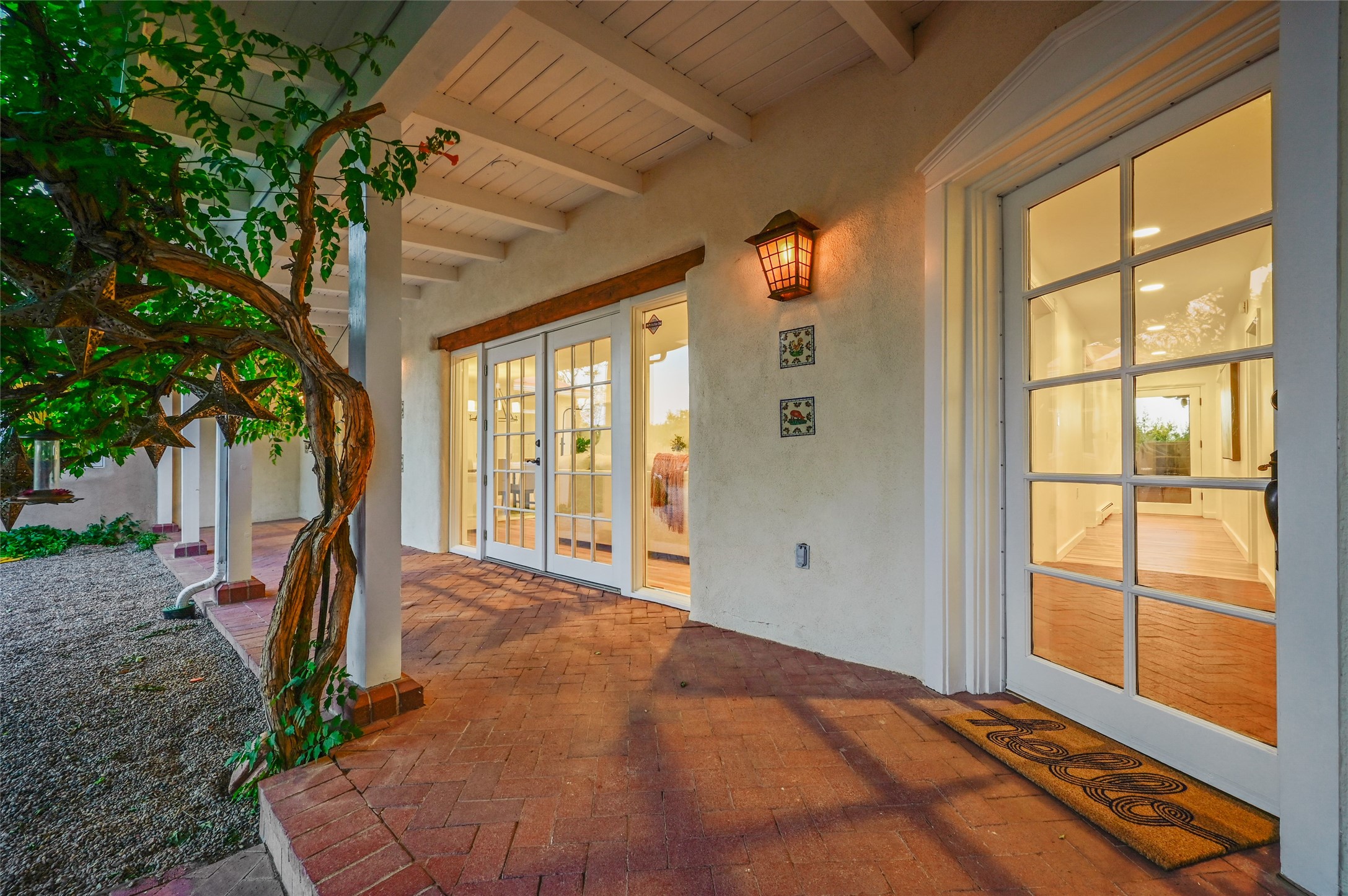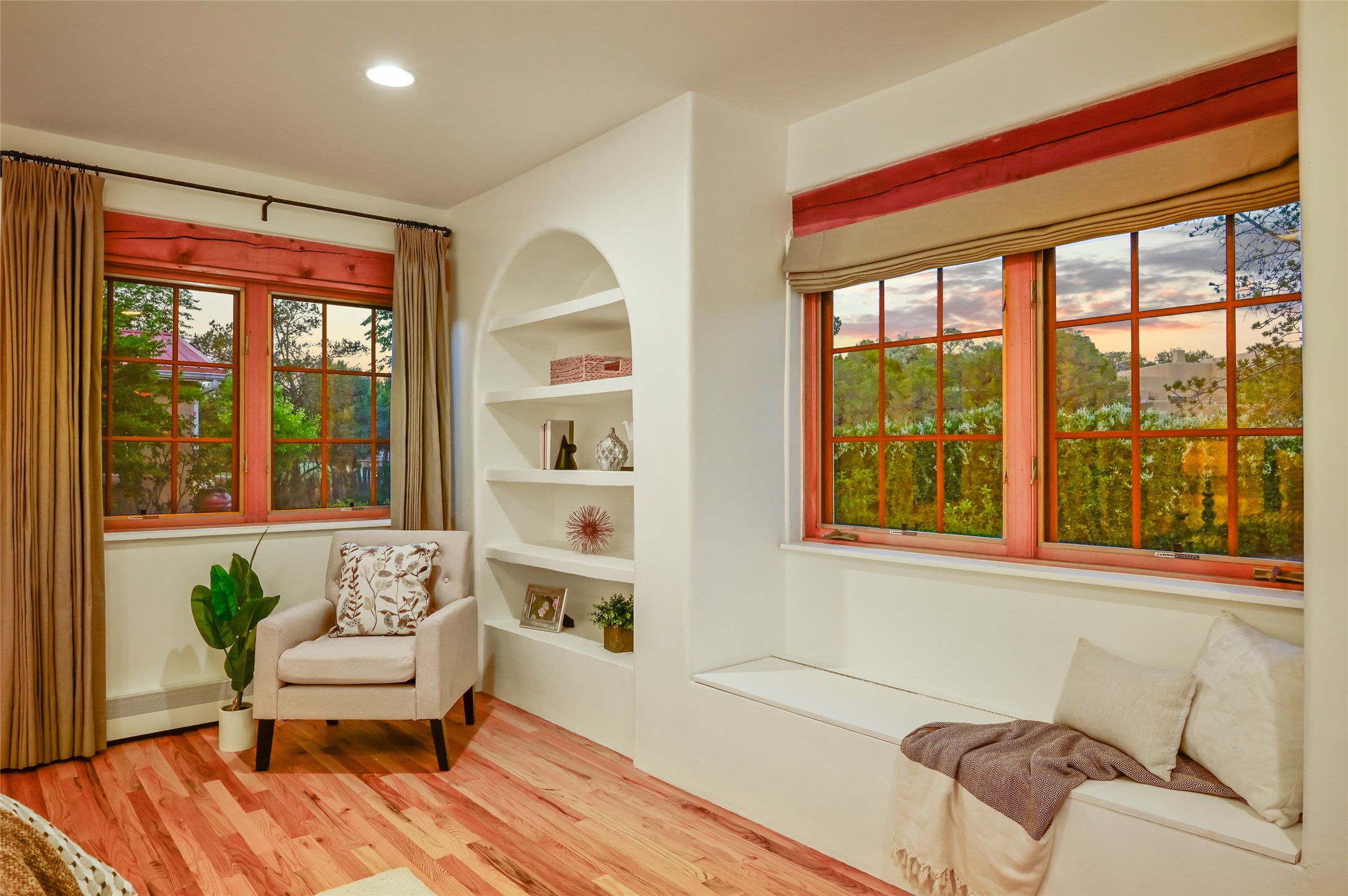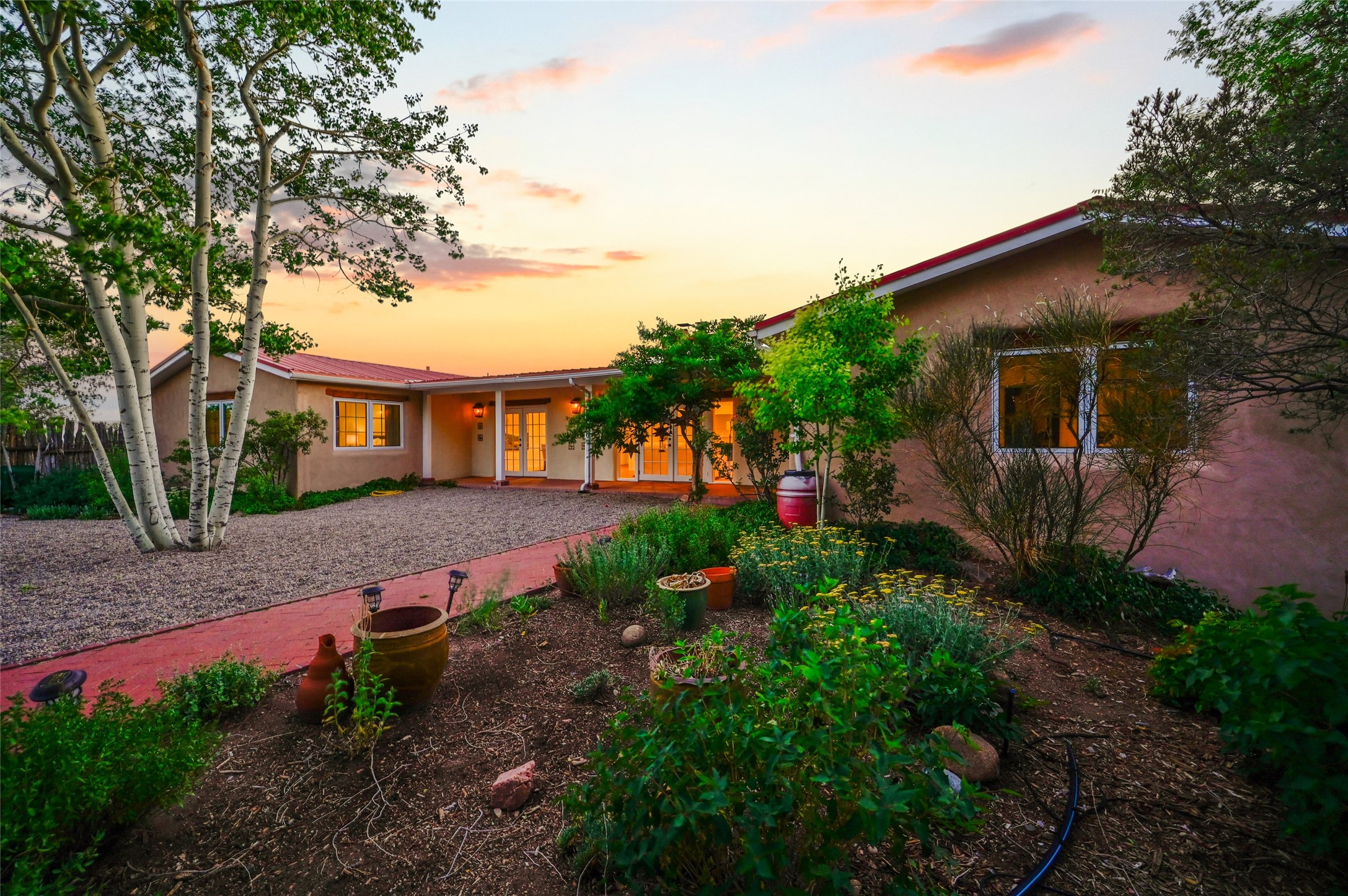 Spacious home near the downtown Plaza, Canyon Road, restaurants, and shopping. Five bedroom home plus a large downstairs area that is perfect as an attached guest house, multi-generational living, studio or office(s). Dual living areas upstairs, both with fireplaces. The dining area has french doors opening up to the front patio perfectly accommodating large gatherings. Lovely, cozy primary suite with a large updated bathroom featuring a large shower and soaking tub. Spacious bright kitchen featuring stainless steel appliances, walk-in pantry, and large breakfast nook area overlooking the City. The portal area on the west side of the home is perfect for evening dining or morning coffee. The downstairs area has two multi-purpose rooms, with the fifth bedroom/bathroom being located downstairs. Newer solar system just a few years old that is owned. Large and spacious basement storage area. Lovely views of the City lights, Ortiz, Sandia, and Sangre de Cristo Mountains.